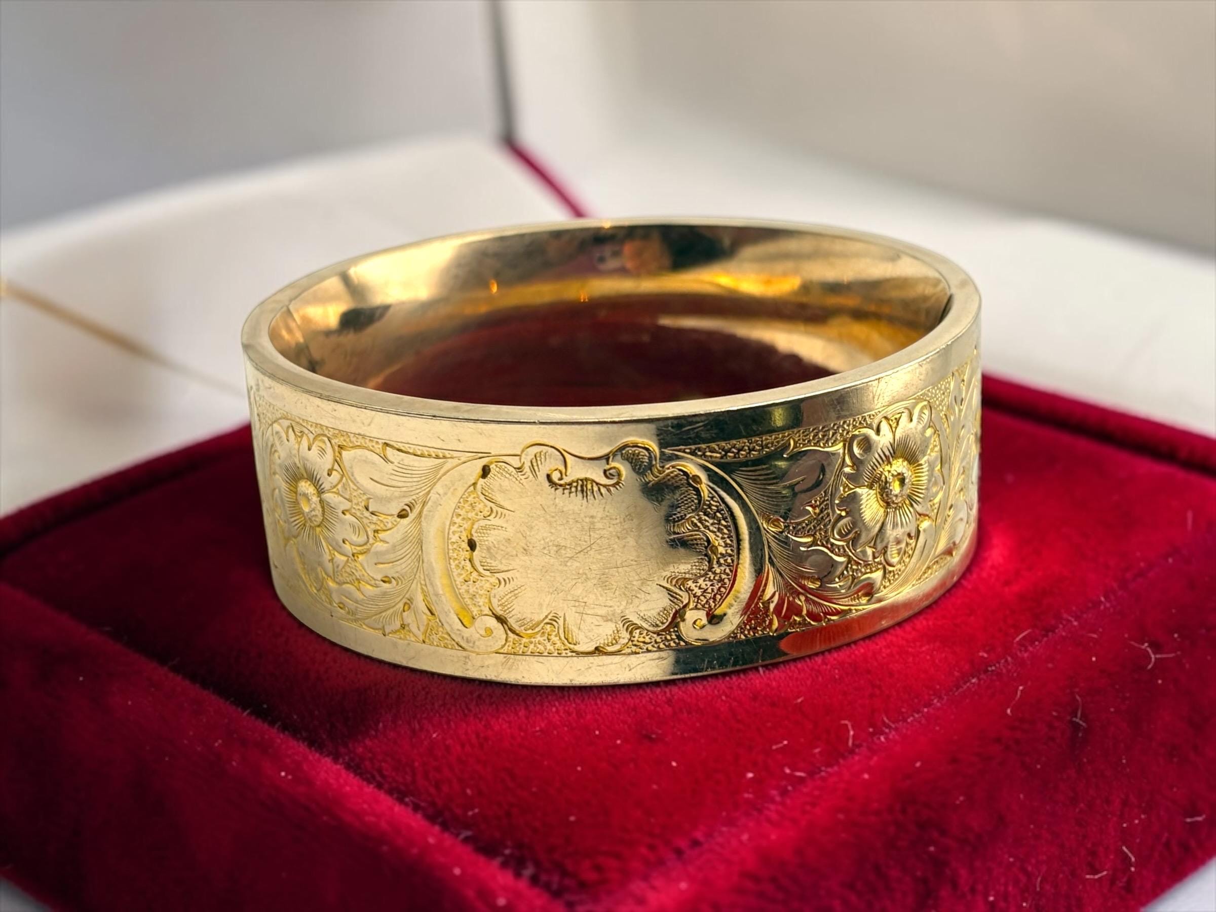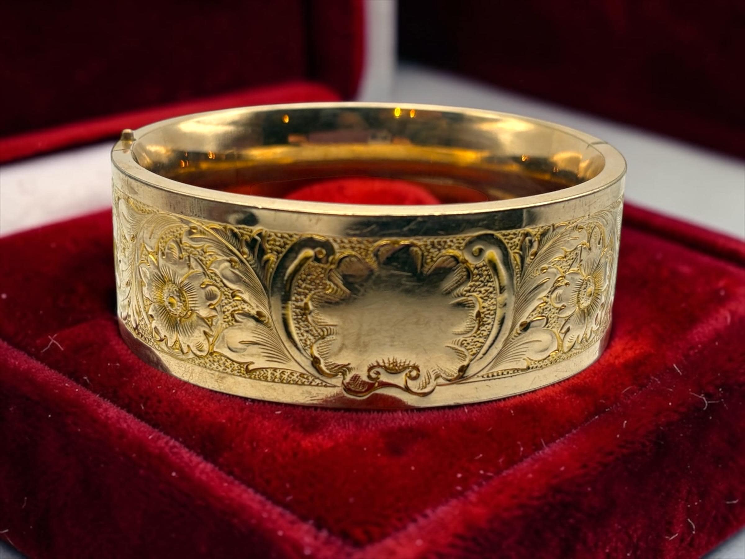 Vintage Gold Filled Bangle: Thick Etched Floral Bracelet, Victorian Edwardian Jewelry ACCO