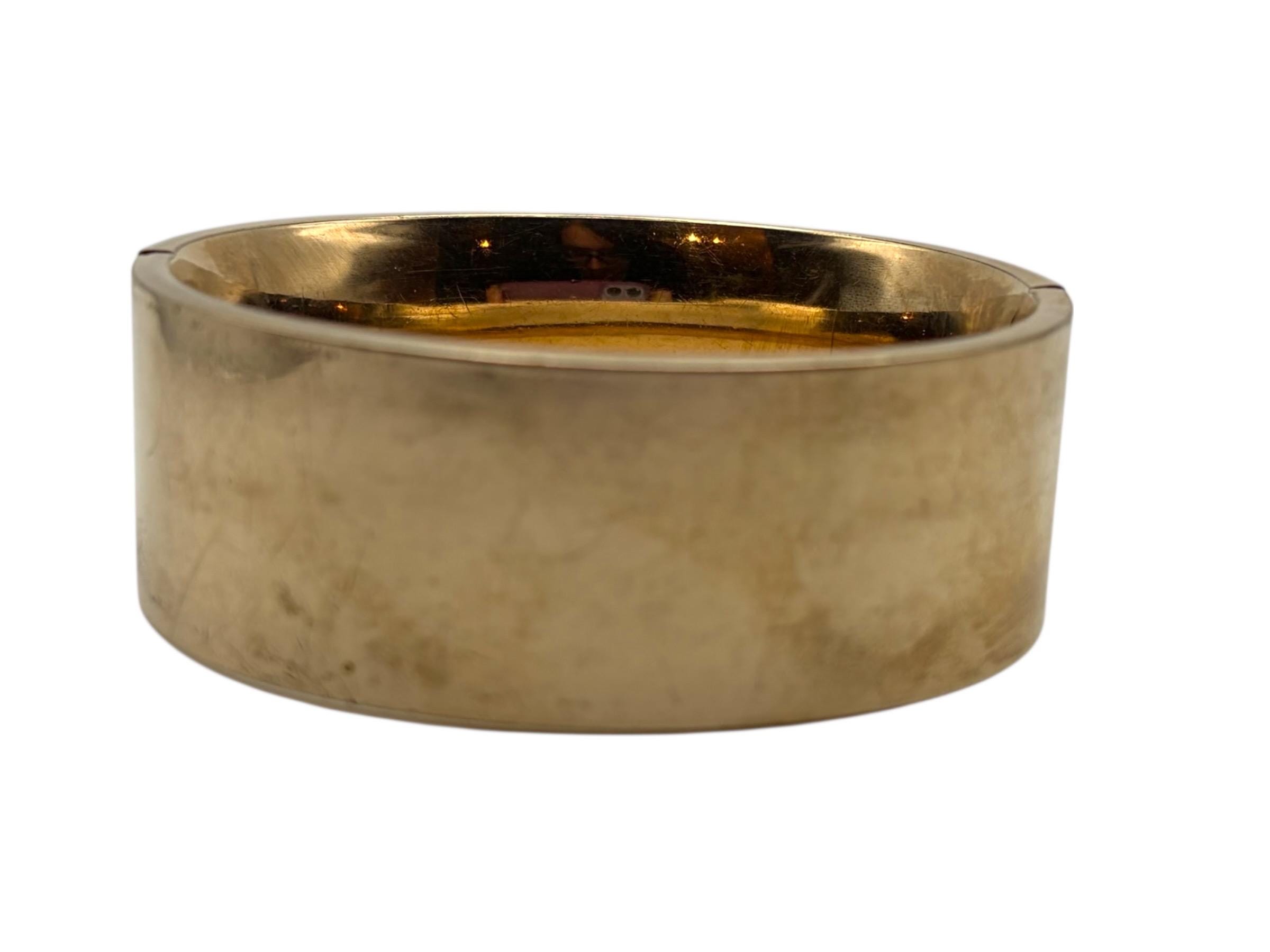 In nice vintage condition. Some light use marks/wear commensurate with vintage age (circa early 1900s). Some small indentations and some light wear here or there. When worn, the bracelet clasp is secure but the bracelet has a 1/16'' wide gap. See photos for details. Gorgeous, thick gold filled bangle!