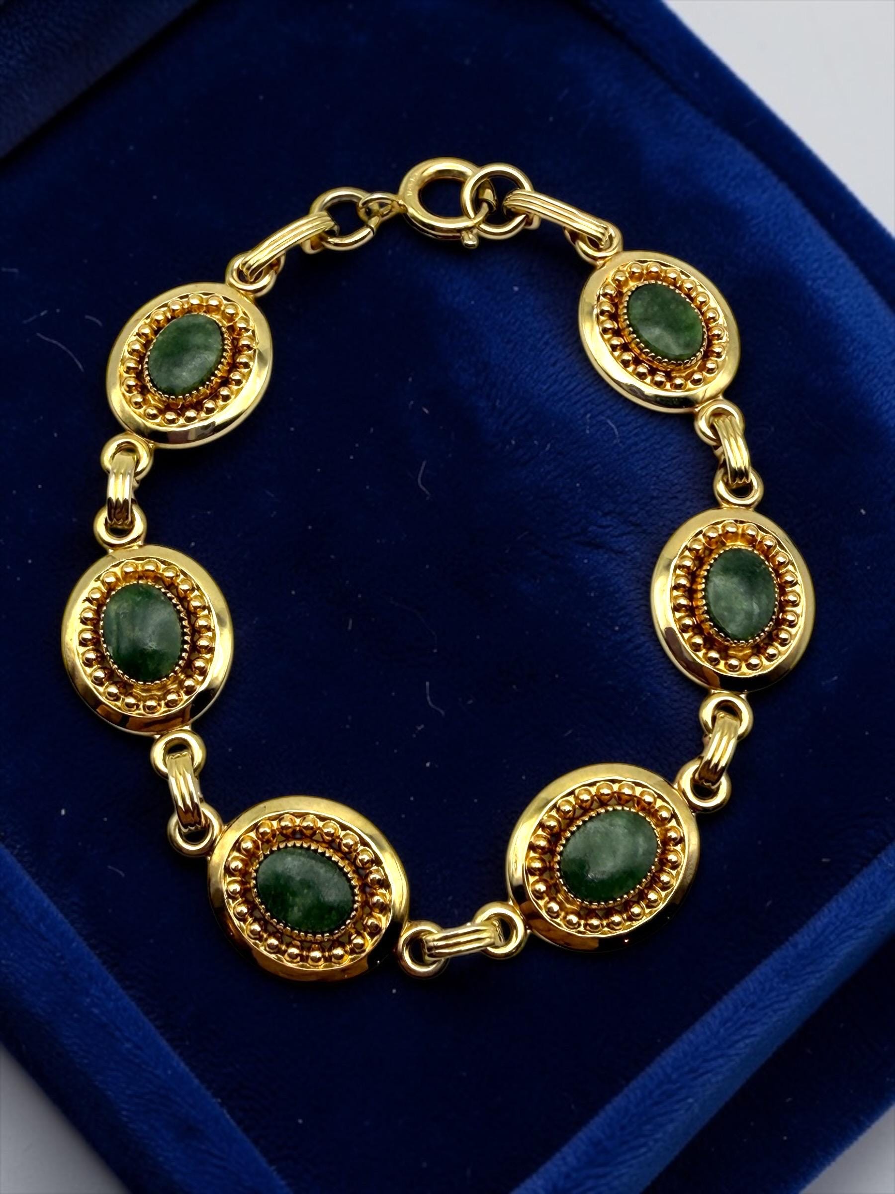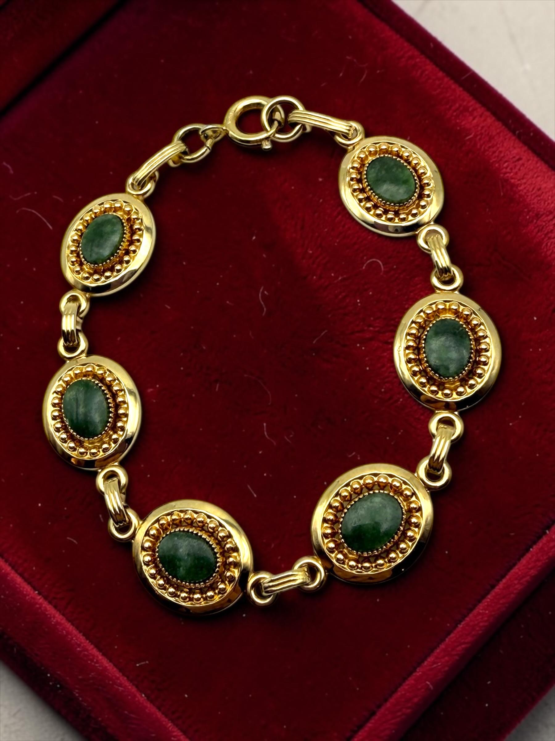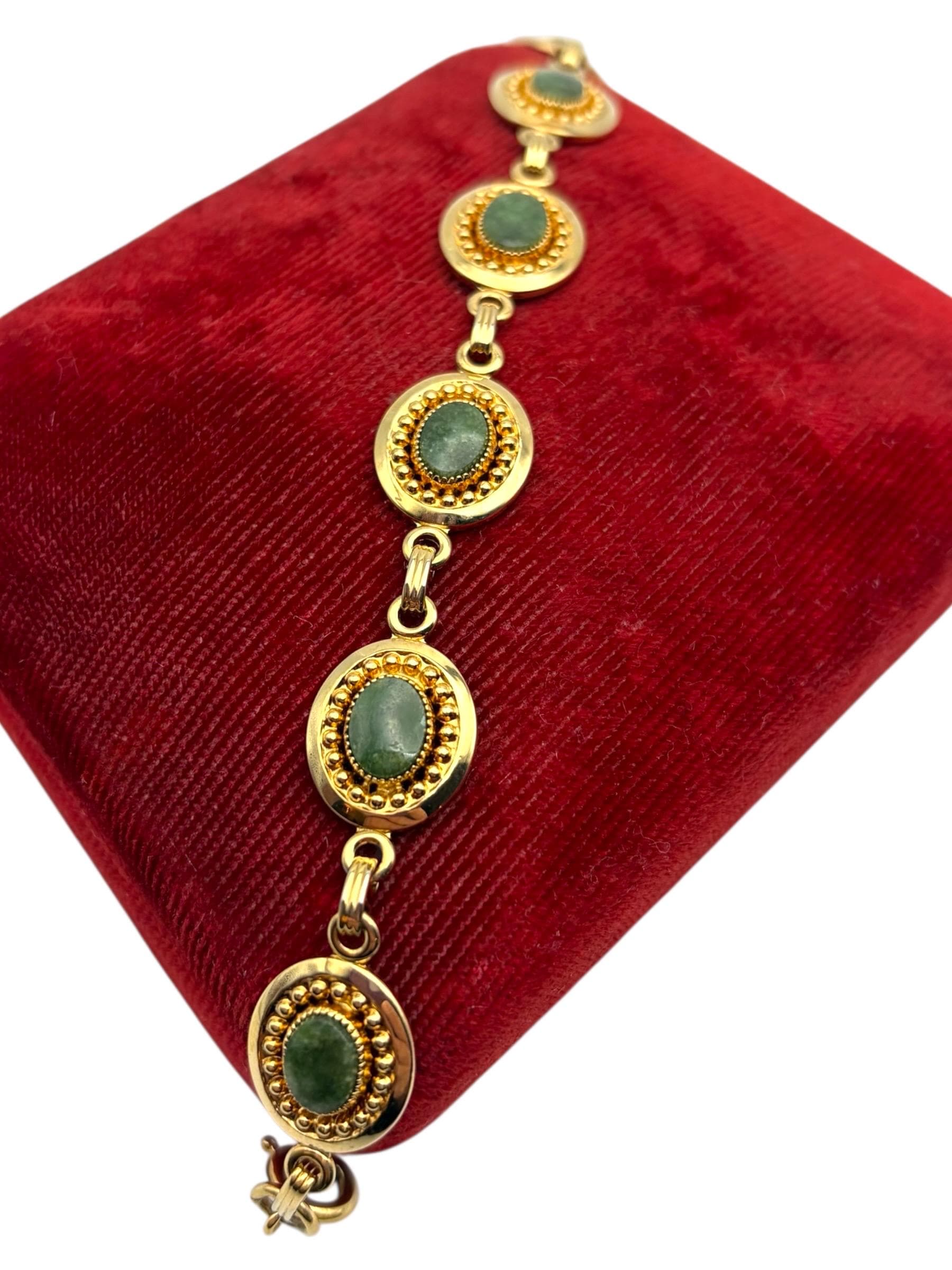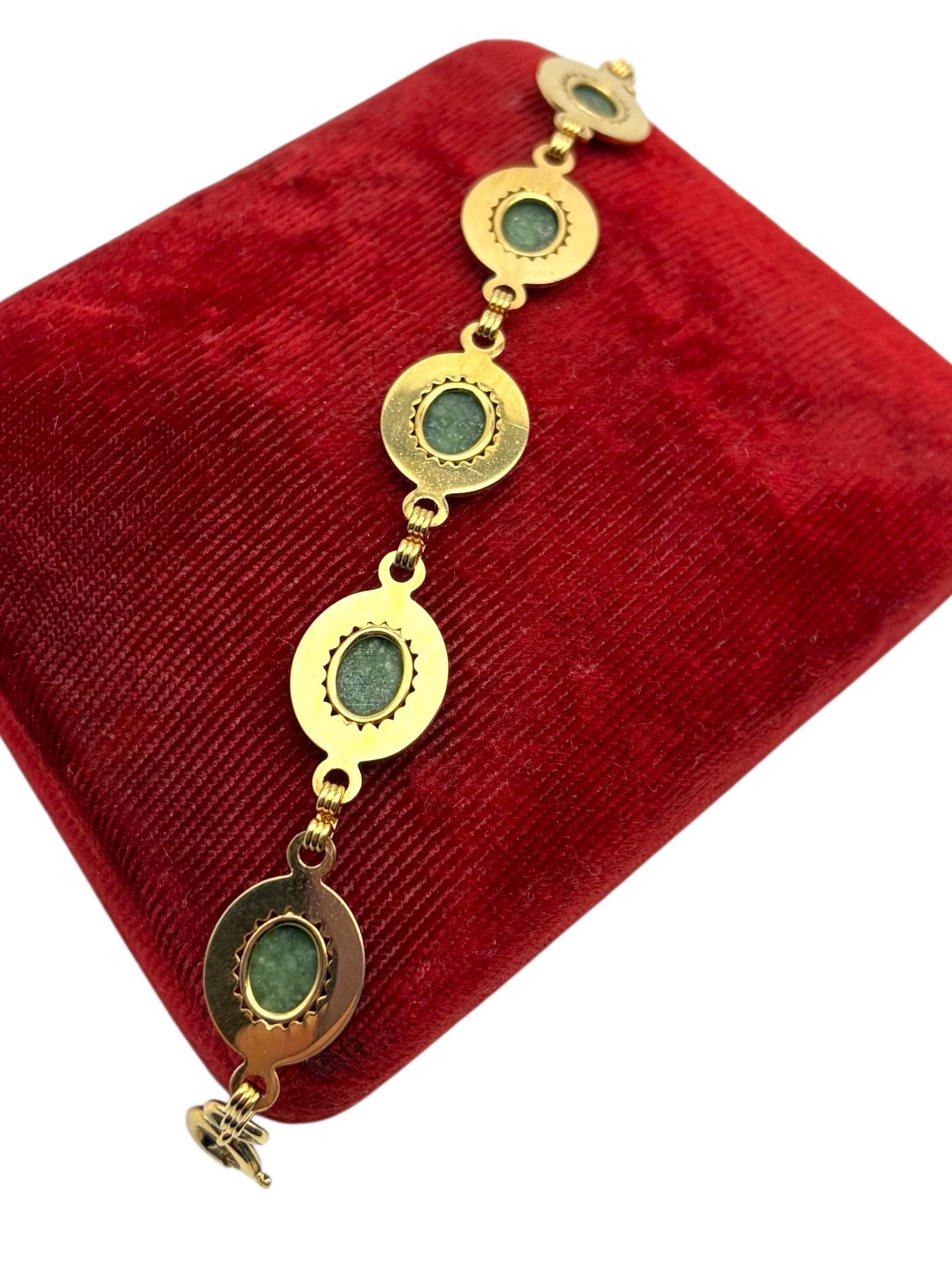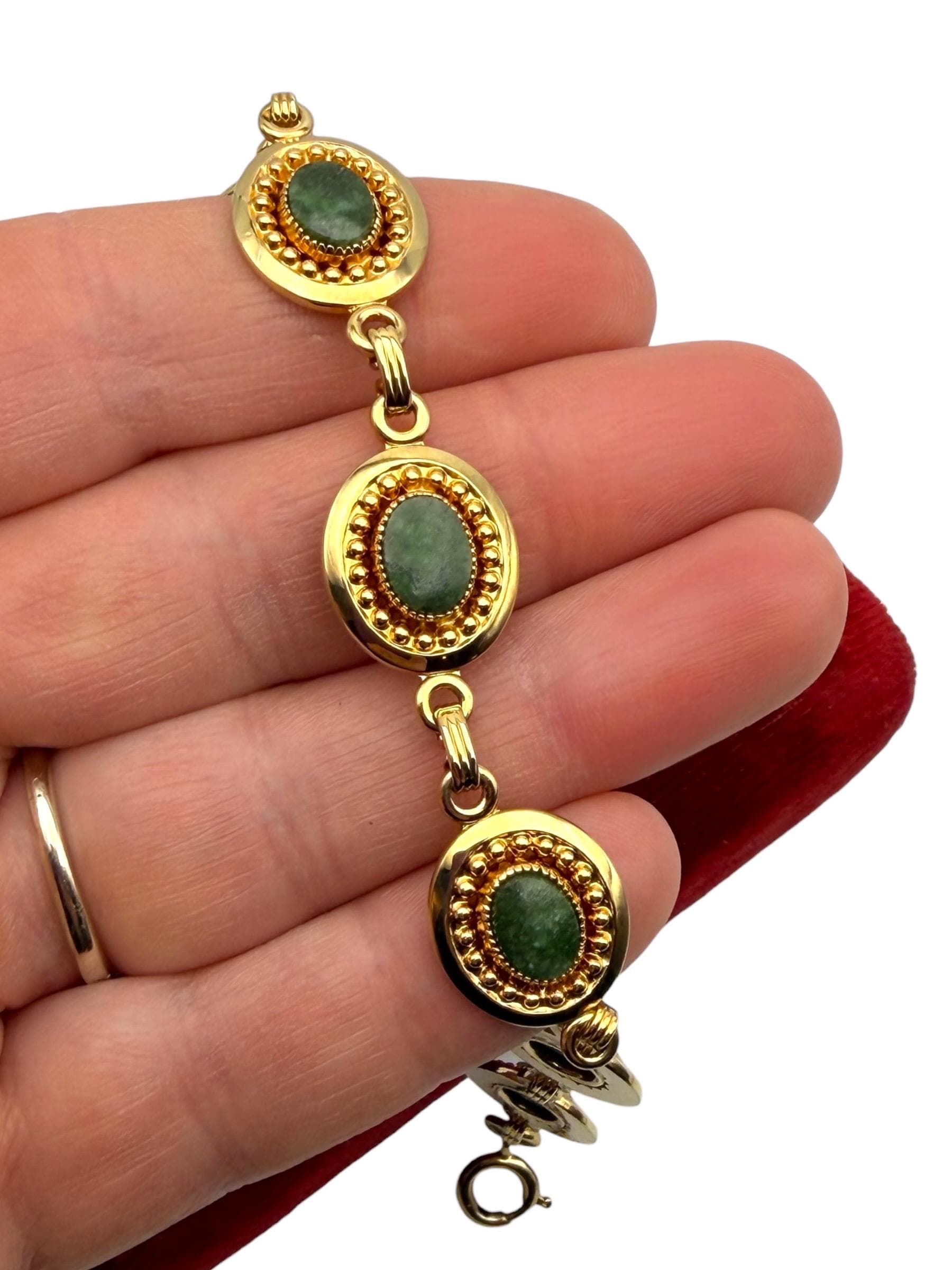 Description: Beautiful and feminine gold filled bracelet with oval nephrite jade stones. This bracelet is 12K gold-filled and has 6 oval shaped stones alternating with gold filled links.