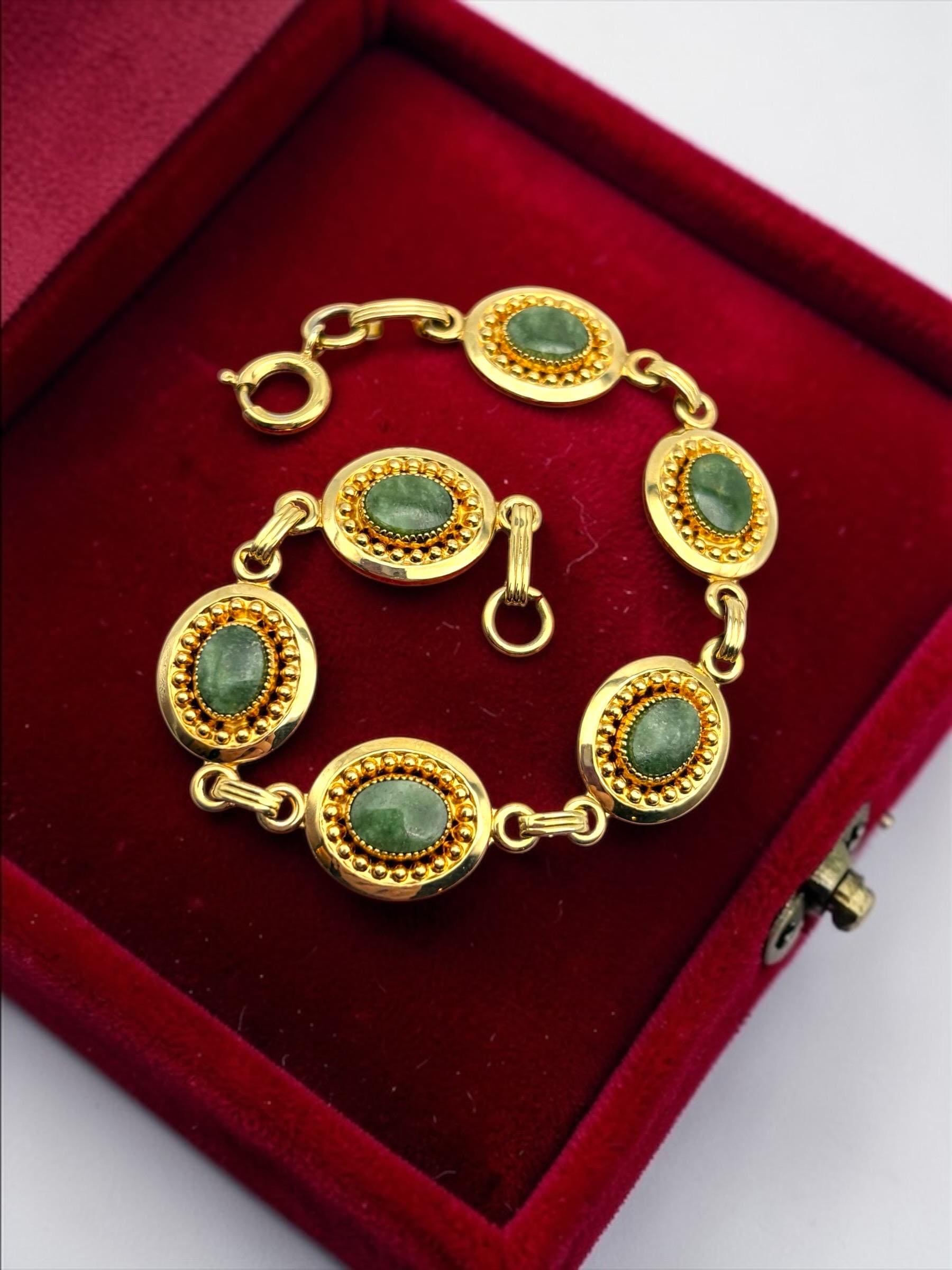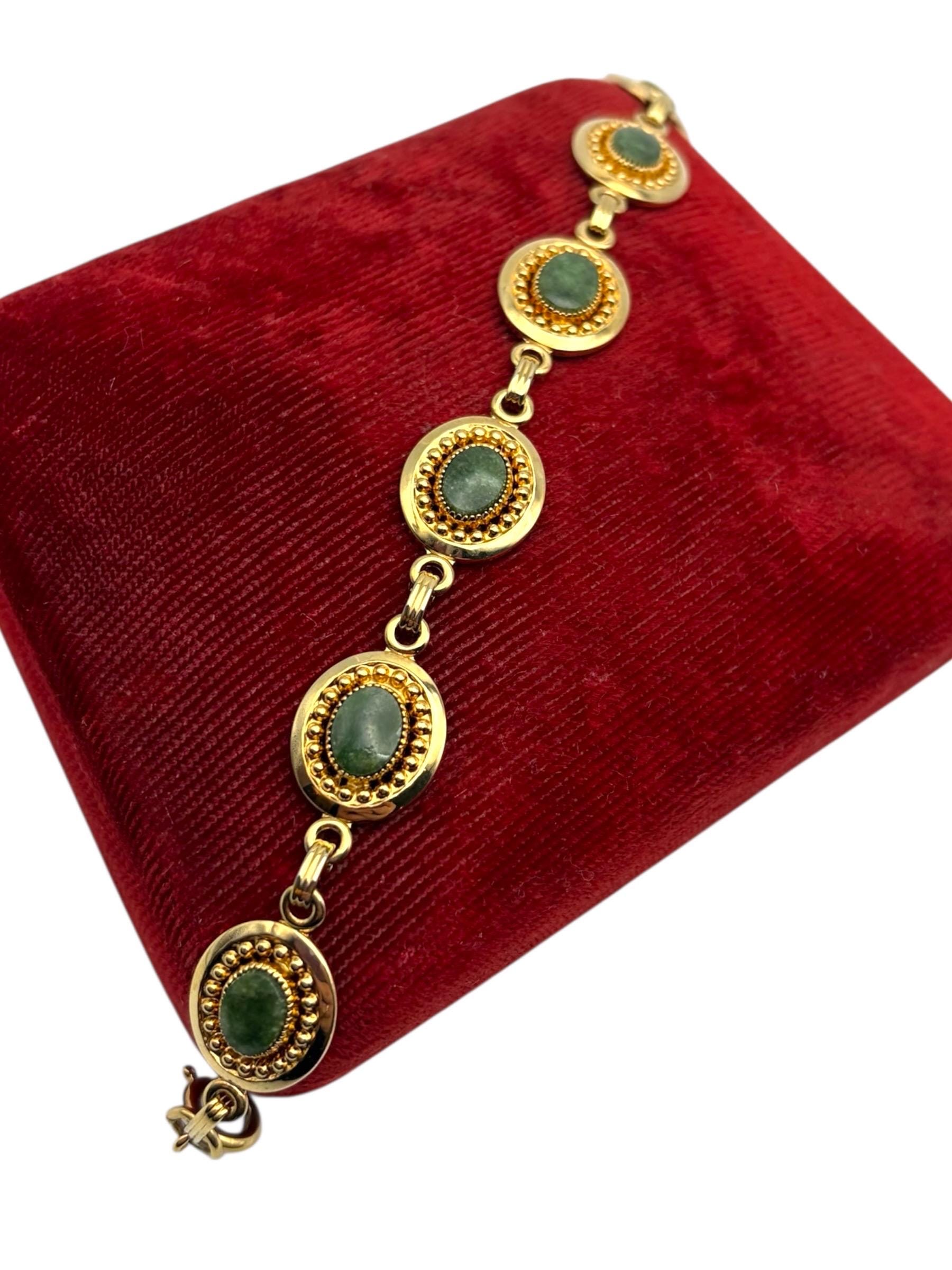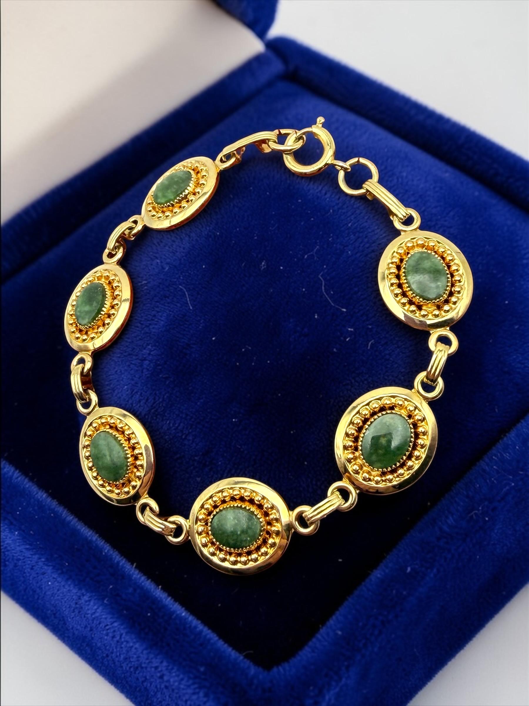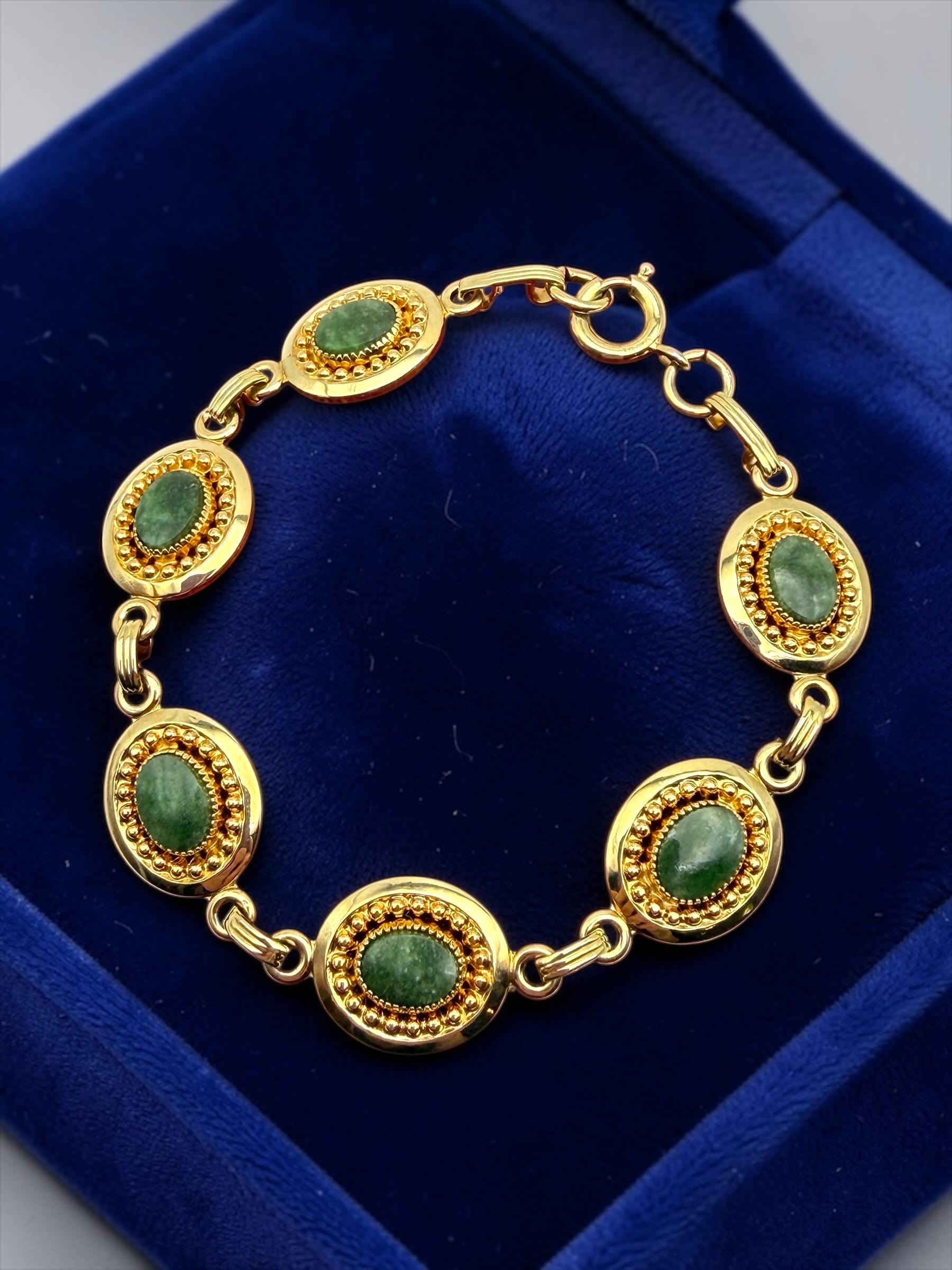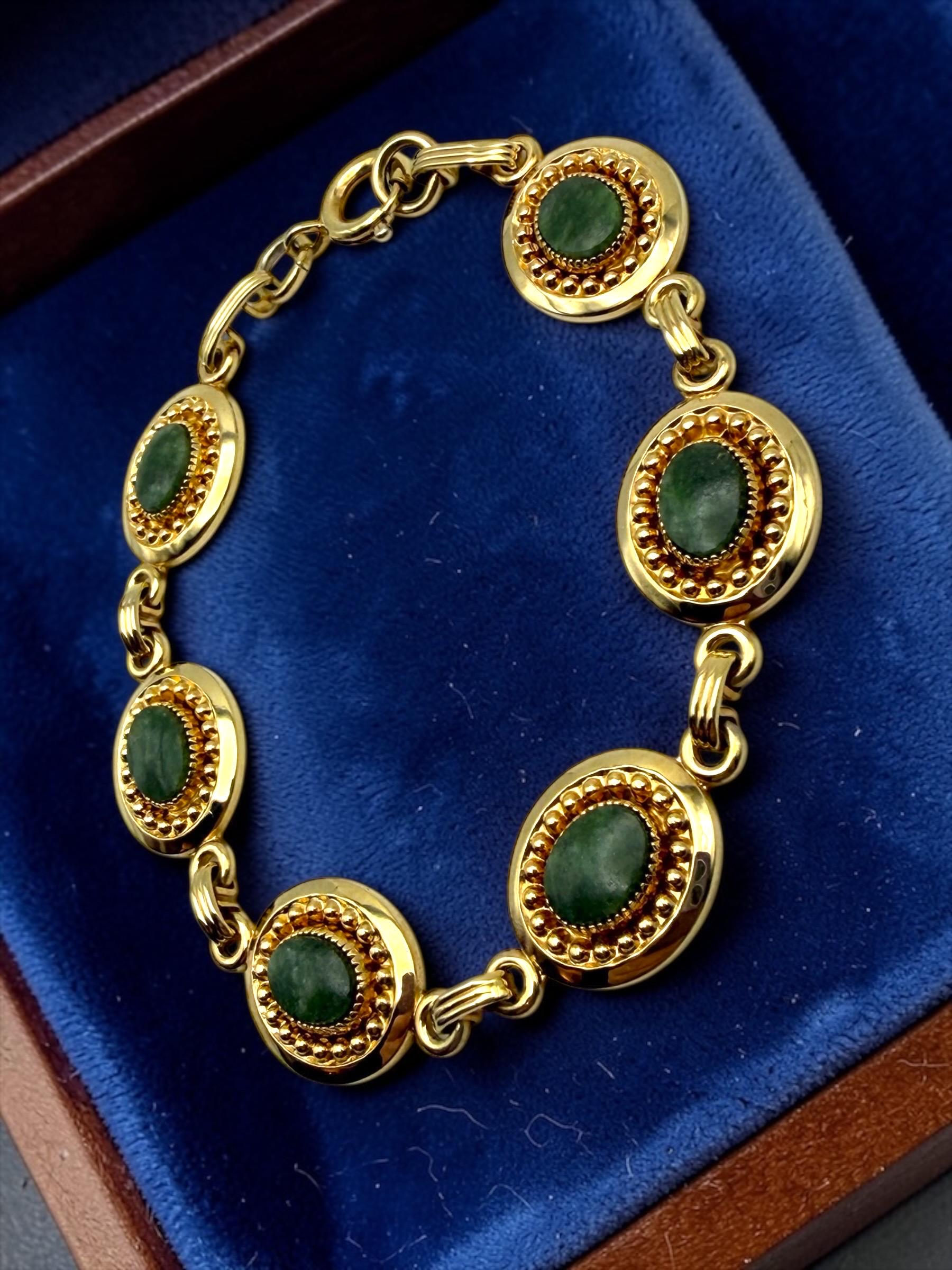 Description: Beautiful and feminine gold filled bracelet with oval nephrite jade stones. This bracelet is 12K gold-filled and has 6 oval shaped stones alternating with gold filled links.