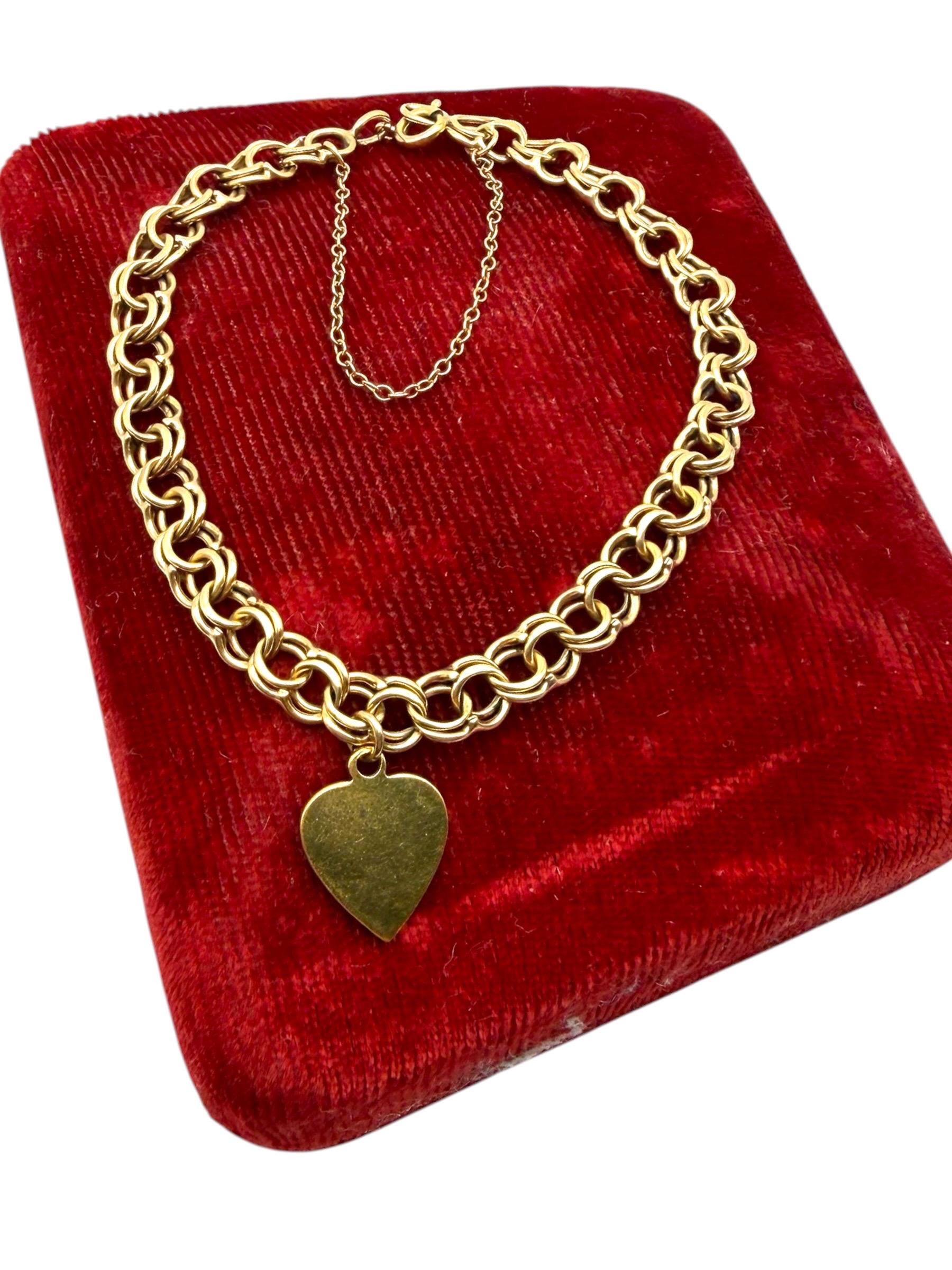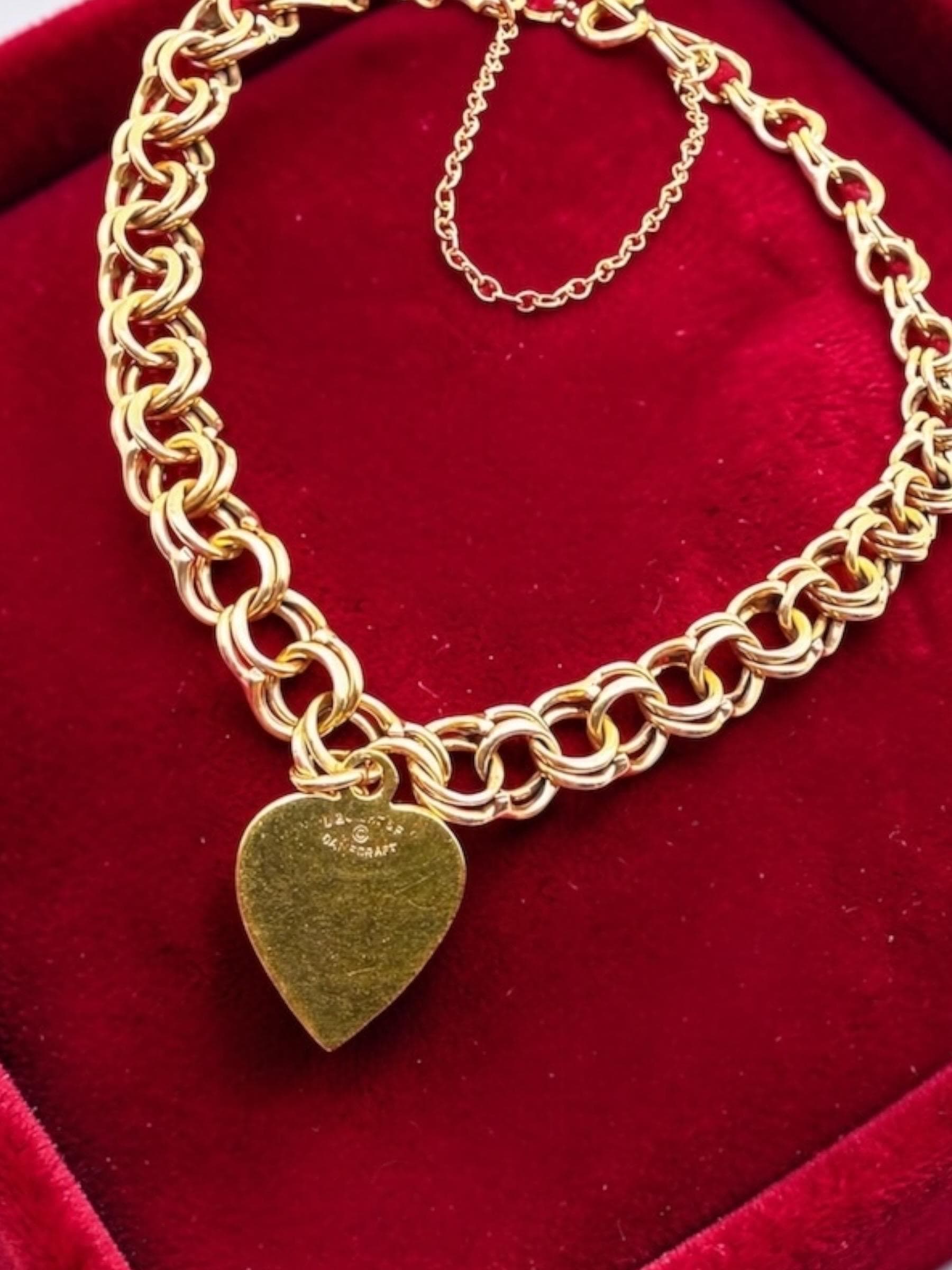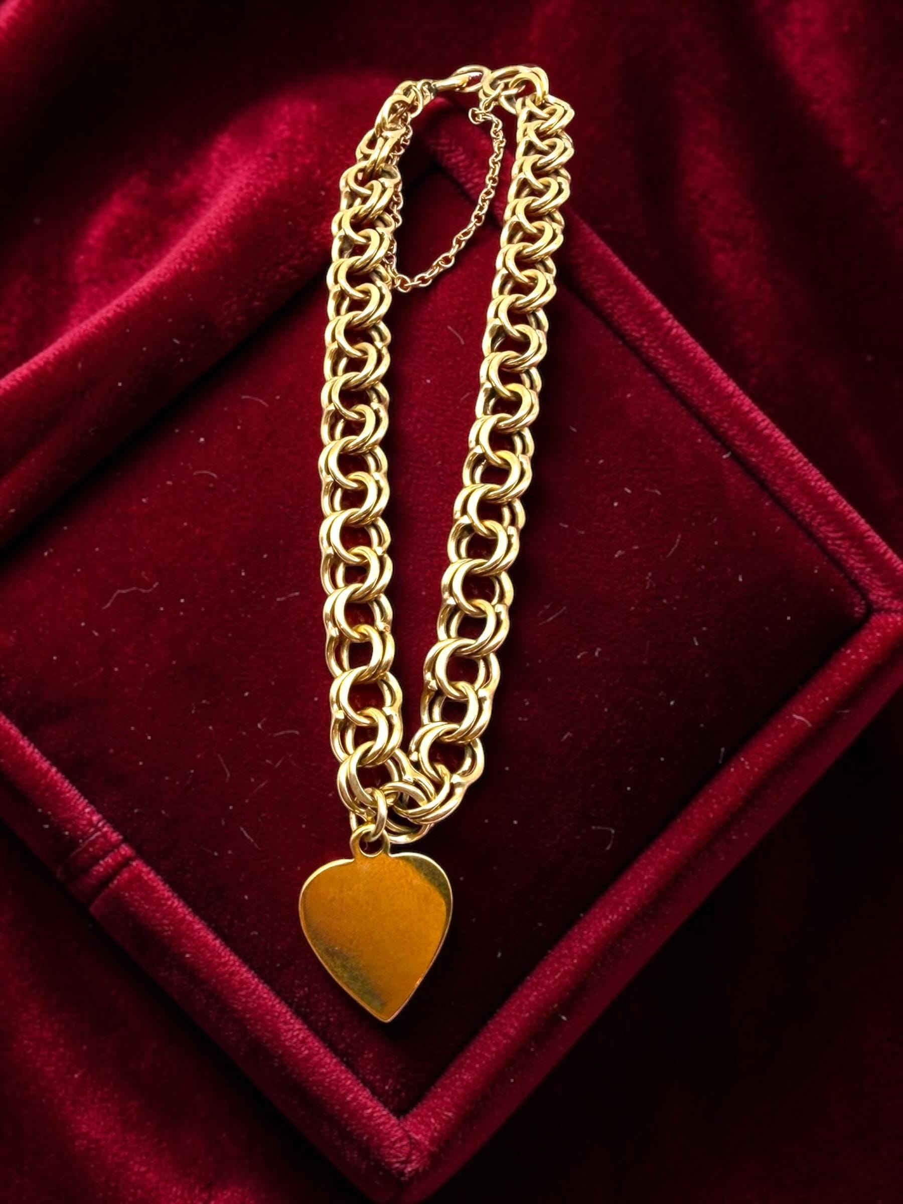 Beautiful double link chain charm bracelet with a heart shaped gold filled charm attached. The bracelet is 12K gold filled and made up of round double links for the 7 1/2'' length of the bracelet (for a larger wrist). It includes a safety chain. Attached is an adorable heart shaped charm hallmarked DANECRAFT 12K GF.