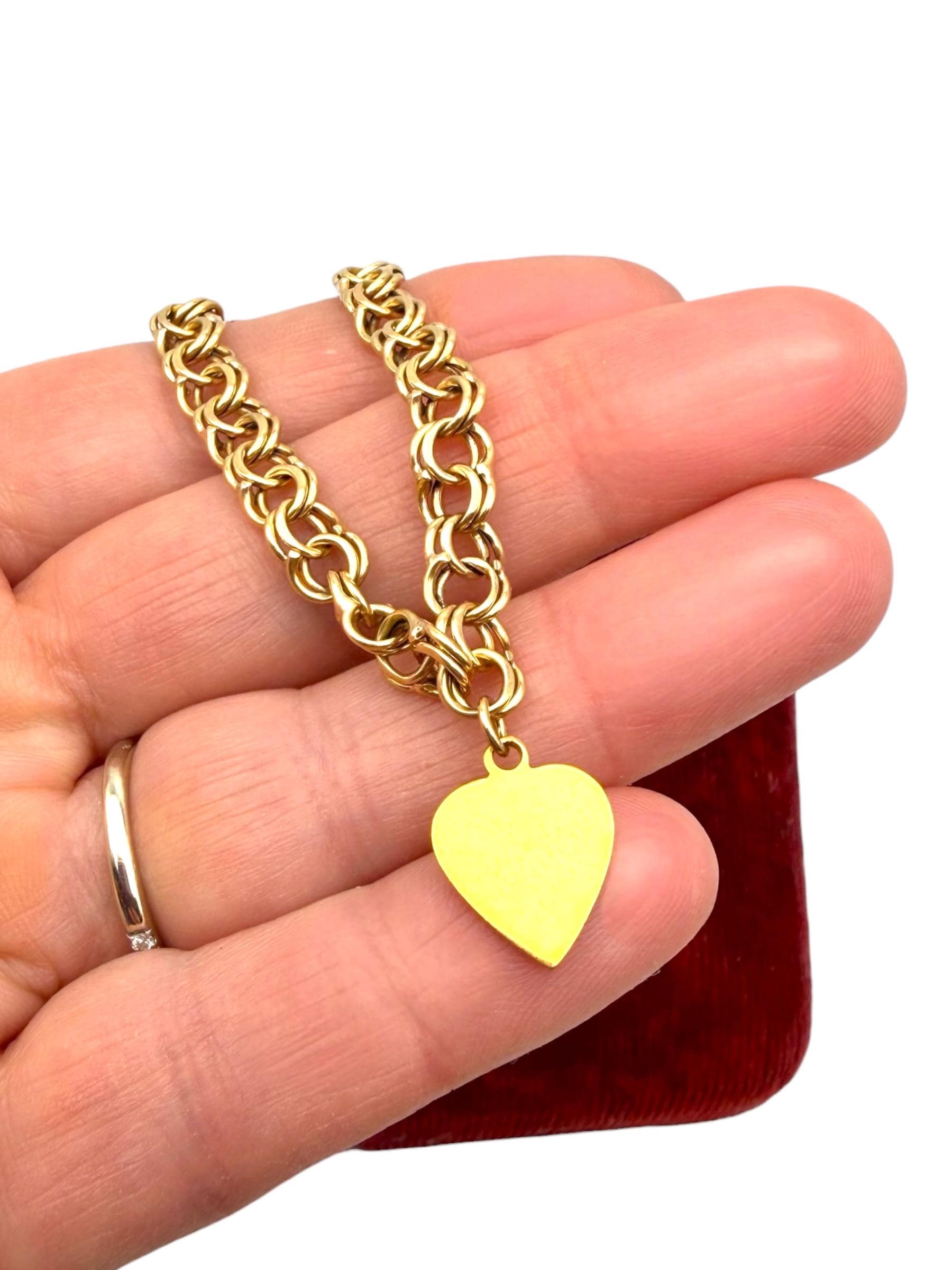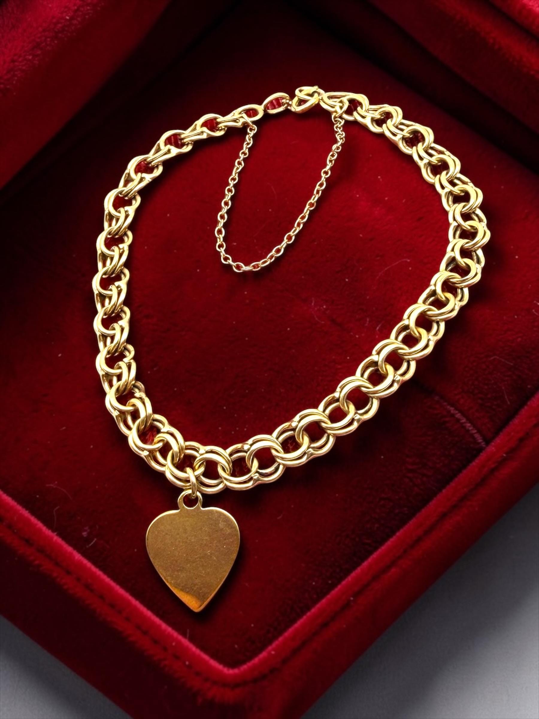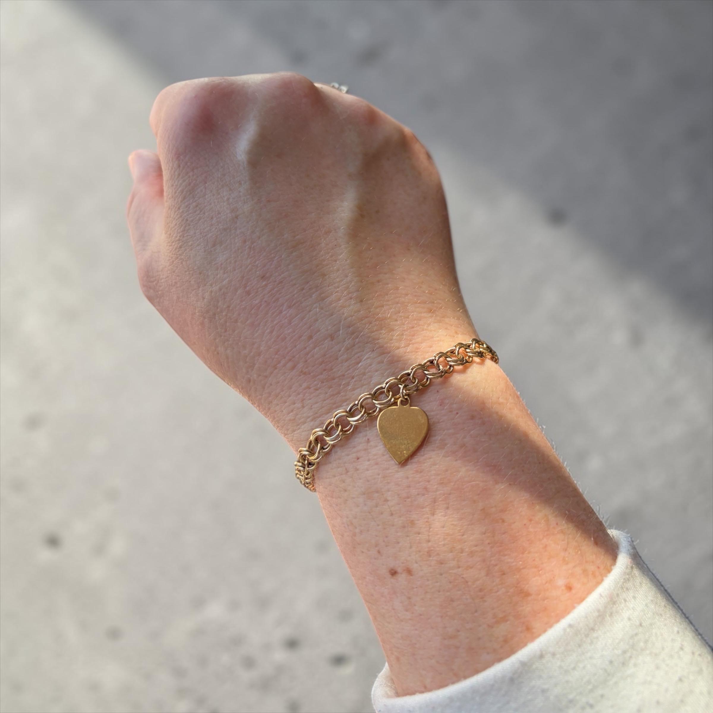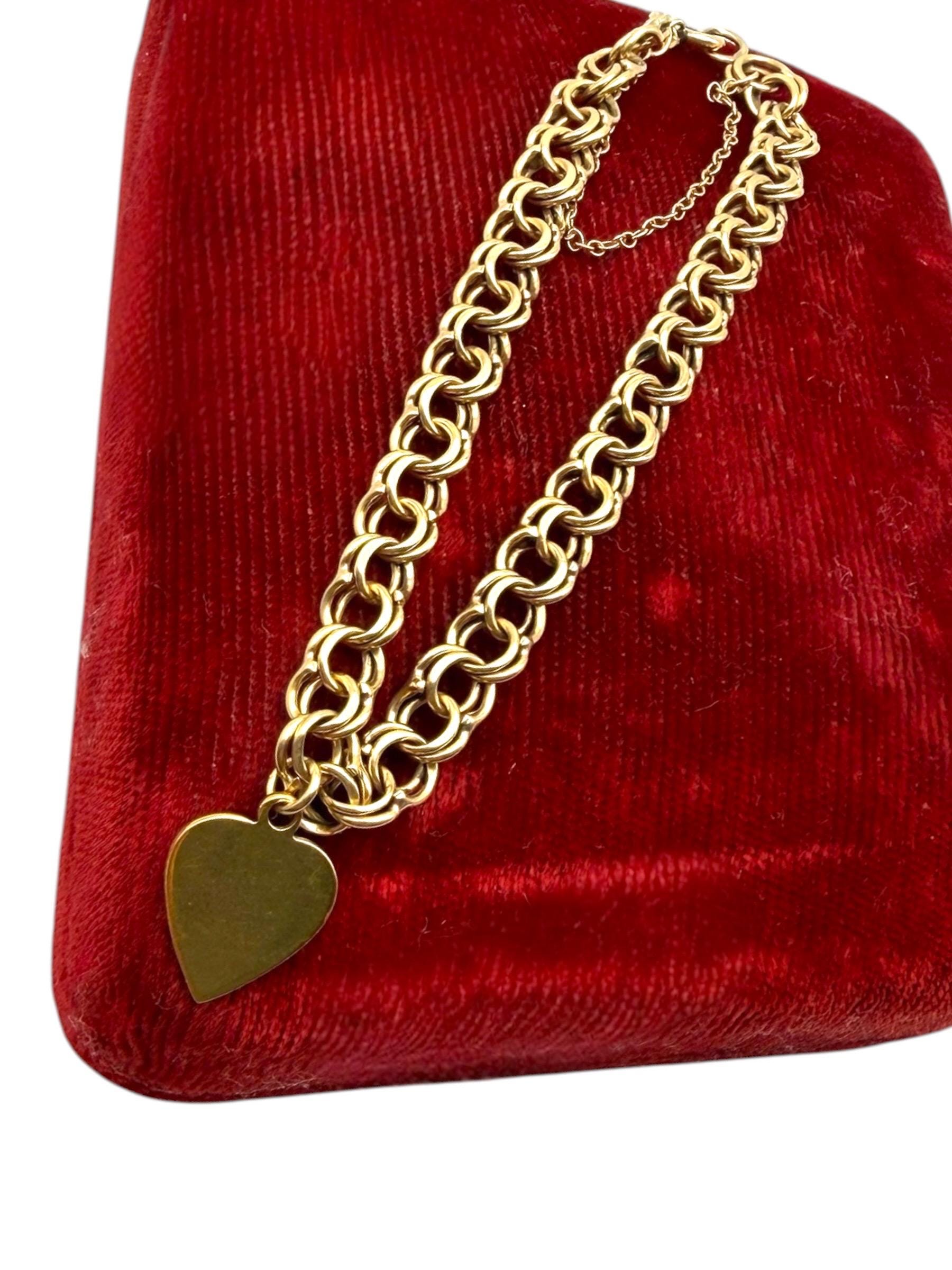 Beautiful double link chain charm bracelet with a heart shaped gold filled charm attached. The bracelet is 12K gold filled and made up of round double links for the 7 1/2'' length of the bracelet (for a larger wrist). It includes a safety chain. Attached is an adorable heart shaped charm hallmarked DANECRAFT 12K GF.