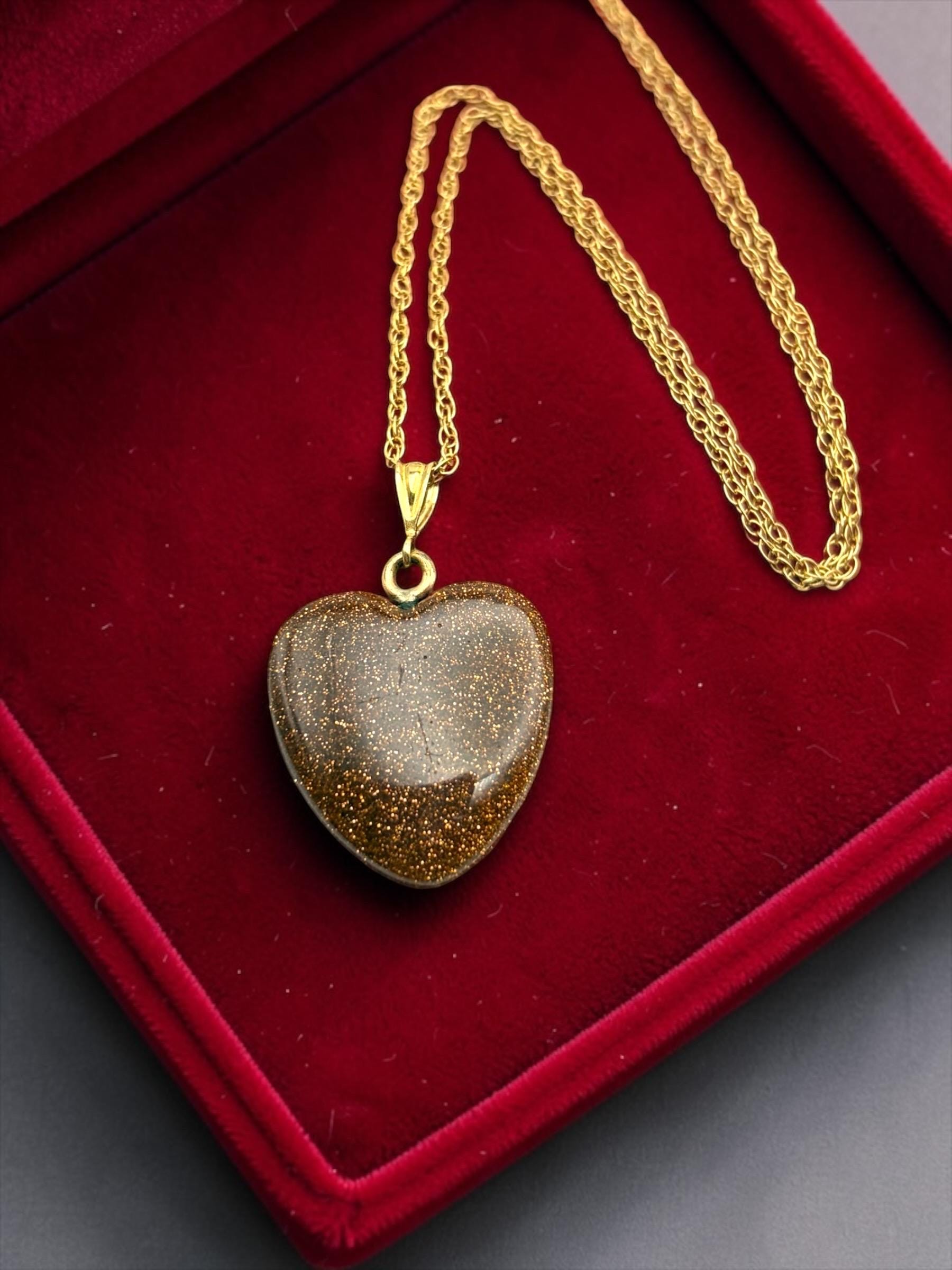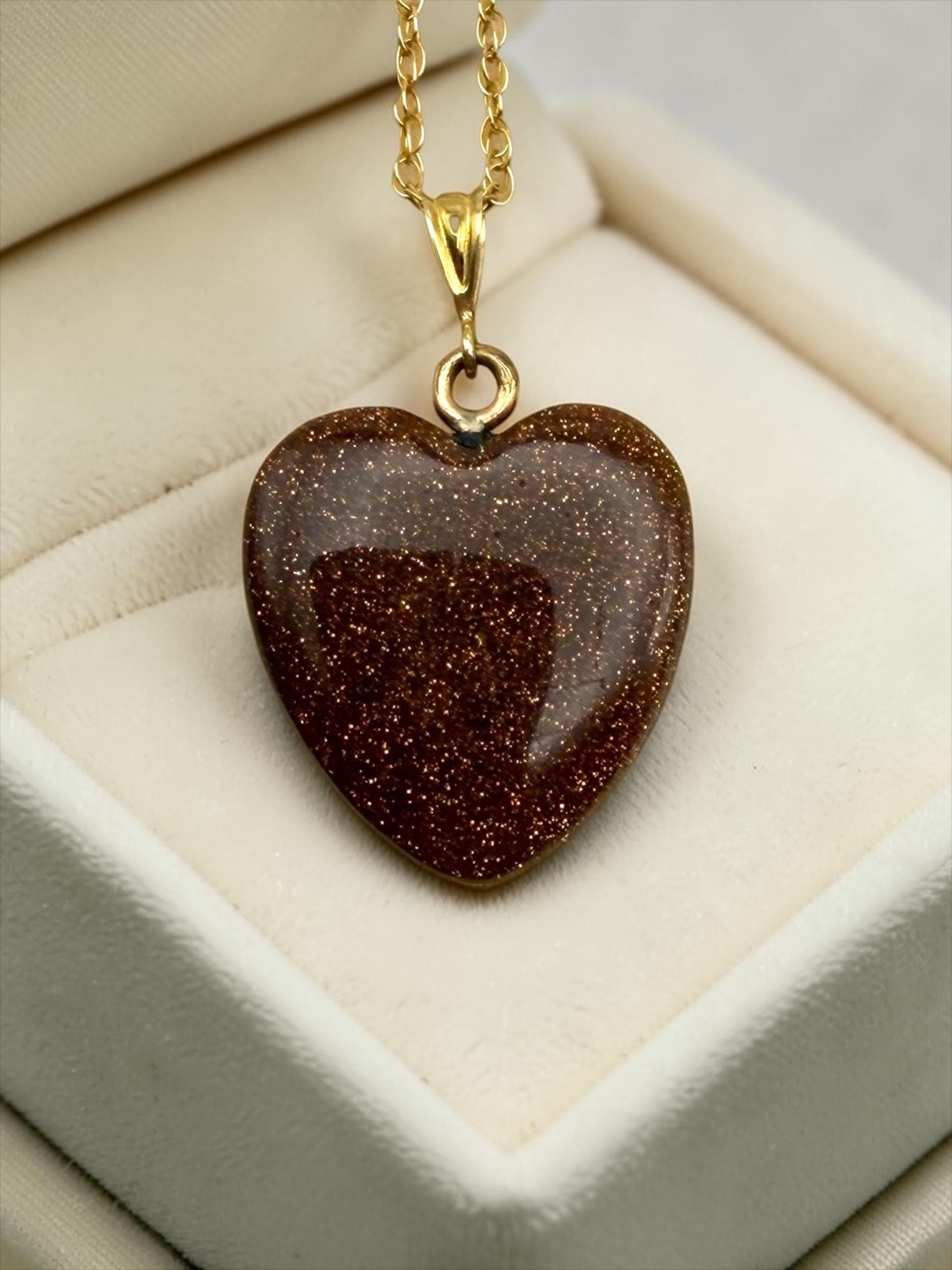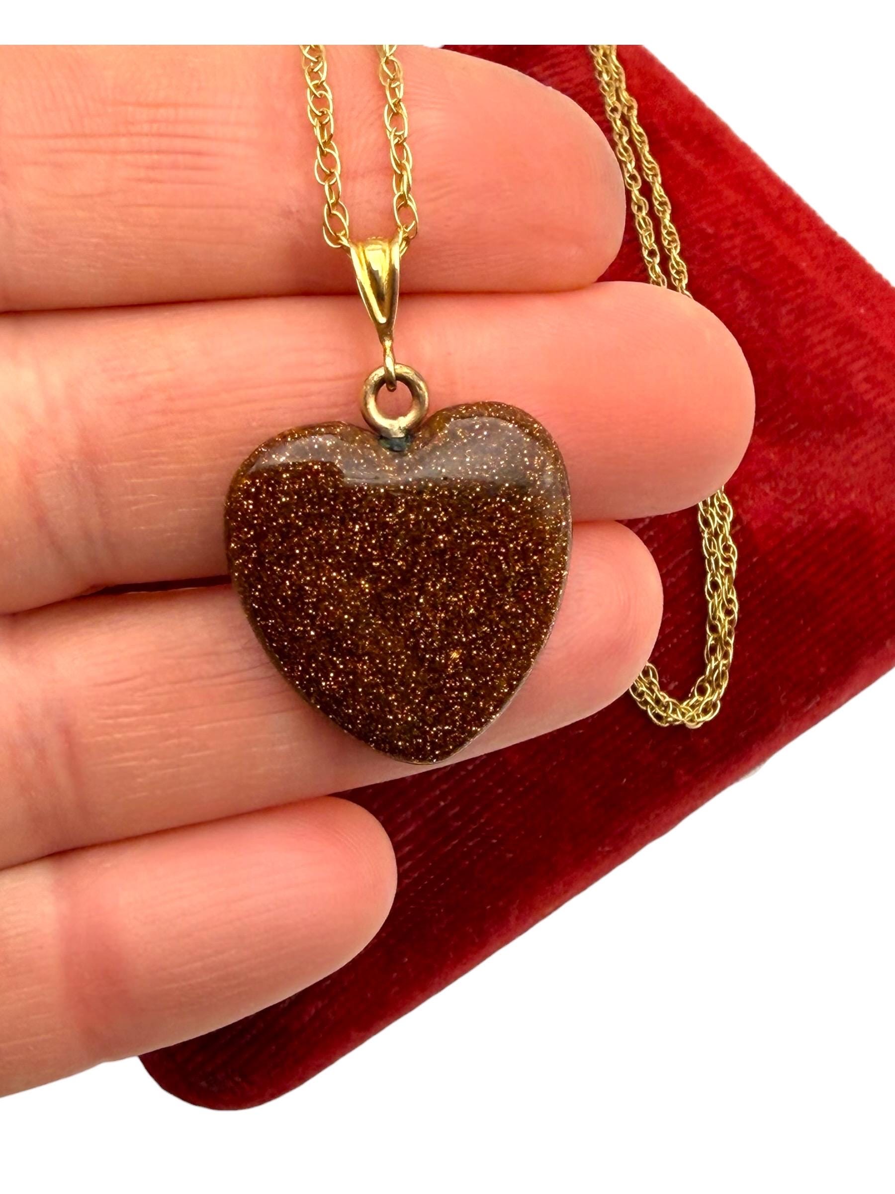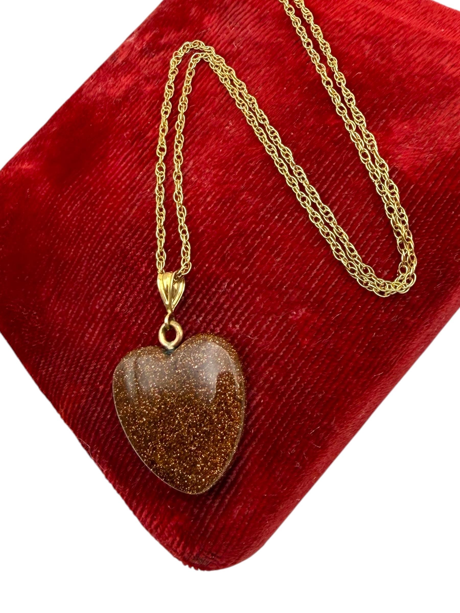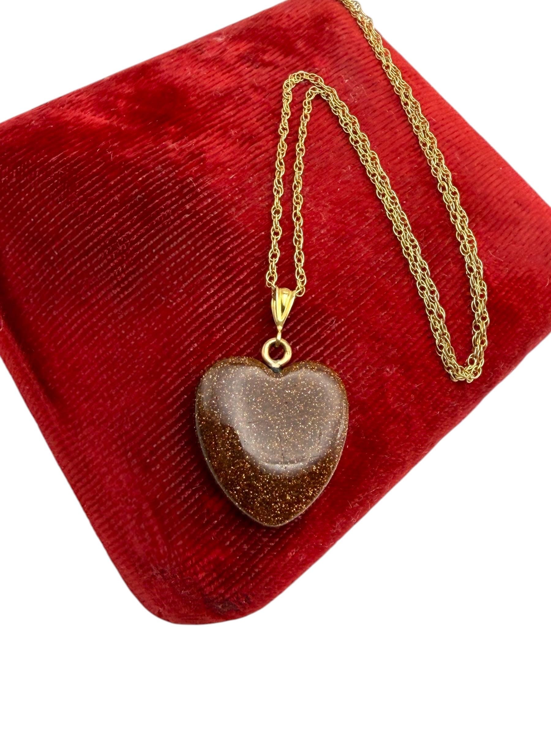 Vintage Goldstone Heart Pendant Necklace - 14K Gold Filled Chain Orange Glitter Heart Stone Charm