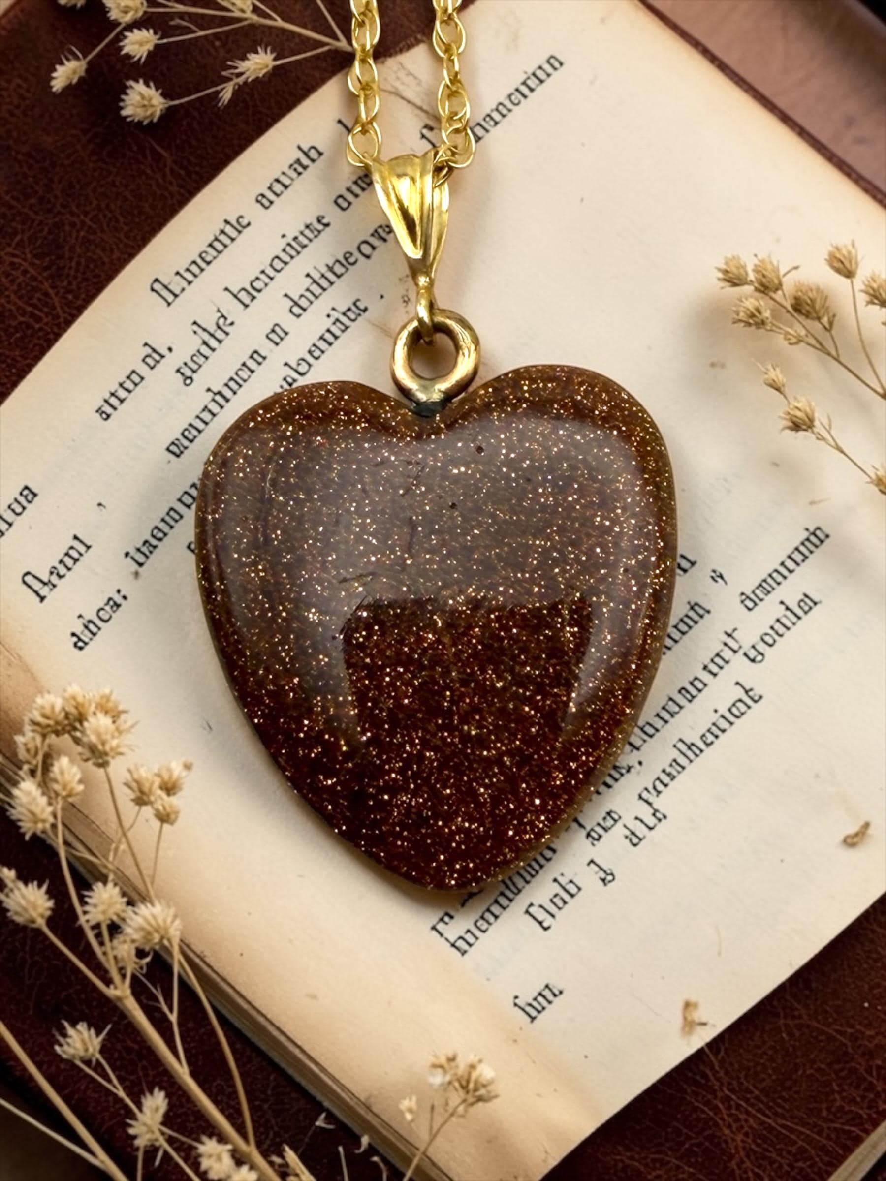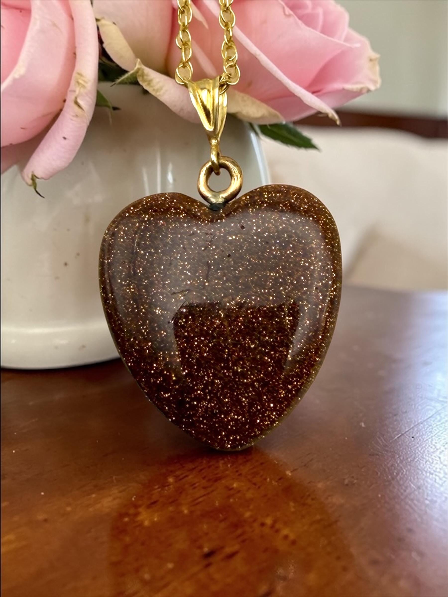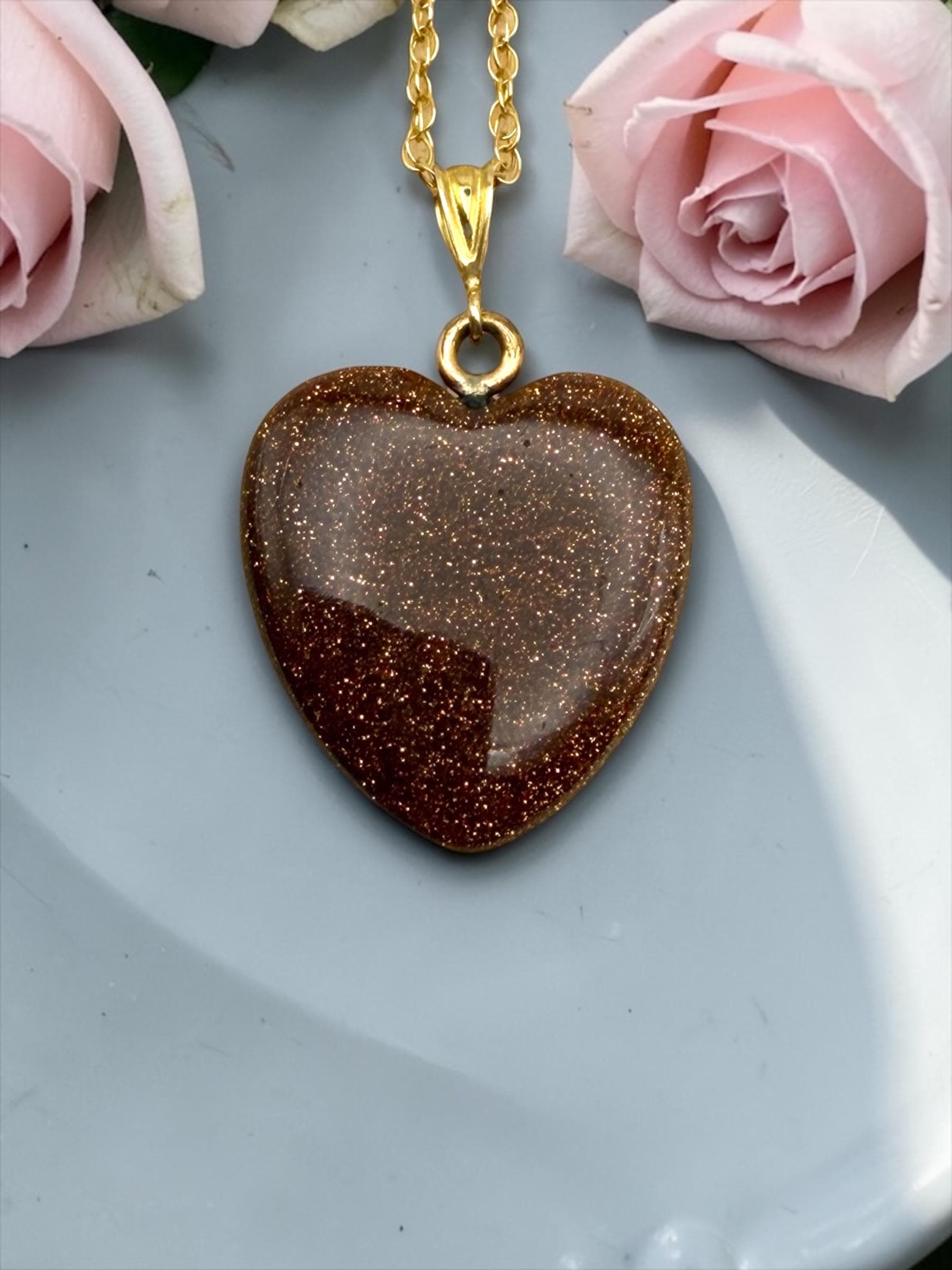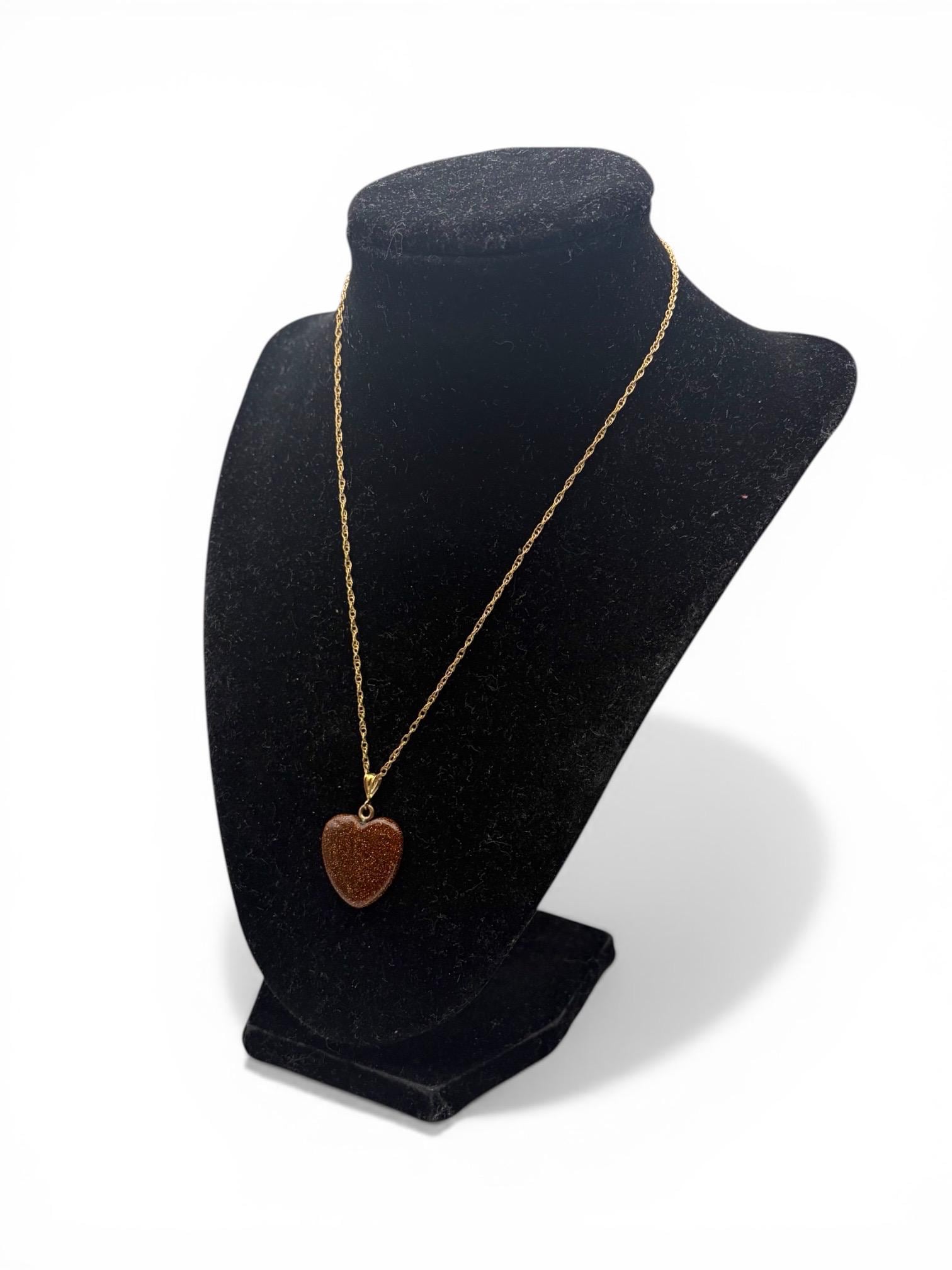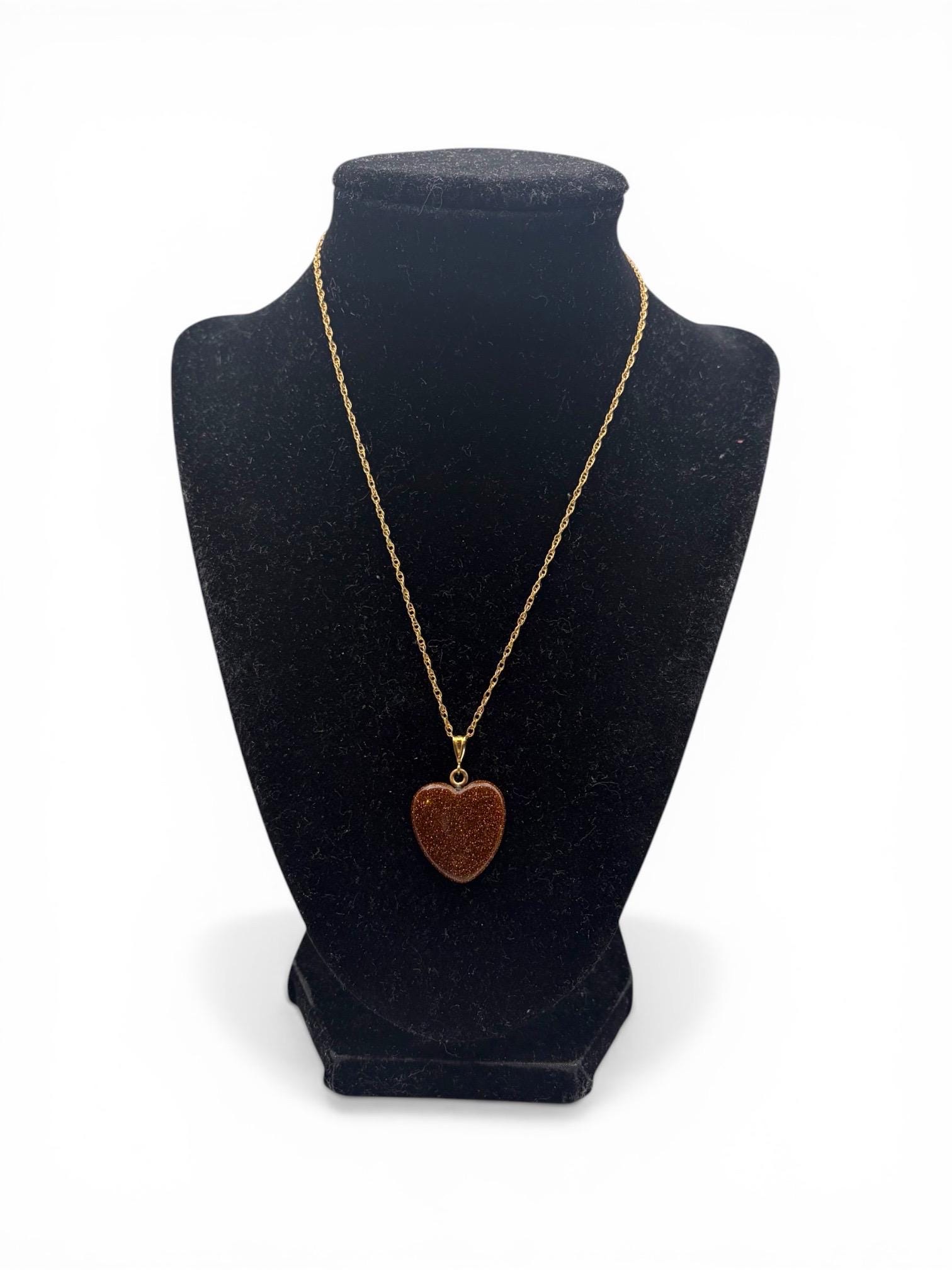 Vintage Goldstone Heart Pendant Necklace - 14K Gold Filled Chain Orange Glitter Heart Stone Charm