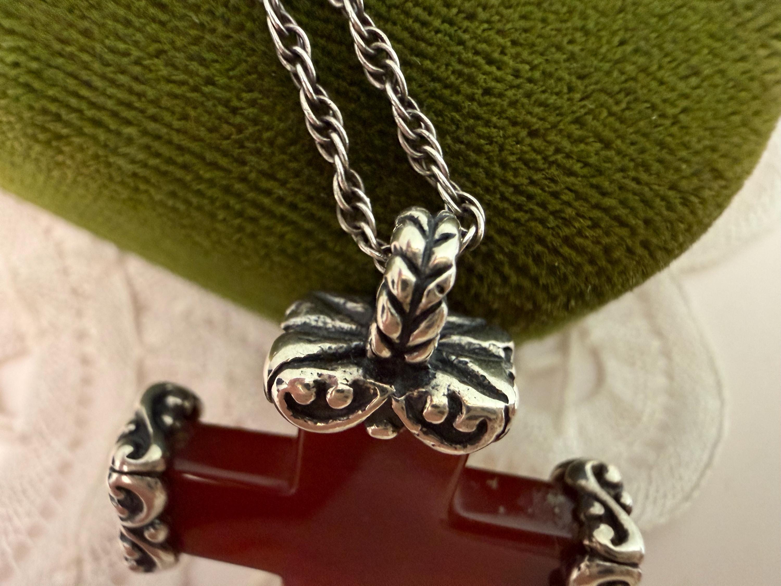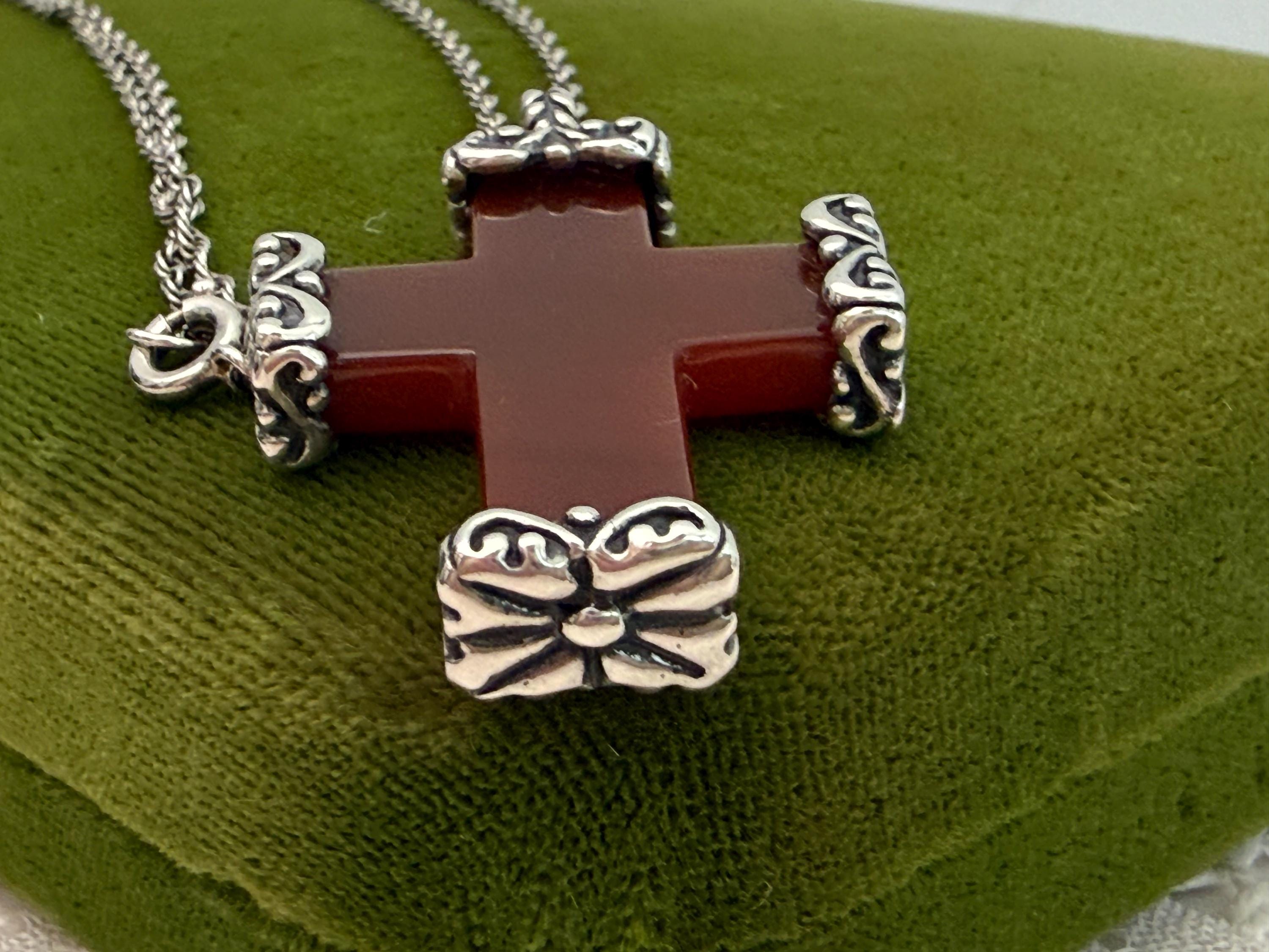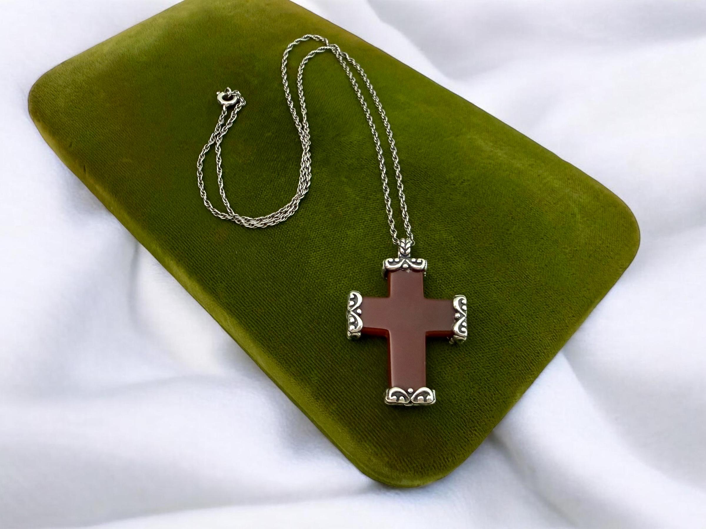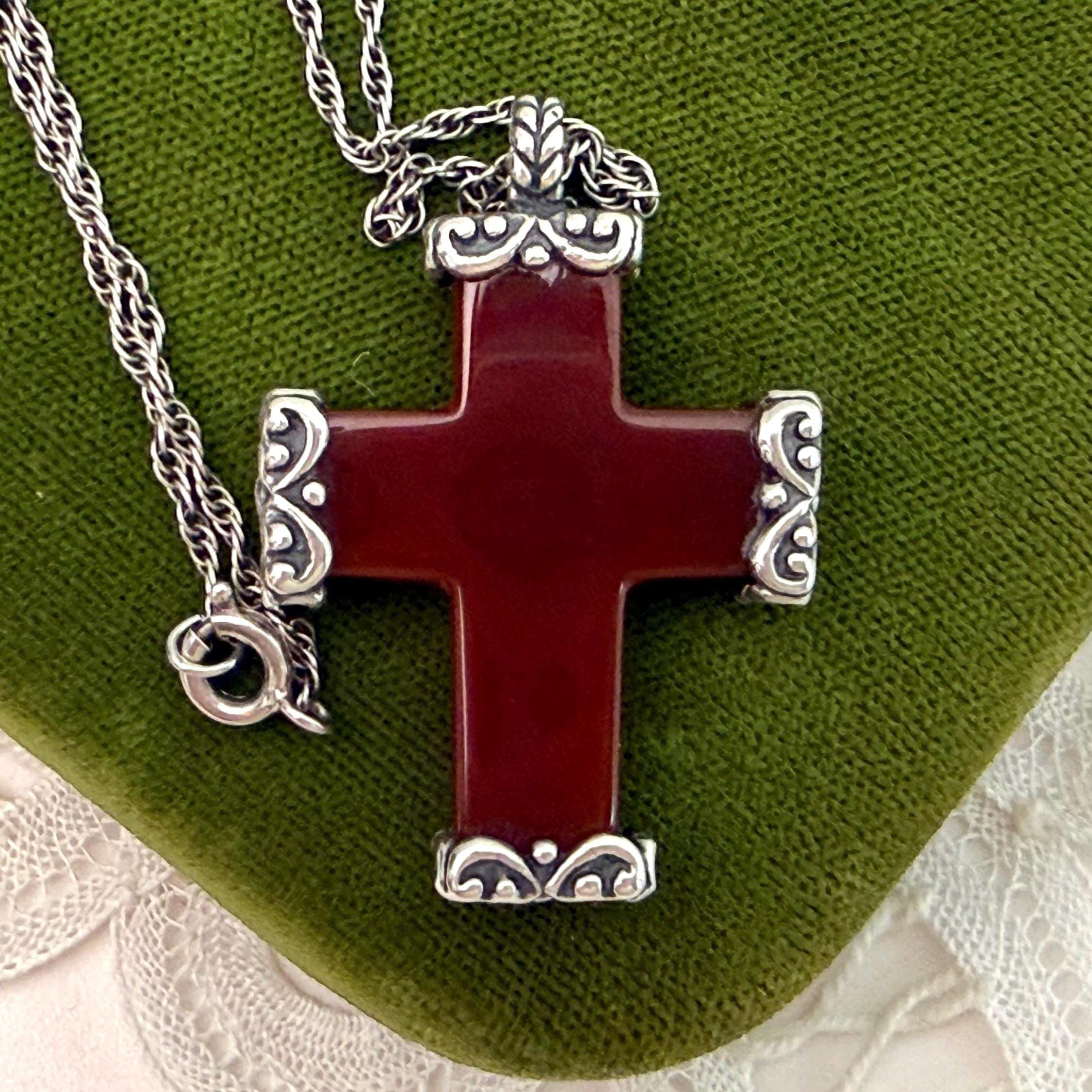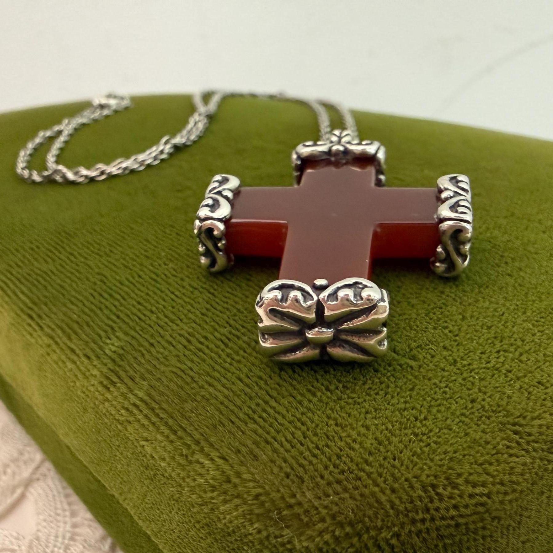 A vintage religious pendant necklace made from carved carnelian with ornate end caps. The cross hangs from a vintage sterling silver chain.