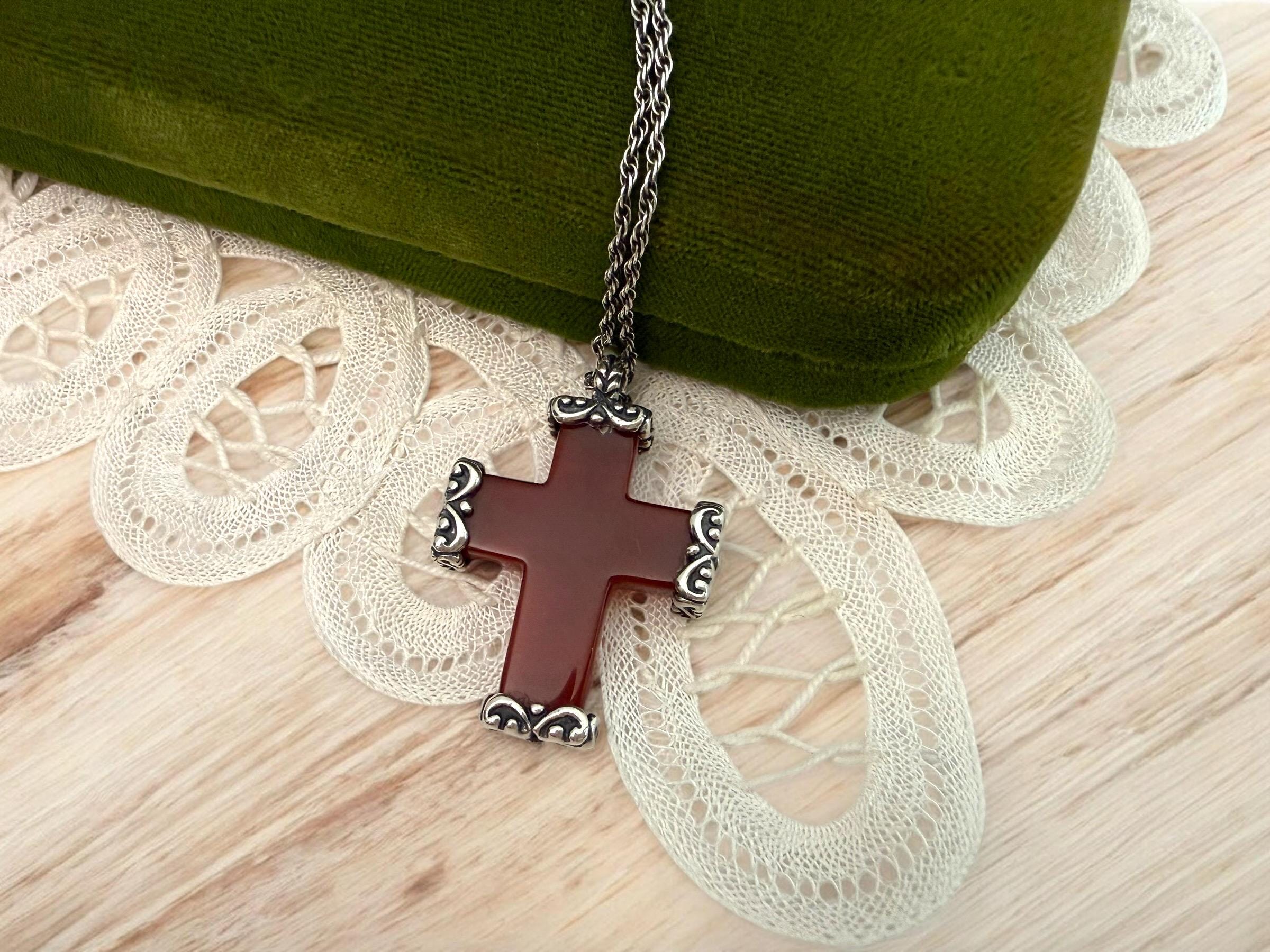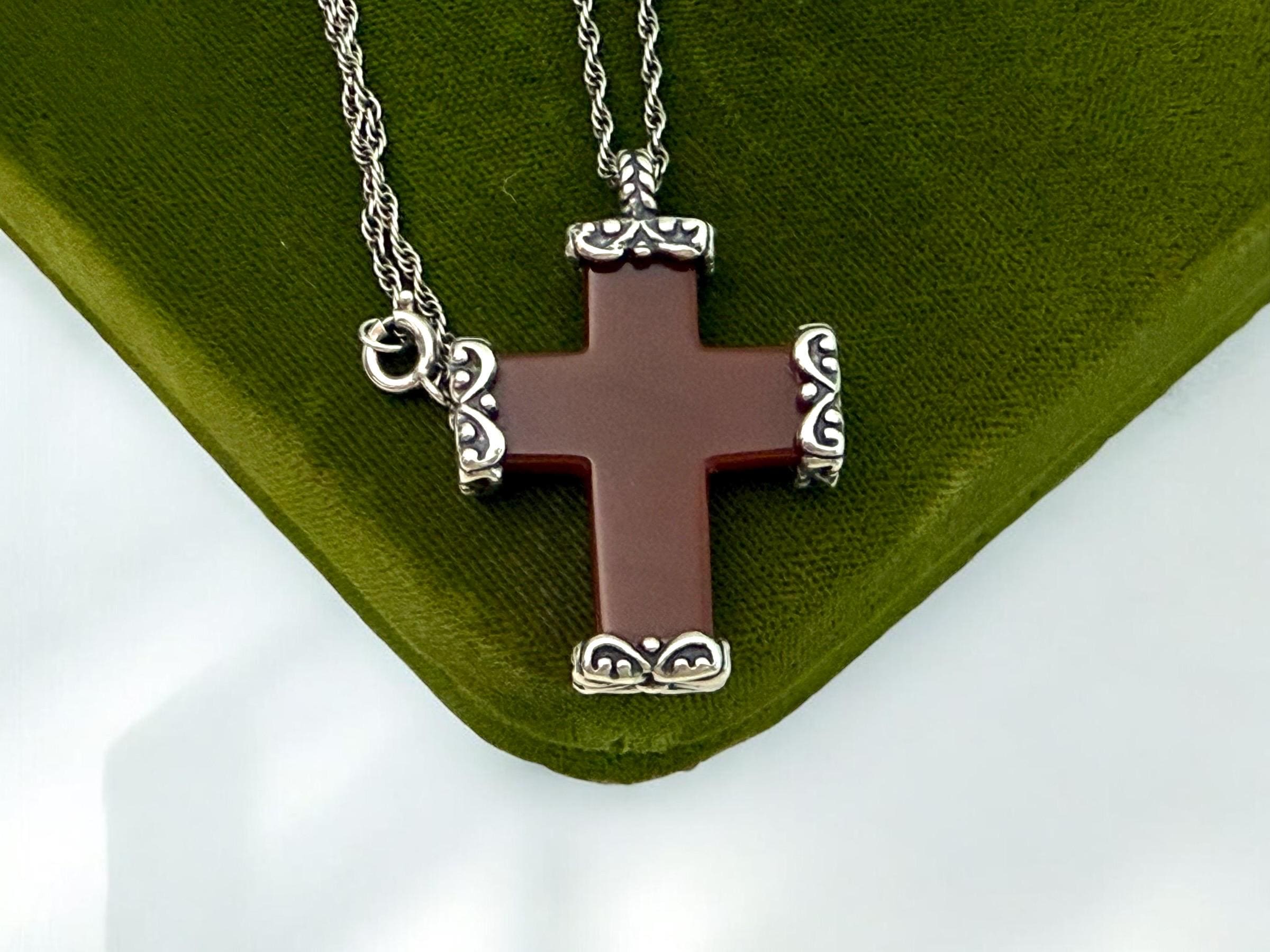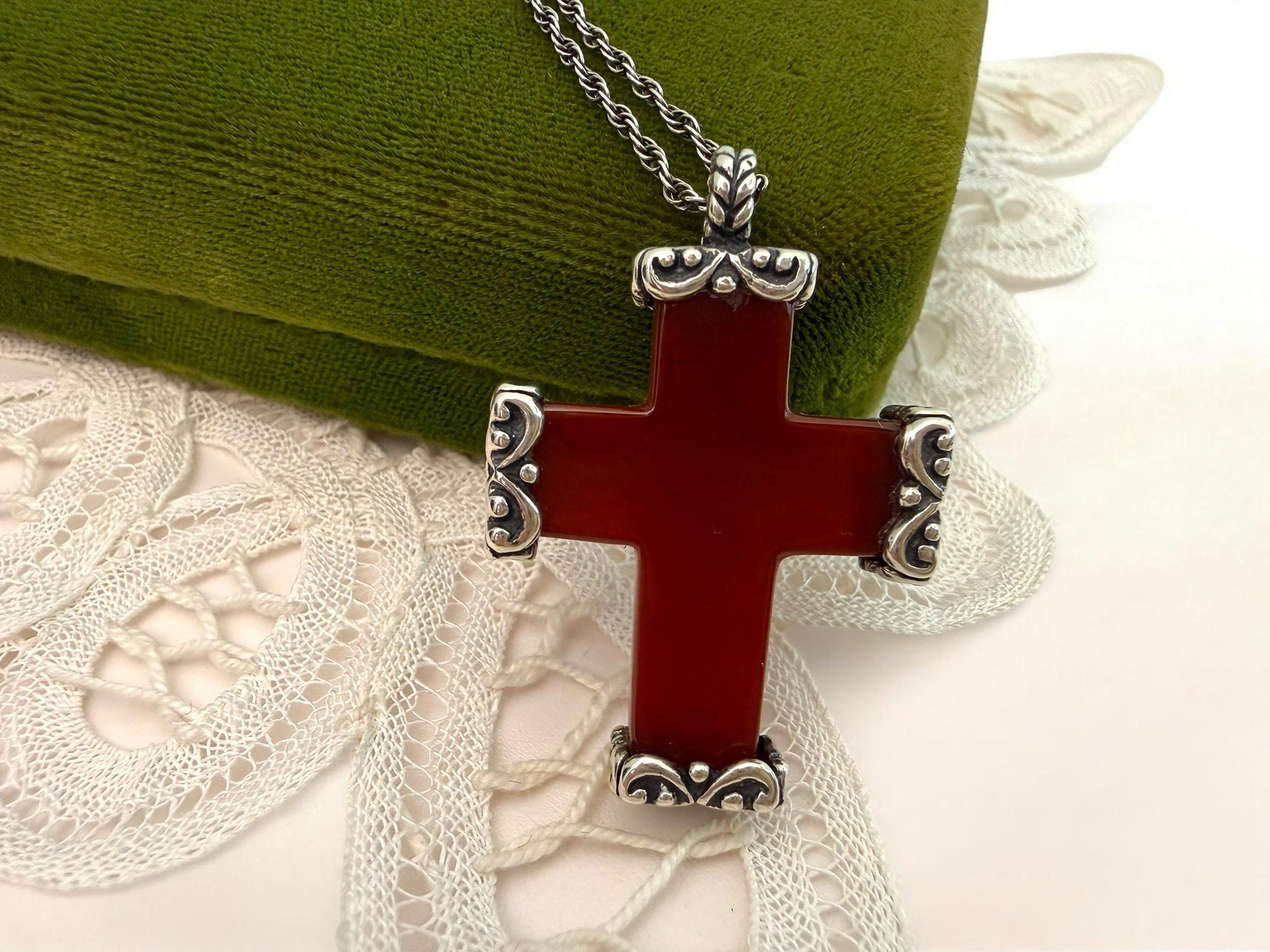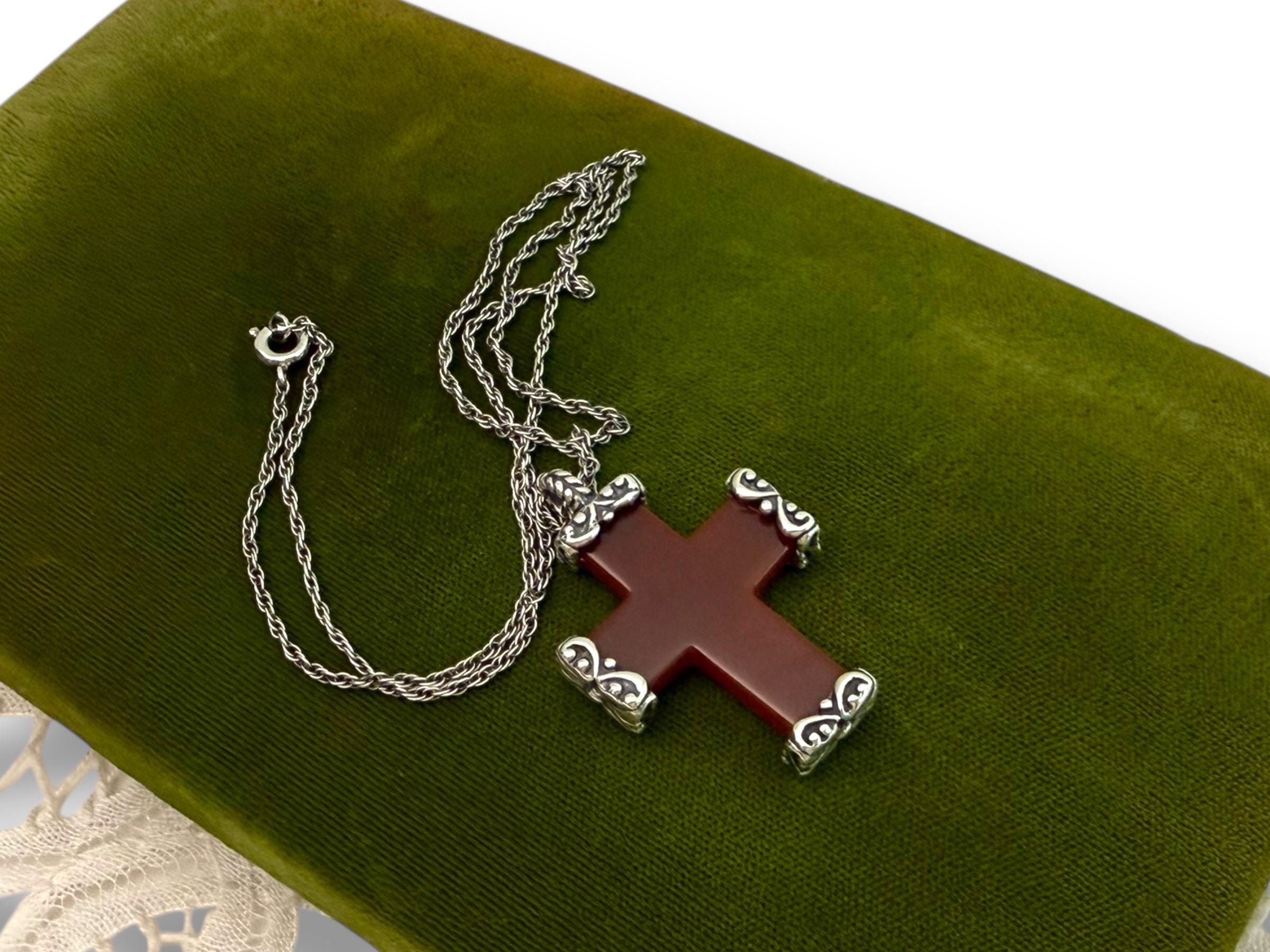 Vintage Carved Carnelian Cross Necklace: 925 Sterling Silver Chain, Religious Pendant