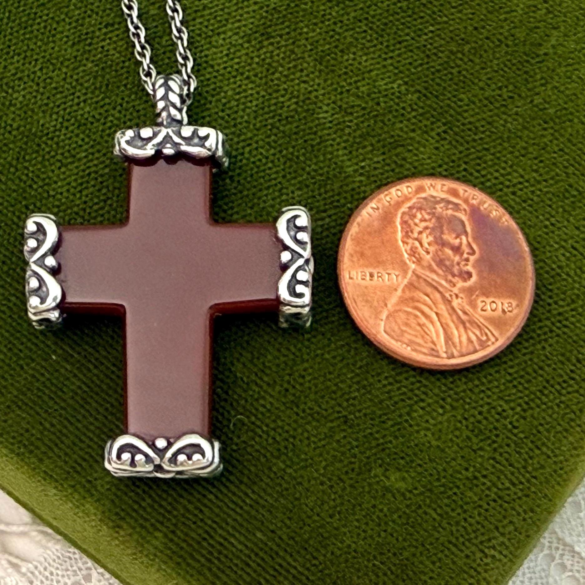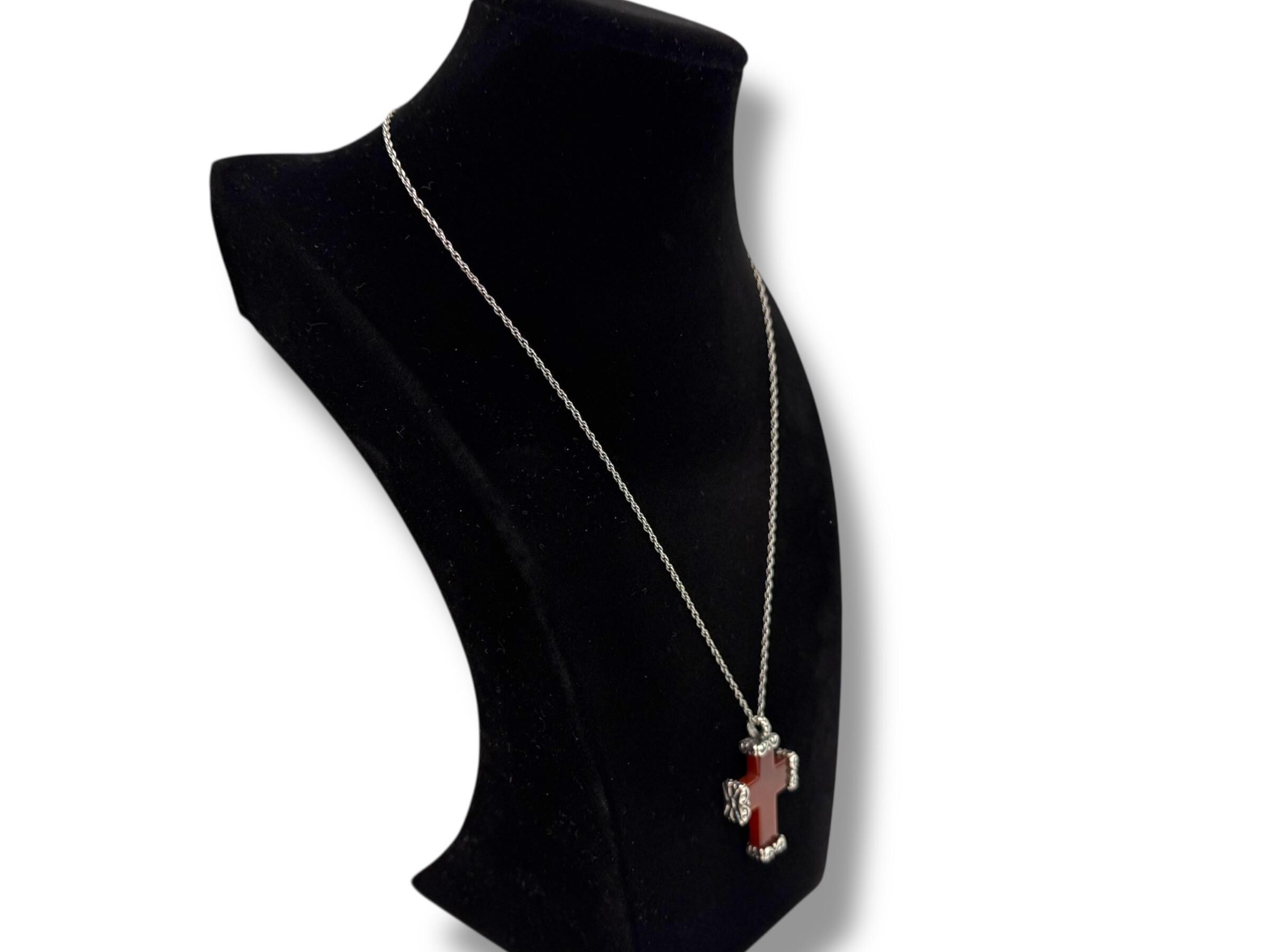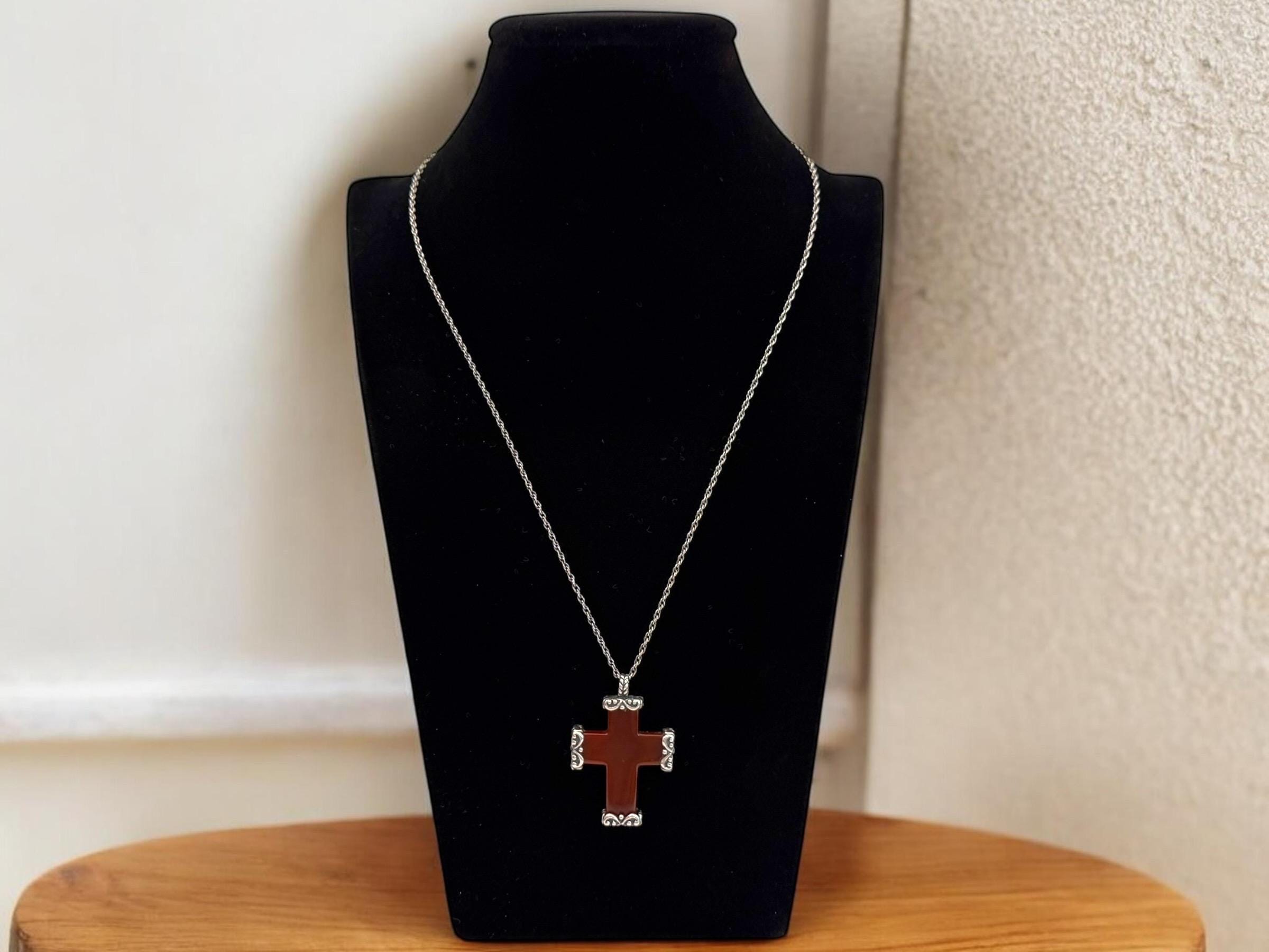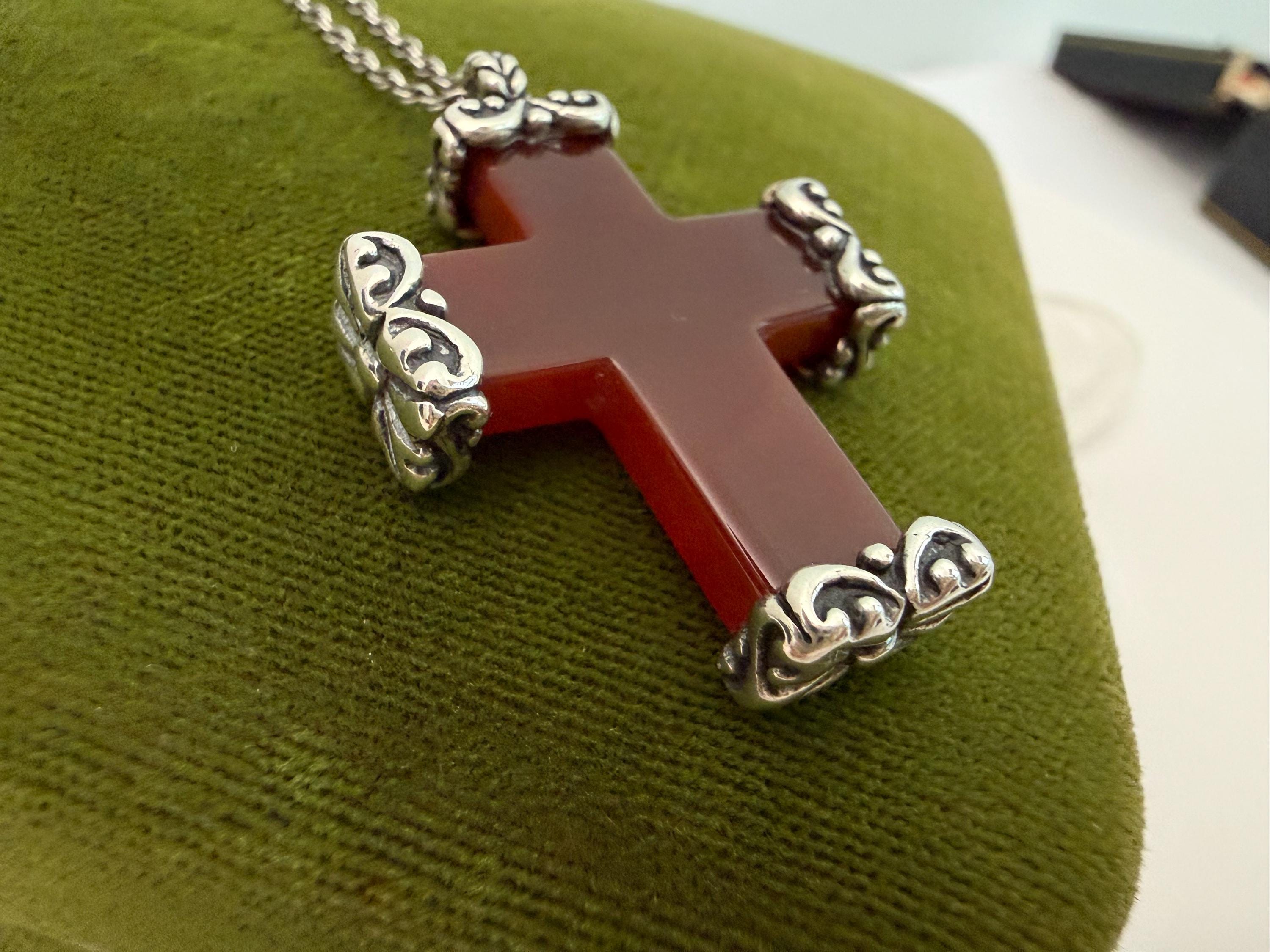 Vintage Carved Carnelian Cross Necklace: 925 Sterling Silver Chain, Religious Pendant