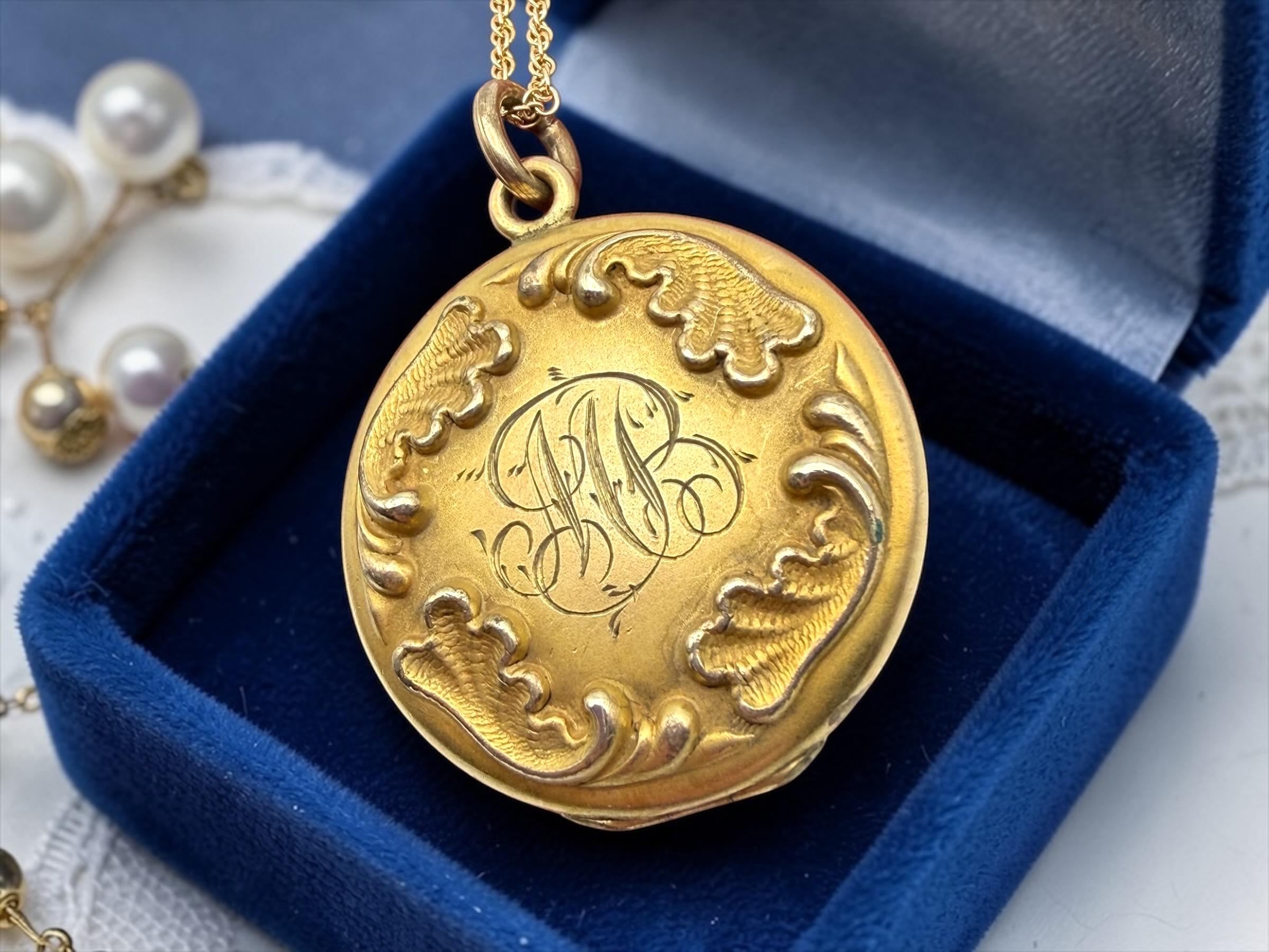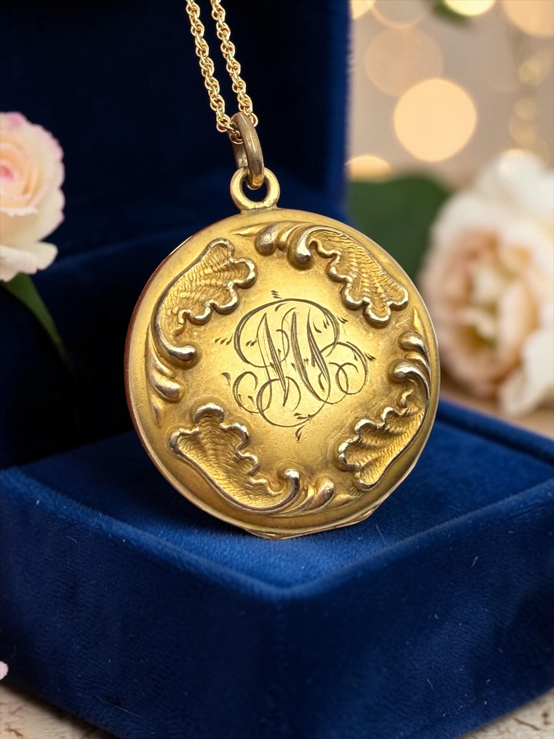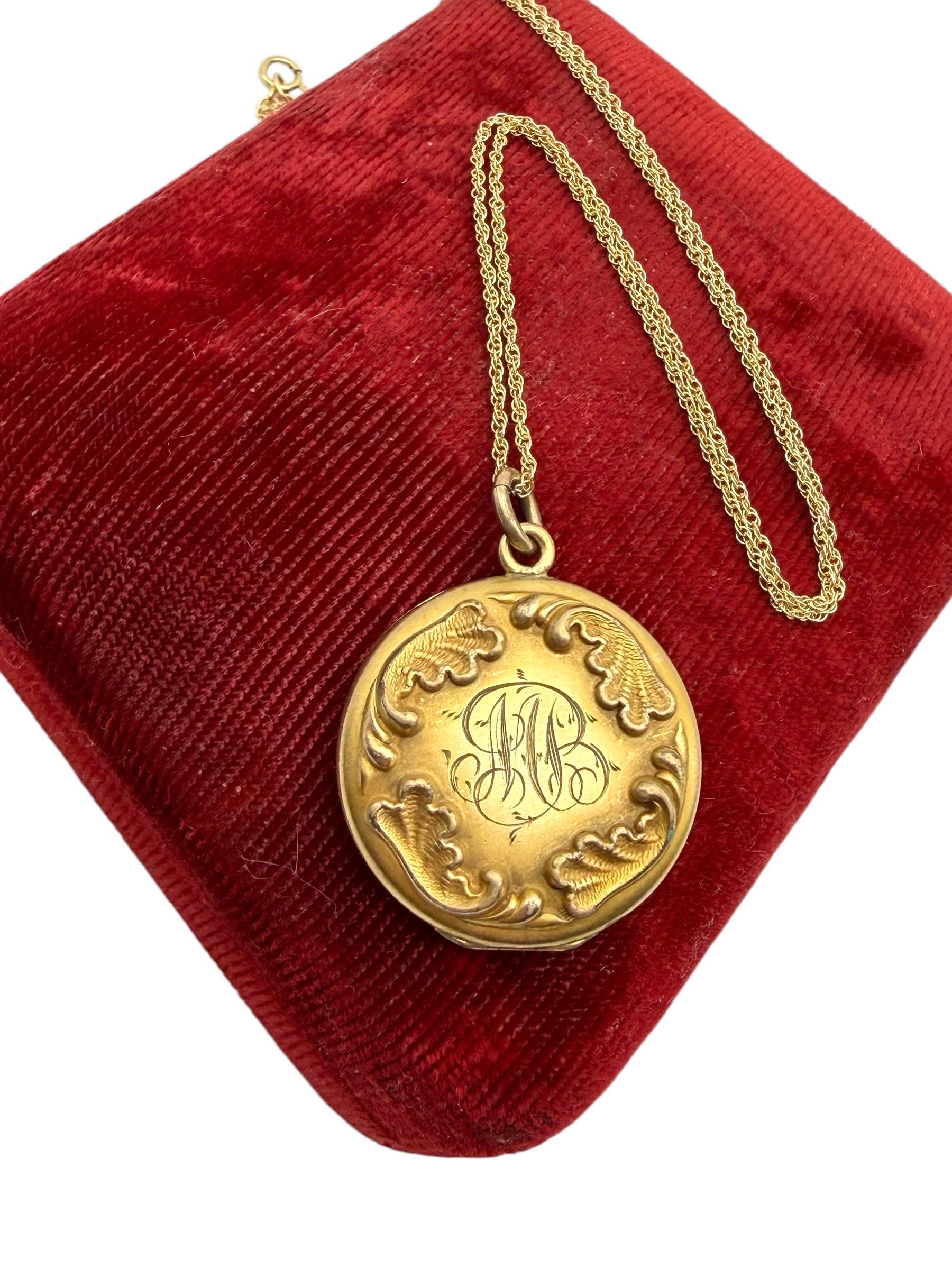 Antique Art Nouveau Locket: Vintage Gold Filled Necklace Large Round Repousse Monogrammed MB Photo Pendant, 14K GF Chain