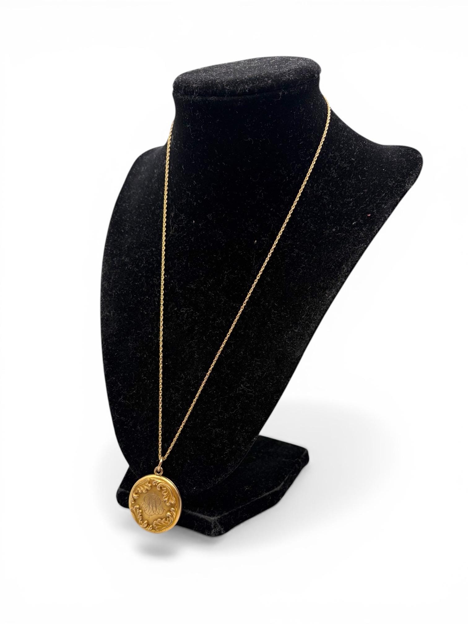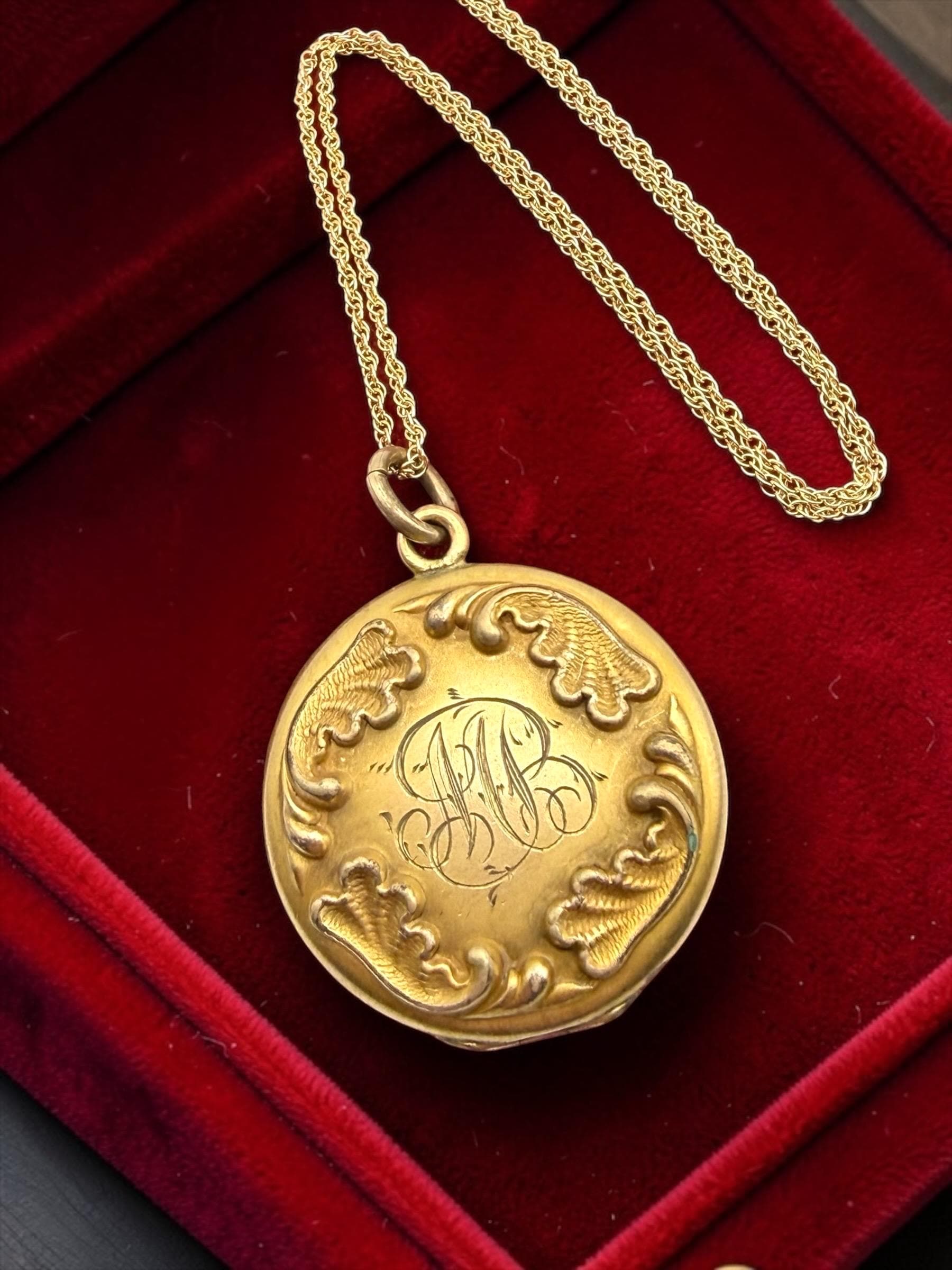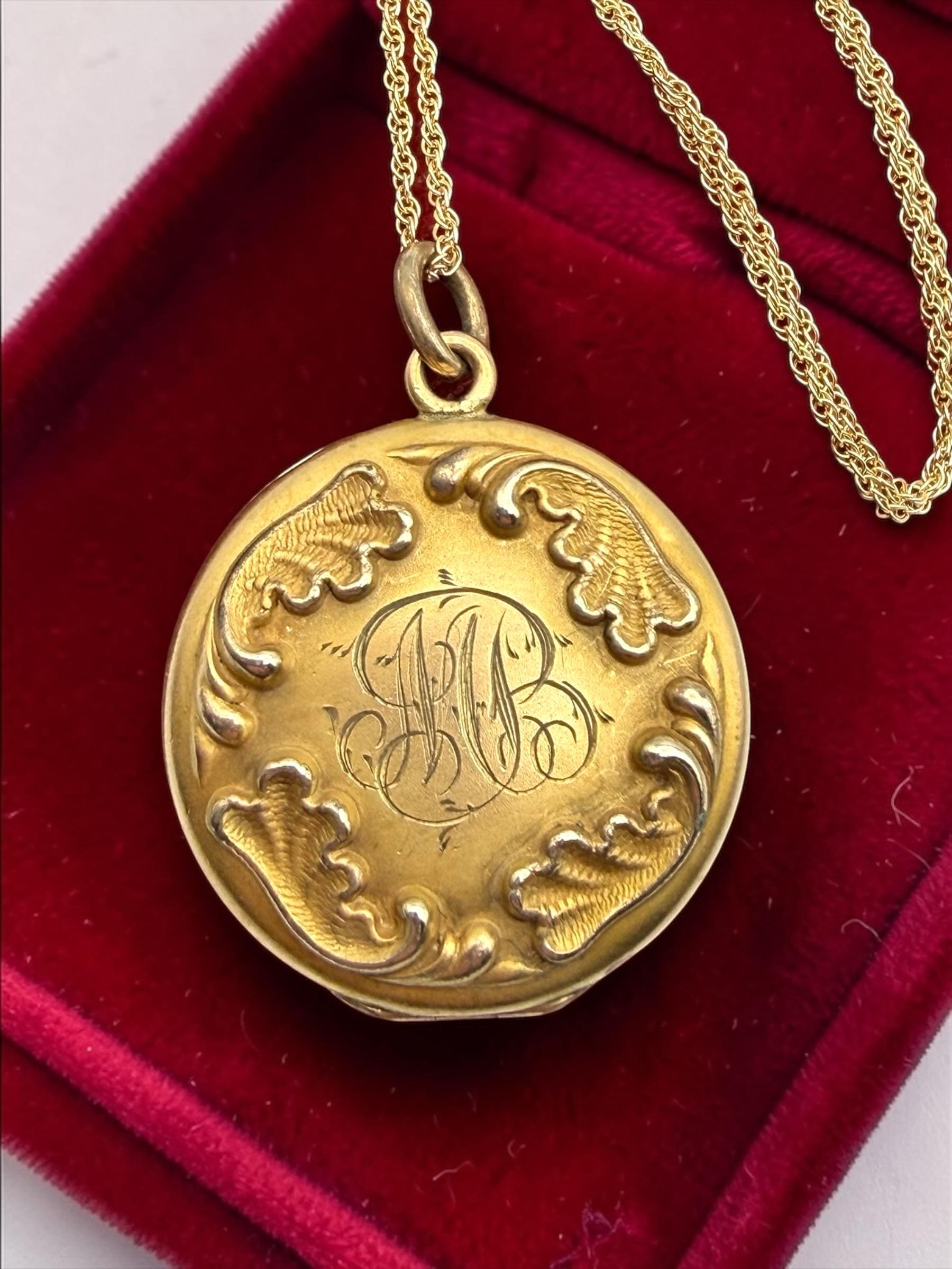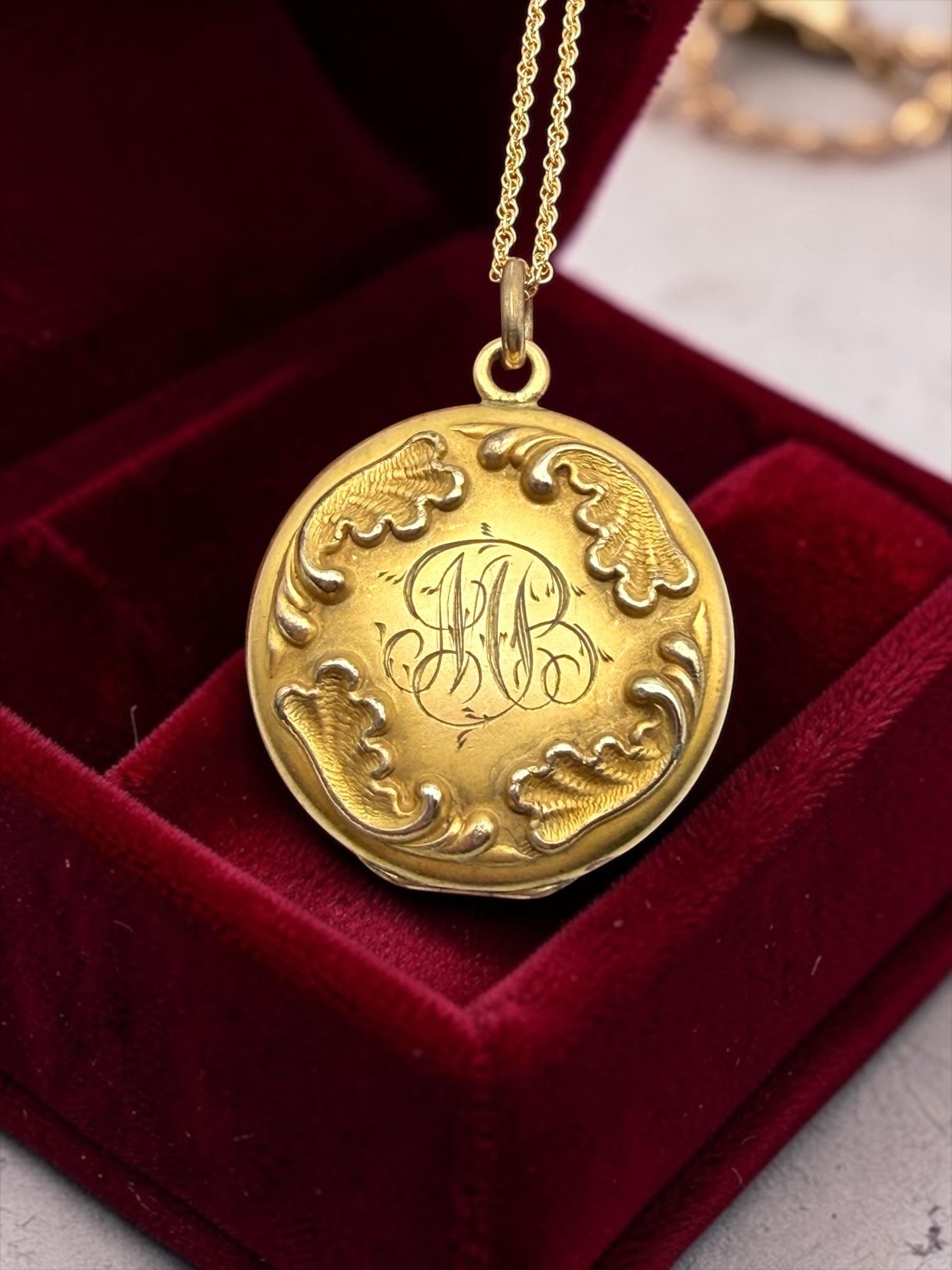Antique Art Nouveau Locket: Vintage Gold Filled Necklace Large Round Repousse Monogrammed MB Photo Pendant, 14K GF Chain
