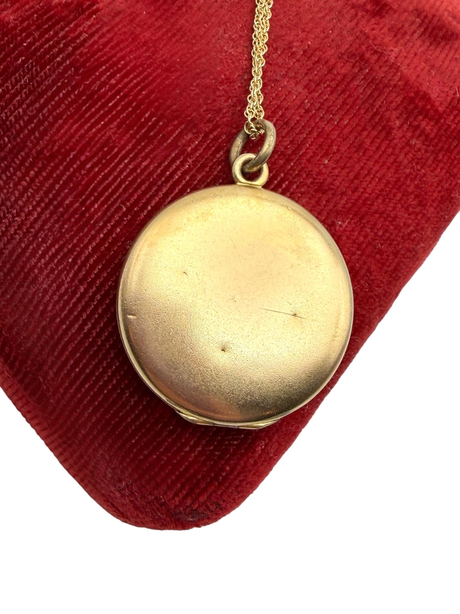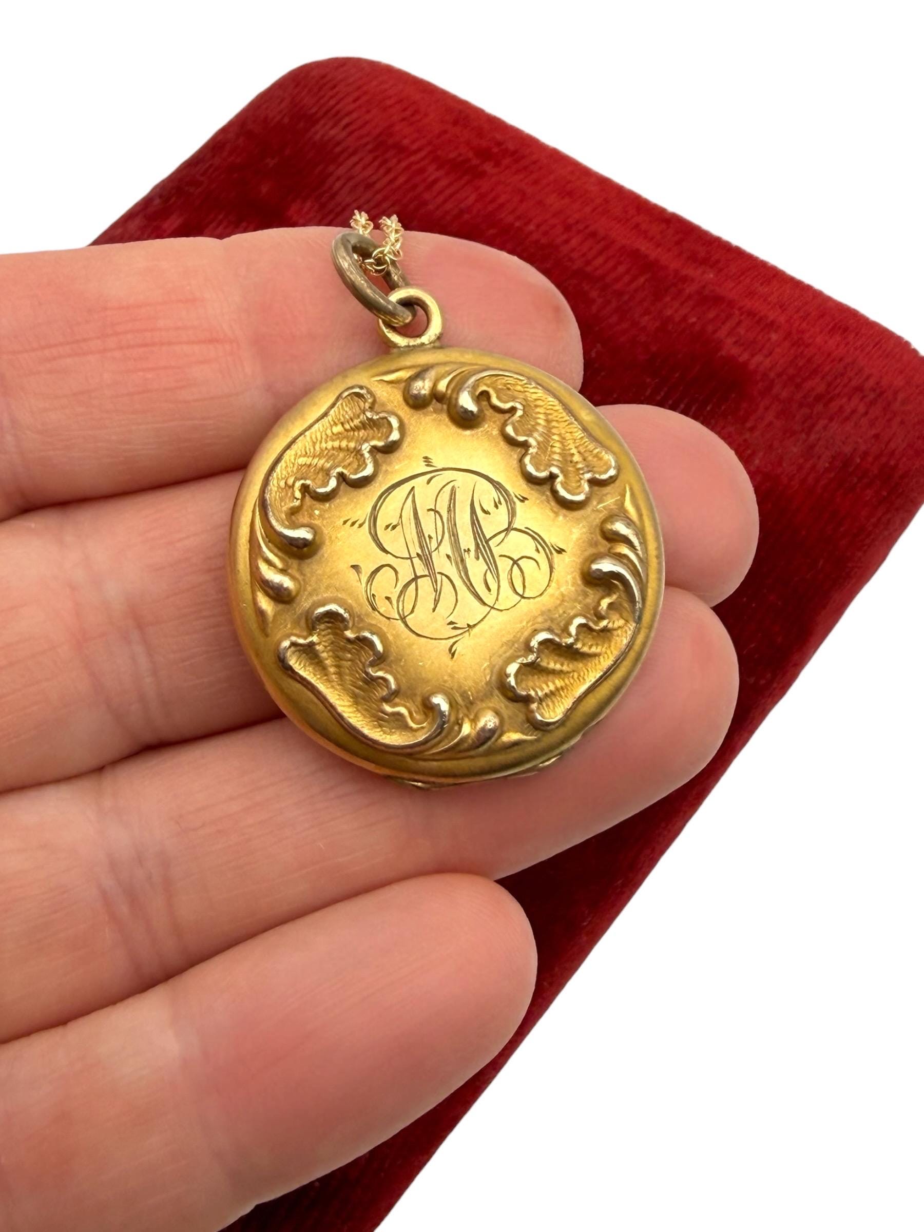 Absolutely beautiful, this large round gold filled locket has amazing detail. The front has a repose (raised) leaf type design with the cursive monogrammed letters etched in the front "MB". The back is plain with no design.