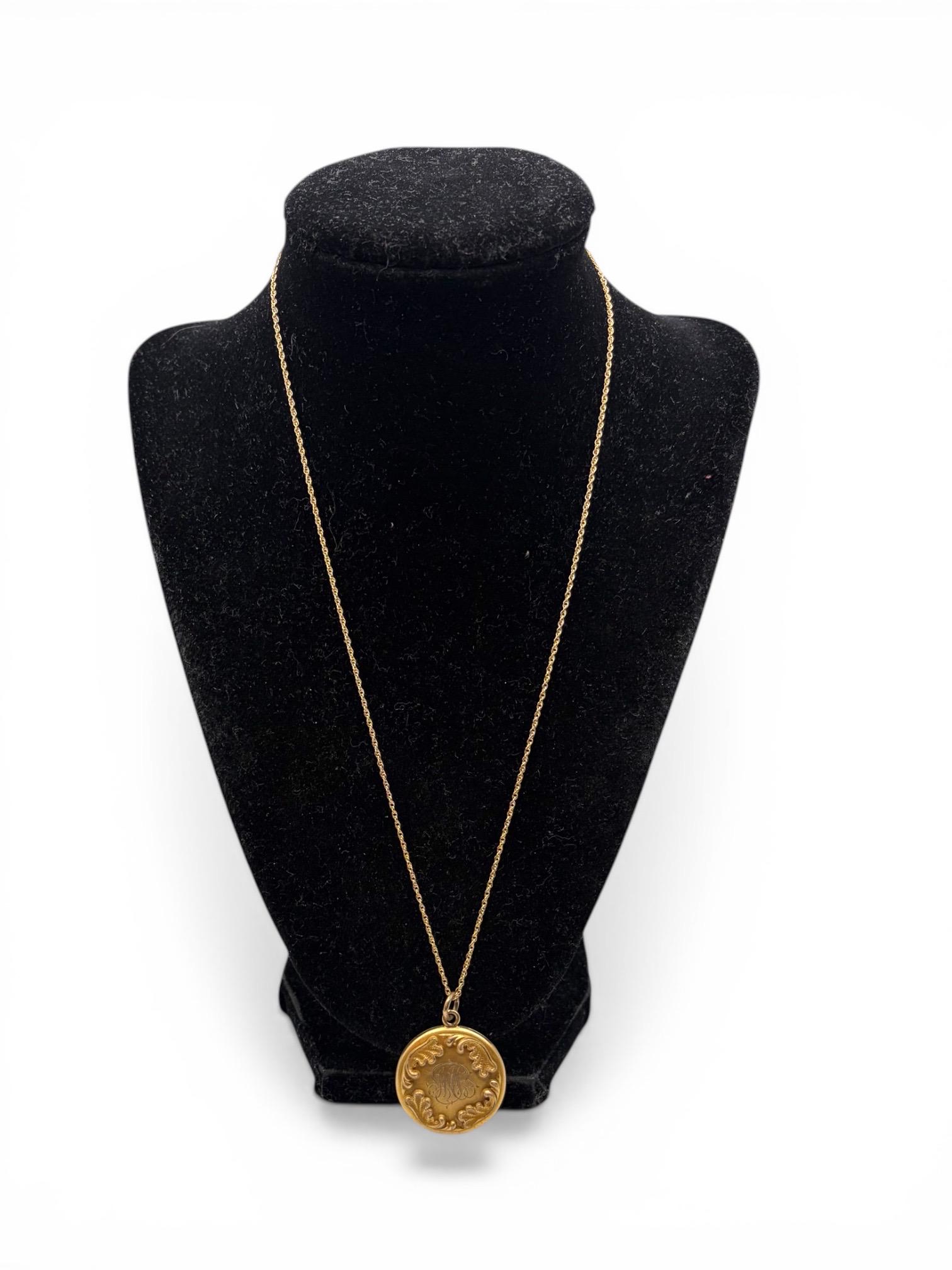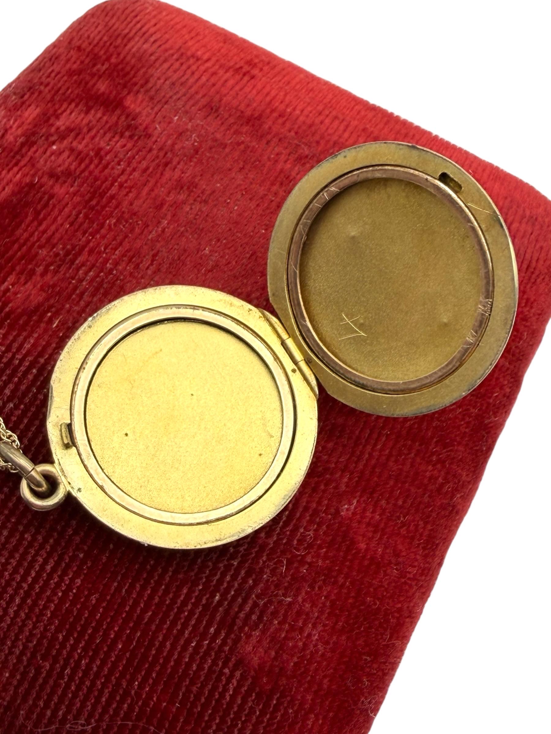 The locket is attached to a new chain - 20” long 14K gold filled rope link chain which secures with a spring ring clasp. The locket can be purchased with or without the chain.