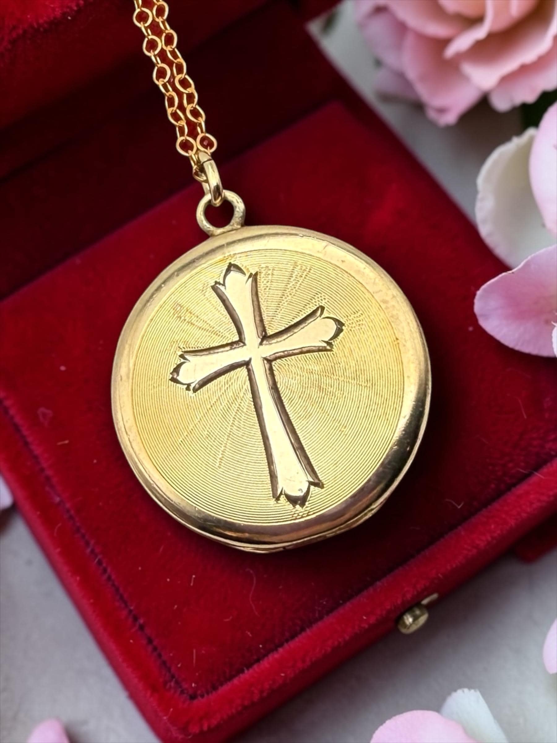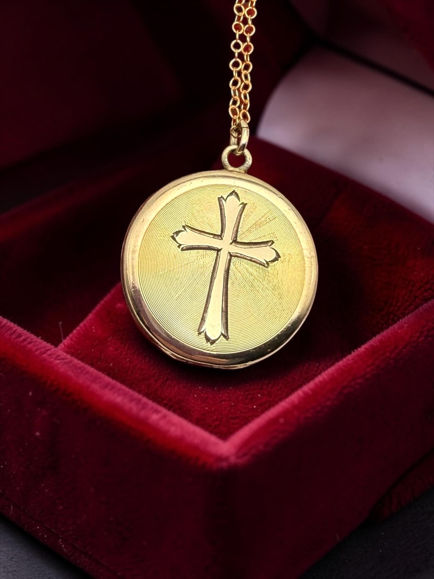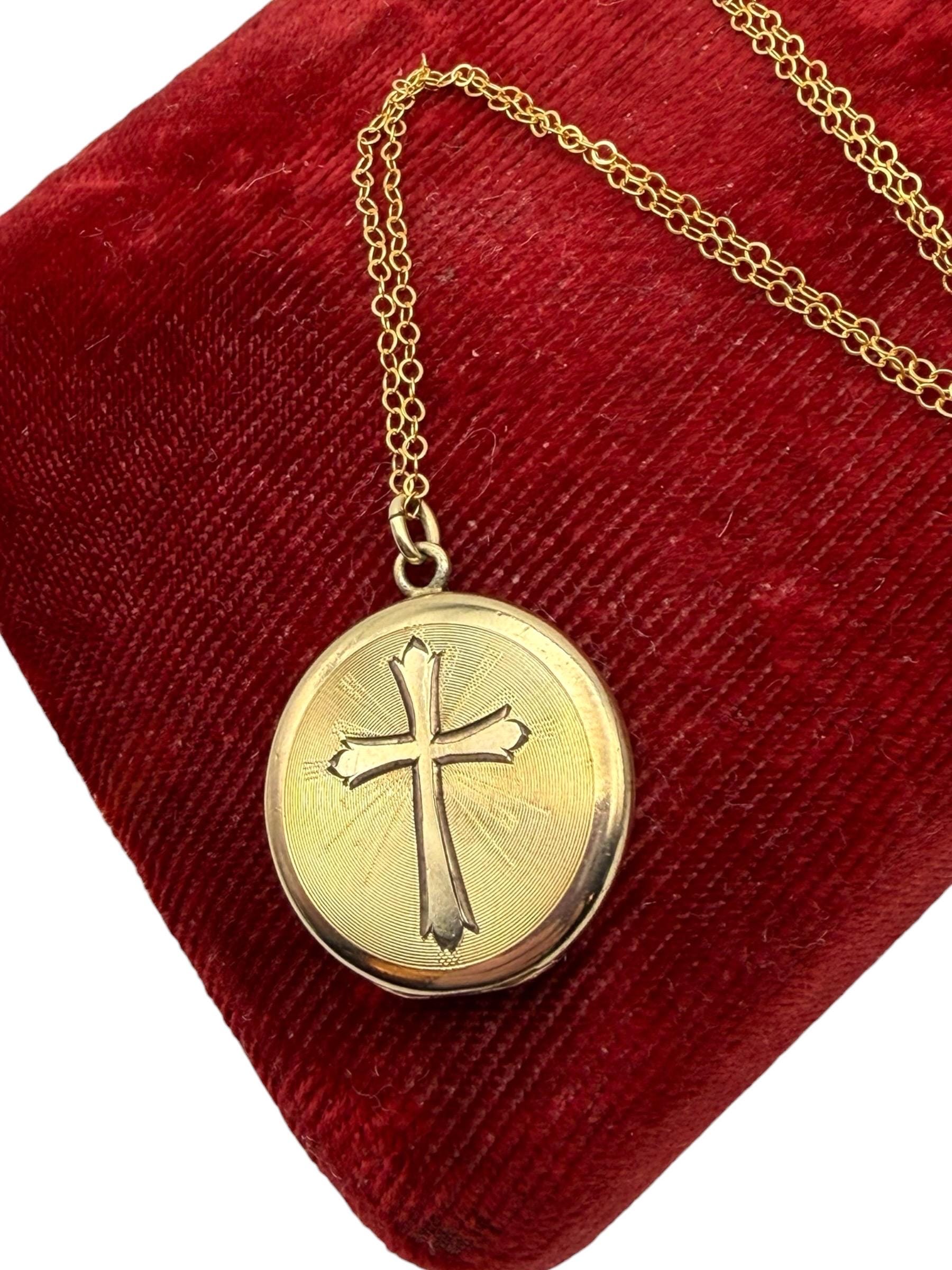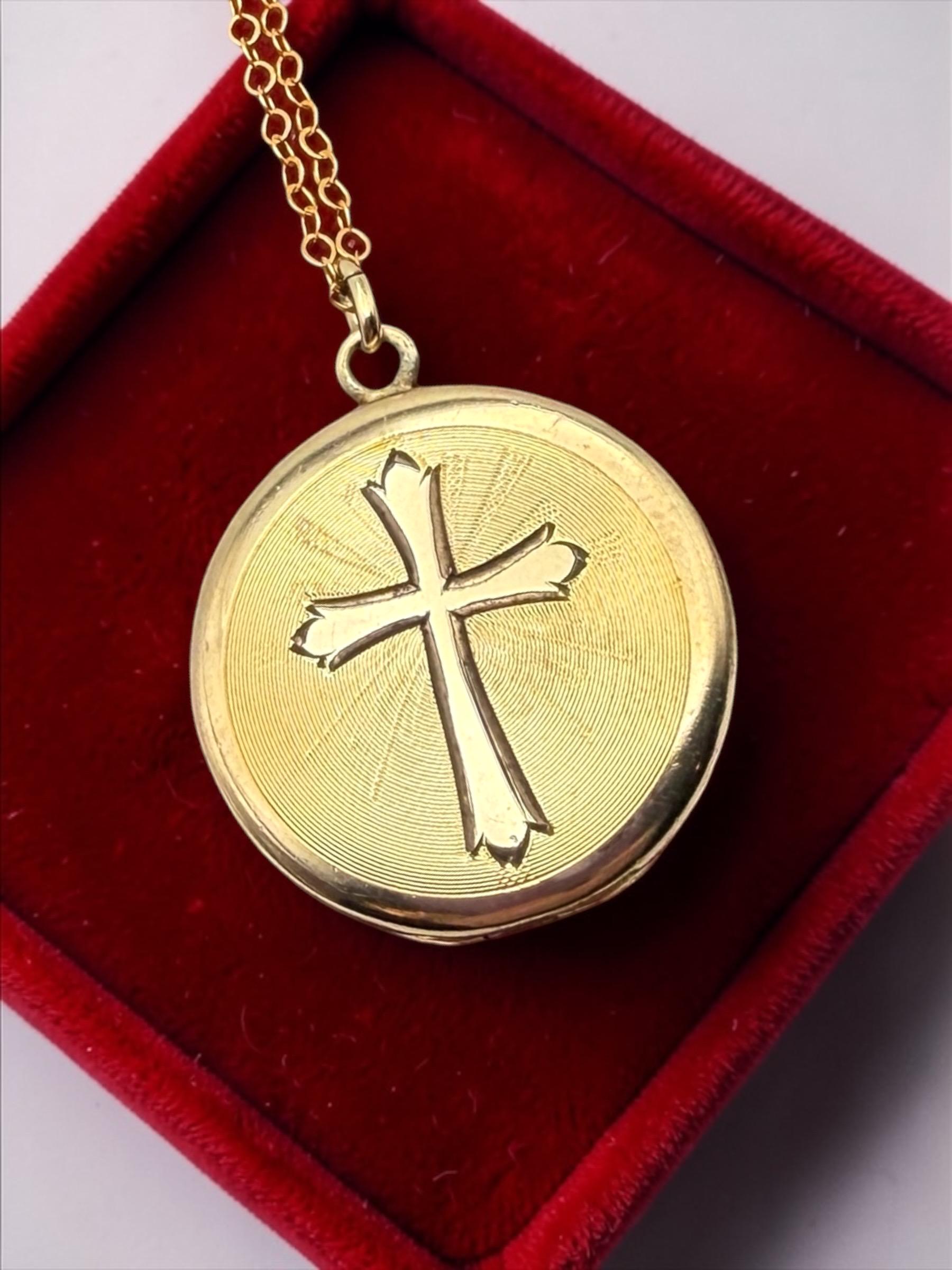 Shiny 12K gold filled vintage locket with etched cross on the front. The back is plain with no design. Beautiful piece of religions jewelry!