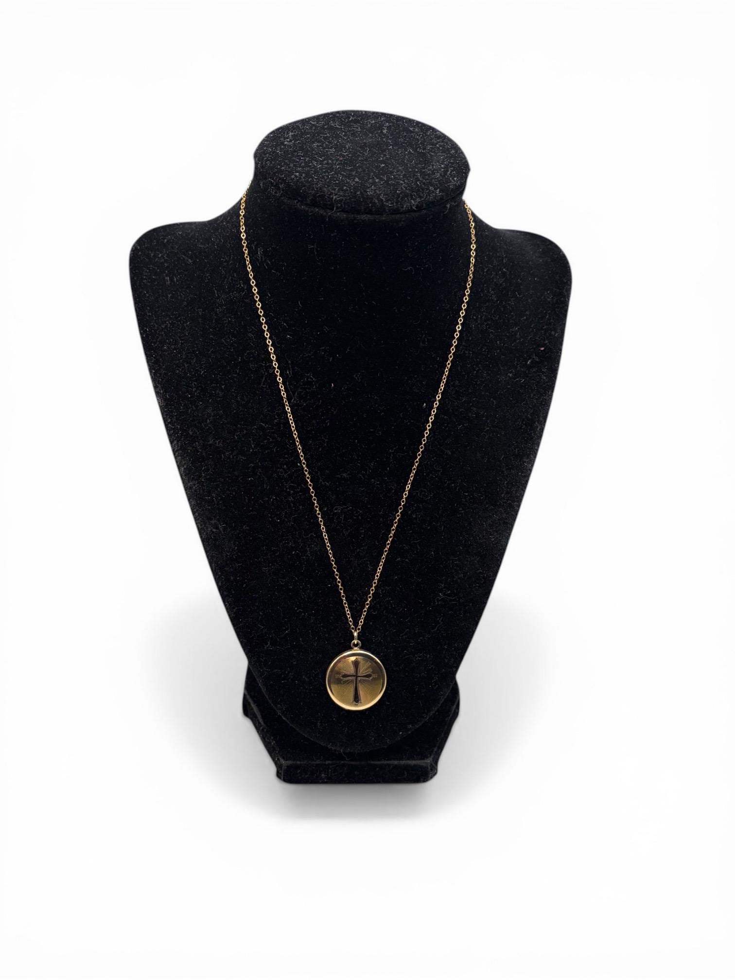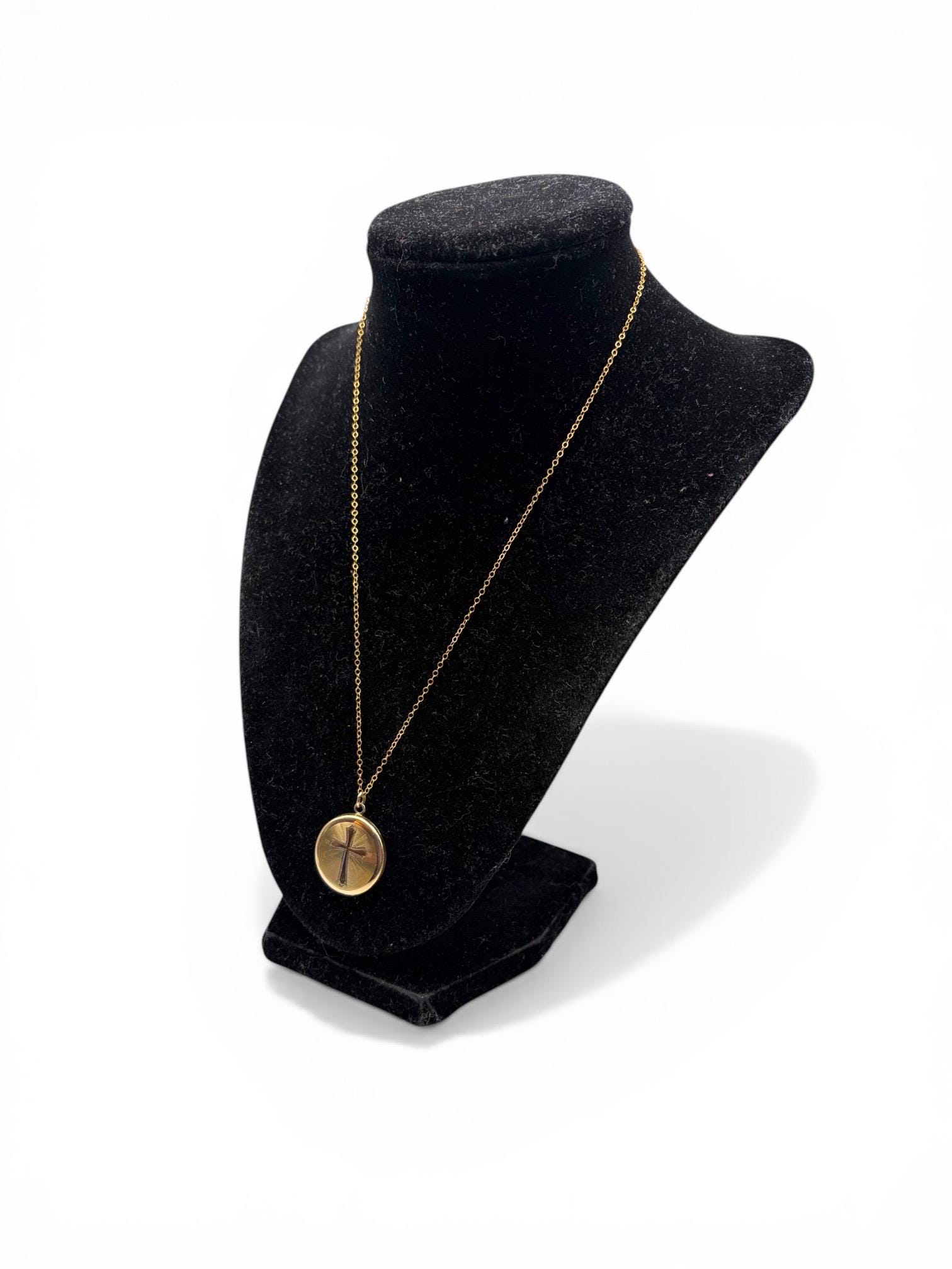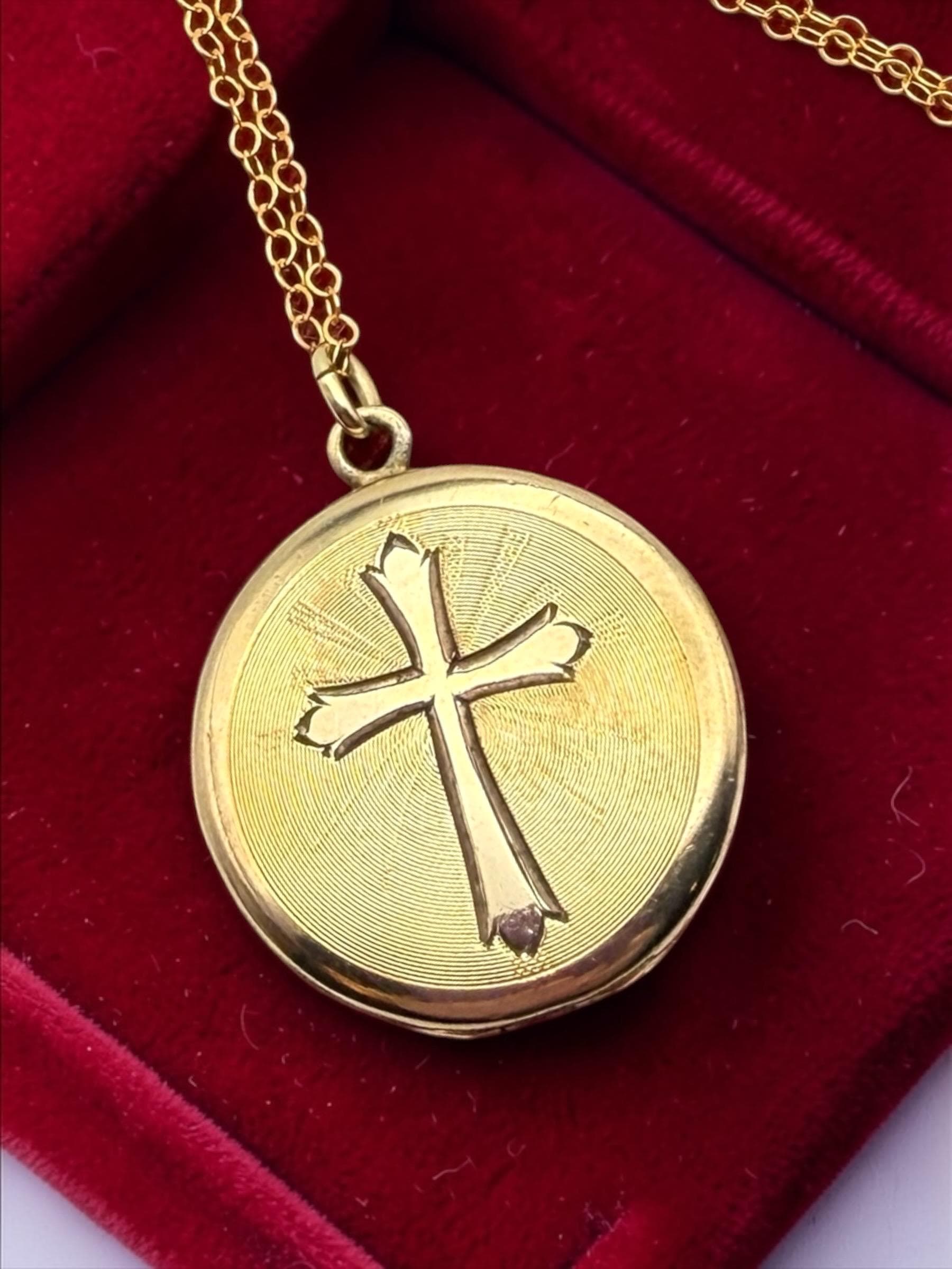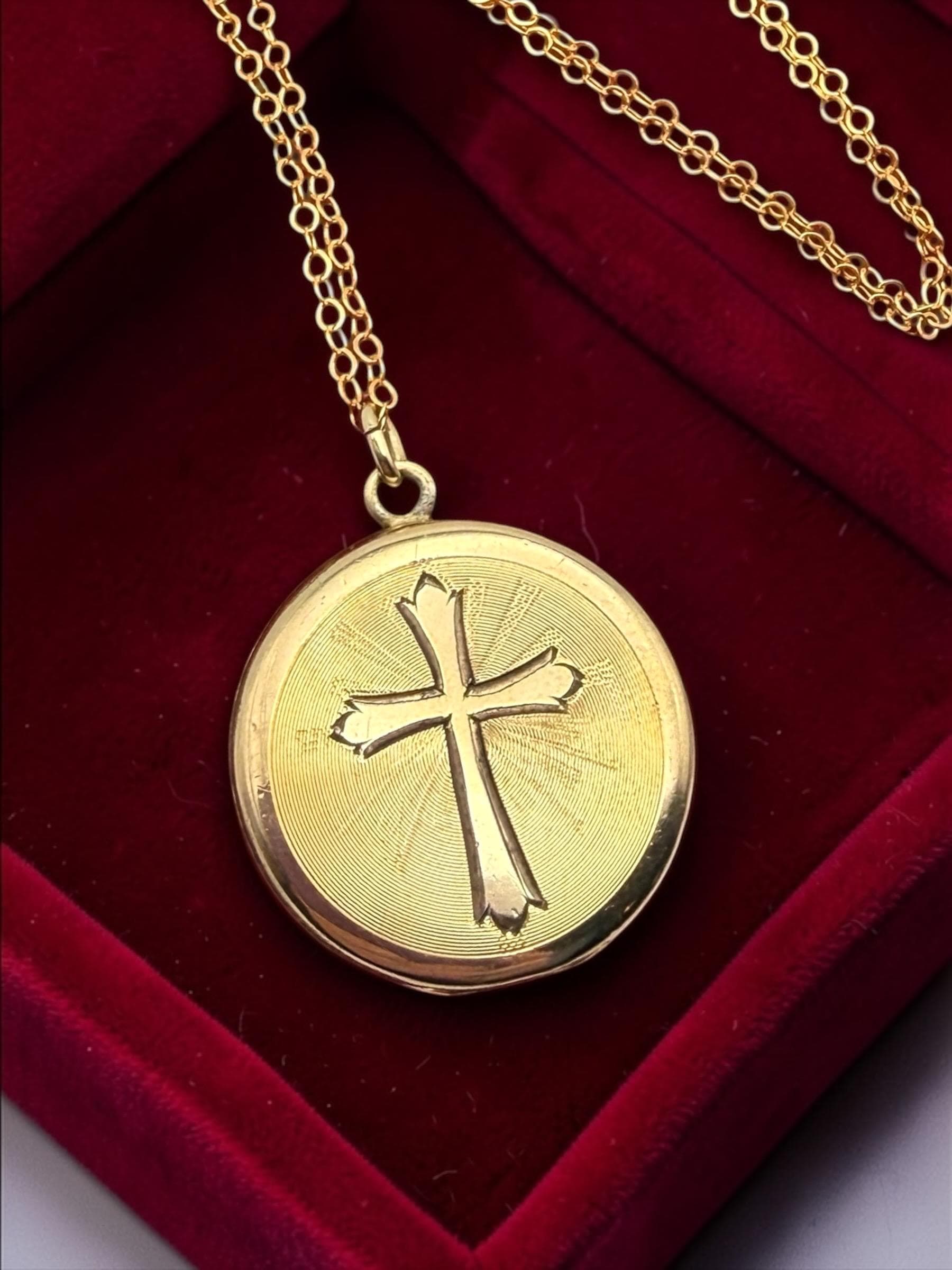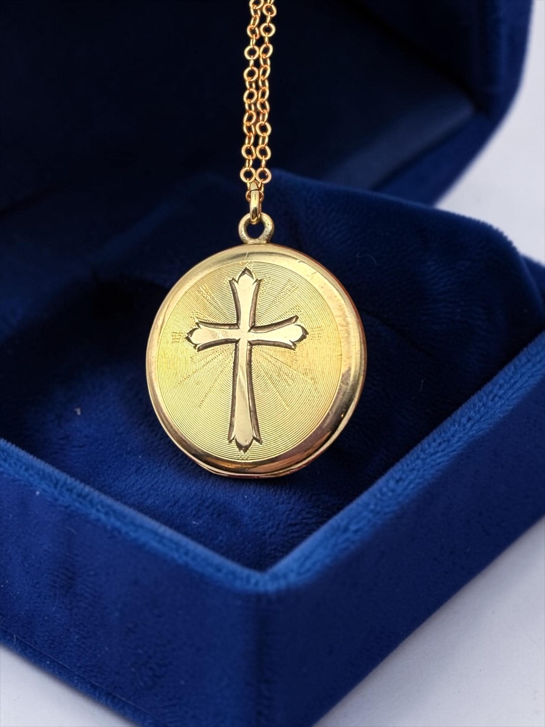 Shiny 12K gold filled vintage locket with etched cross on the front. The back is plain with no design. Beautiful piece of religions jewelry!