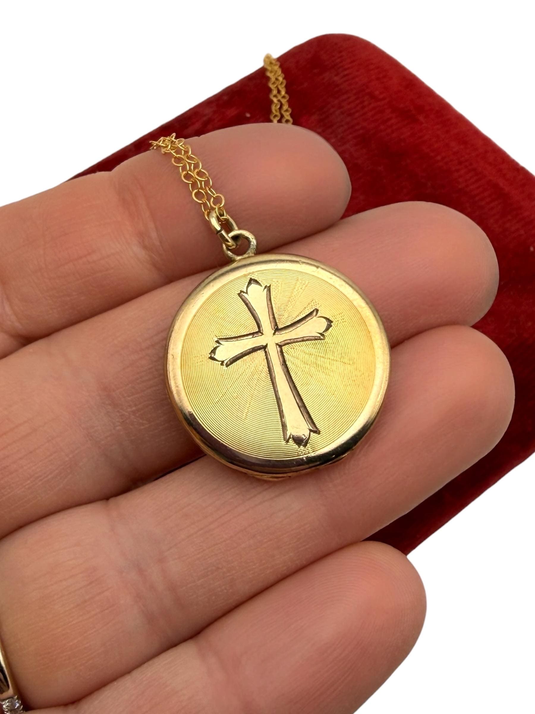 Vintage Gold Cross Locket - Etched Round 12K Gold Filled Photo Pendant by Theda, on 14K GF Chain