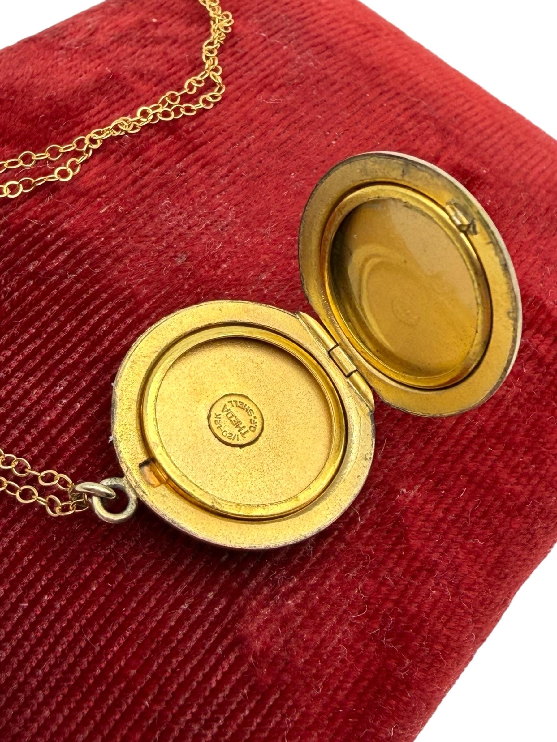 The inside of the locket has room for two round photos. Both of the original frames remain, one plastic cover is intact.