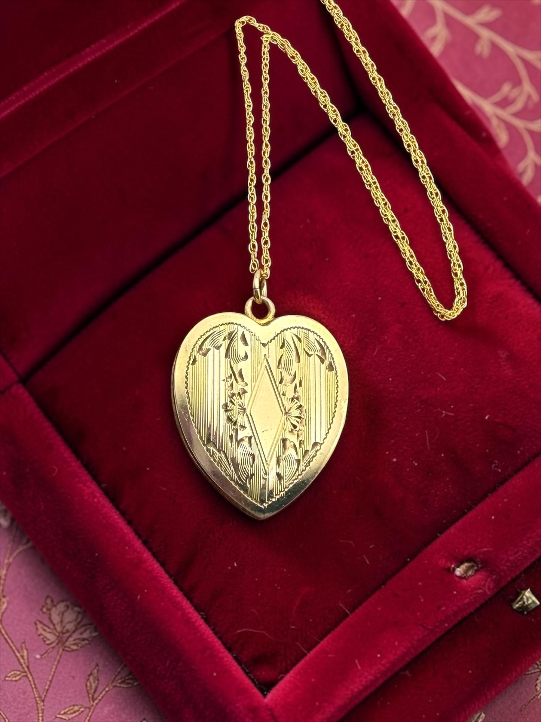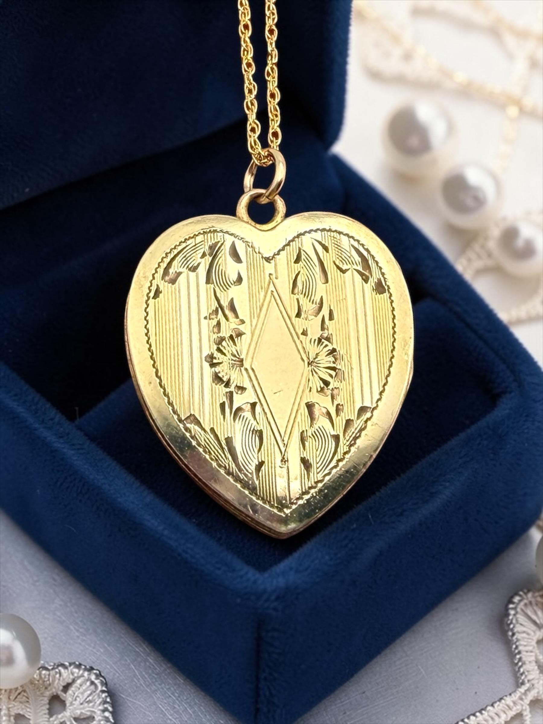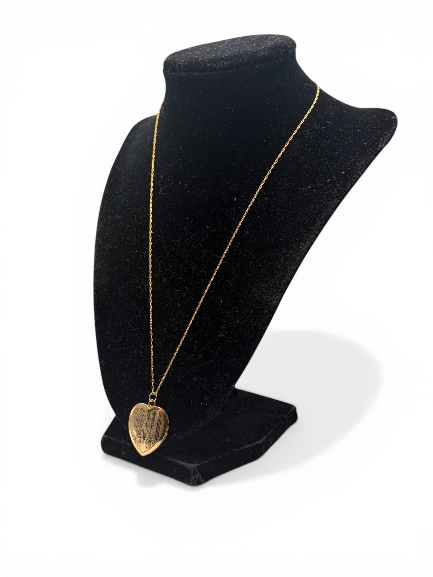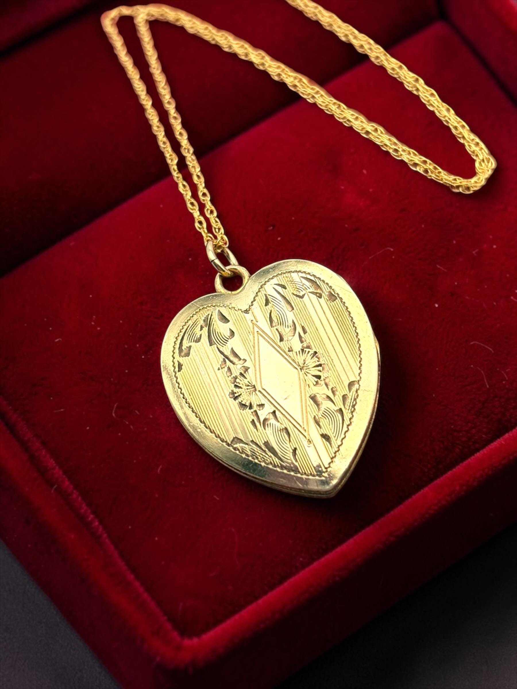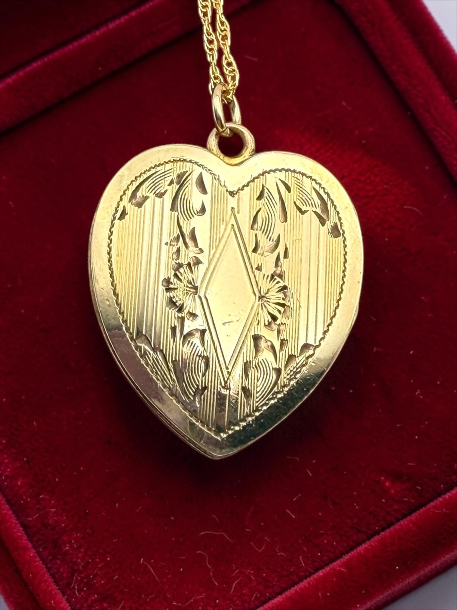 Lovely vintage gold filled locket circa 1940s. This heart locket has a pinstripe, geometric and floral pattern on the front The back of the locket is plain with no design. The inside is empty, one side has a frame remaining.