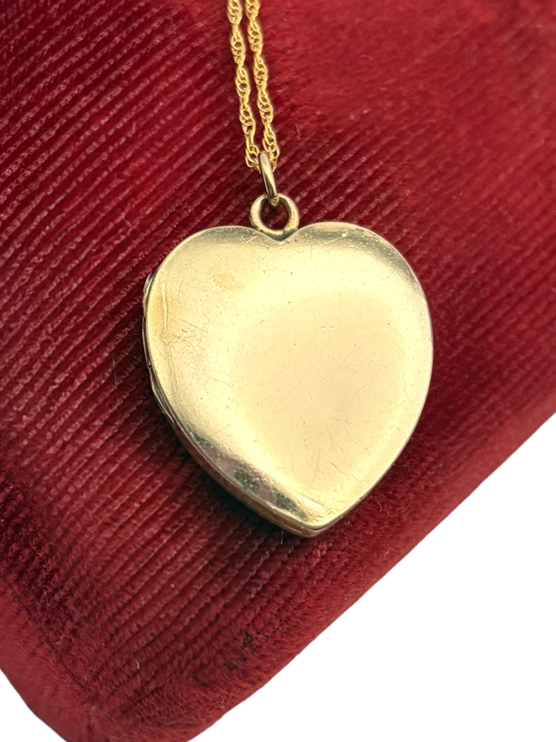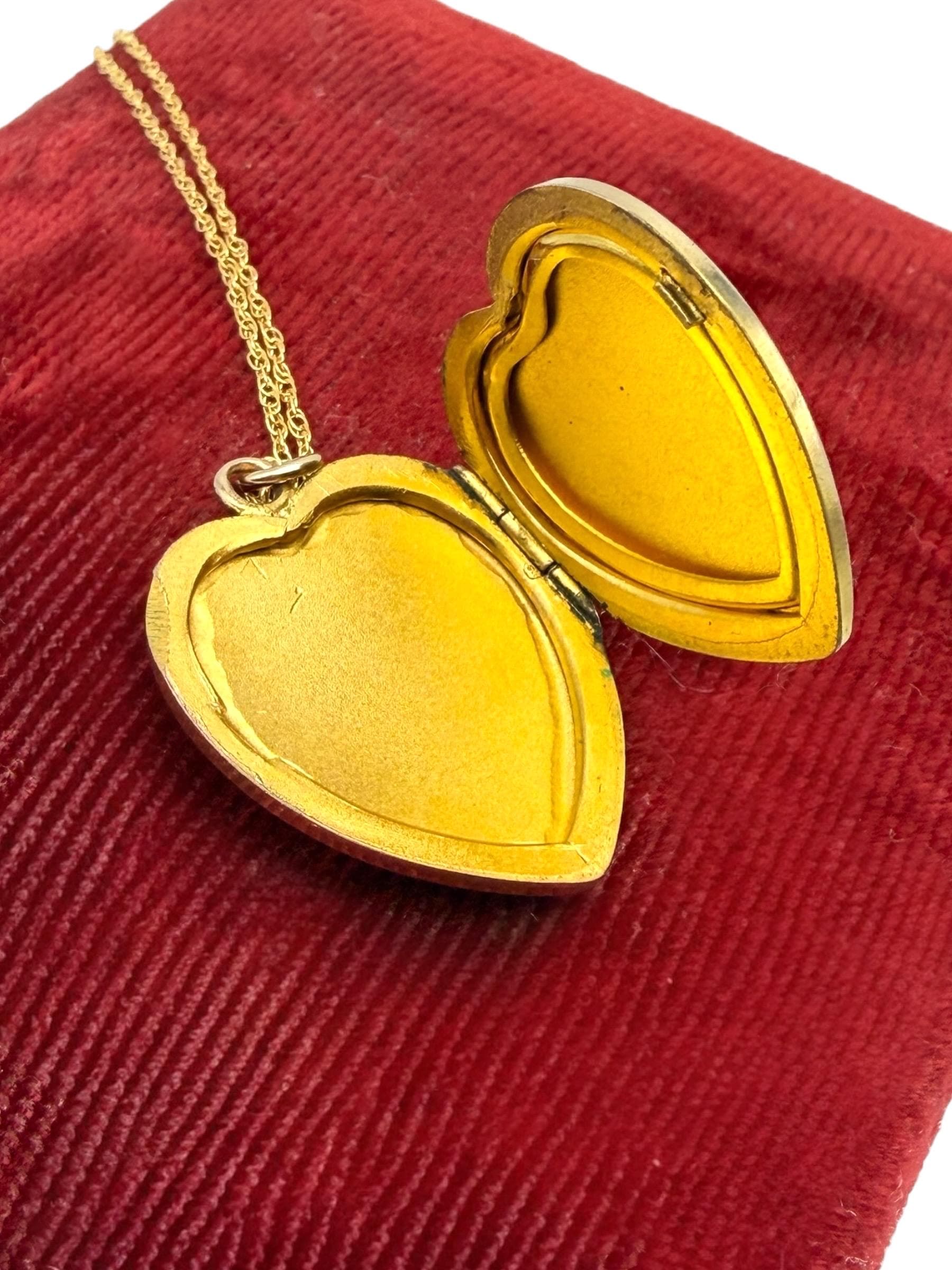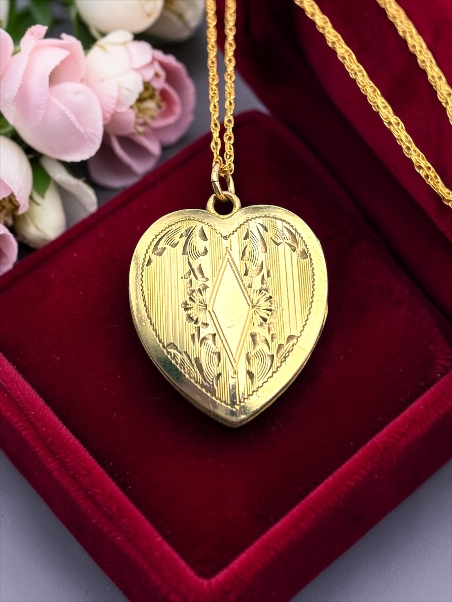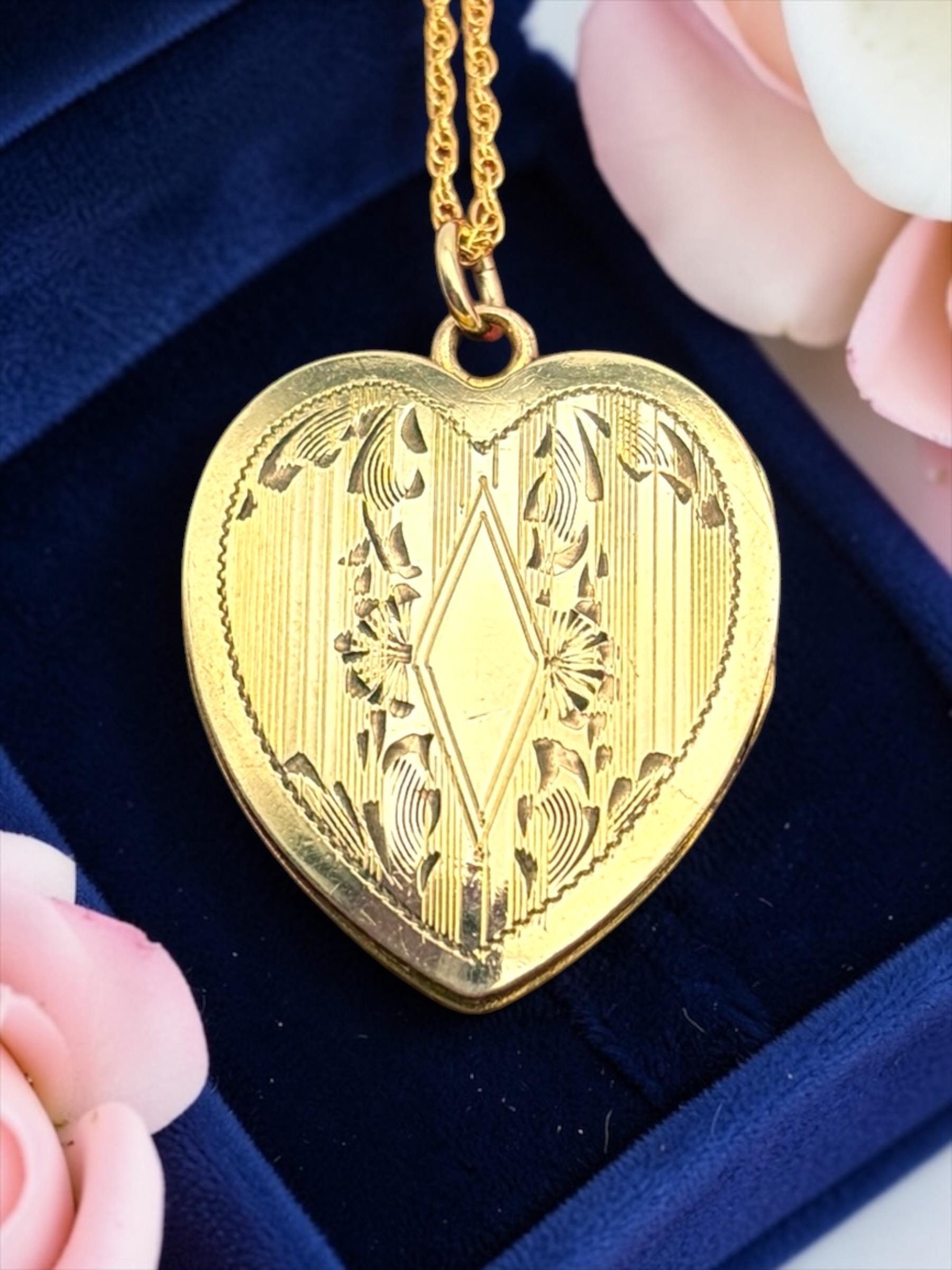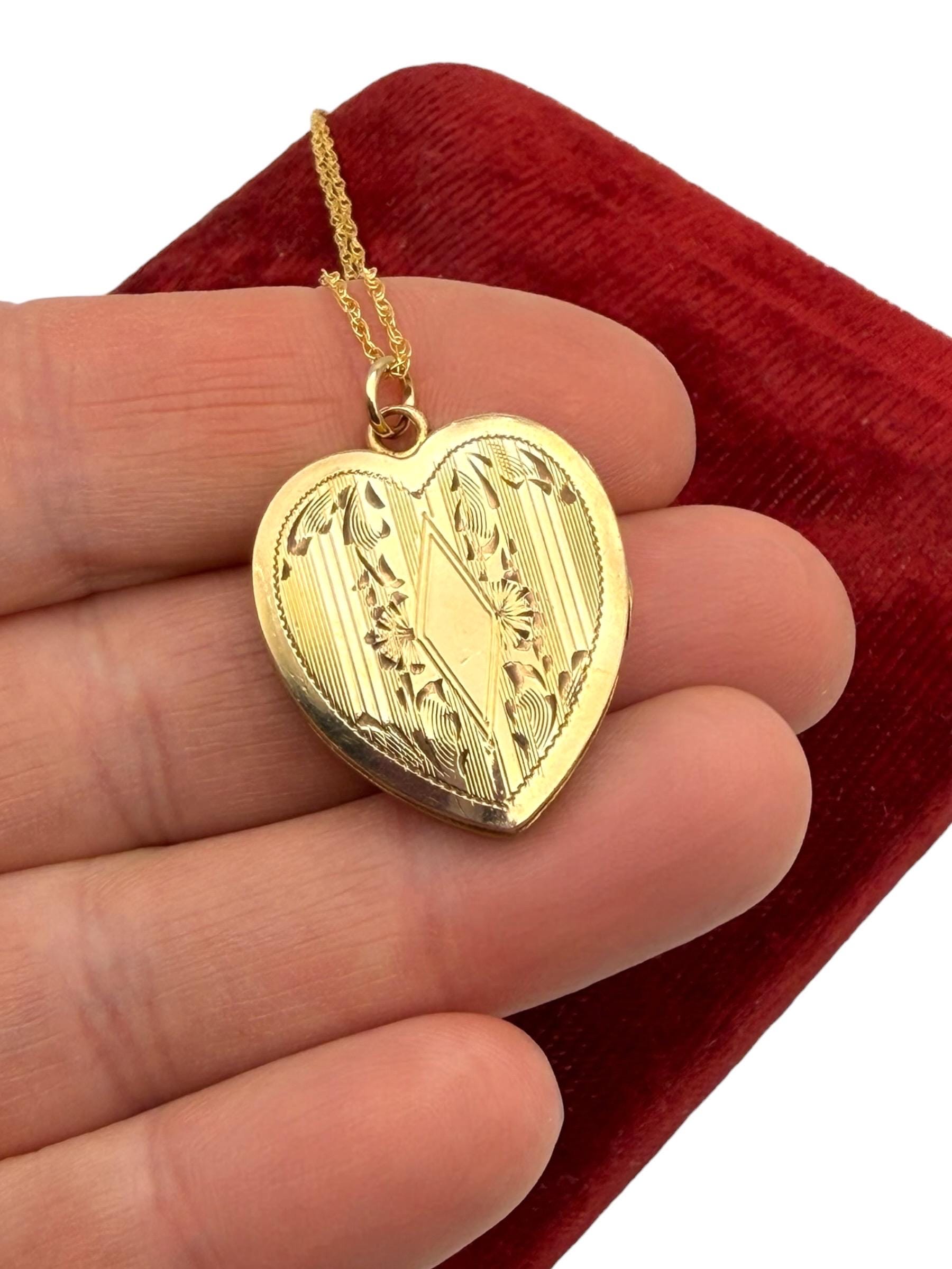 Lovely vintage gold filled locket circa 1940s. This heart locket has a pinstripe, geometric and floral pattern on the front The back of the locket is plain with no design. The inside is empty, one side has a frame remaining.