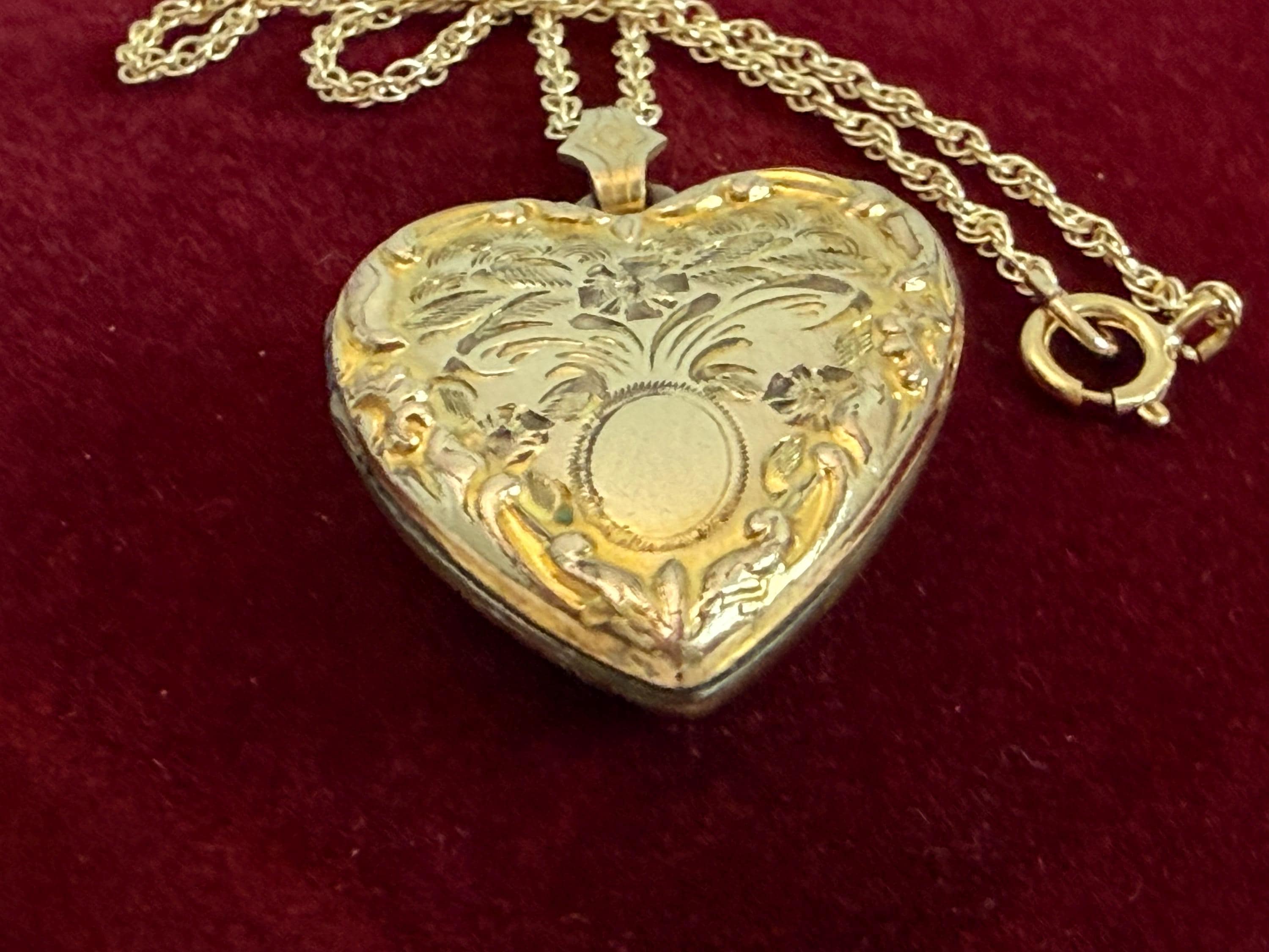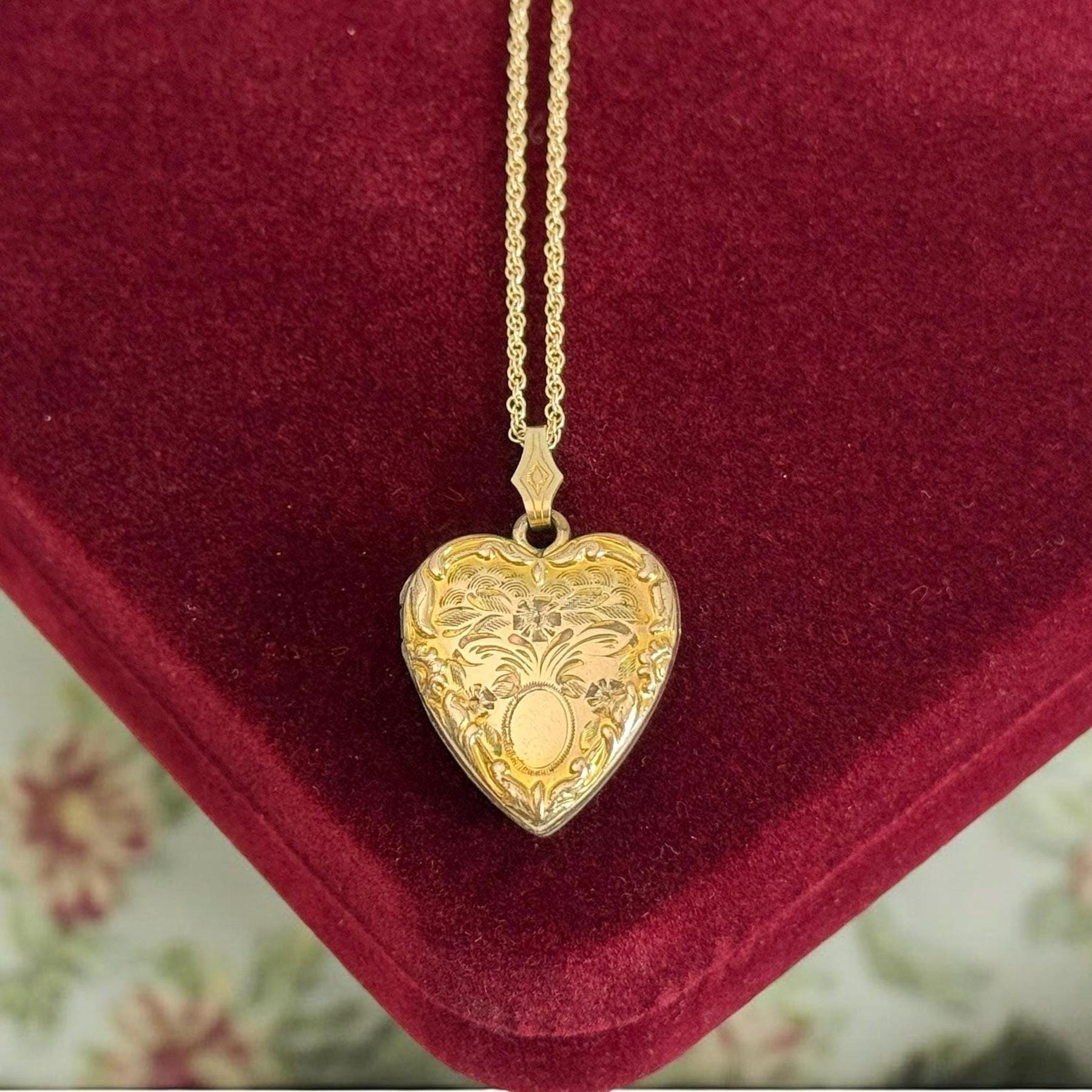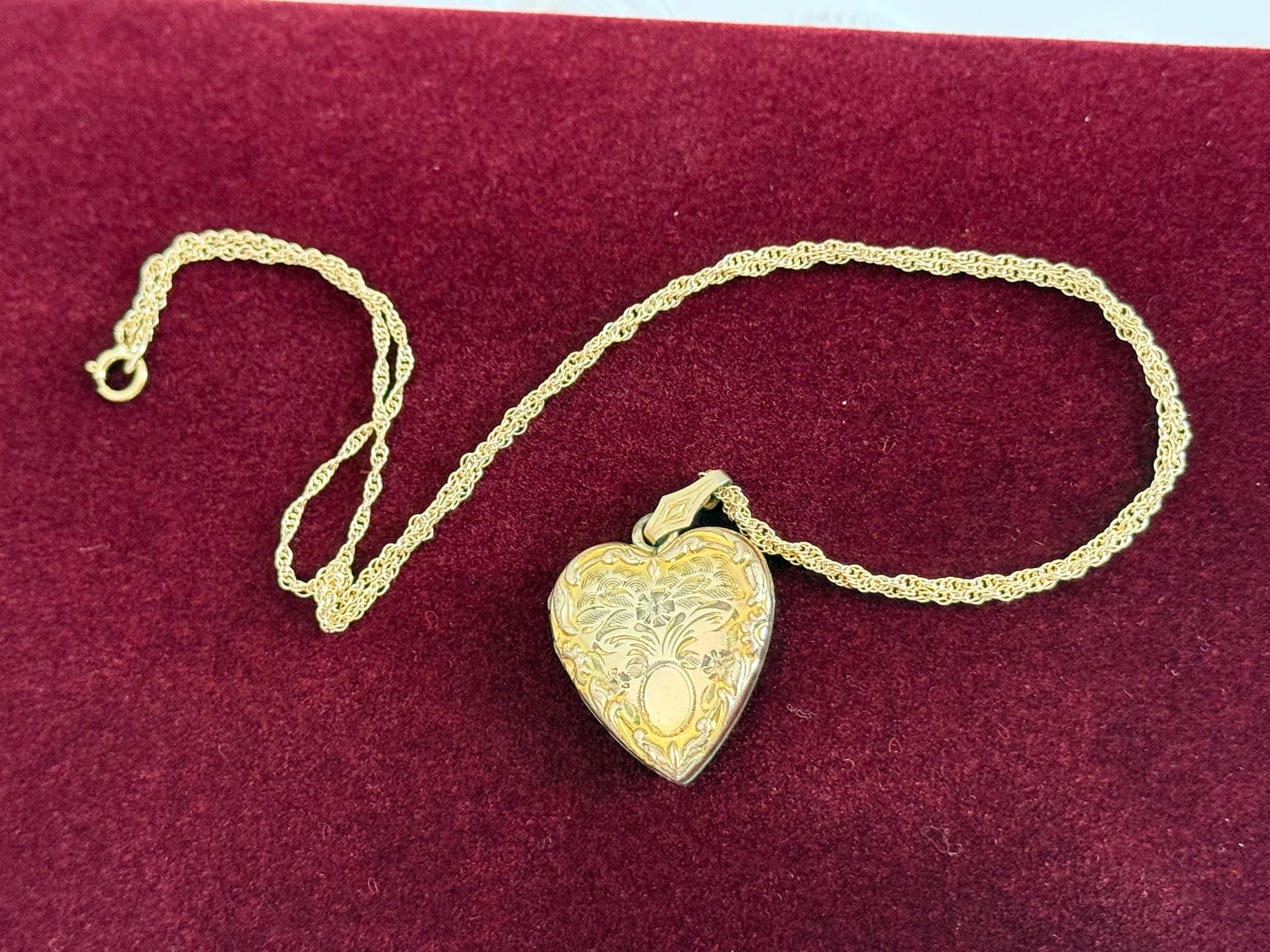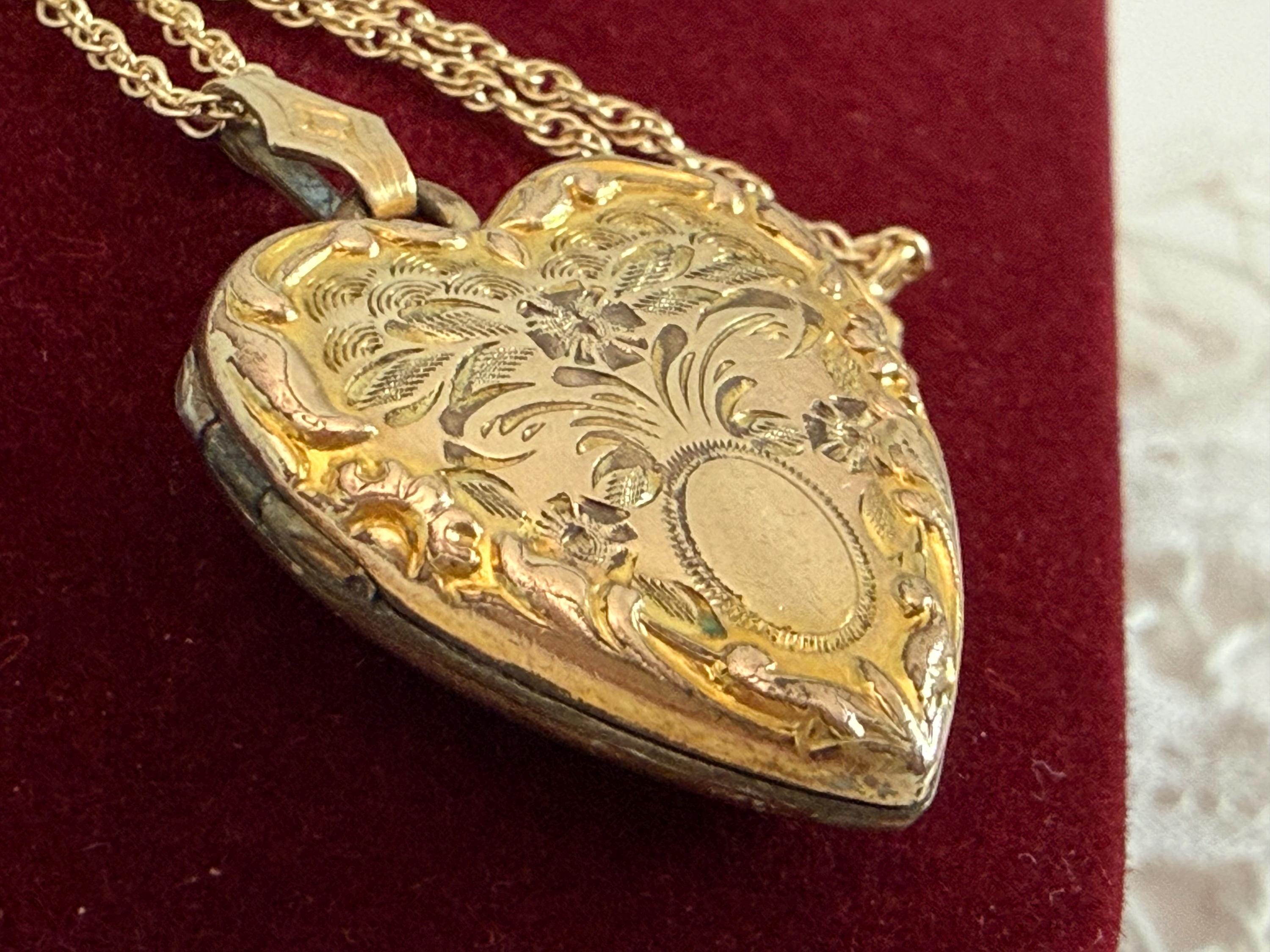 Vintage classic 10K yellow gold filled heart locket on a 14K gold filled chain. The locket features an etched flower design with an oval cartouche on the front with raised edges and a decorative fanned bale. The back of the locket is plain with no design. The locket closes securely with a snap.