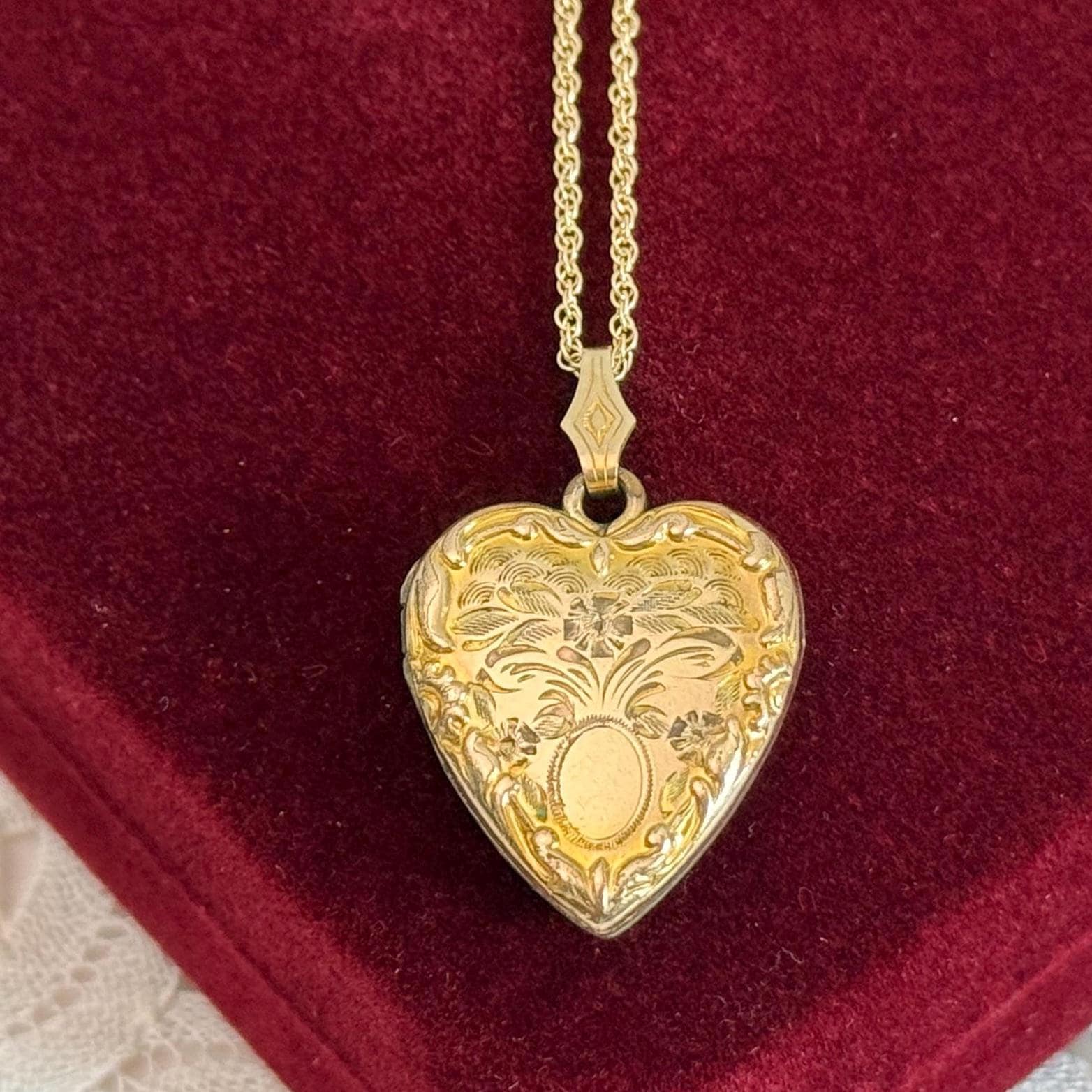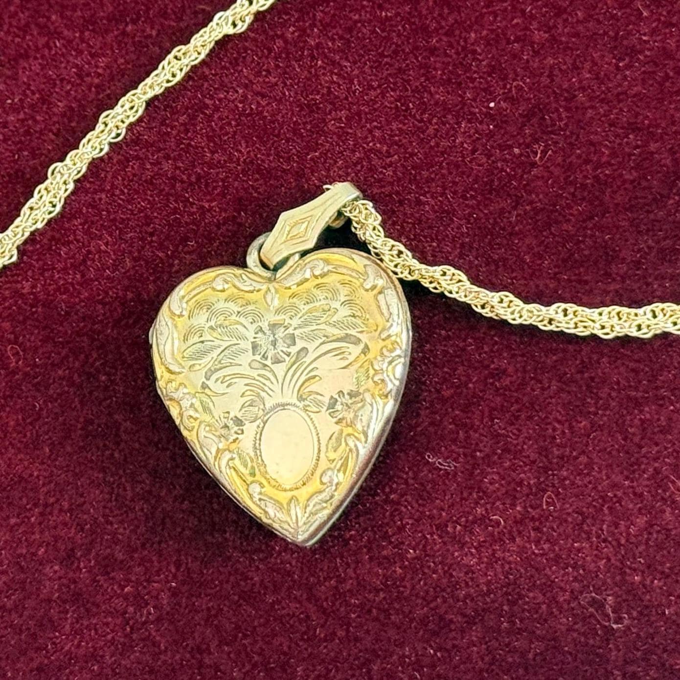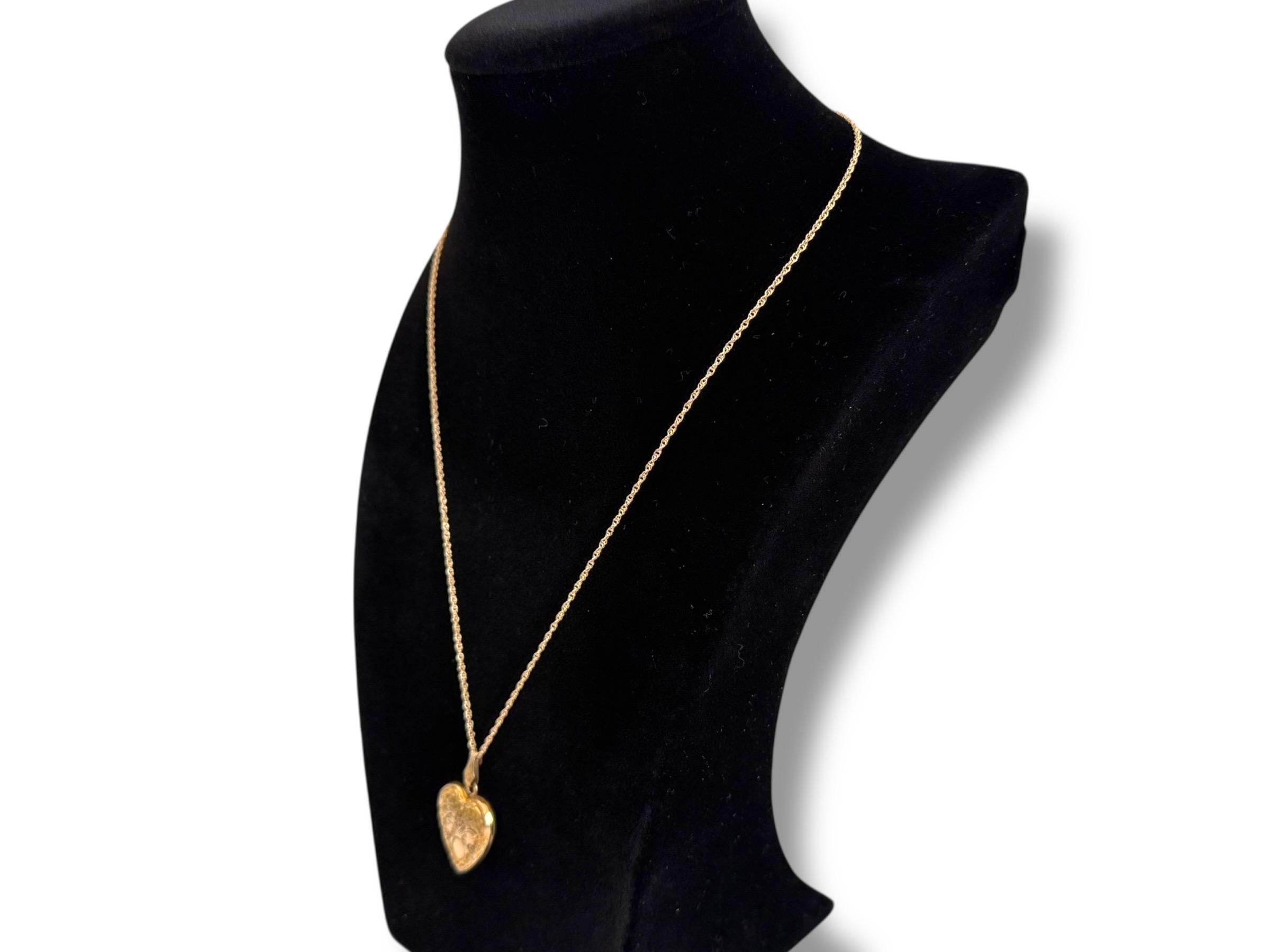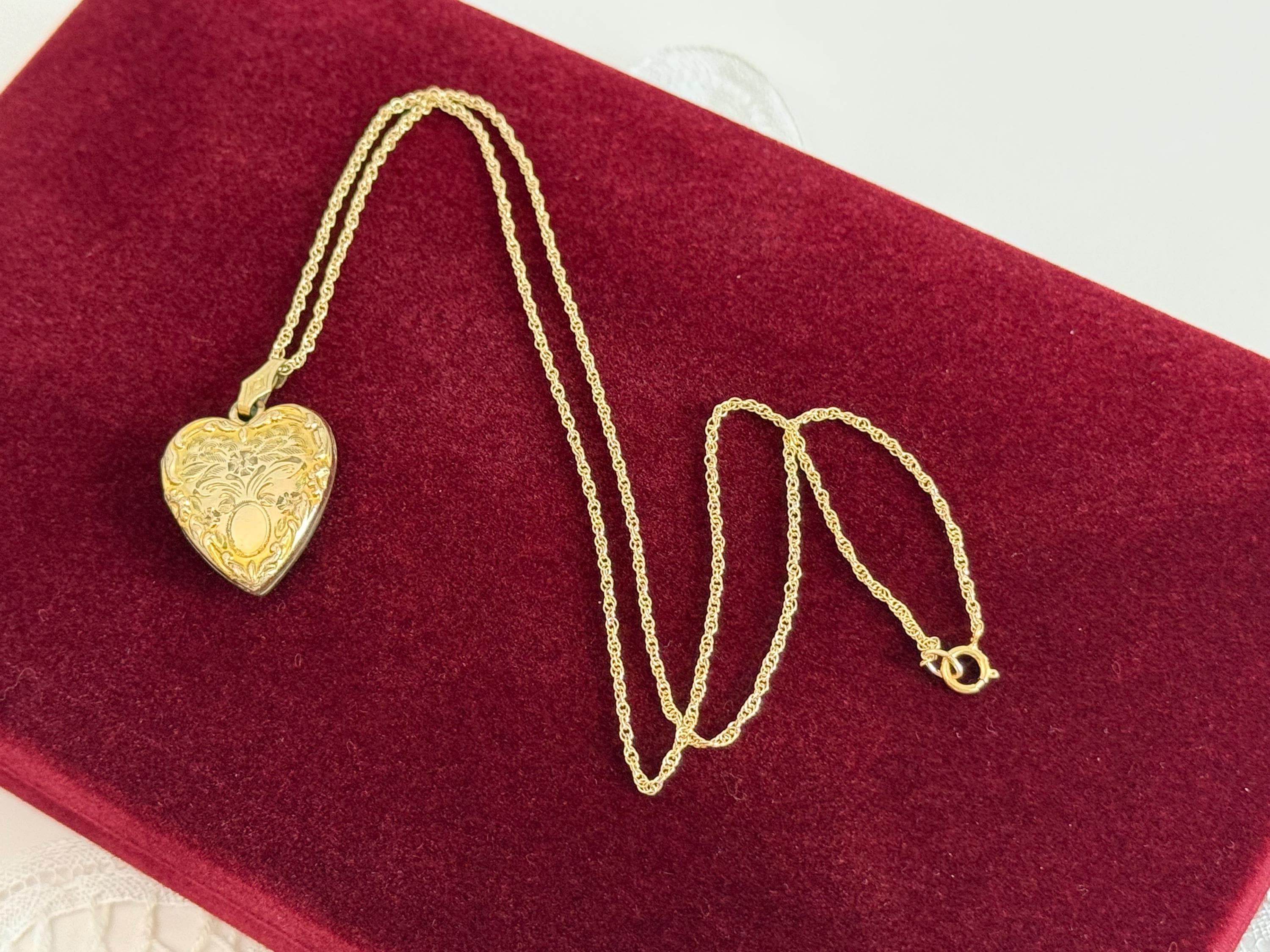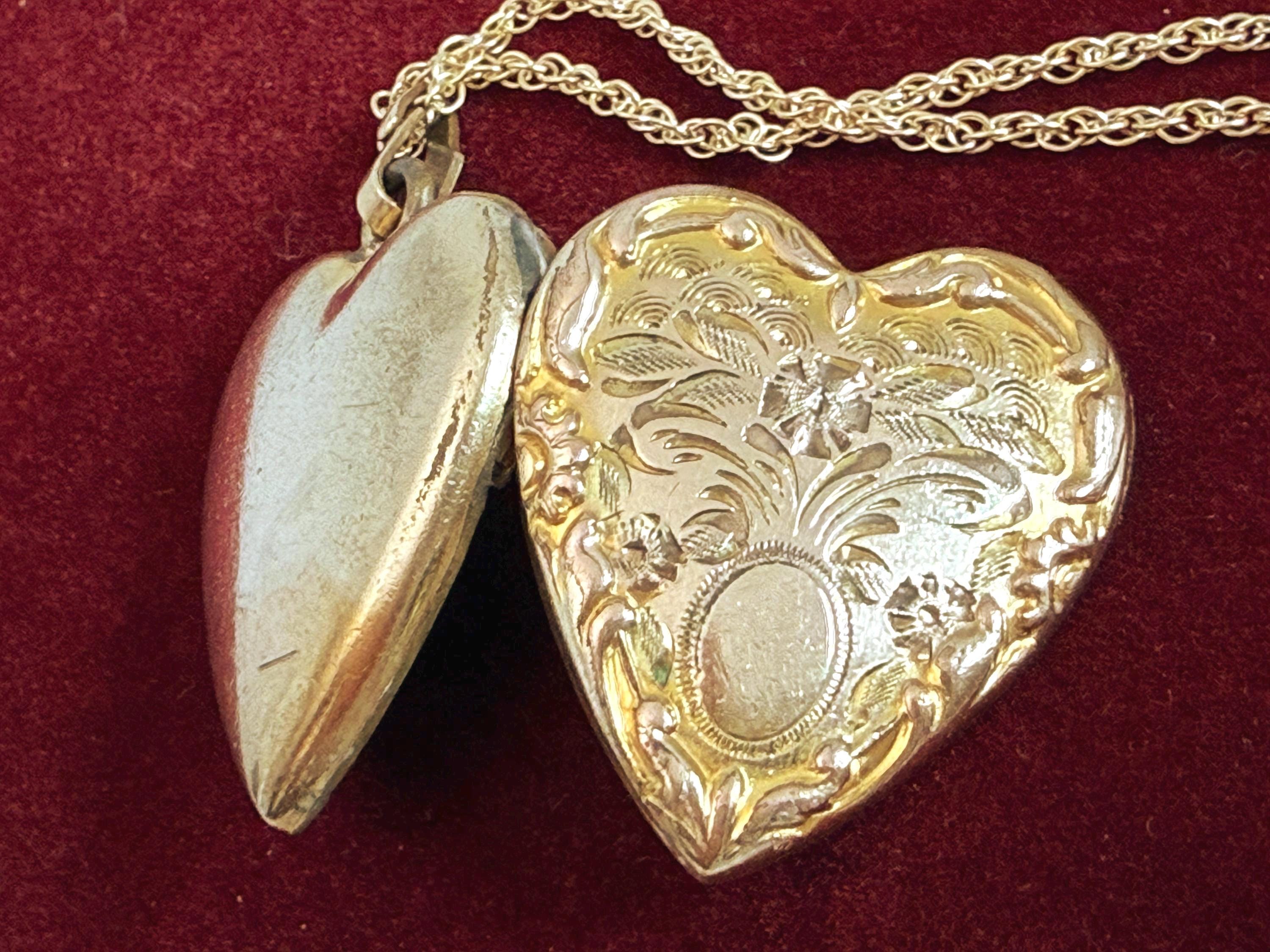 Vintage classic 10K yellow gold filled heart locket on a 14K gold filled chain. The locket features an etched flower design with an oval cartouche on the front with raised edges and a decorative fanned bale. The back of the locket is plain with no design. The locket closes securely with a snap.