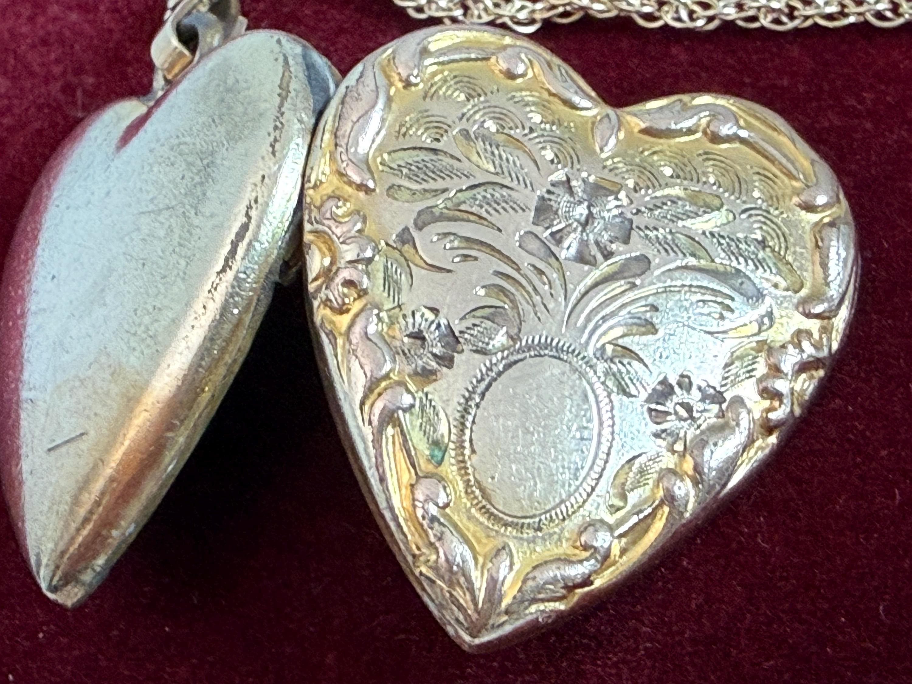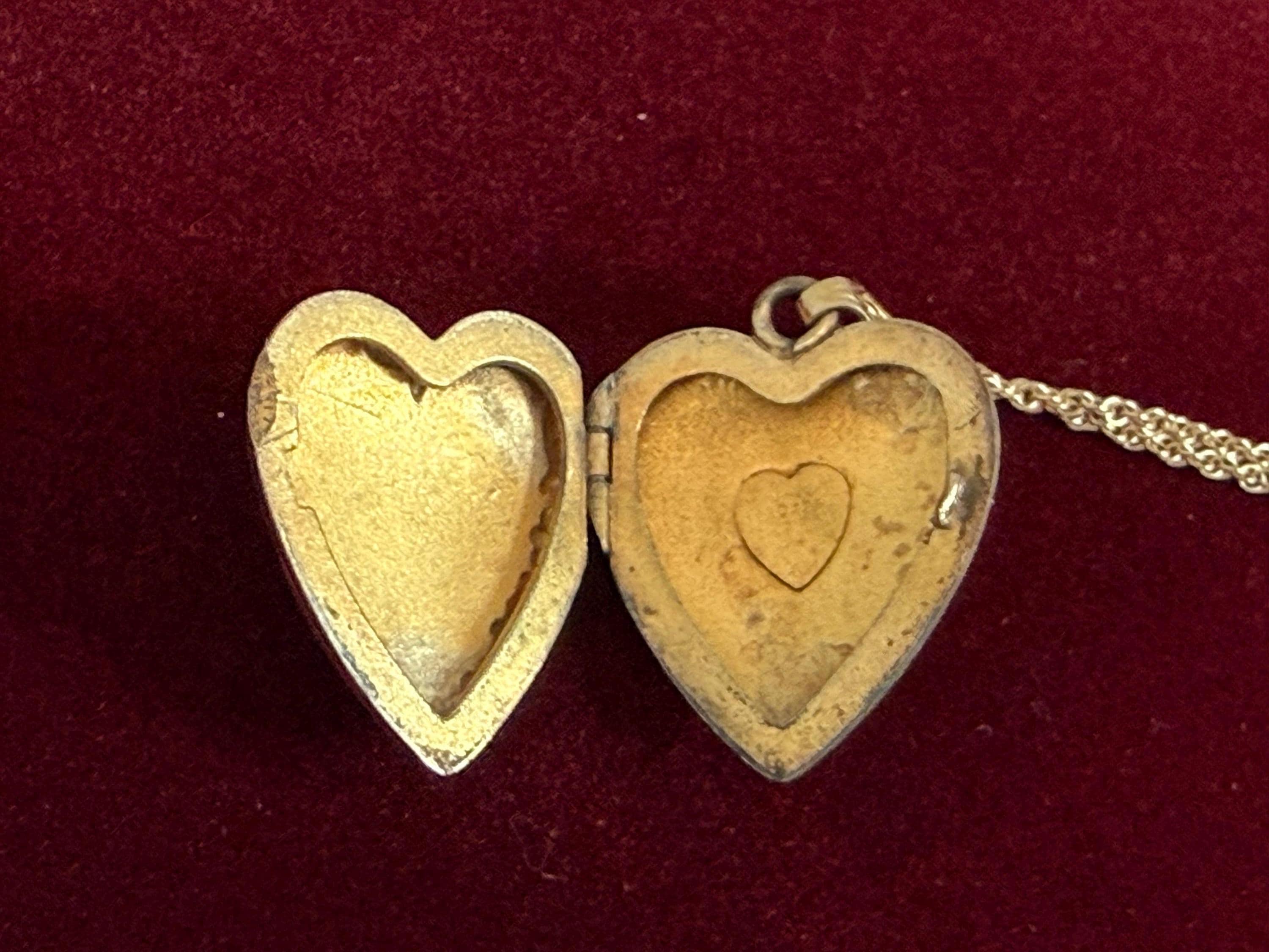 The interior of the locket holds 2 photos and the wells are in a heart shape. They are currently empty.