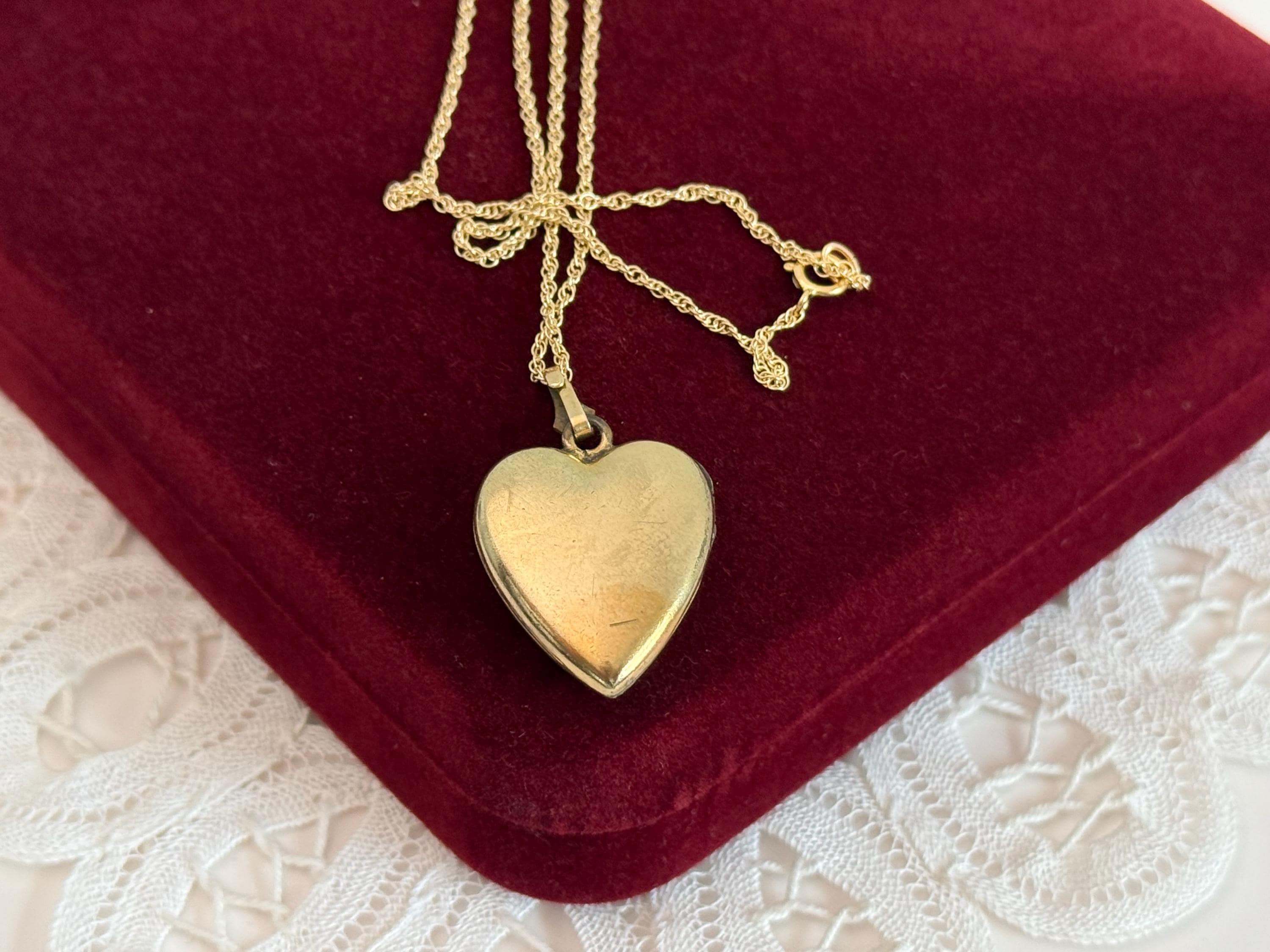 The vintage locket hangs from a fanned bale on a new 14K yellow gold rope chain that is 18" long. The locket can be purchased with or without the chain.