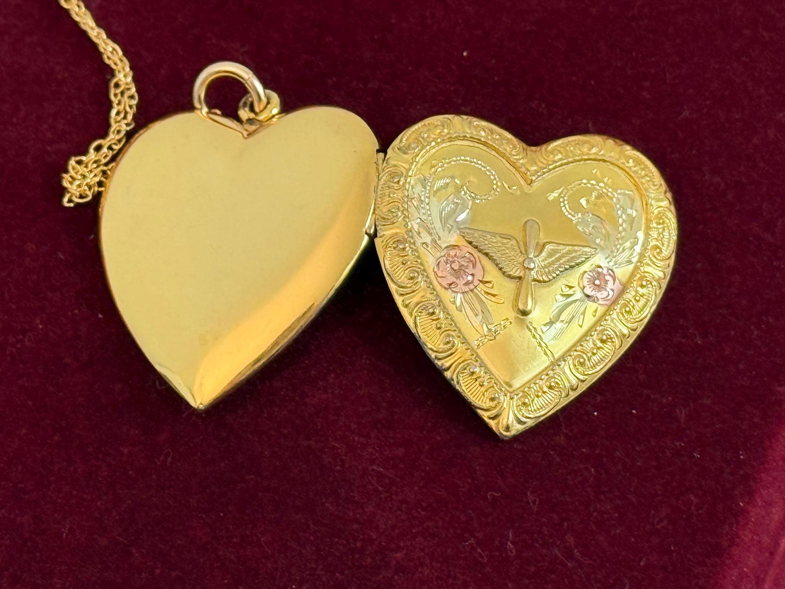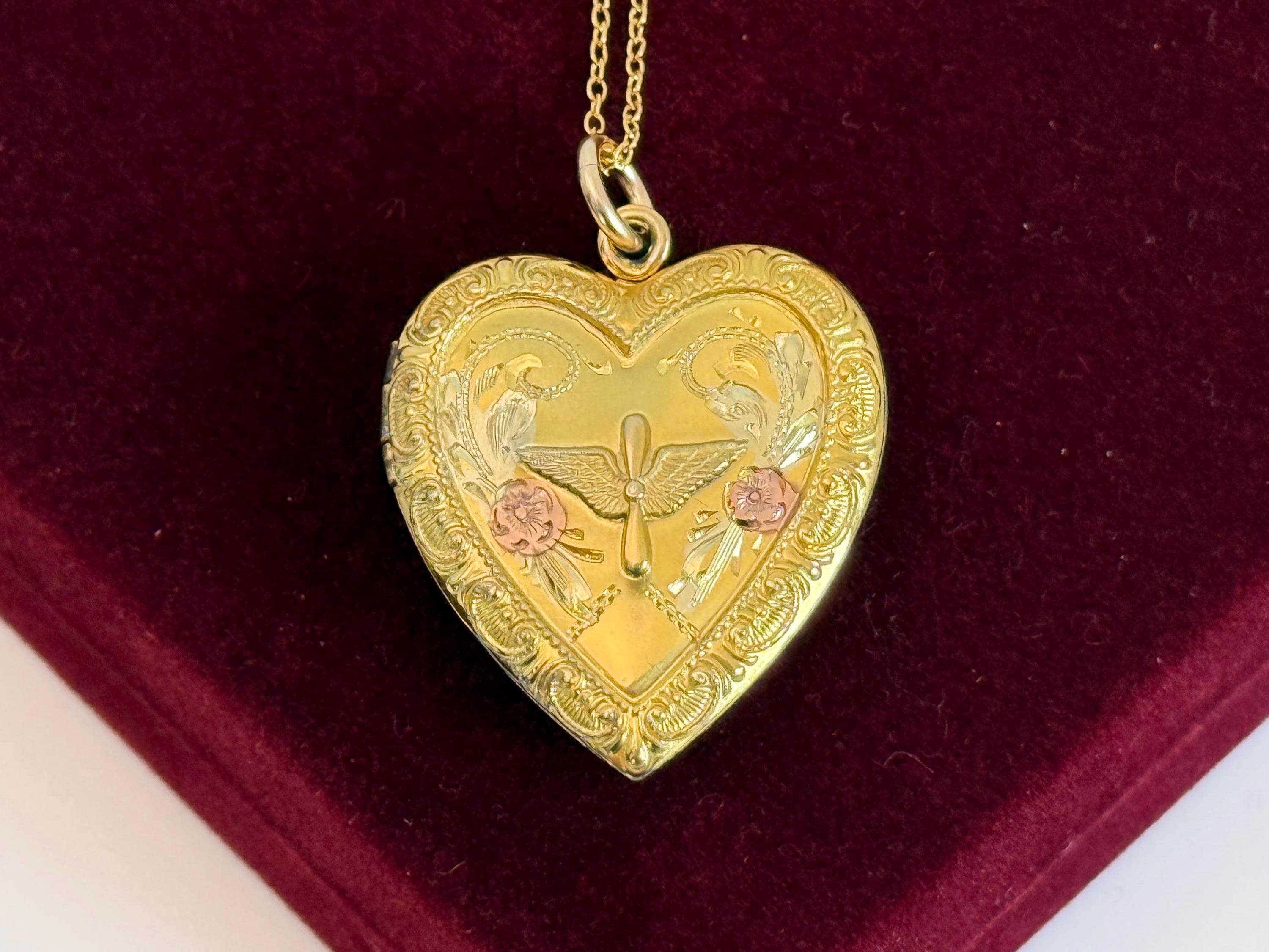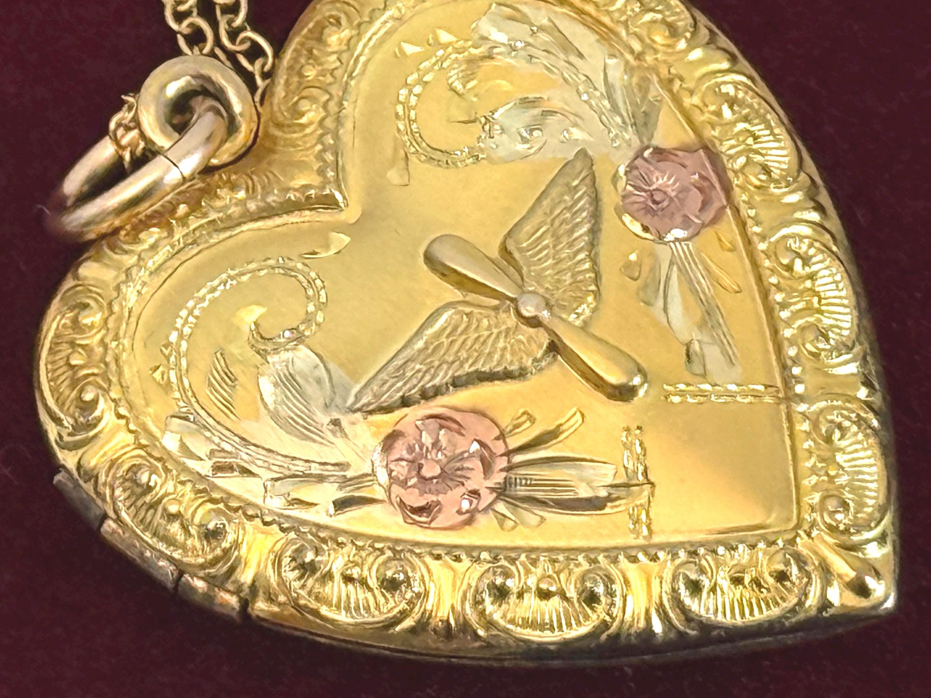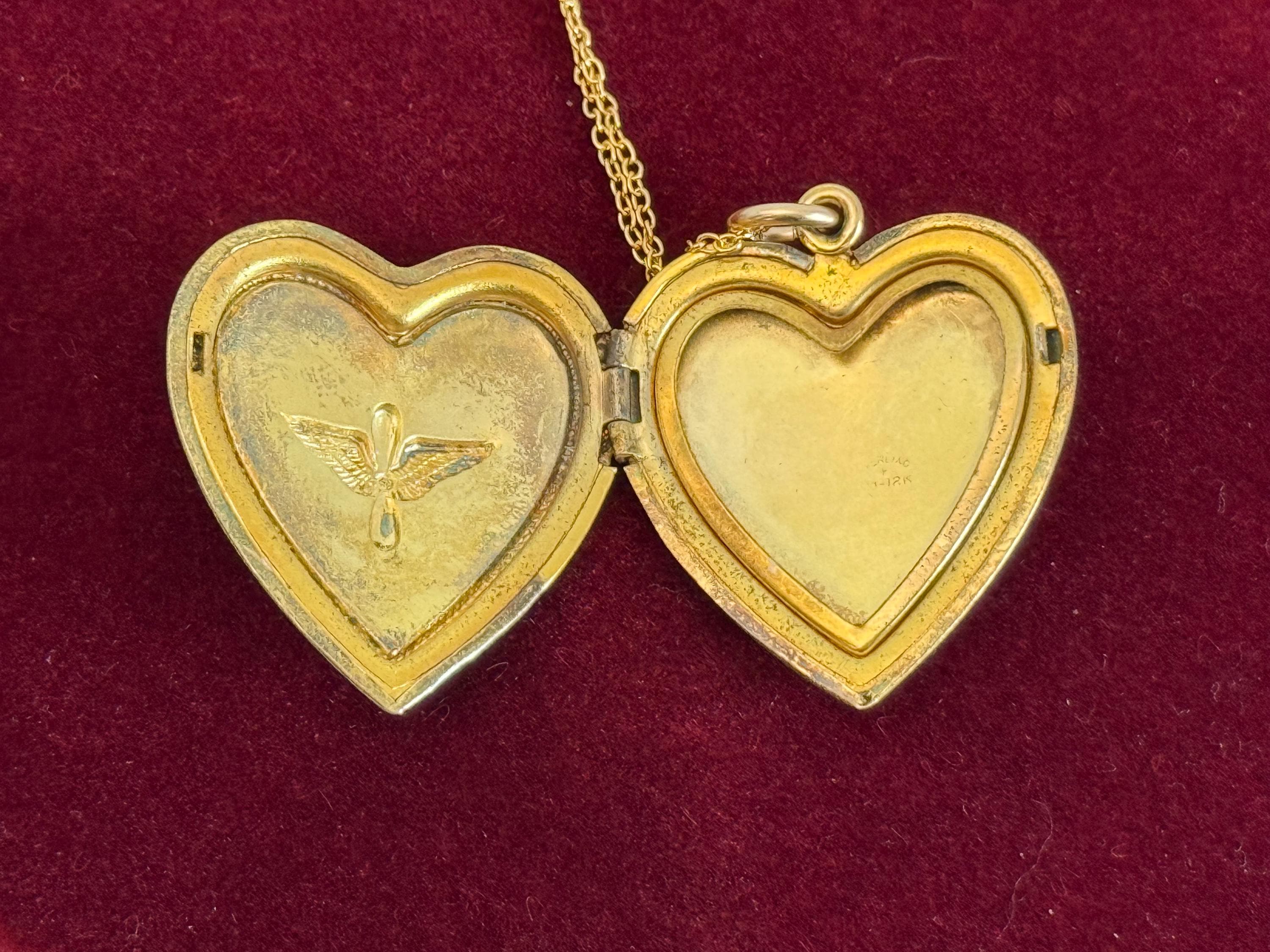 Vintage 12K Gold Filled Sterling Locket Necklace, US Army Air Corp Heart, 1940s Repousse