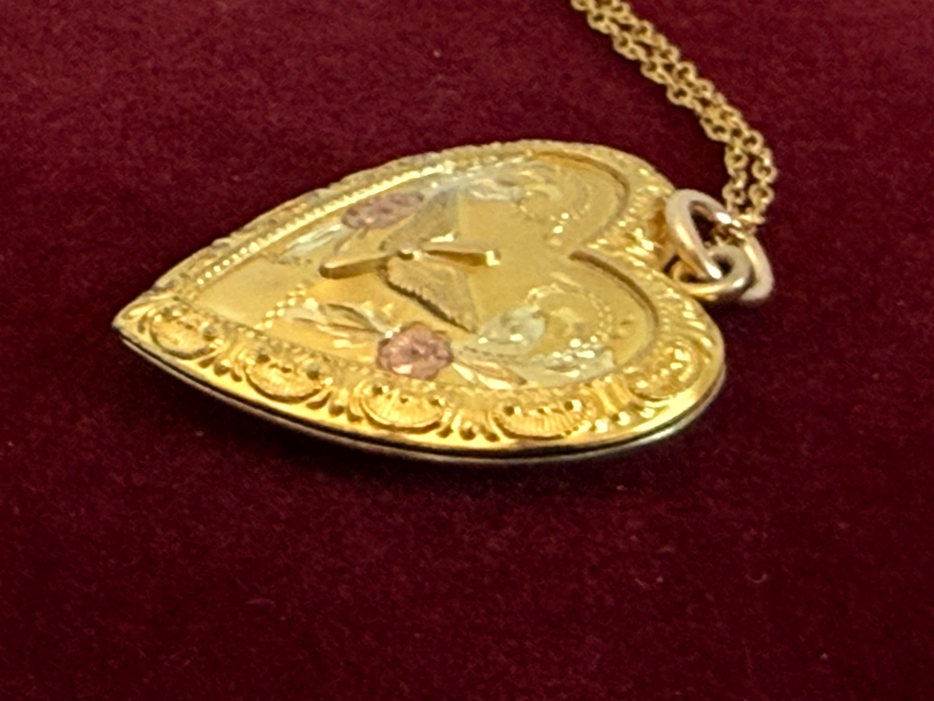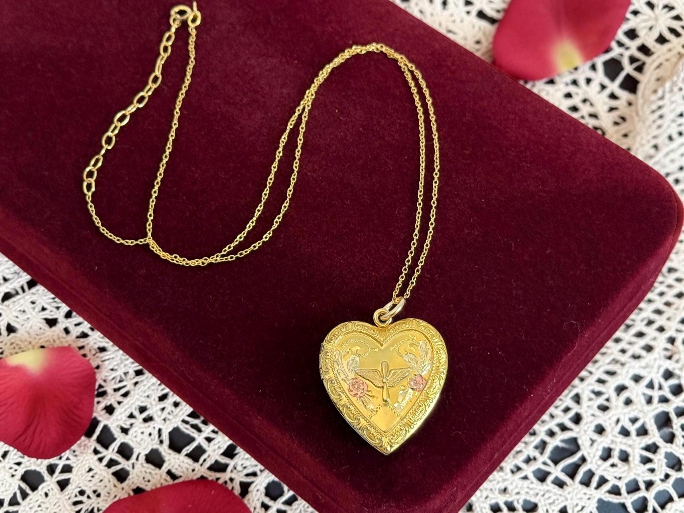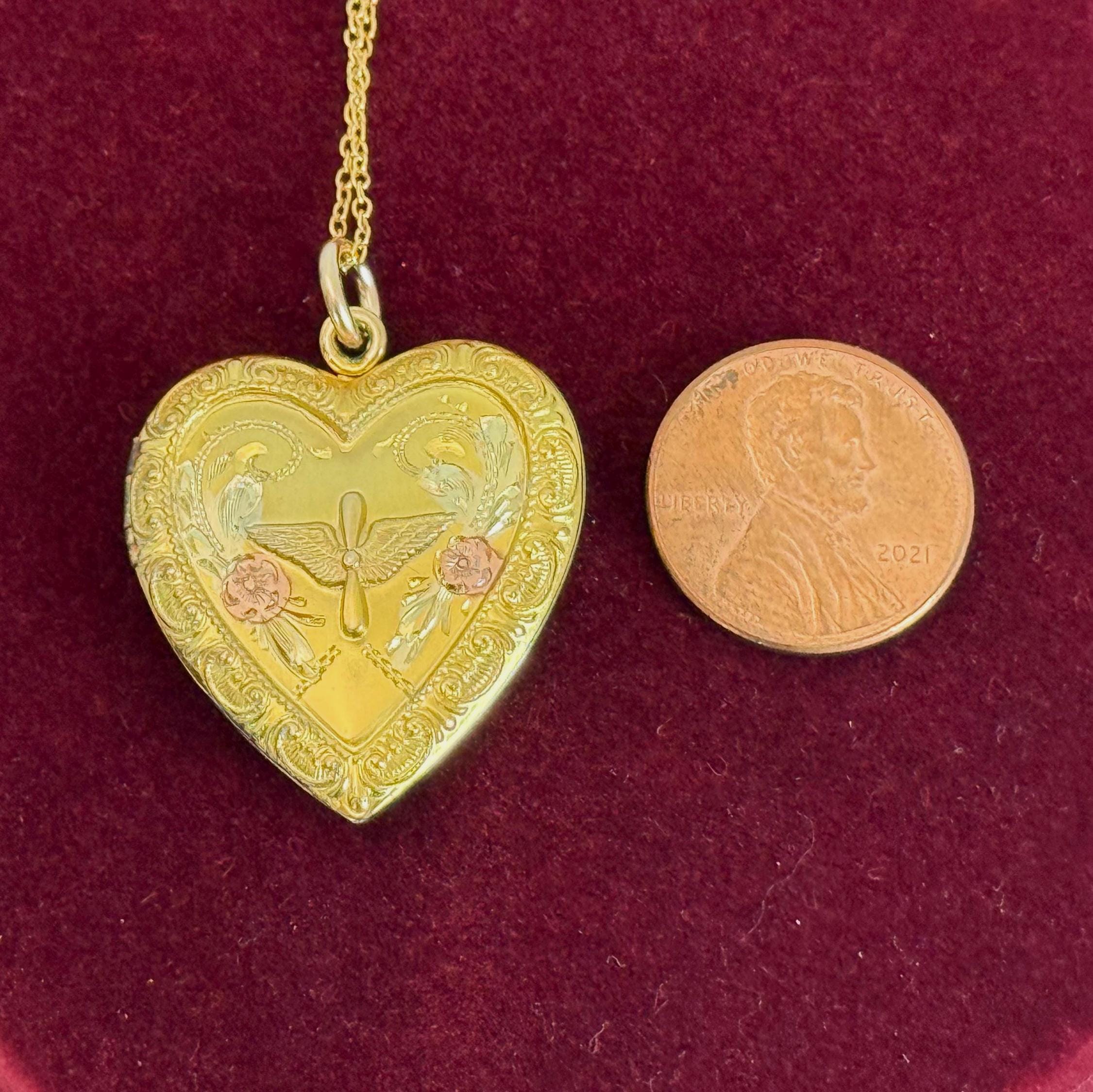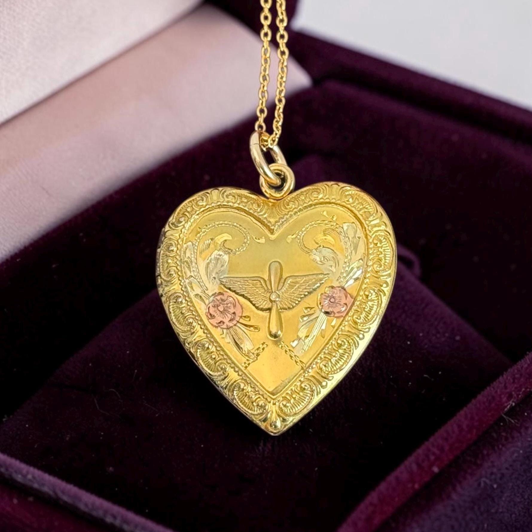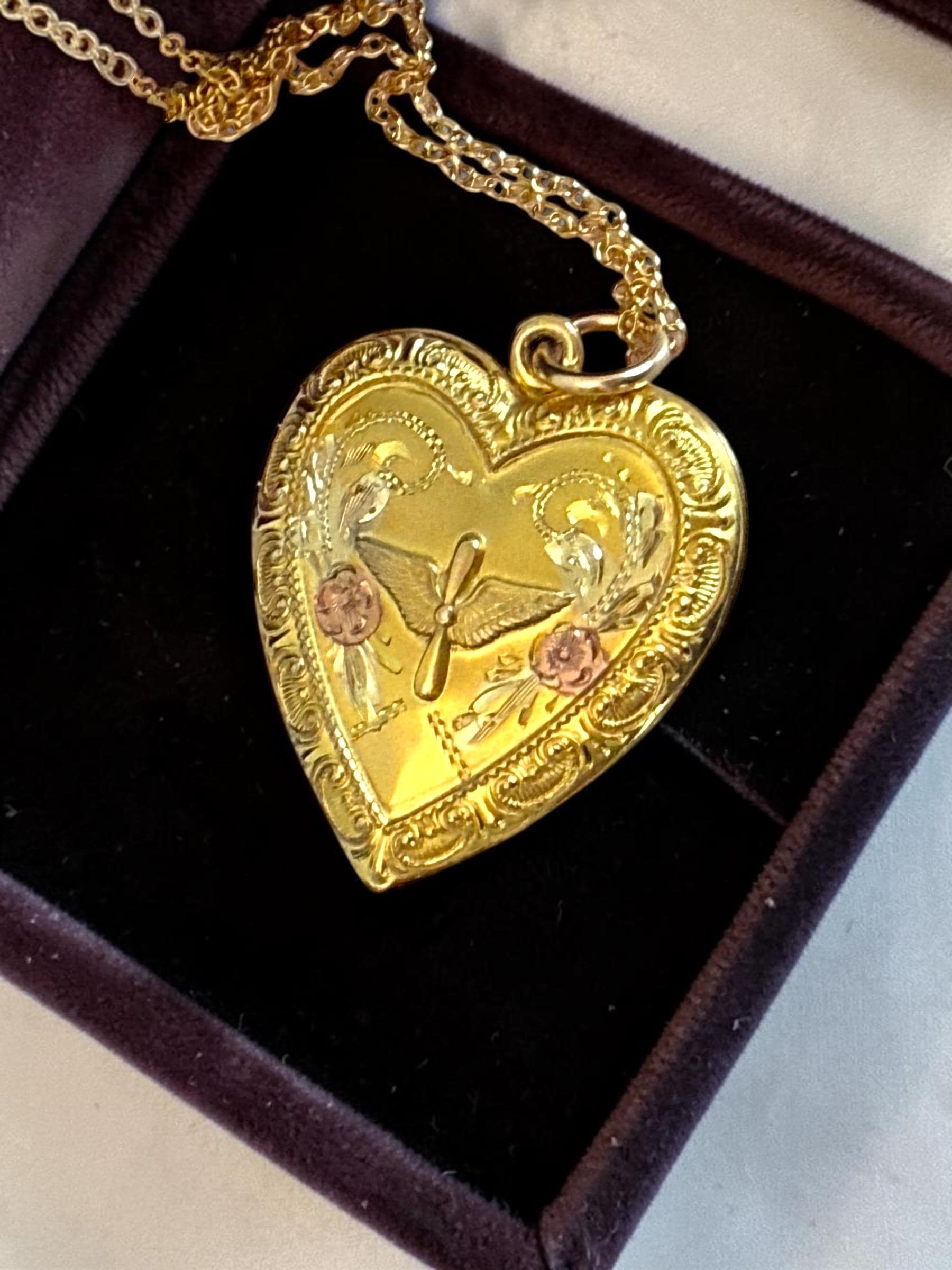 Vintage 12K Gold Filled Sterling Locket Necklace, US Army Air Corp Heart, 1940s Repousse