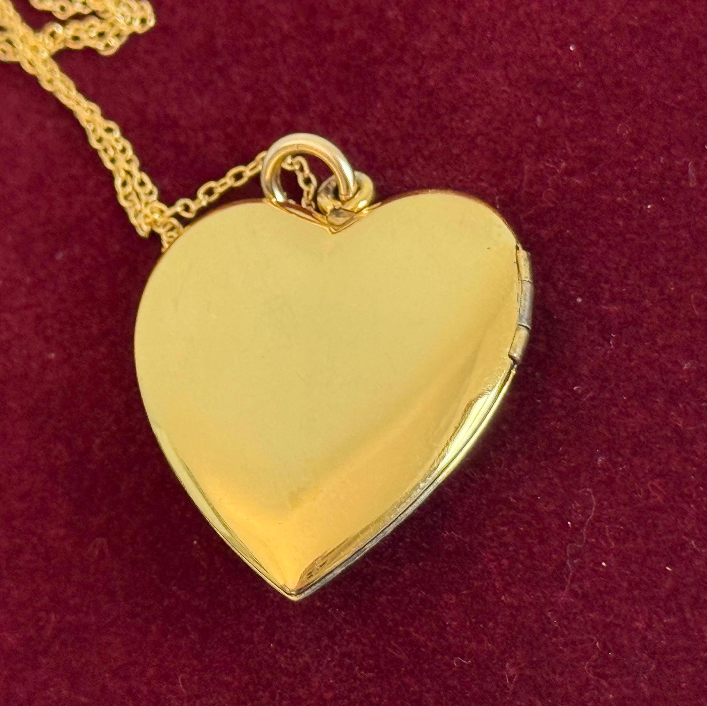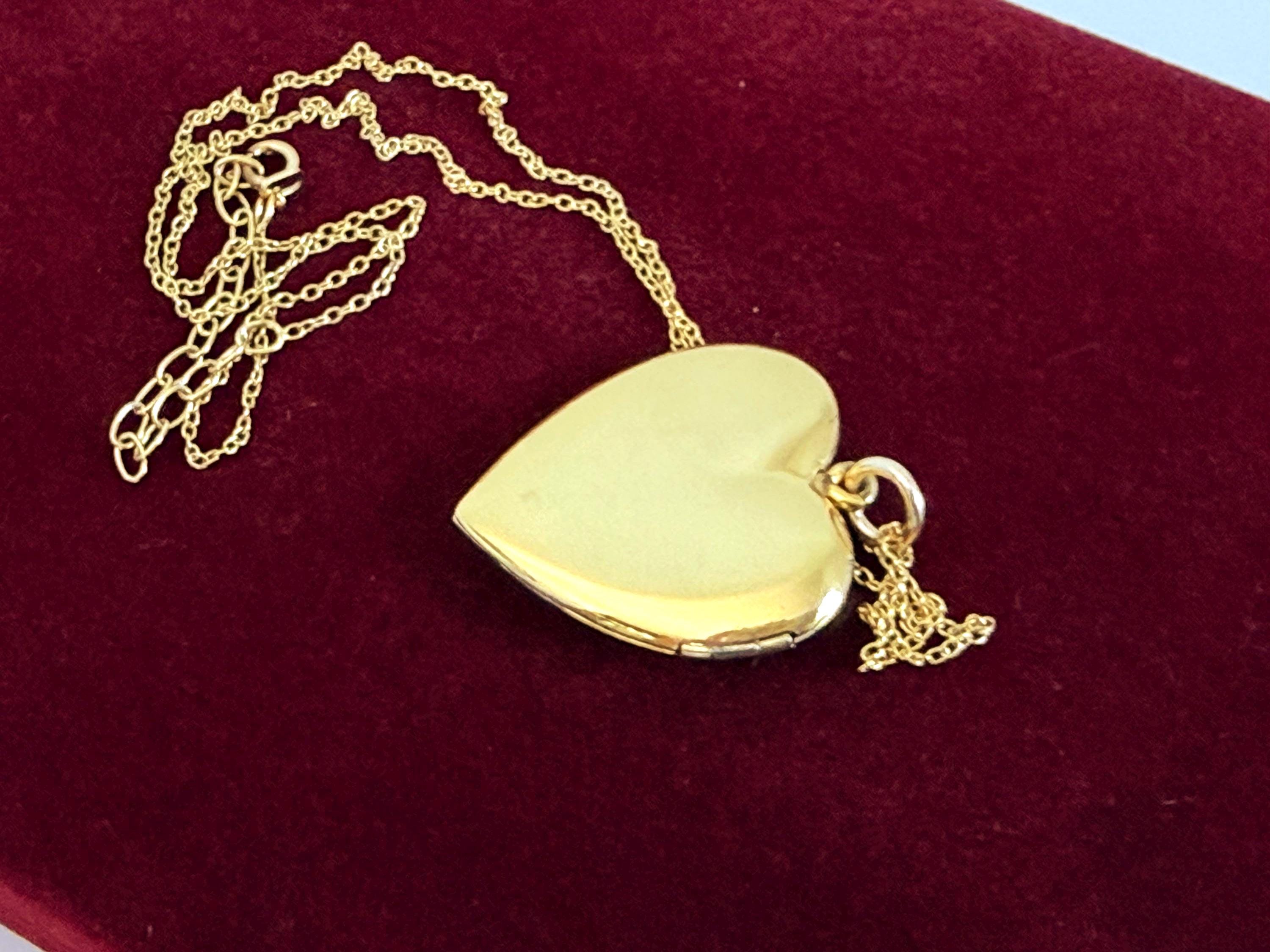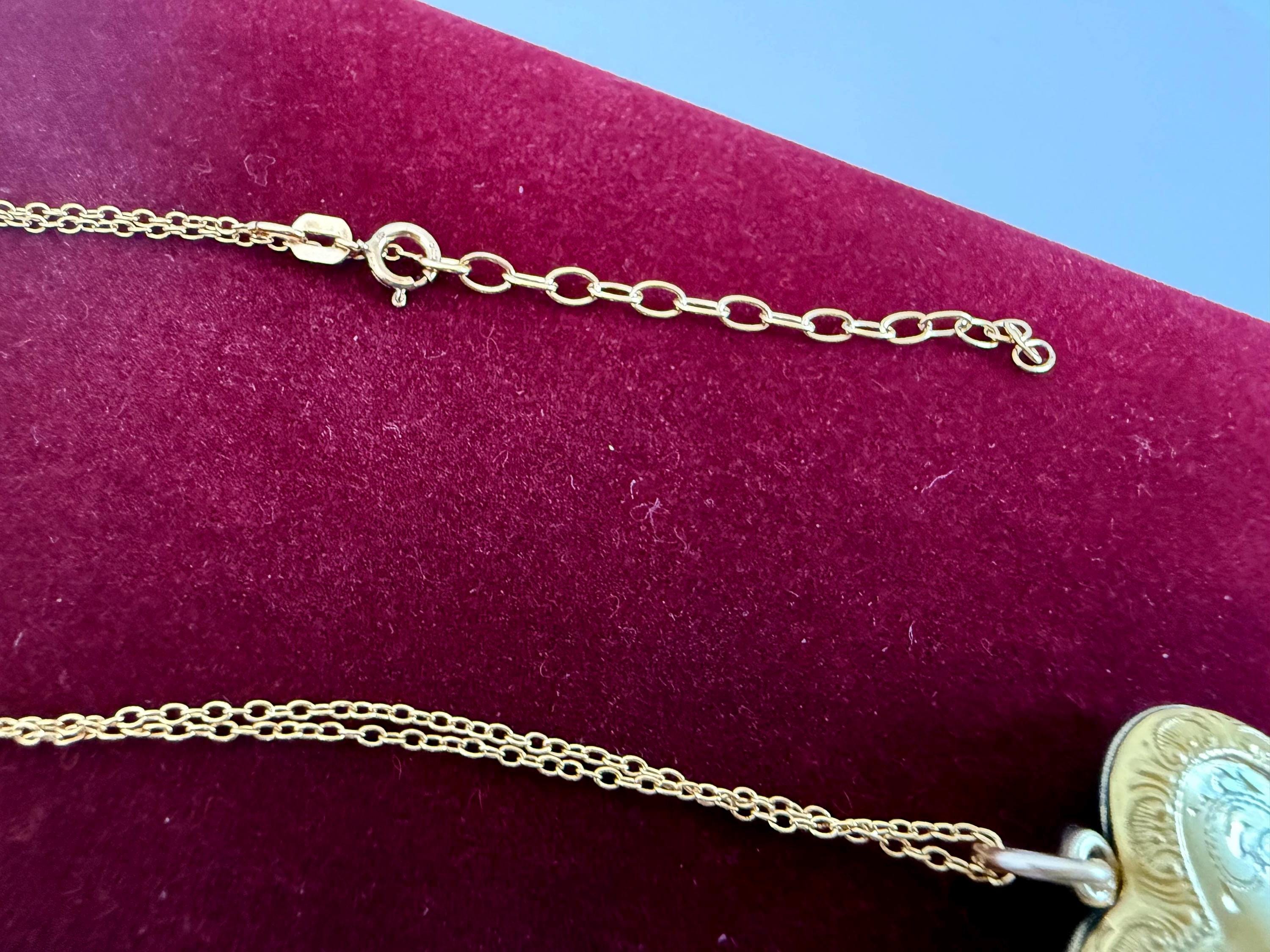 The vintage locket hangs on a vintage vermeil (gilt over silver) adjustable length chain that has a spring ring clasp. The chain can be worn at 18" and 20" lengths. There is a change in the size of the cable links at the end where it can be adjusted - see photo close ups.