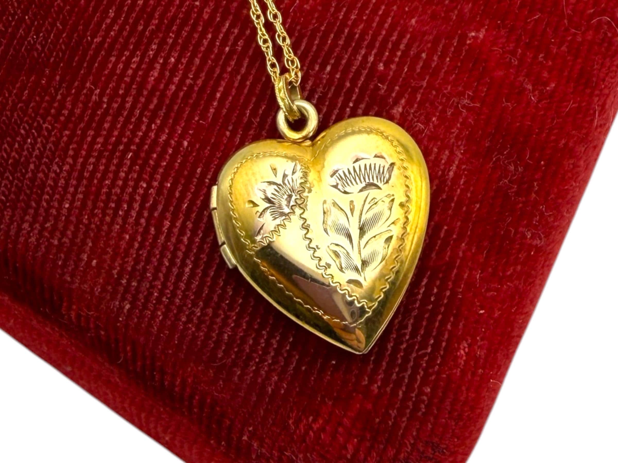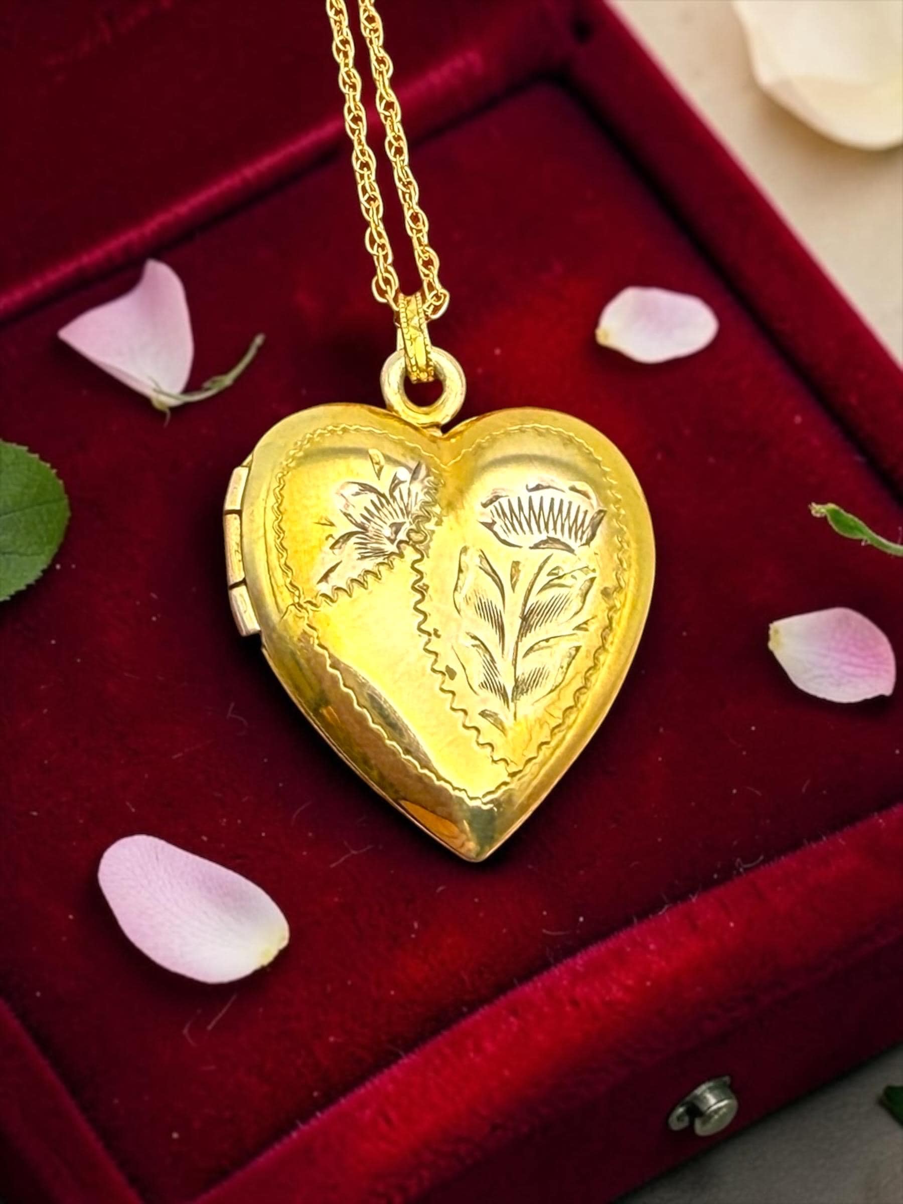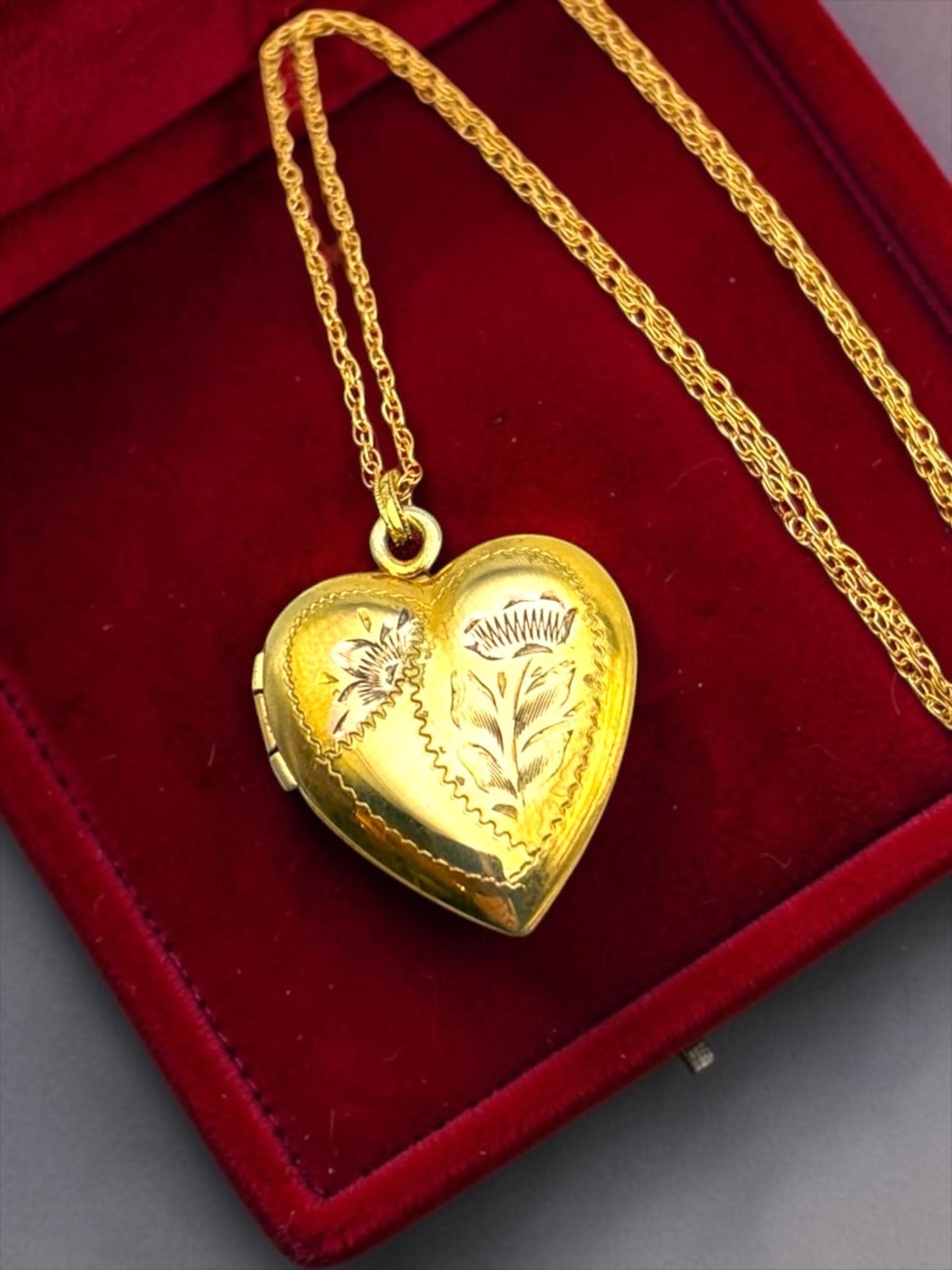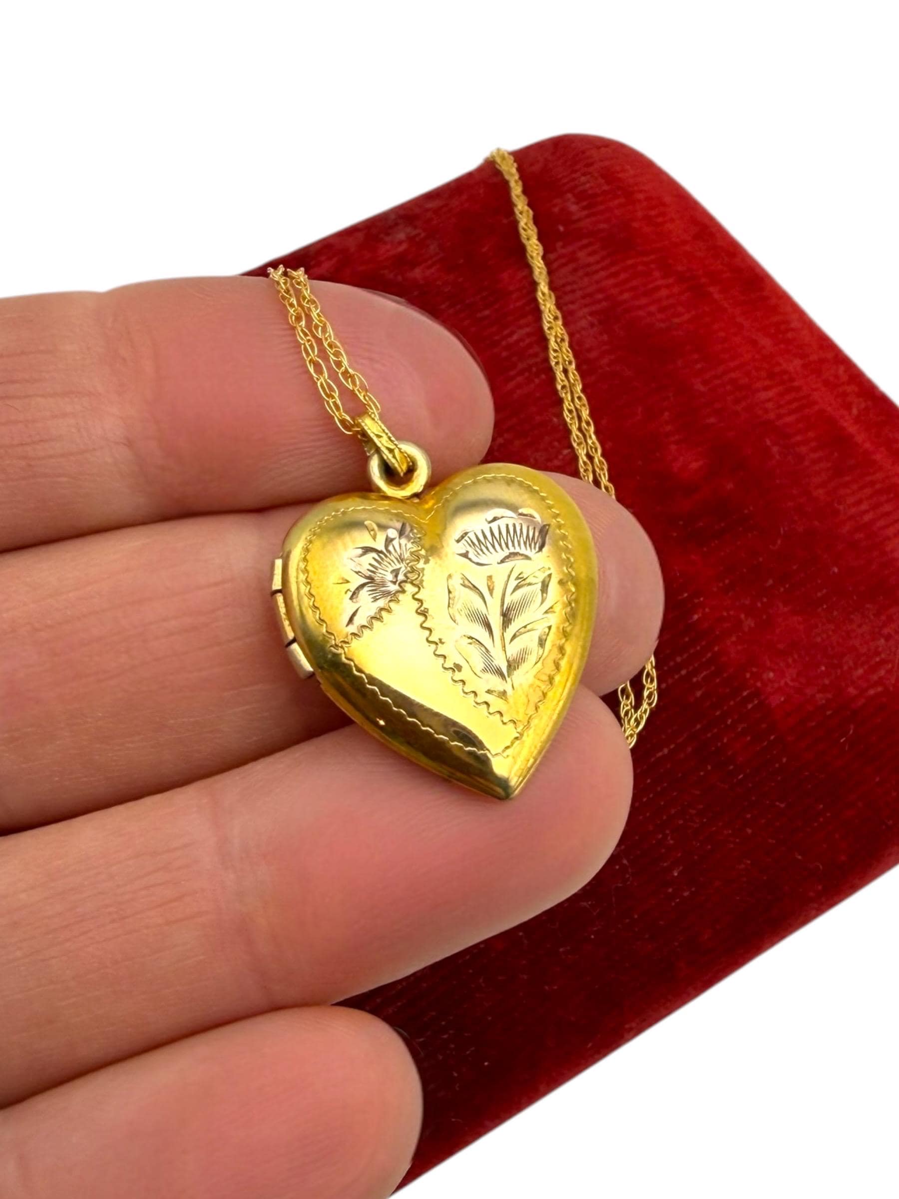 A vintage vermeil (gold over silver) heart shaped locket that is etched on the front and hangs in a new 14K gold filled chain. The mid century era necklace has an etched floral and heart design on the front. The back is plain with no design and a shiny finish.