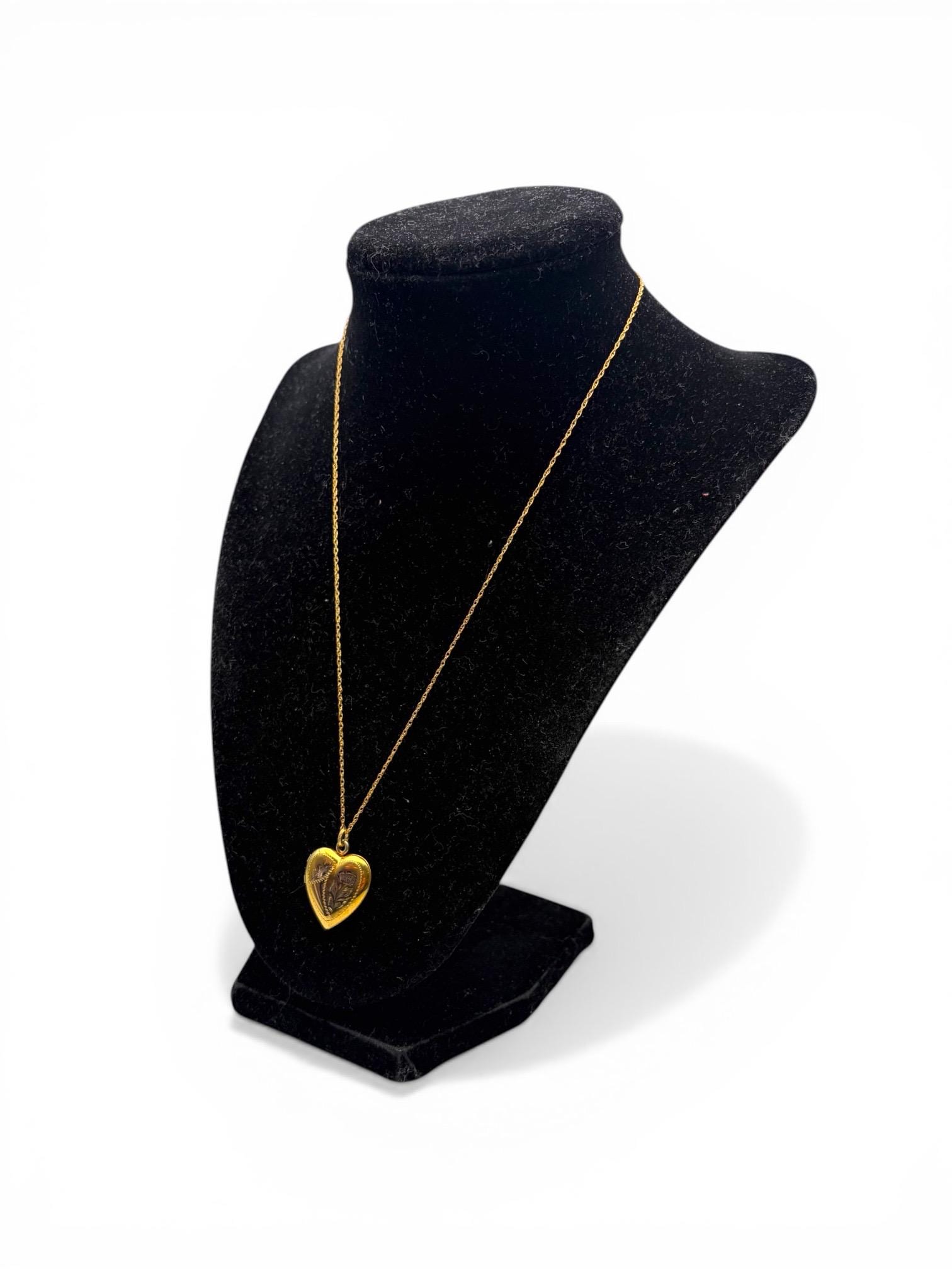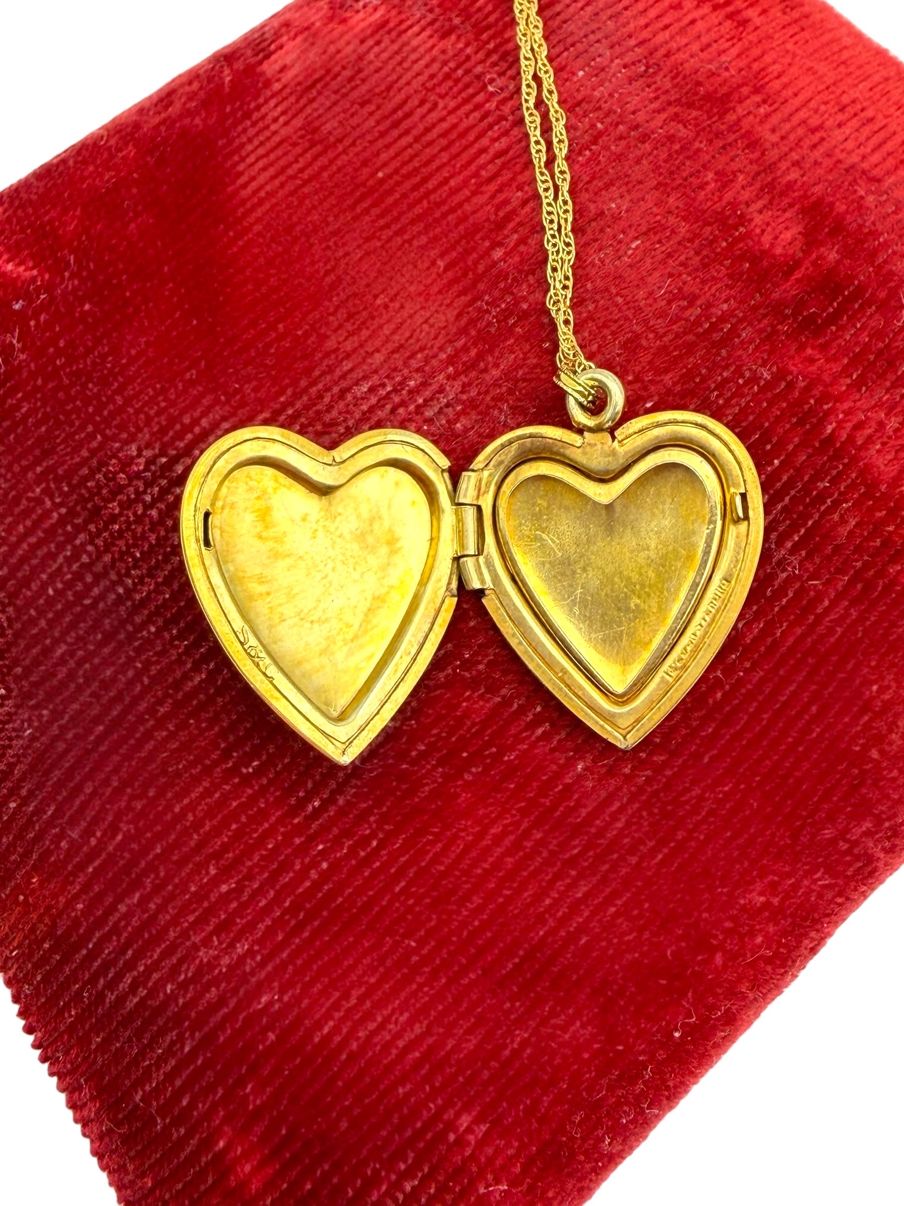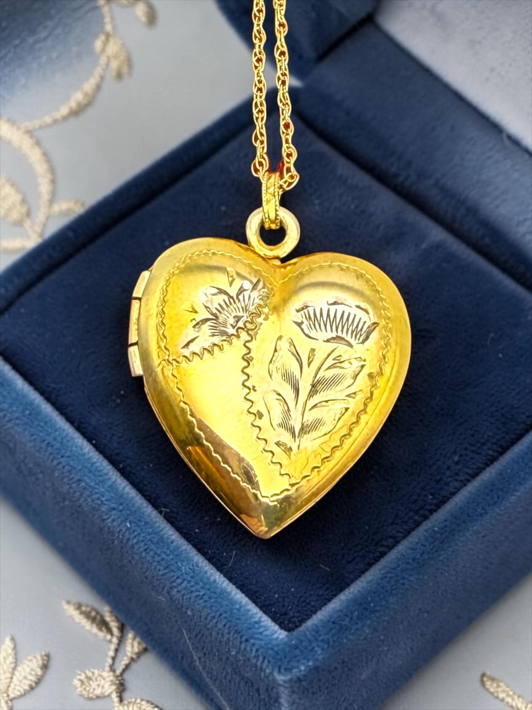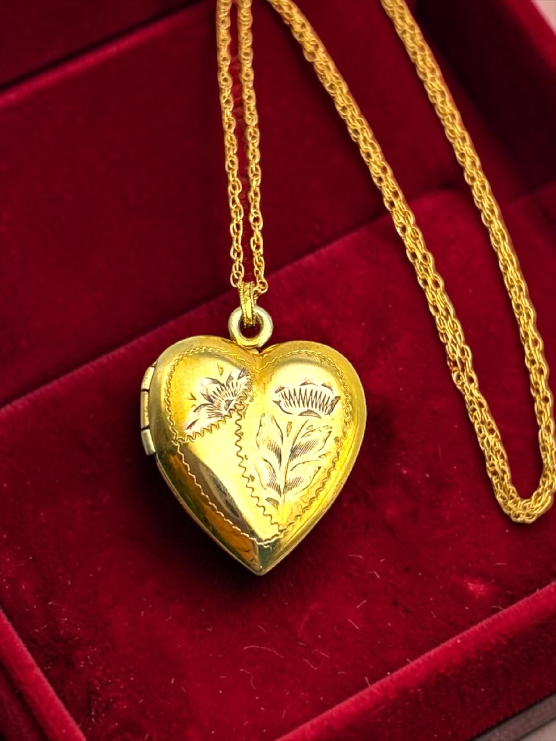 A vintage vermeil (gold over silver) heart shaped locket that is etched on the front and hangs in a new 14K gold filled chain. The mid century era necklace has an etched floral and heart design on the front. The back is plain with no design and a shiny finish.