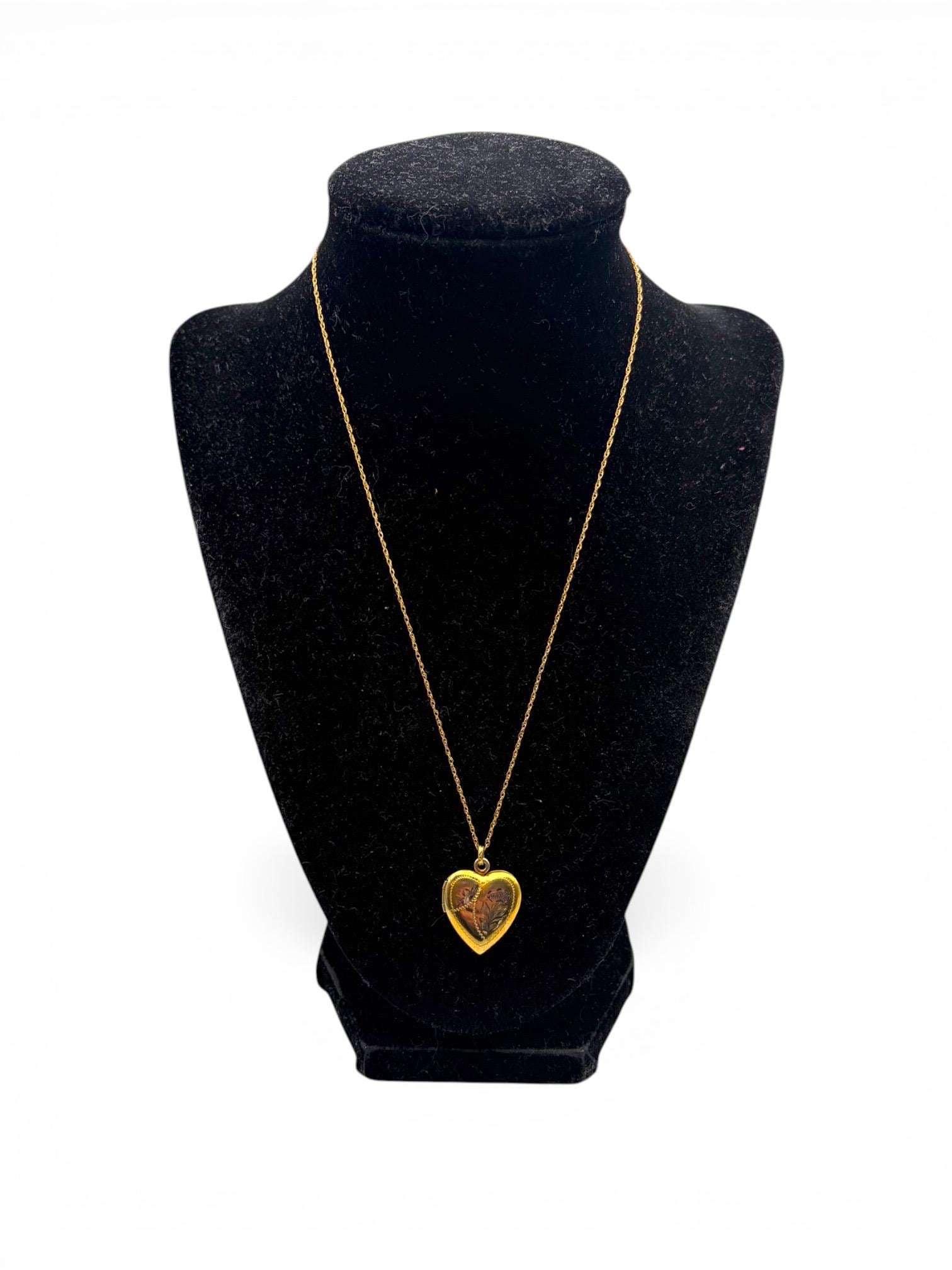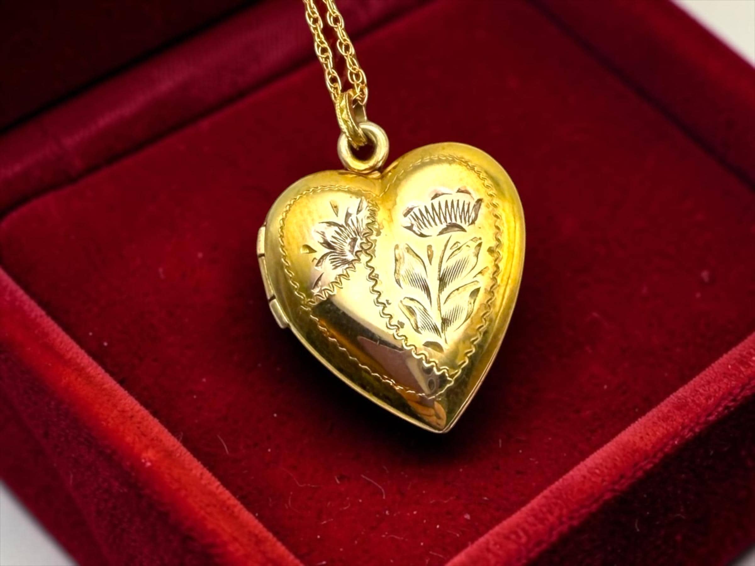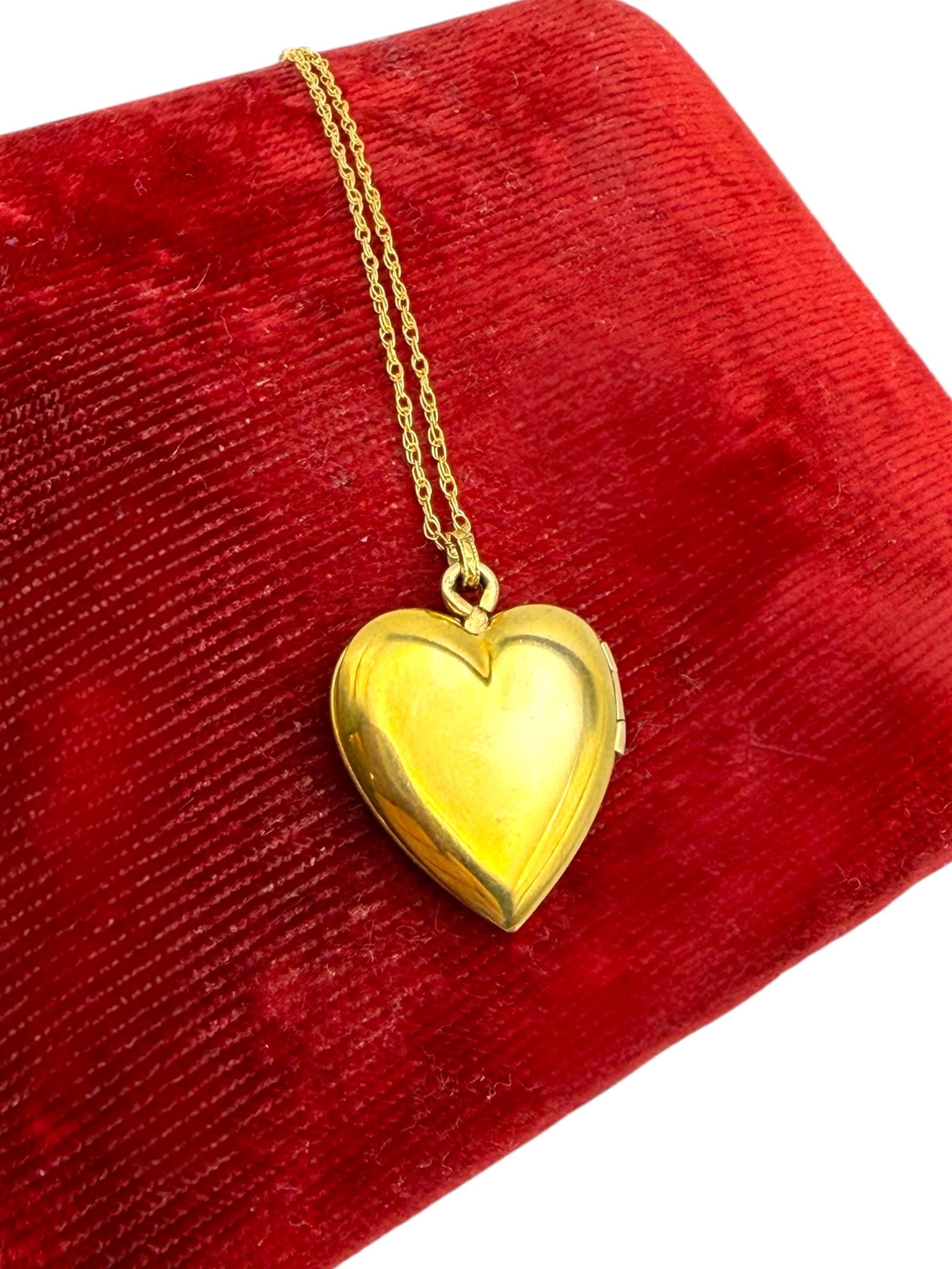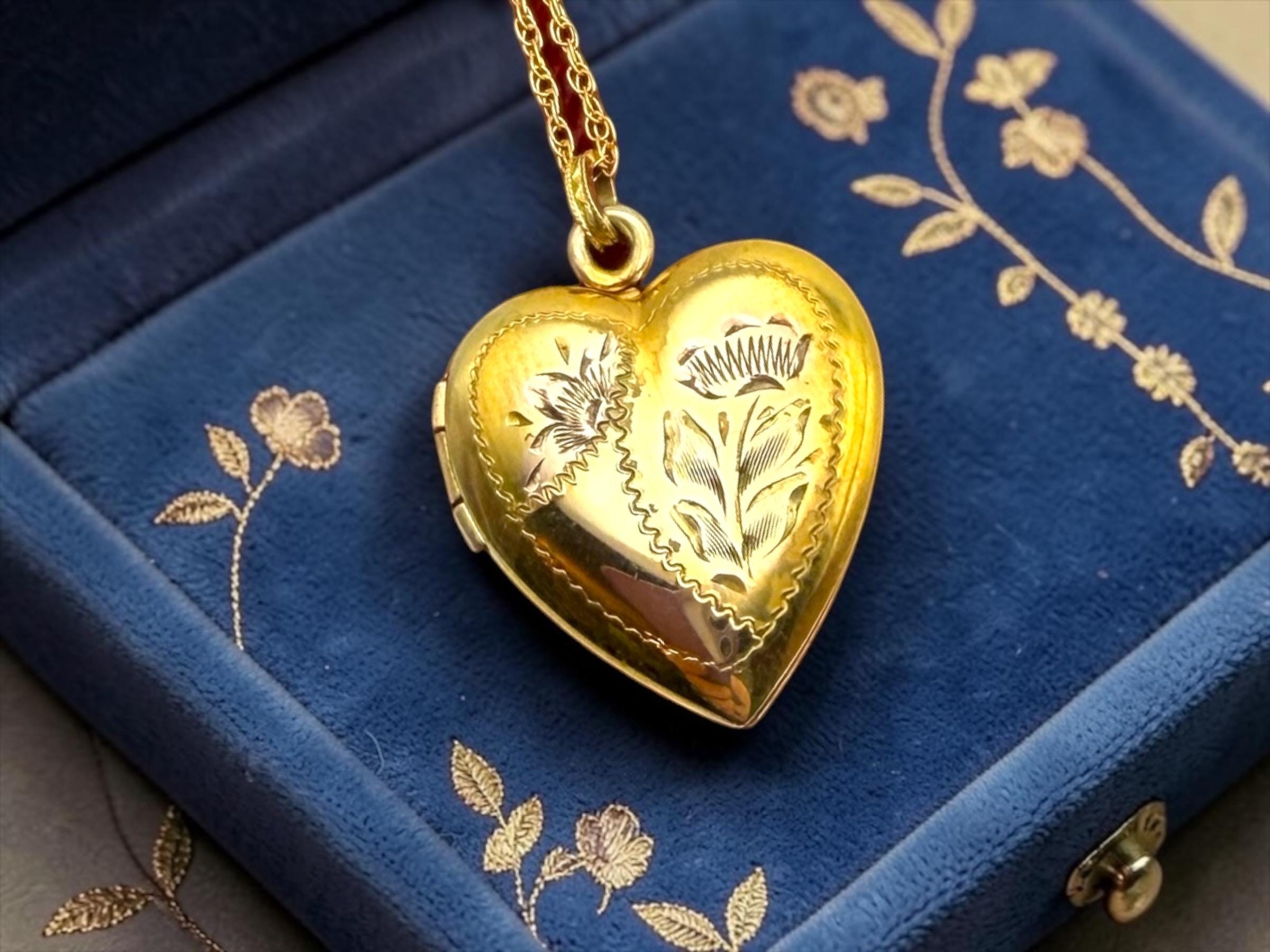 A vintage vermeil (gold over silver) heart shaped locket that is etched on the front and hangs in a new 14K gold filled chain. The mid century era necklace has an etched floral and heart design on the front. The back is plain with no design and a shiny finish.