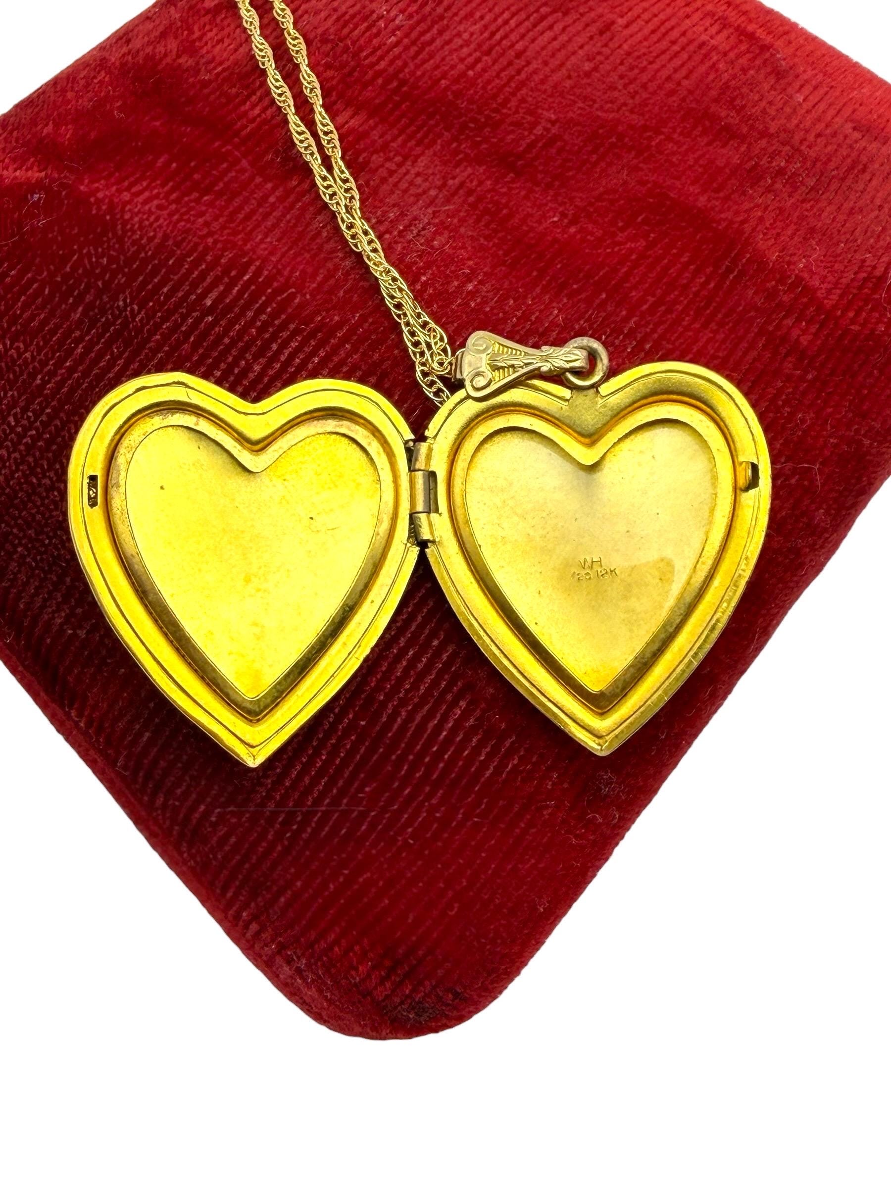 There are 2 heart shaped compartments for photos inside this Retro era gold filled locket that are currently empty. The original frames are intact, one side has the plastic photo covers.