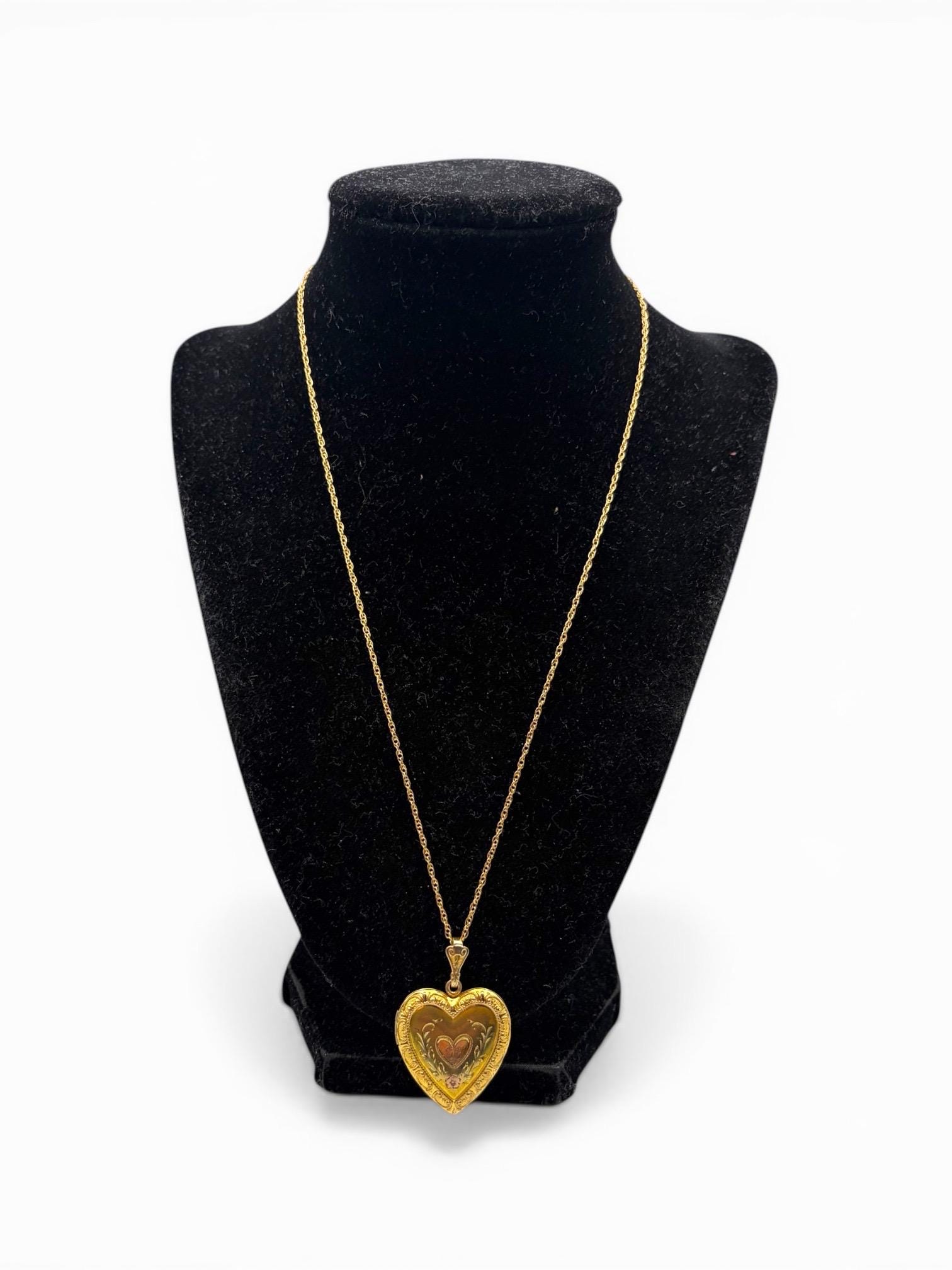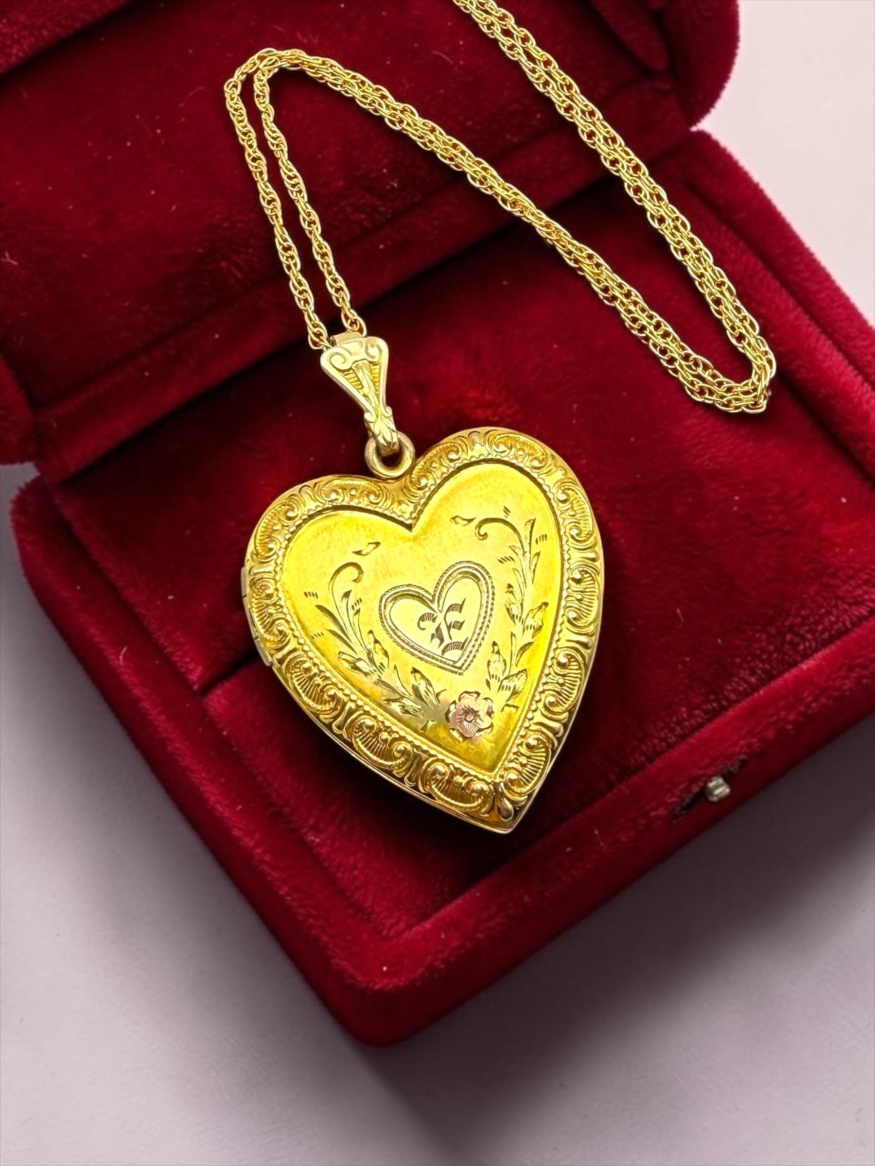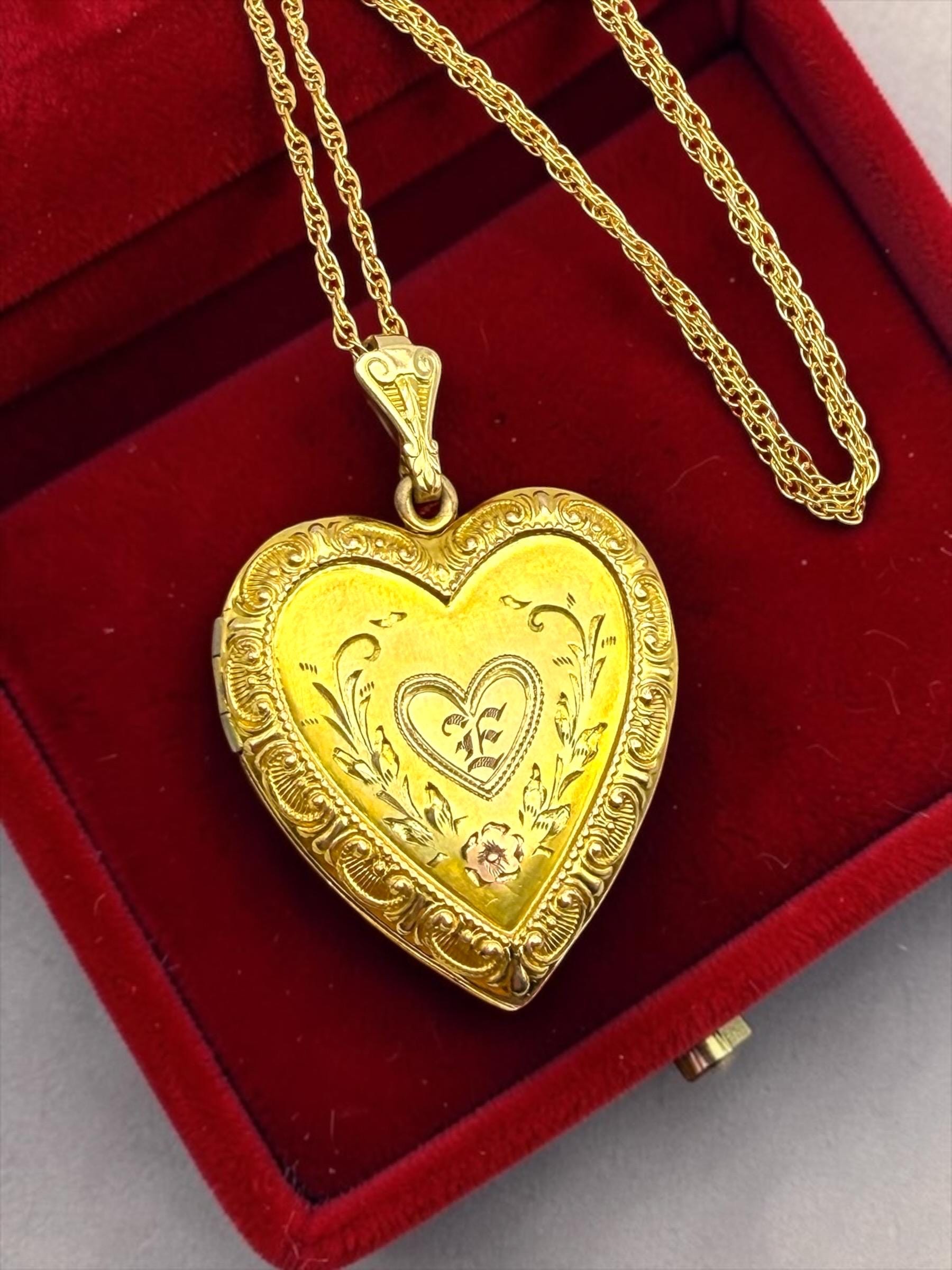Vintage 12K Gold Filled Heart Locket Necklace – Etched Floral Monogram E, WH Hallmark