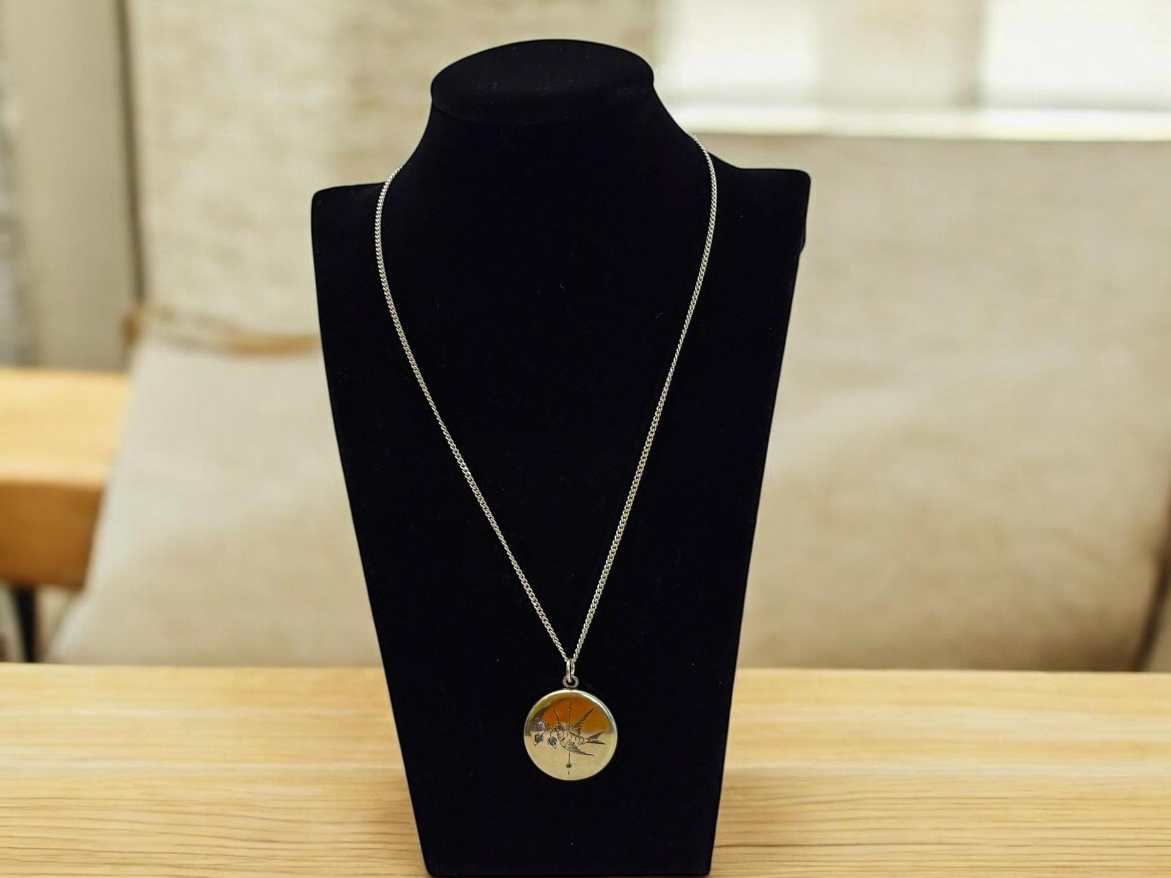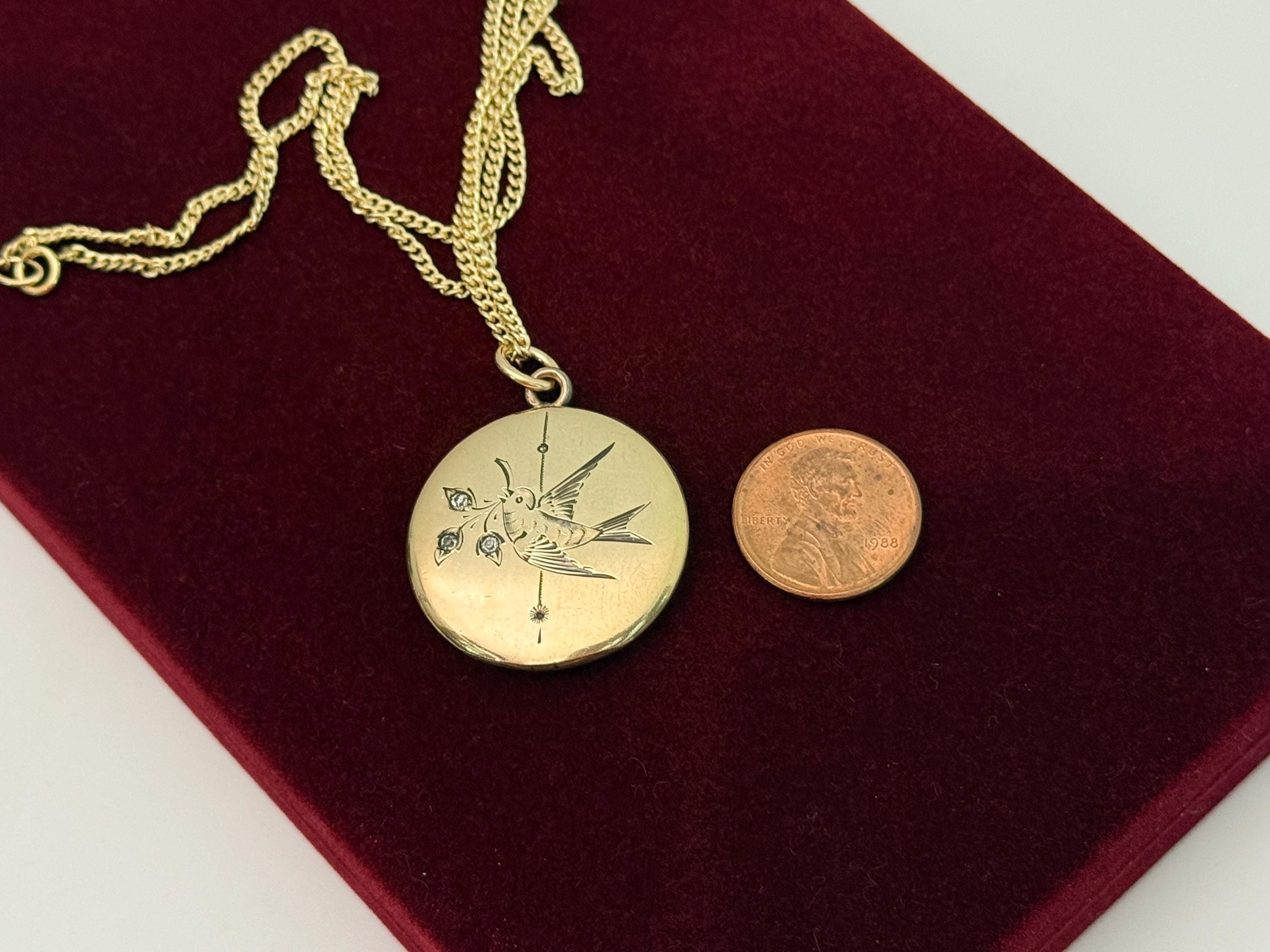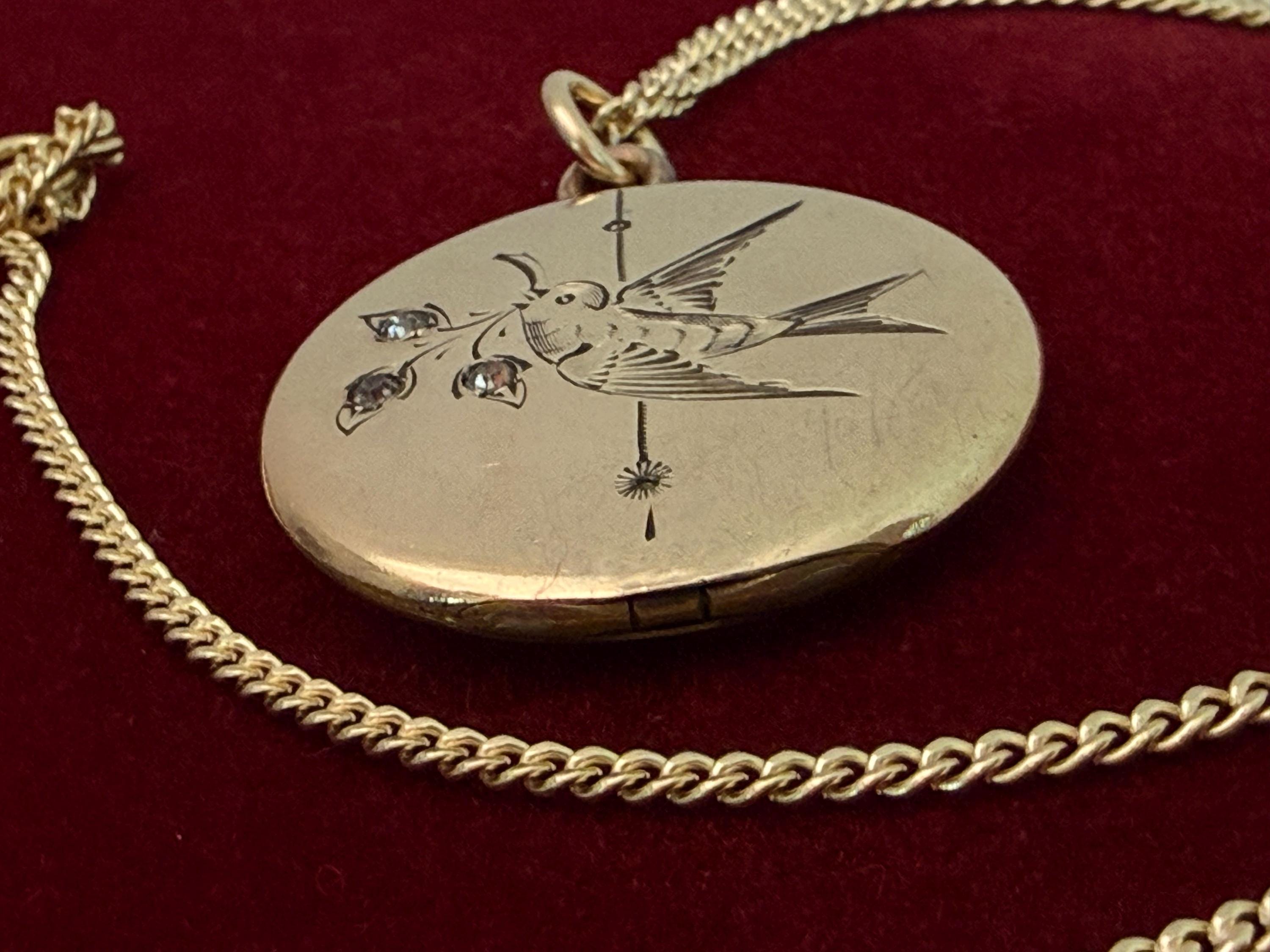 Antique Gold Filled Locket Necklace: Etched Sparrow, Paste Stones, 14K GF Chain, 1900s Bliss Bros
