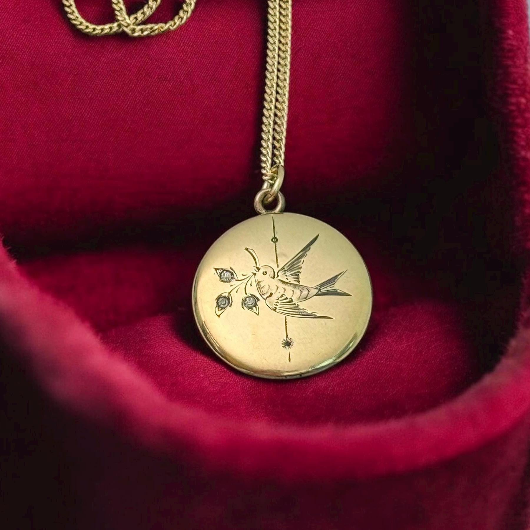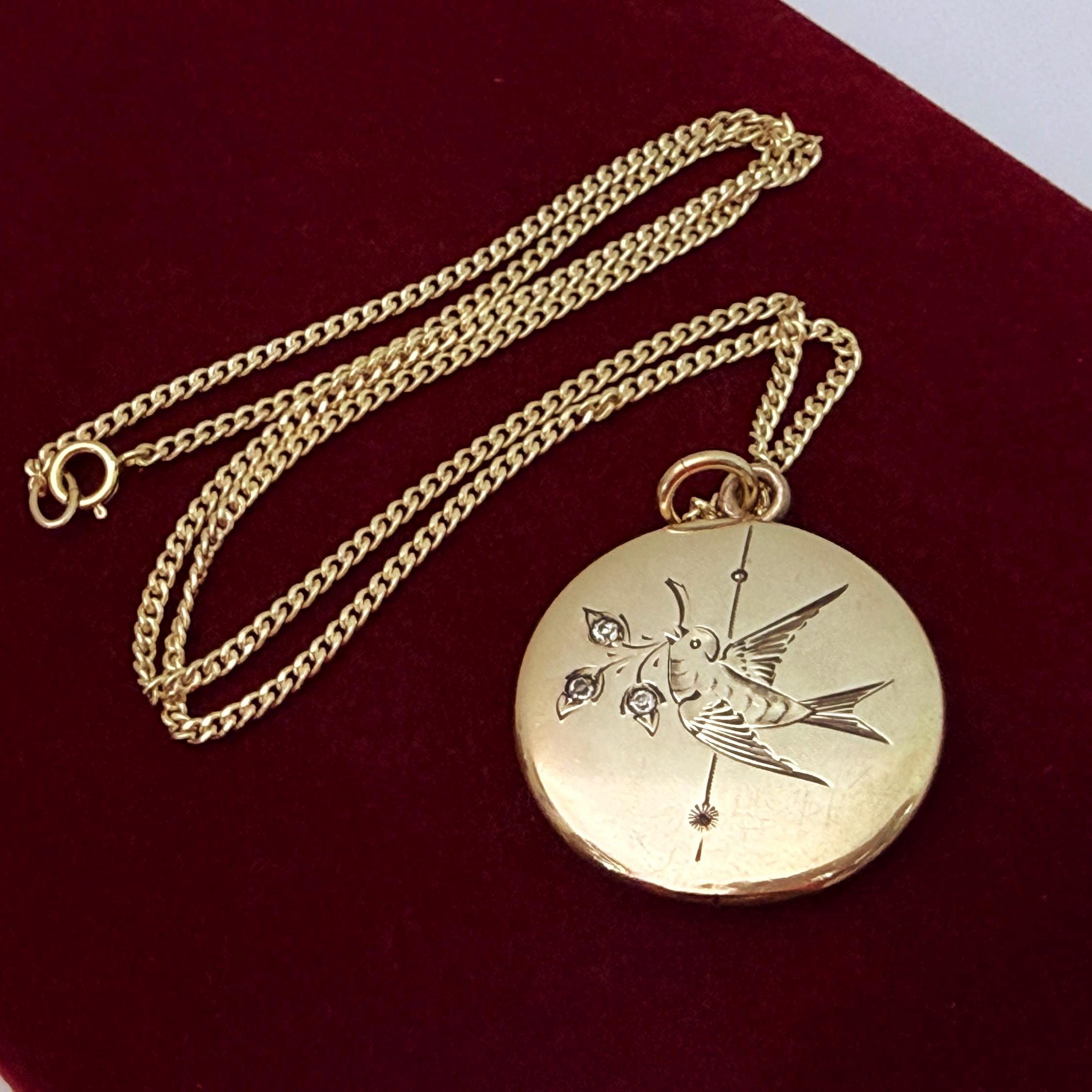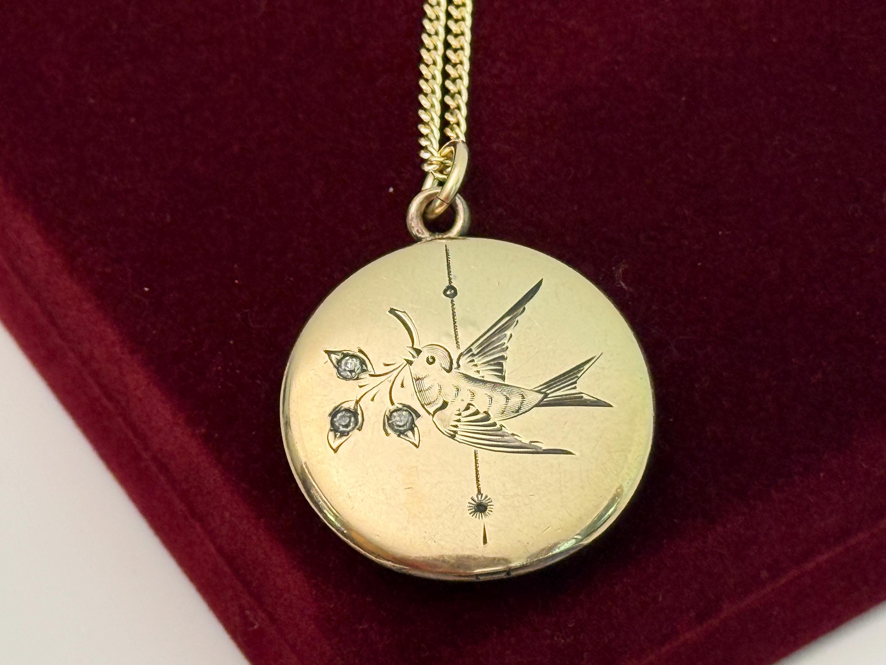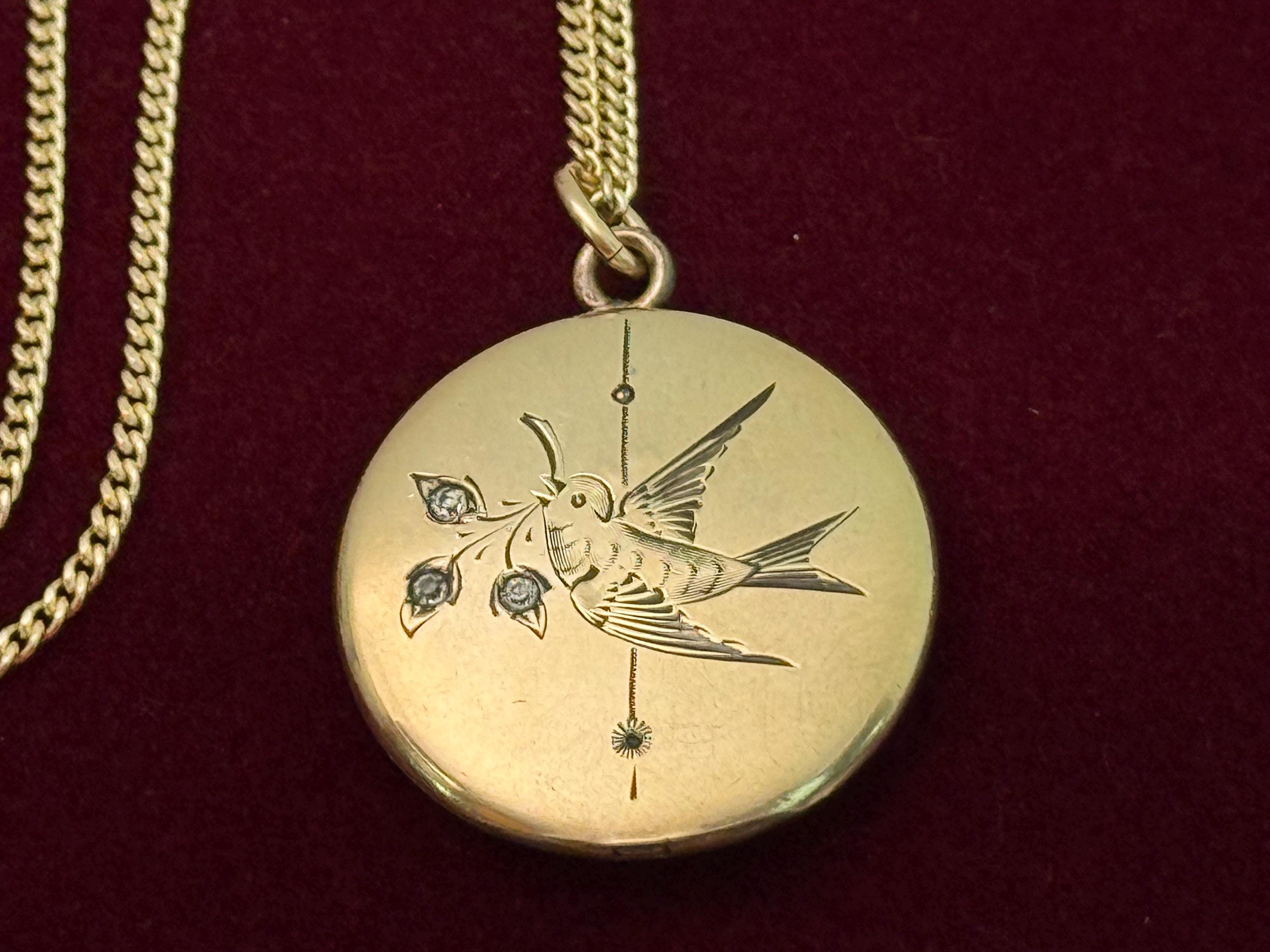 A very eye-catching antique round gold filled locket necklace with an etched design of a swallow in flight. The swallow bird is holding flowers from a sprig held in its beak. There are paste (glass) gems set inside the three flowers. There is also a vertical etched accent line down the center of the locket front. The back is plain with no design.