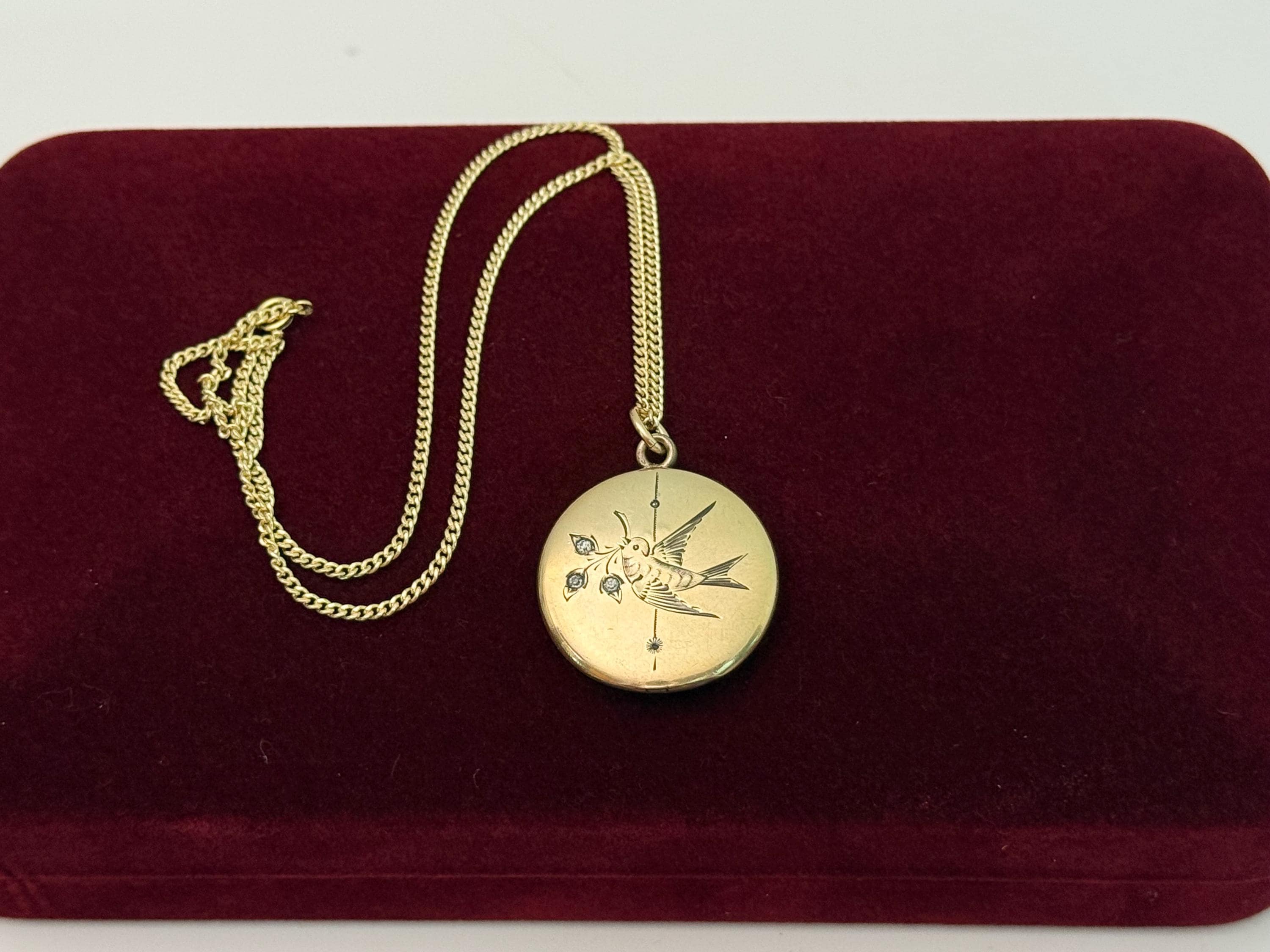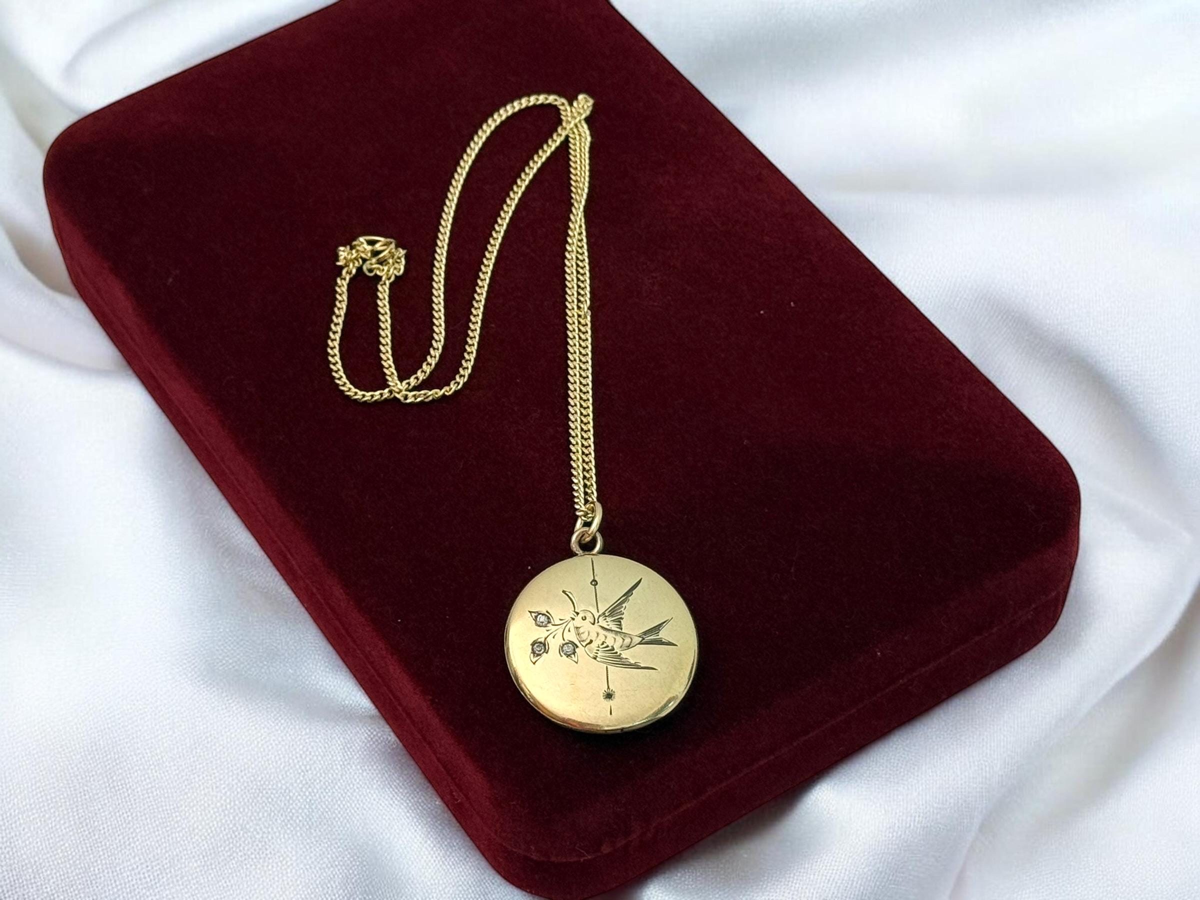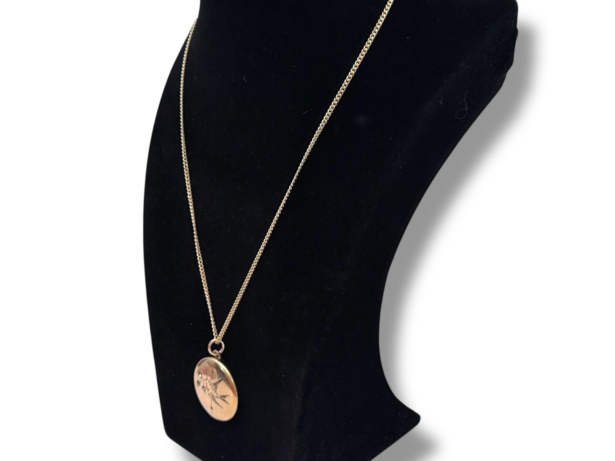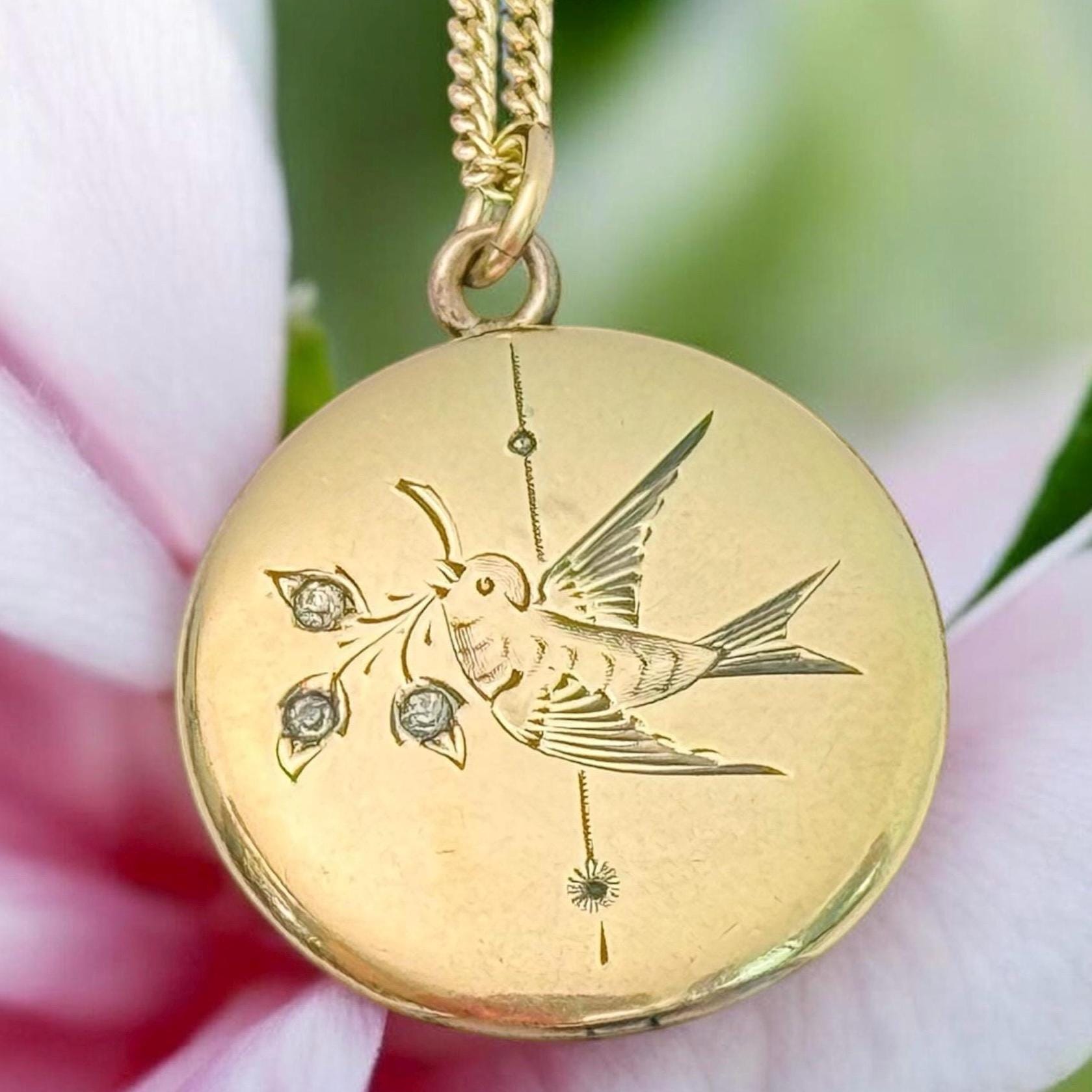 A very eye-catching antique round gold filled locket necklace with an etched design of a swallow in flight. The swallow bird is holding flowers from a sprig held in its beak. There are paste (glass) gems set inside the three flowers. There is also a vertical etched accent line down the center of the locket front. The back is plain with no design.