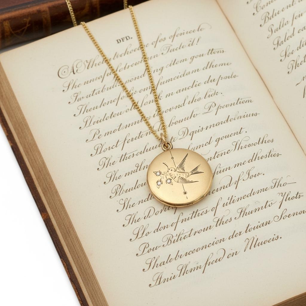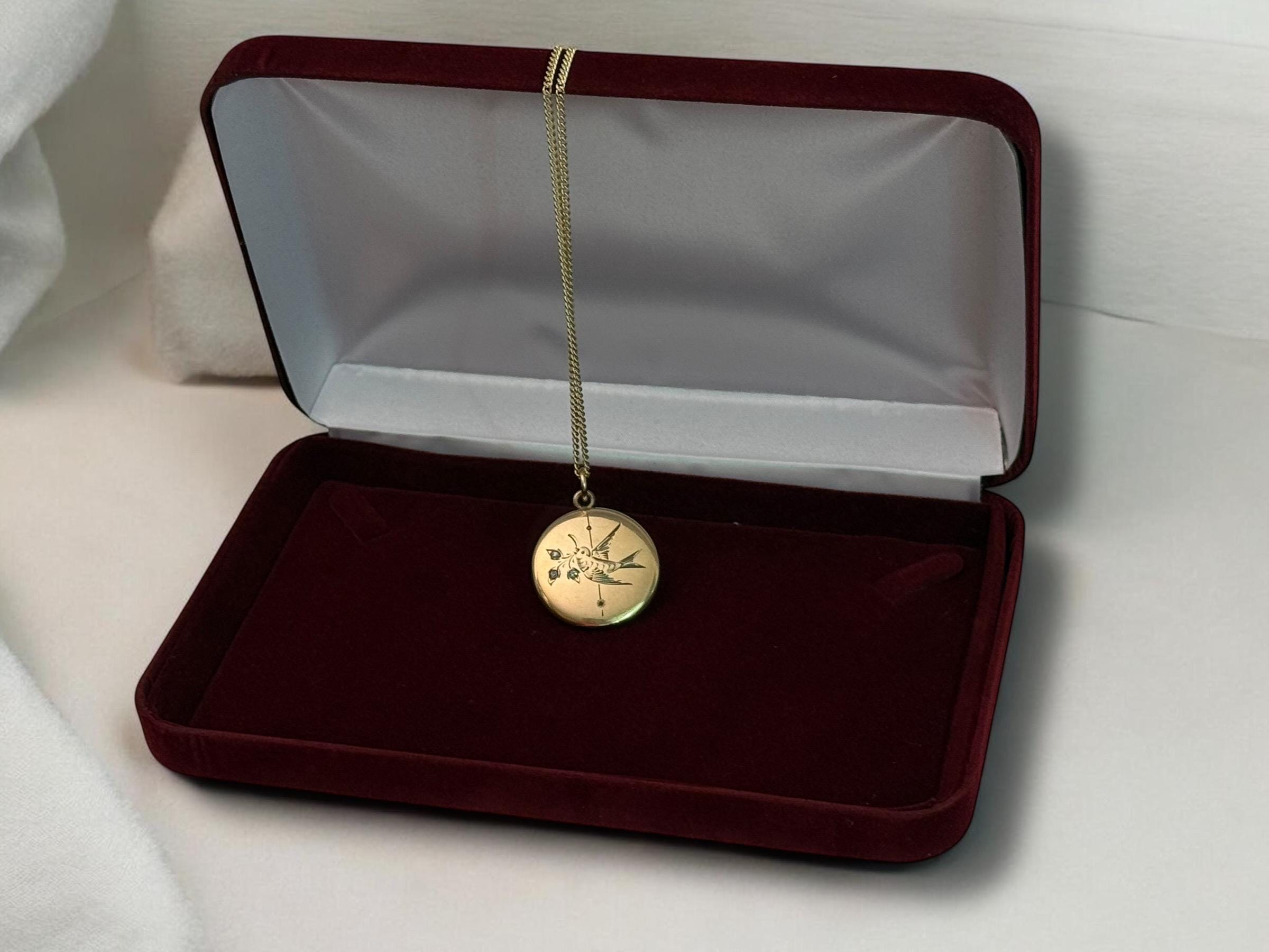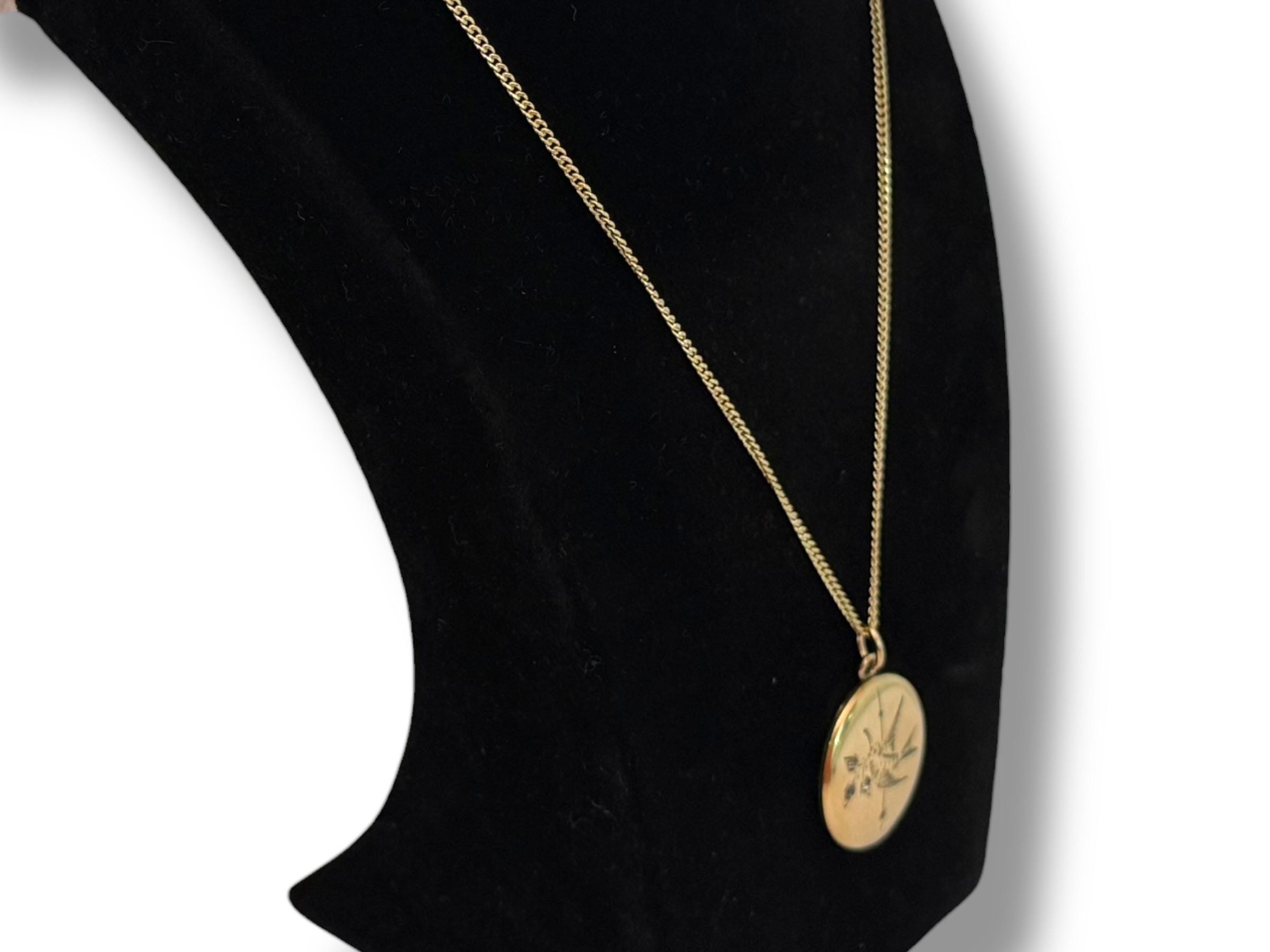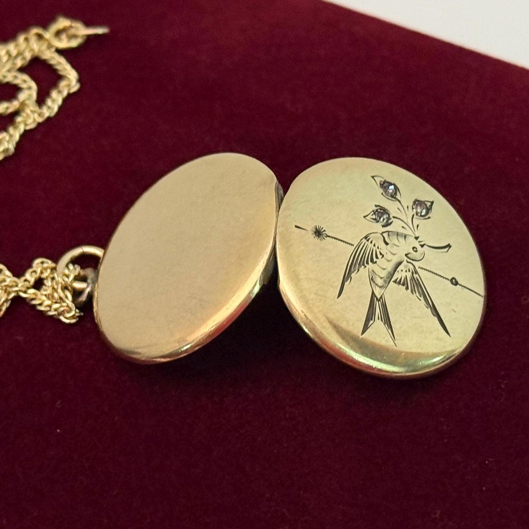 A very eye-catching antique round gold filled locket necklace with an etched design of a swallow in flight. The swallow bird is holding flowers from a sprig held in its beak. There are paste (glass) gems set inside the three flowers. There is also a vertical etched accent line down the center of the locket front. The back is plain with no design.