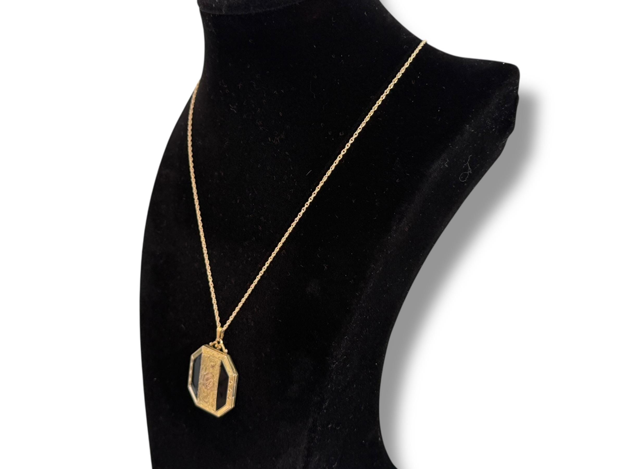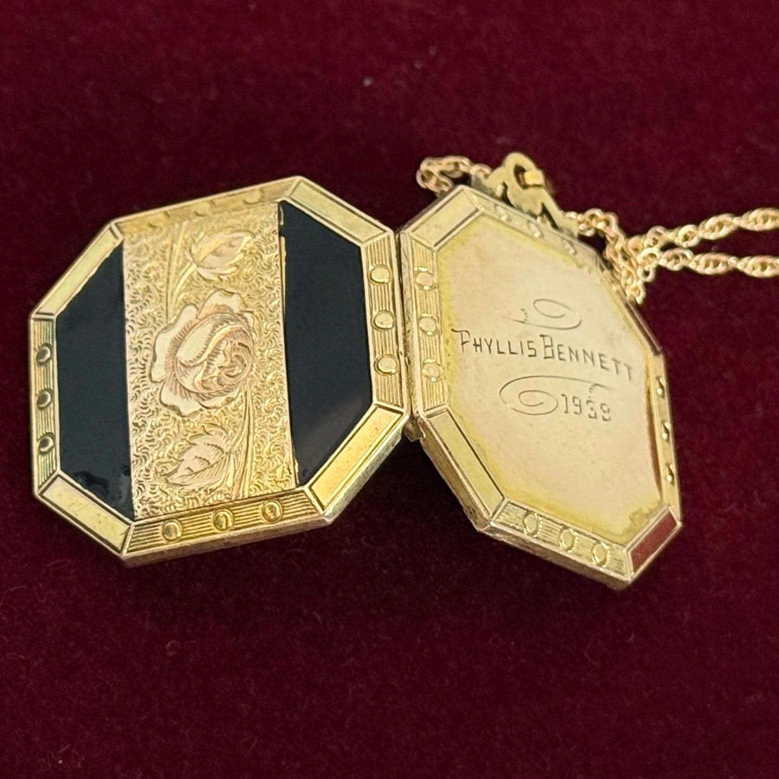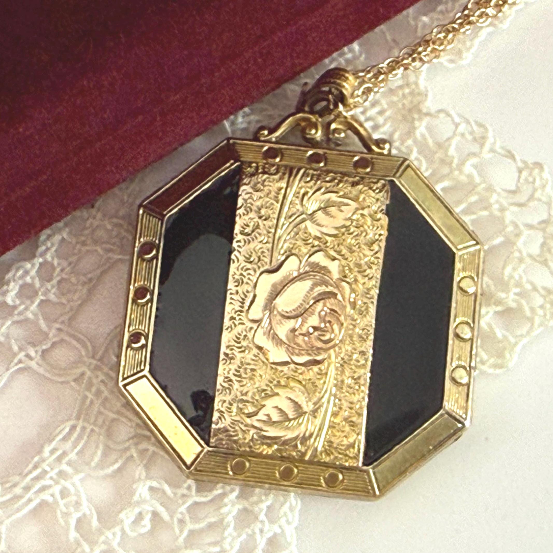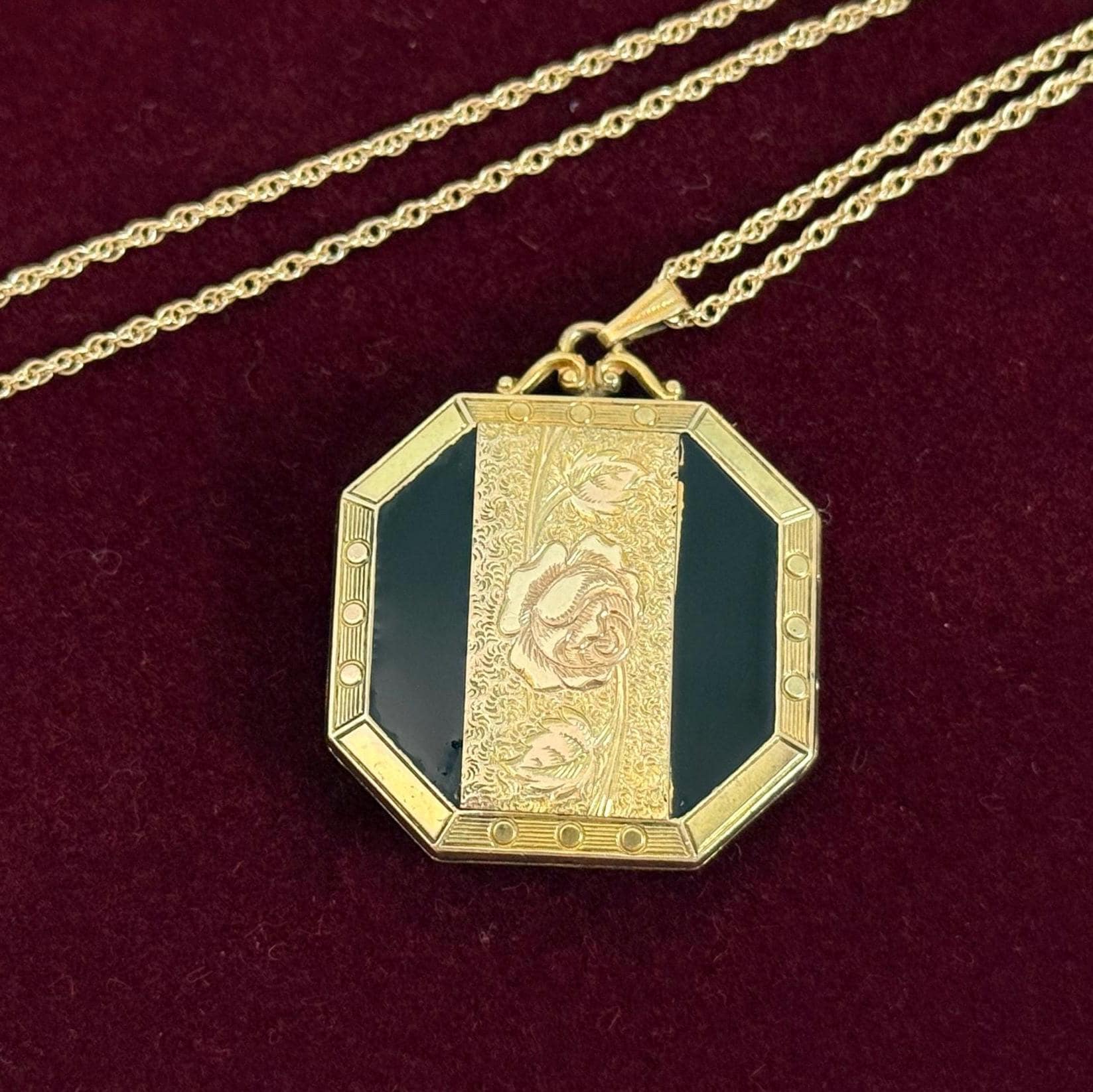 A unique 10K yellow gold filled locket necklace with a floral etched design on the front with black enamel on the sides. It hangs on a new 14K gold filled rope chain that is 20" long. The eight sided locket is nicely detailed. The front center, between the 2 black enamel side panels, features etched leaves and a rose flower that has a very subtle pink color. The back of the locket is plain but is engraved "Phyllis Bennett 1959". The sides of the locket have gold filled edges with 3 little rounds spaced evenly around 4 of the 8 sides.