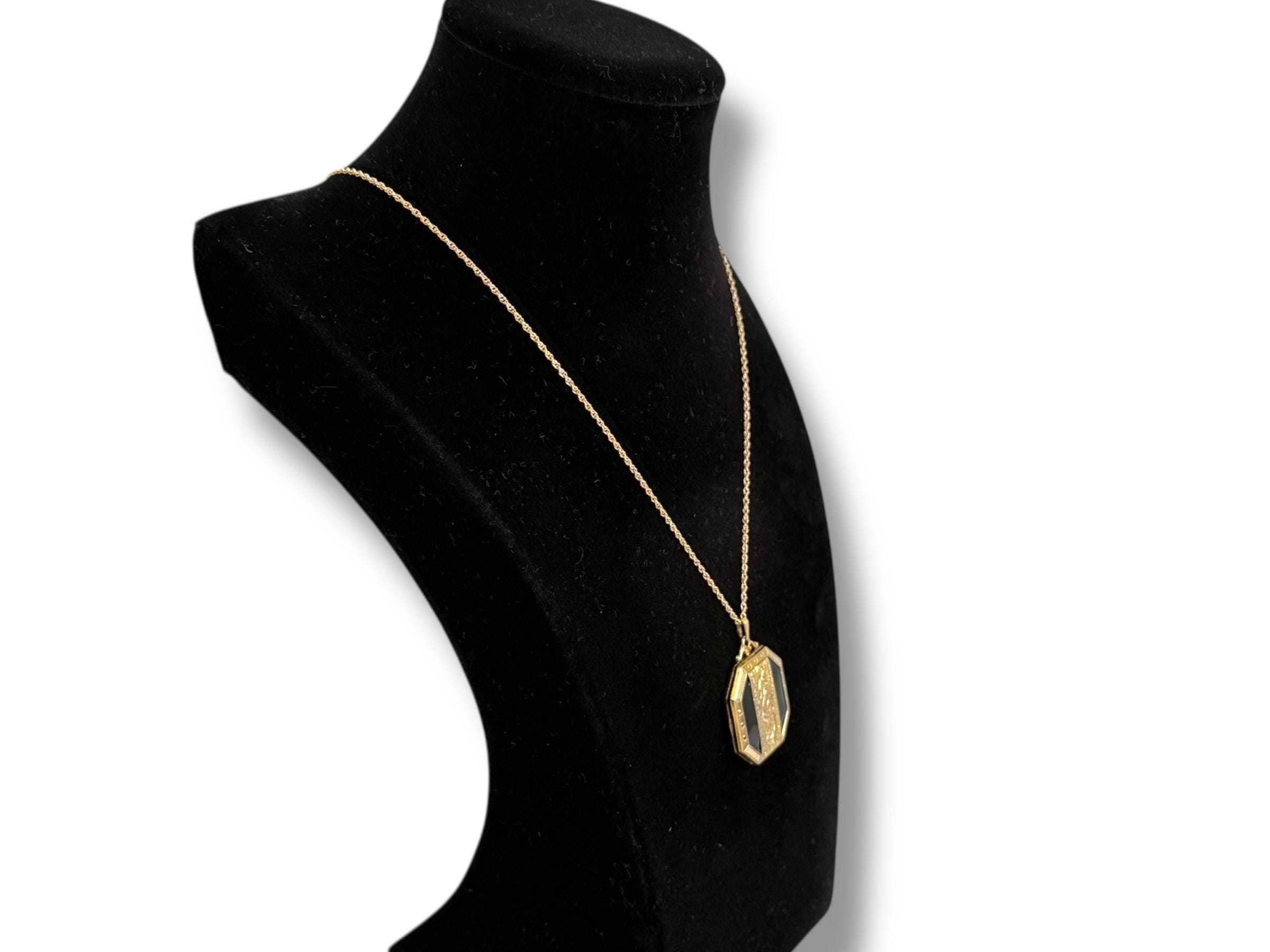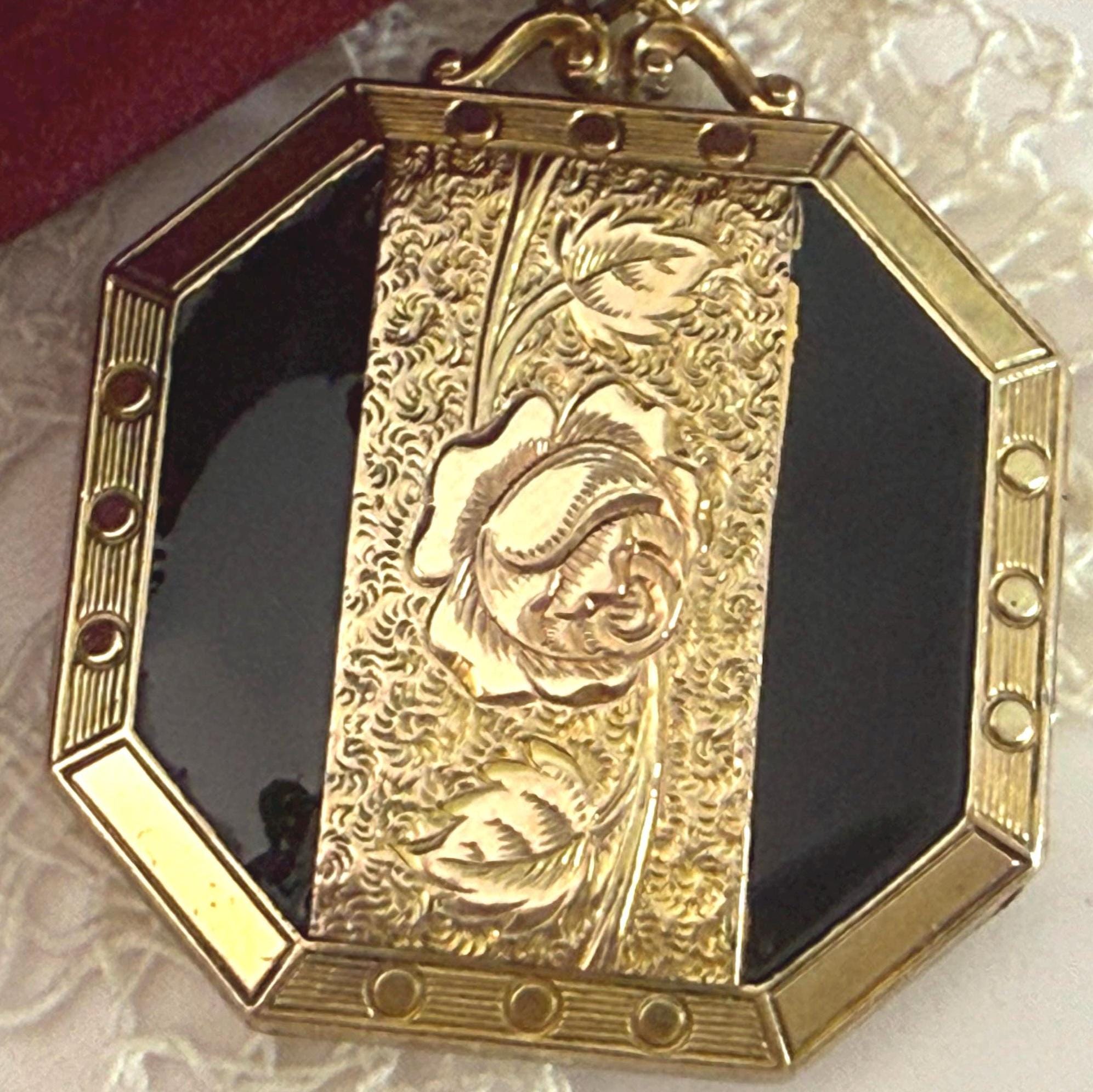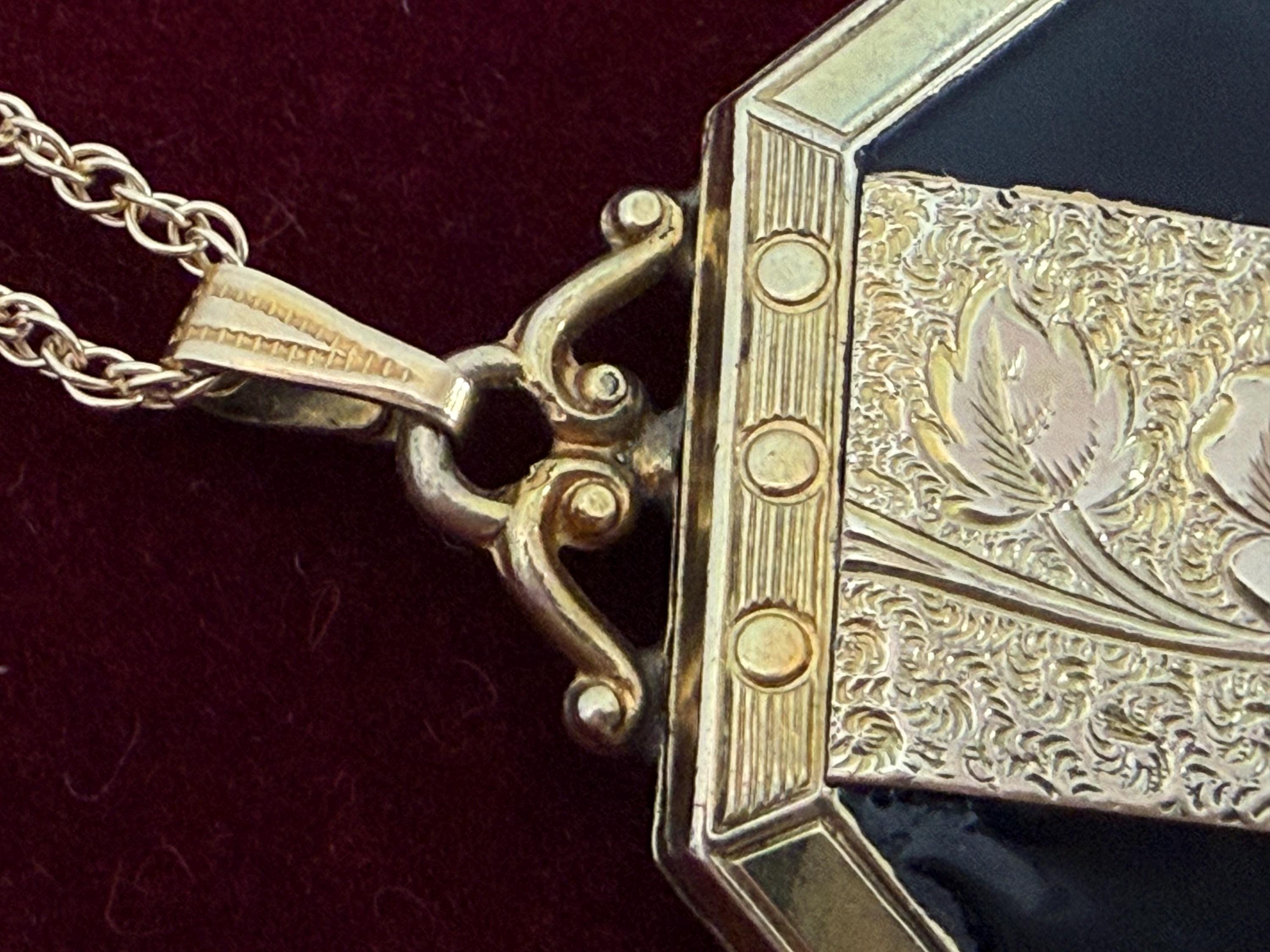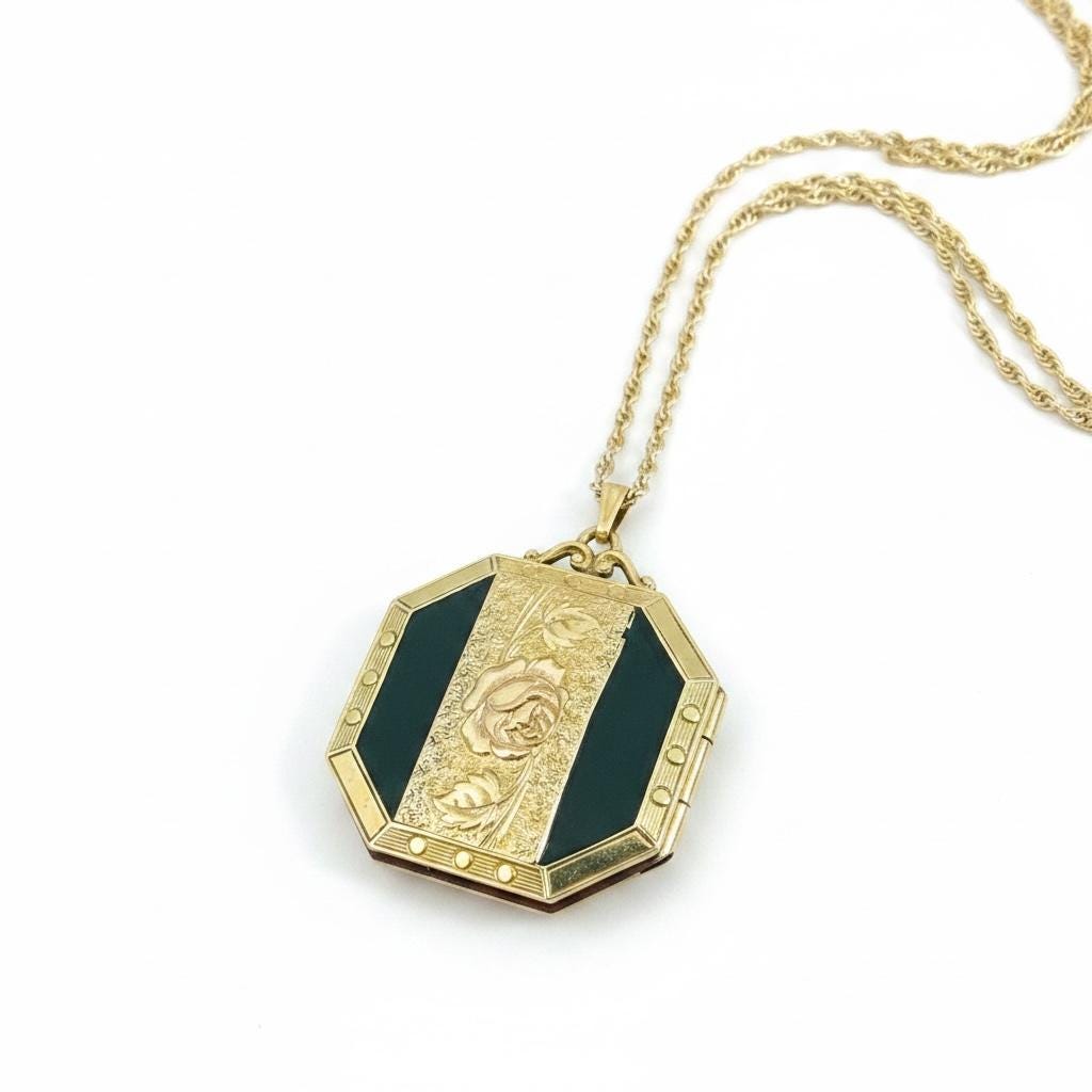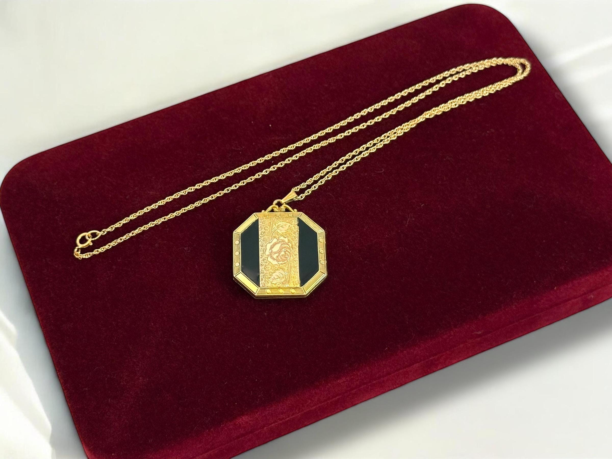 A unique 10K yellow gold filled locket necklace with a floral etched design on the front with black enamel on the sides. It hangs on a new 14K gold filled rope chain that is 20" long. The eight sided locket is nicely detailed. The front center, between the 2 black enamel side panels, features etched leaves and a rose flower that has a very subtle pink color. The back of the locket is plain but is engraved "Phyllis Bennett 1959". The sides of the locket have gold filled edges with 3 little rounds spaced evenly around 4 of the 8 sides.