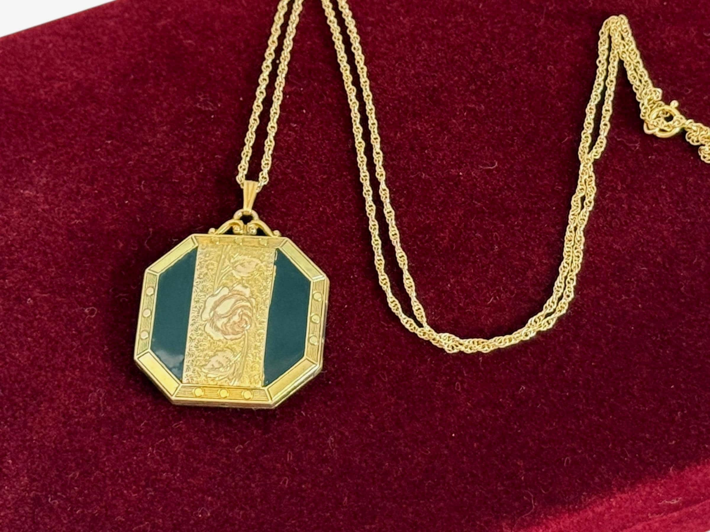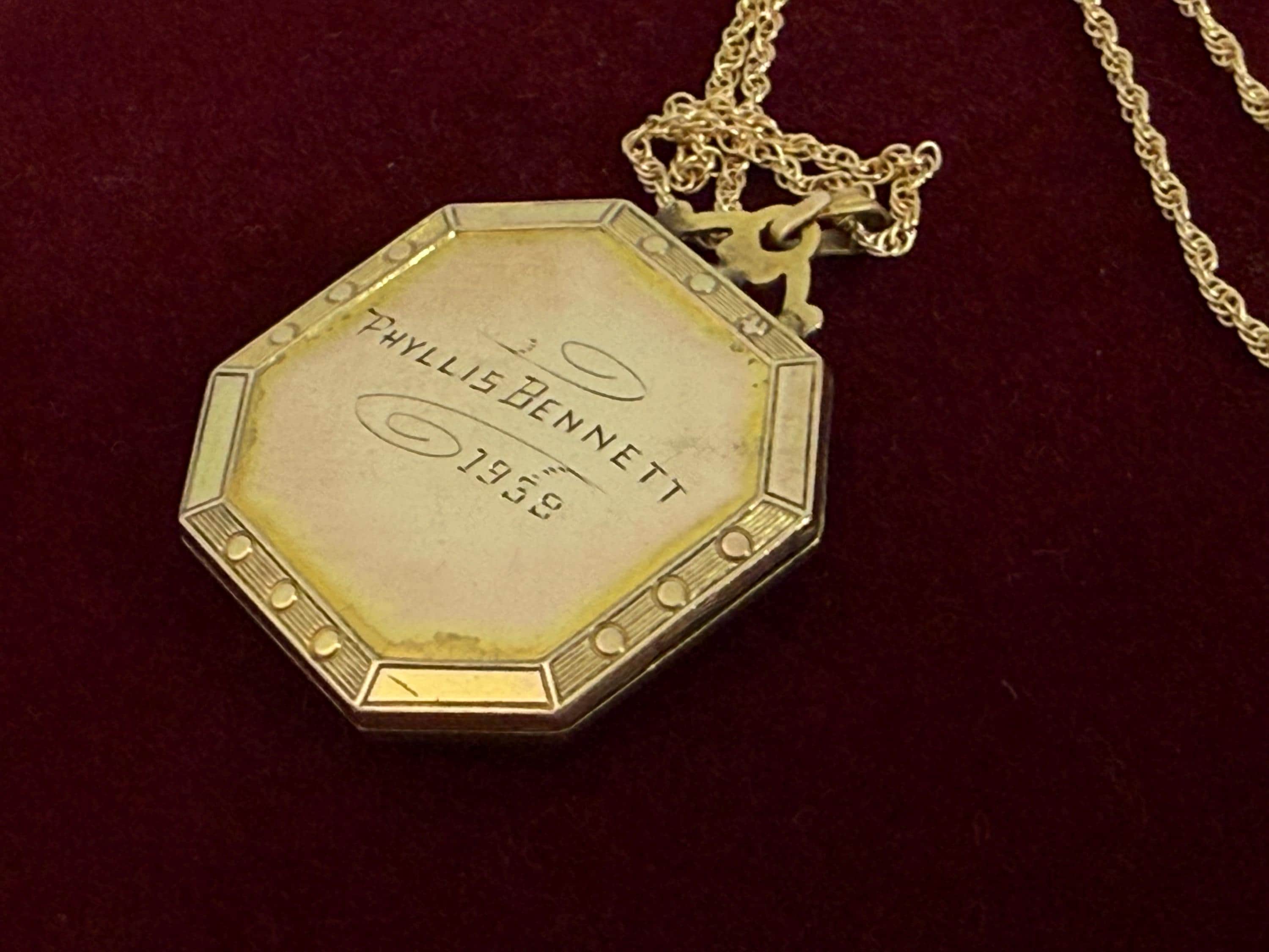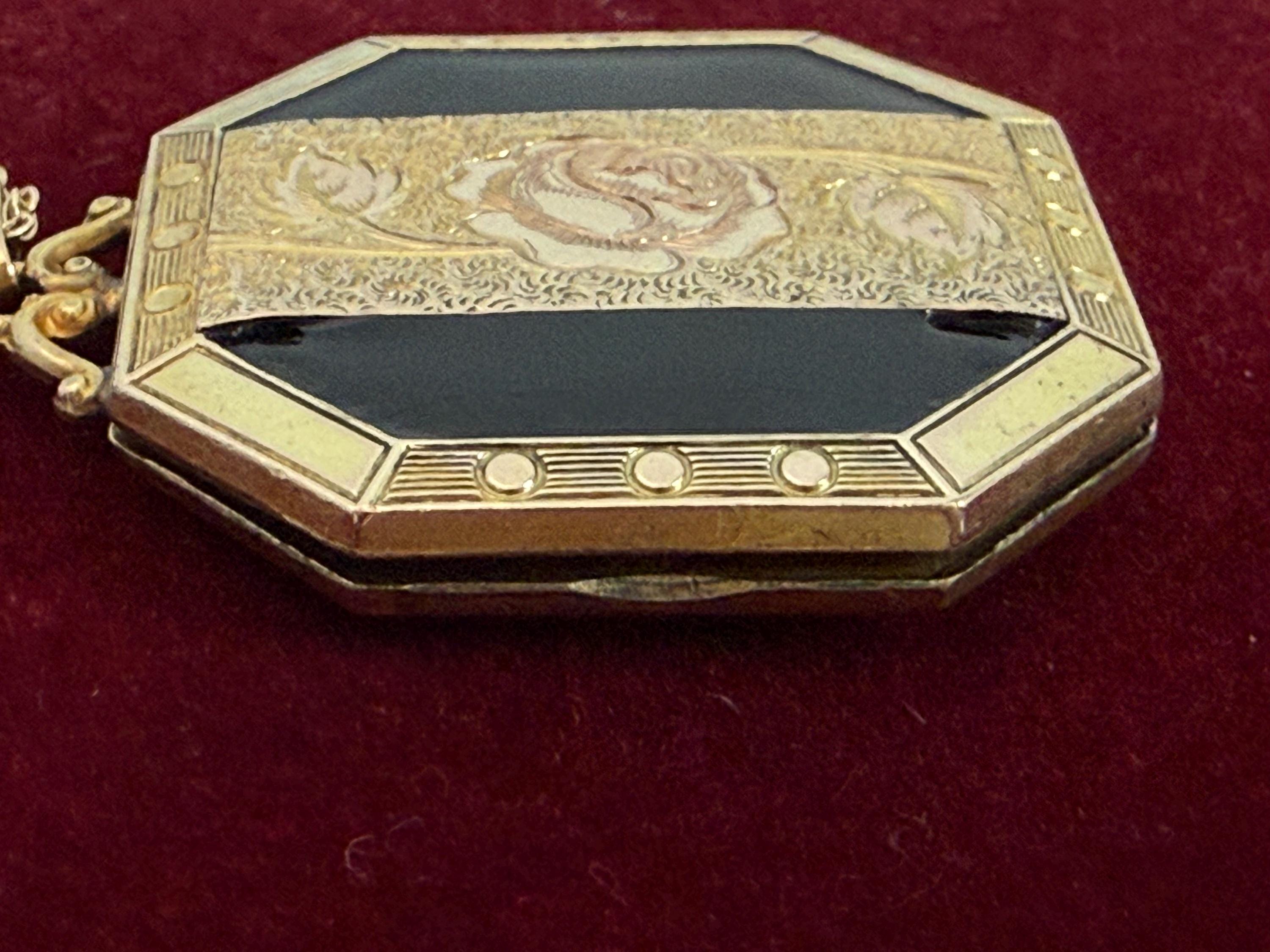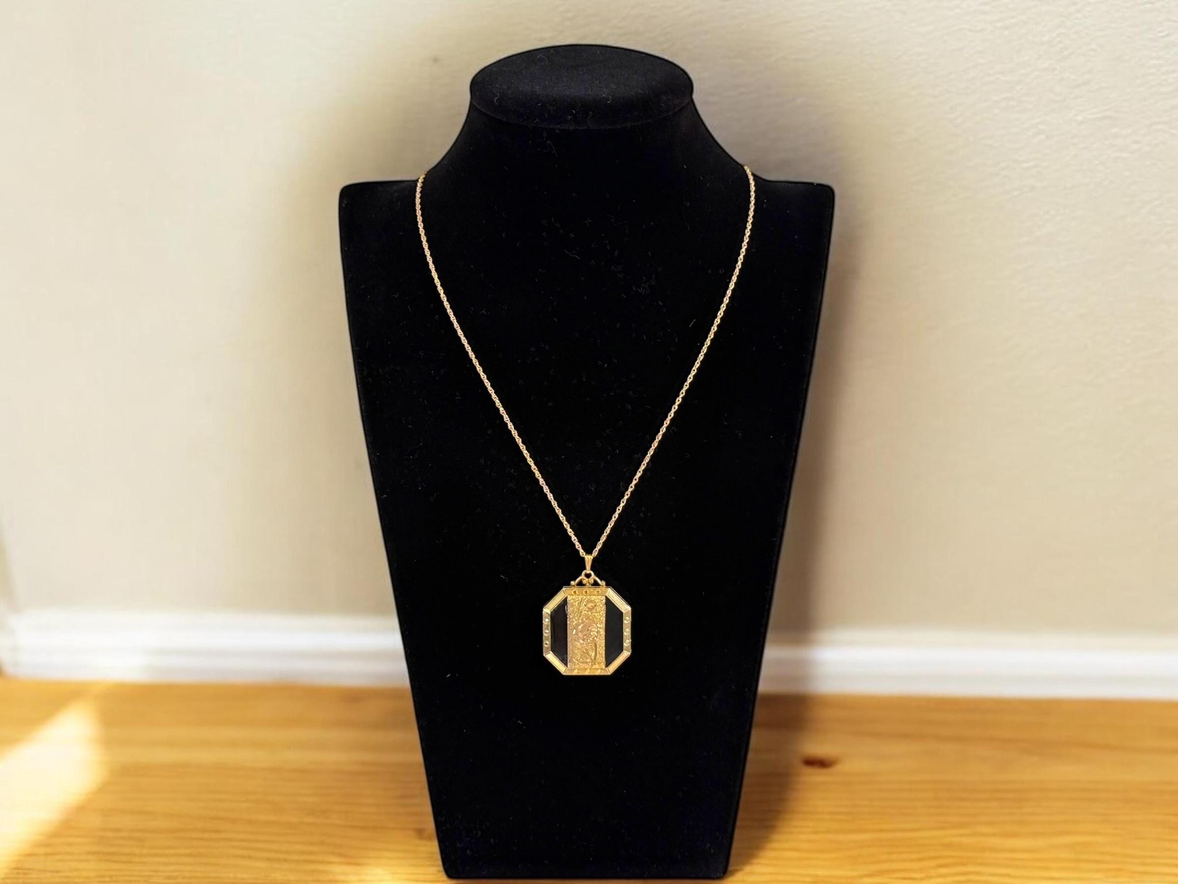 A unique 10K yellow gold filled locket necklace with a floral etched design on the front with black enamel on the sides. It hangs on a new 14K gold filled rope chain that is 20" long. The eight sided locket is nicely detailed. The front center, between the 2 black enamel side panels, features etched leaves and a rose flower that has a very subtle pink color. The back of the locket is plain but is engraved "Phyllis Bennett 1959". The sides of the locket have gold filled edges with 3 little rounds spaced evenly around 4 of the 8 sides.