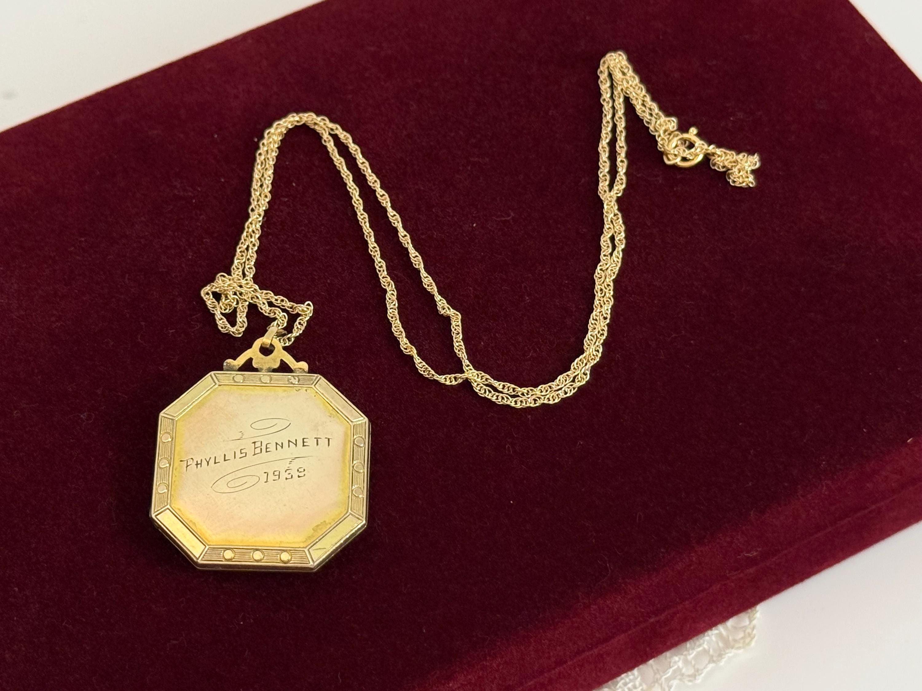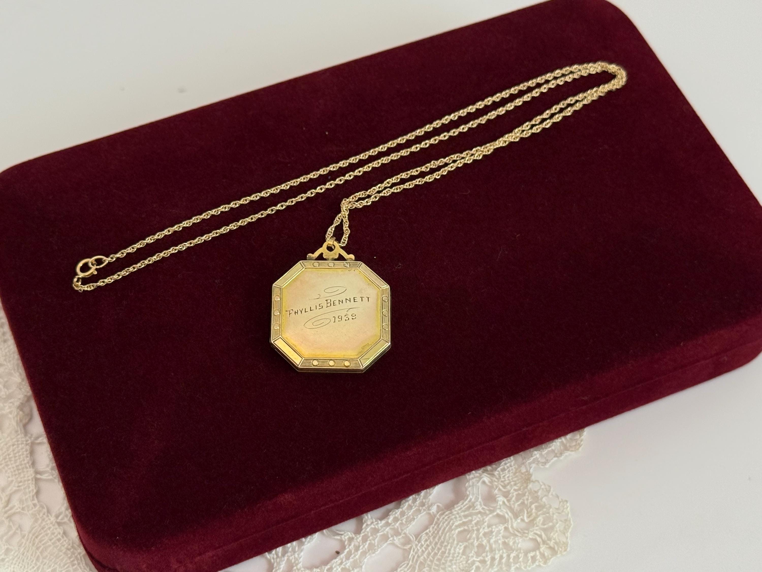 Vintage Gold Filled & Black Enamel Octagon Locket - Engraved 1959, 14K GF Chain