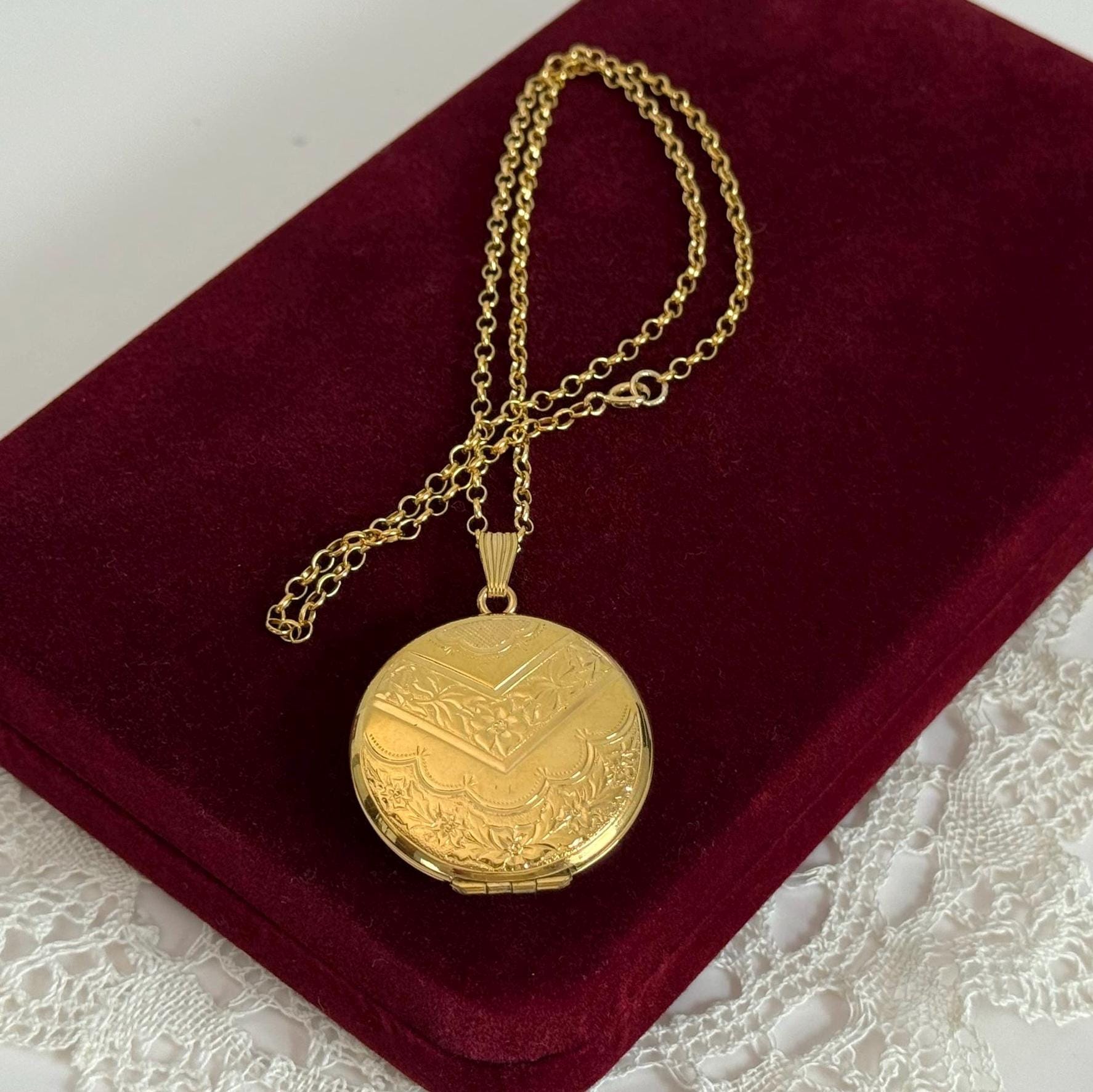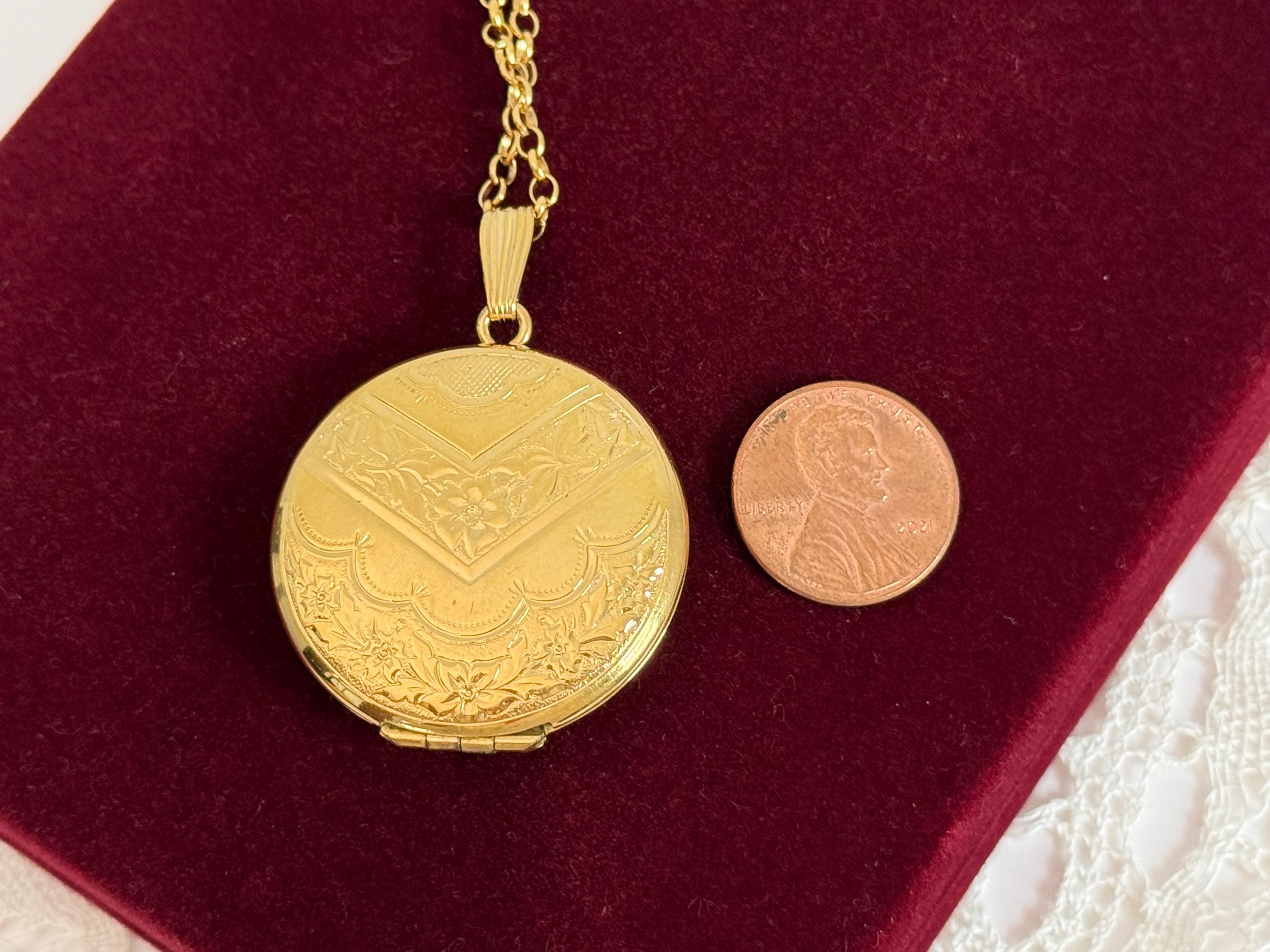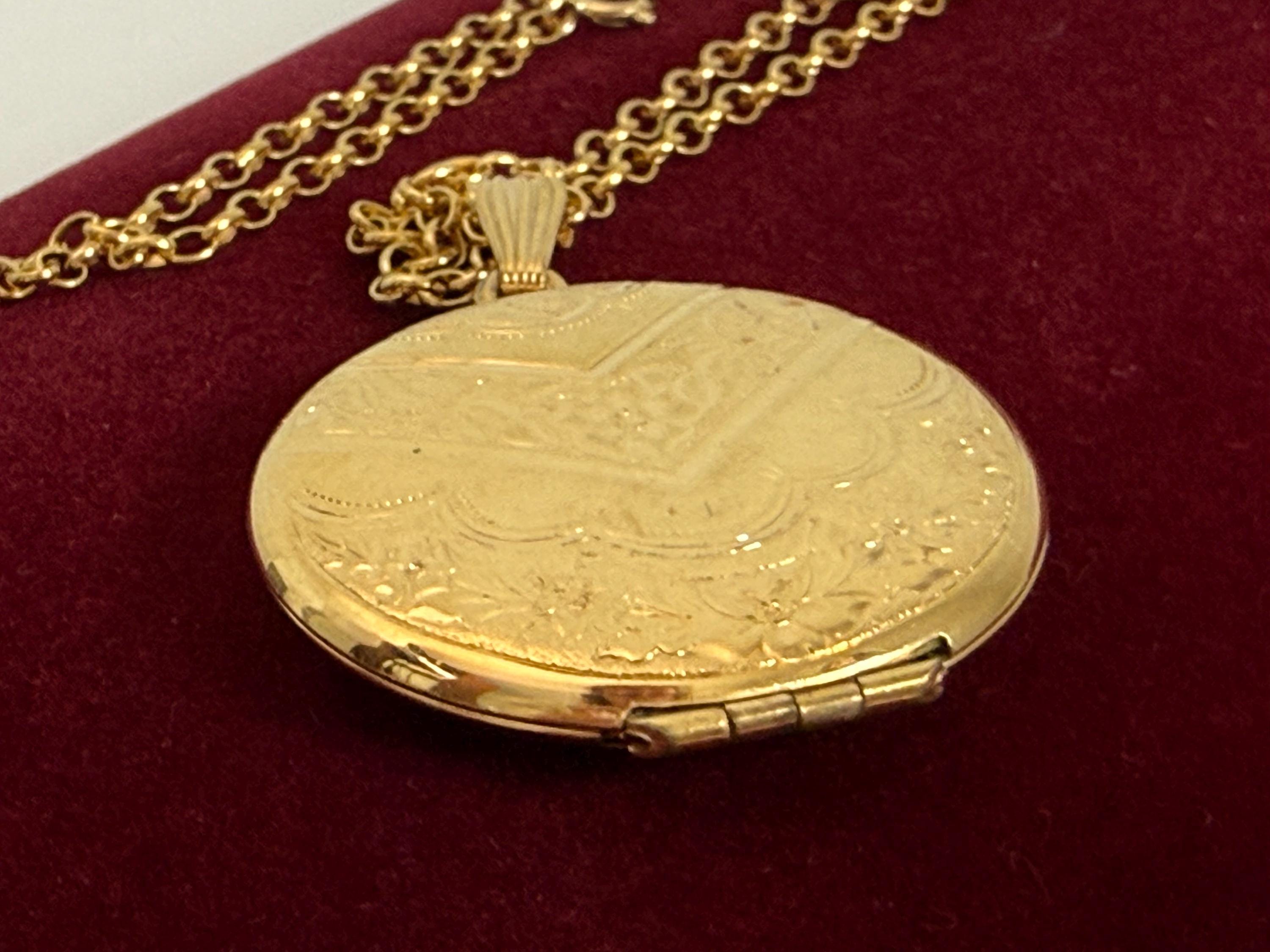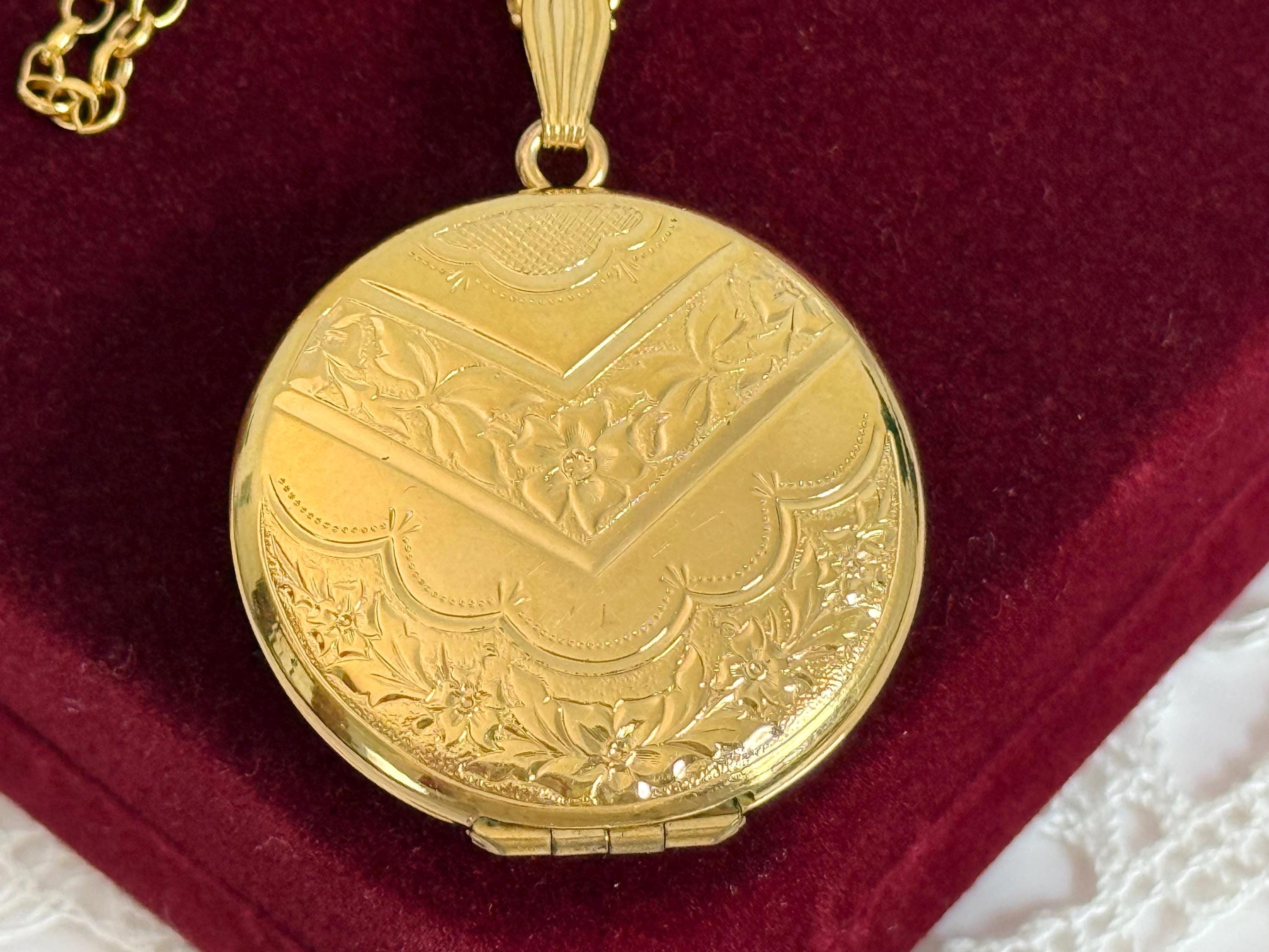 Lovely vintage 12K gold filled photo locket made by Van Dell. This large, round etched locket is circa mid century in age. The front features ornate raised floral designs and the back is plain with no design. The bale is fanned and has vertical lines on it.