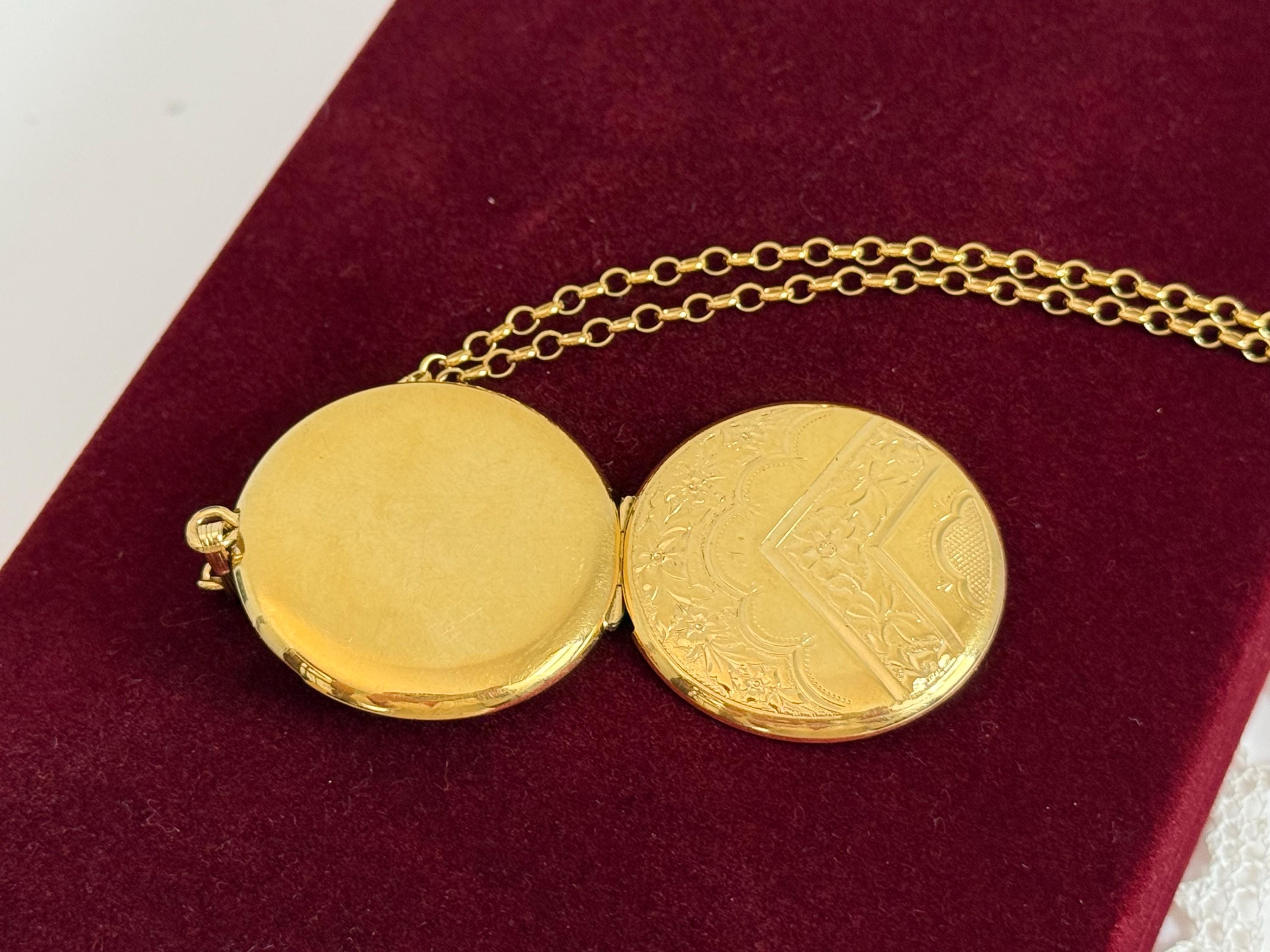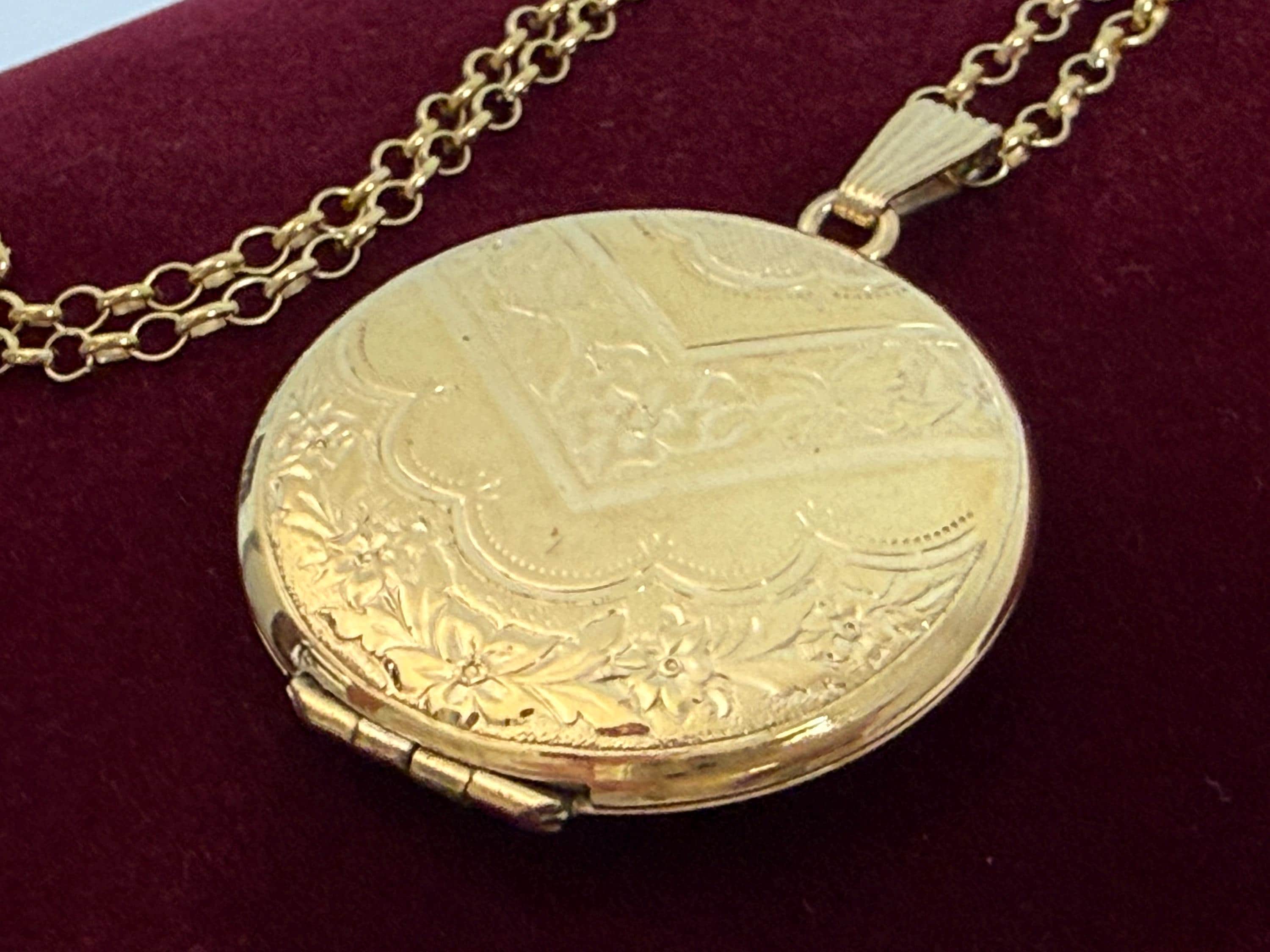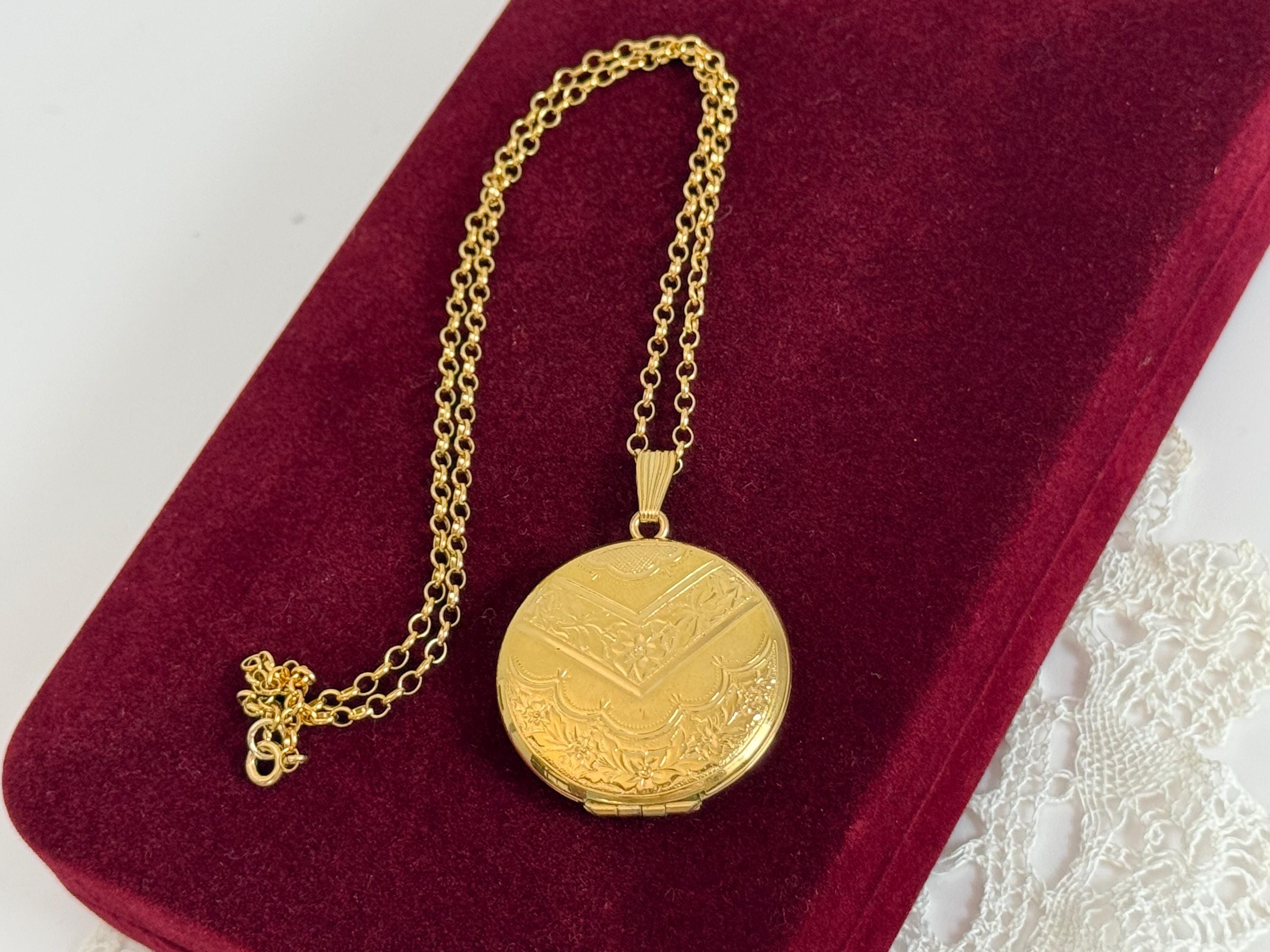 Vintage Van Dell 12K Gold Filled Locket Necklace: Round Floral Photo Pendant, 14K GF Chan