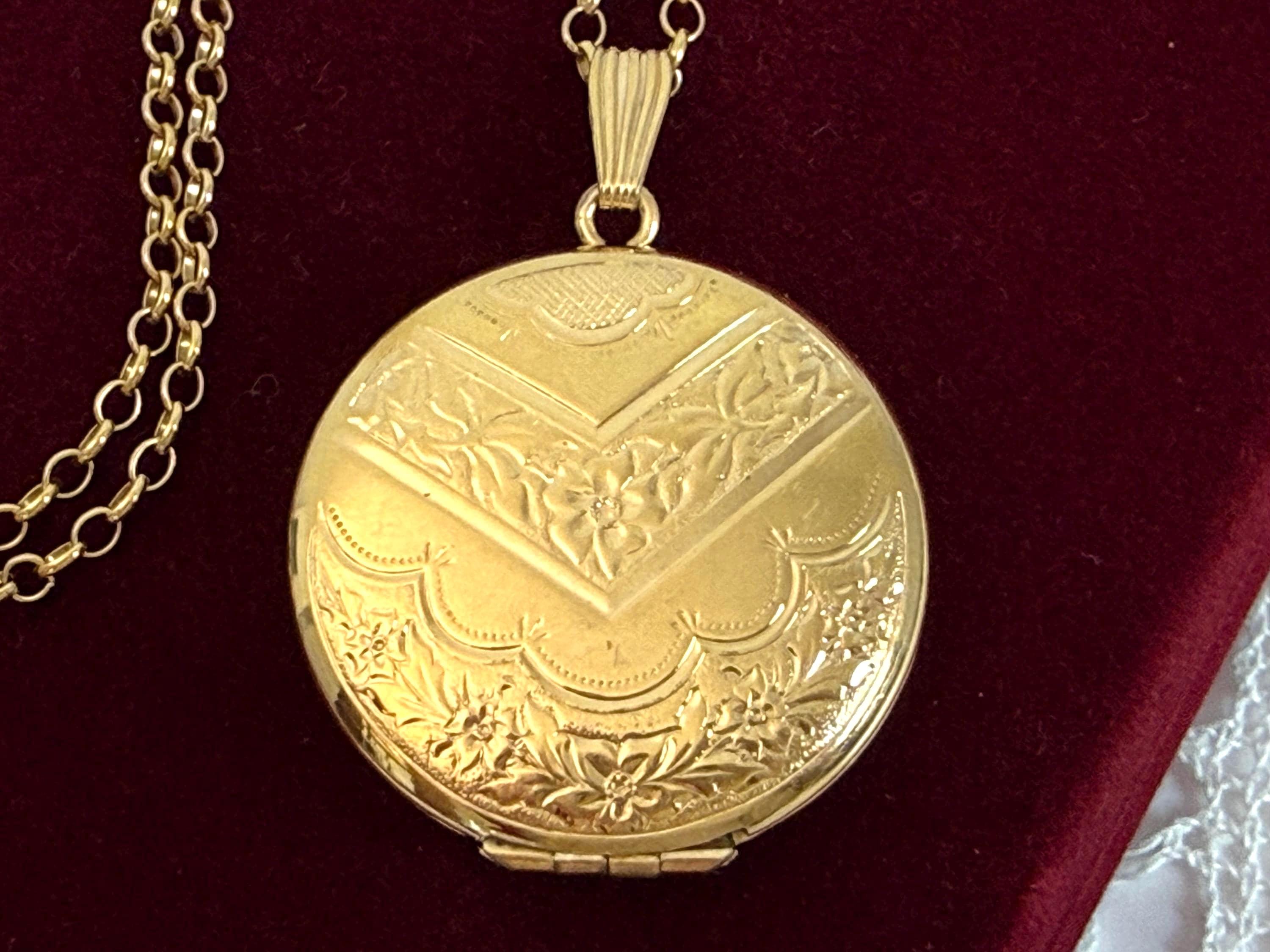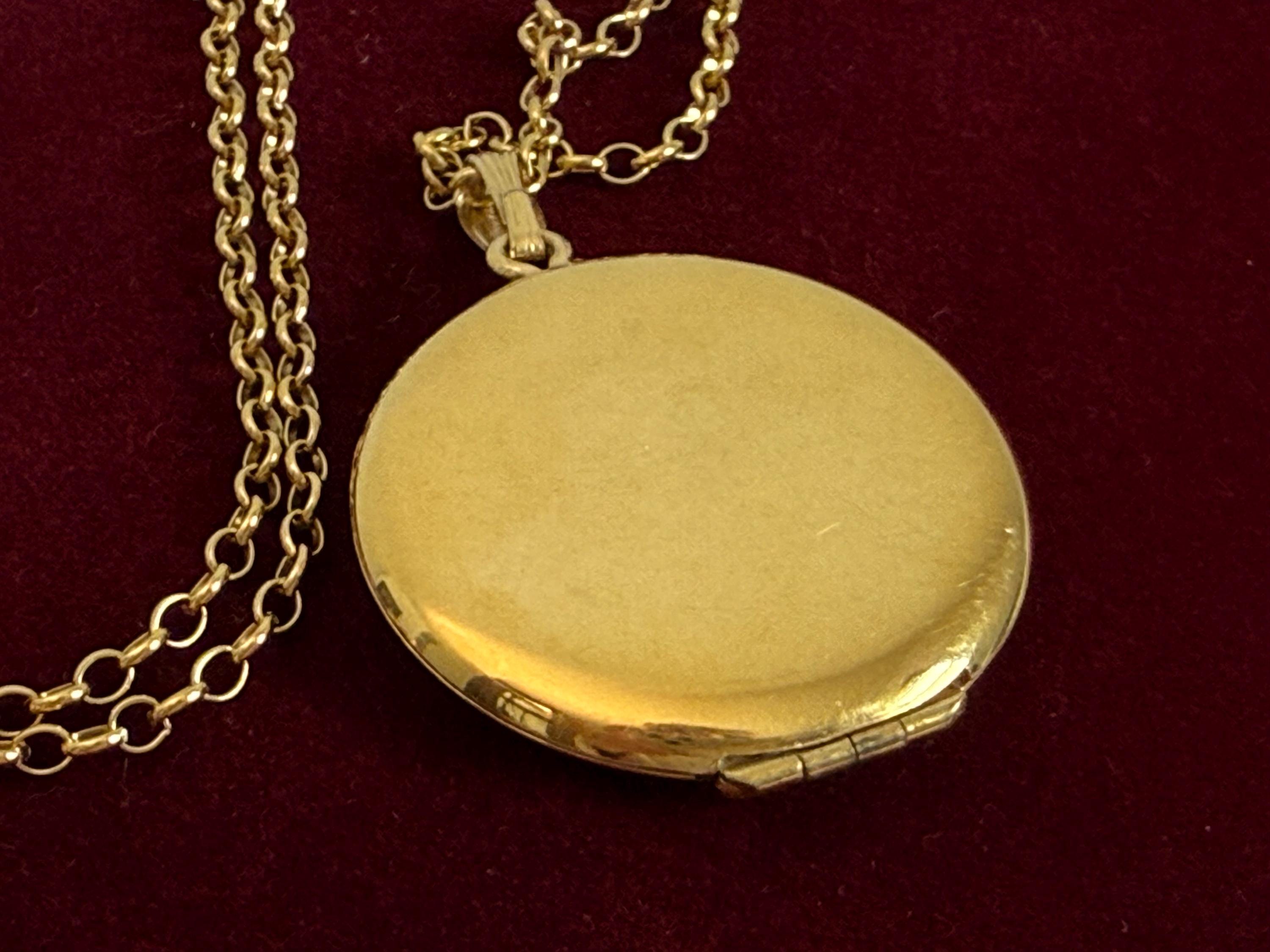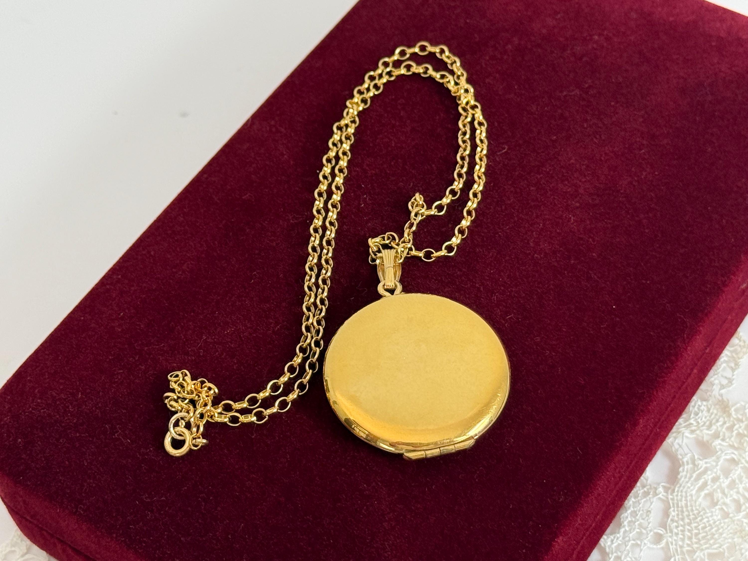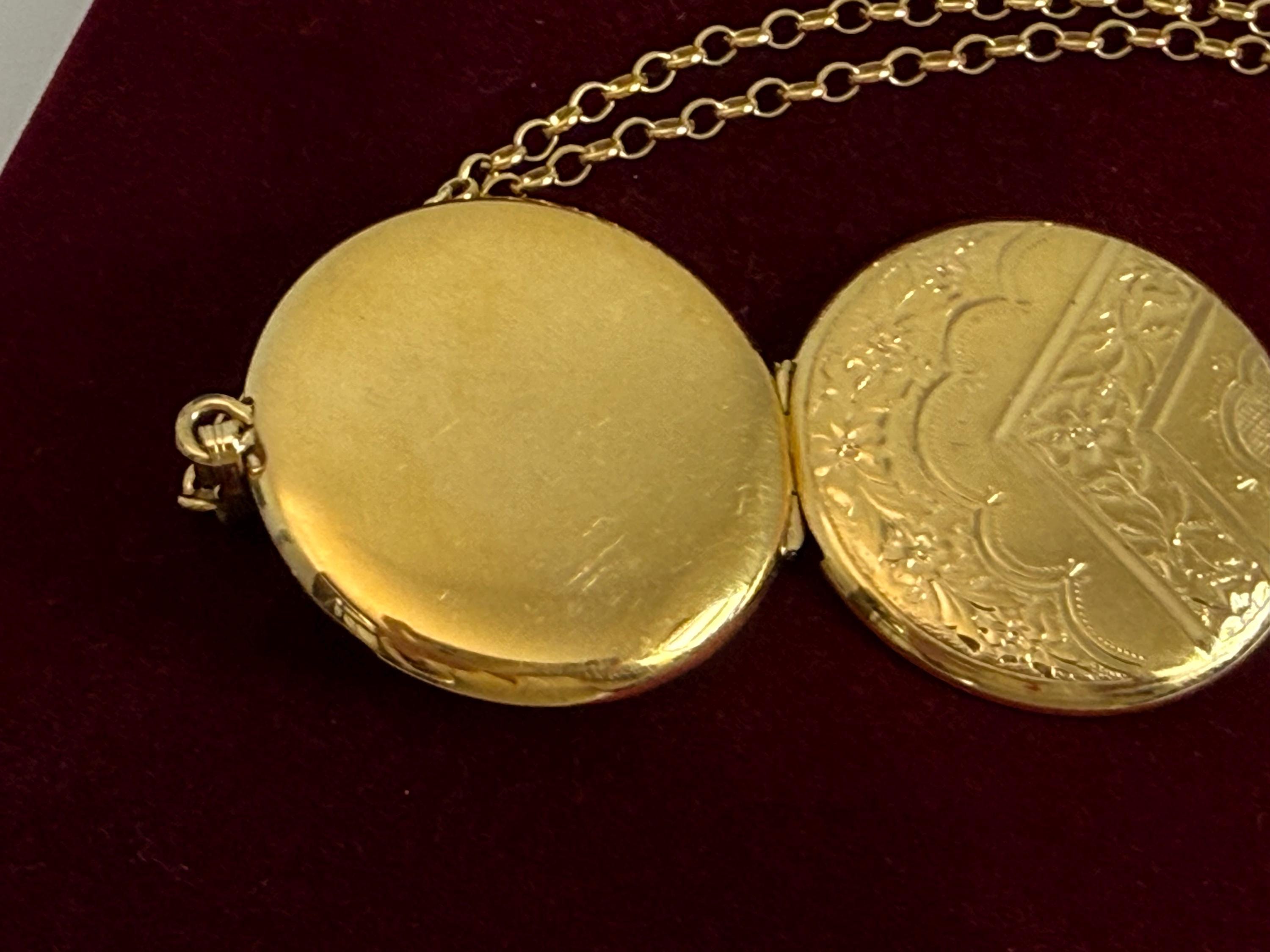 The locket has been attached to a new chain. The 14K gold filled 18” long chain has a spring ring clasp that opens and closes securely. The locket can be purchased with or without the chain.