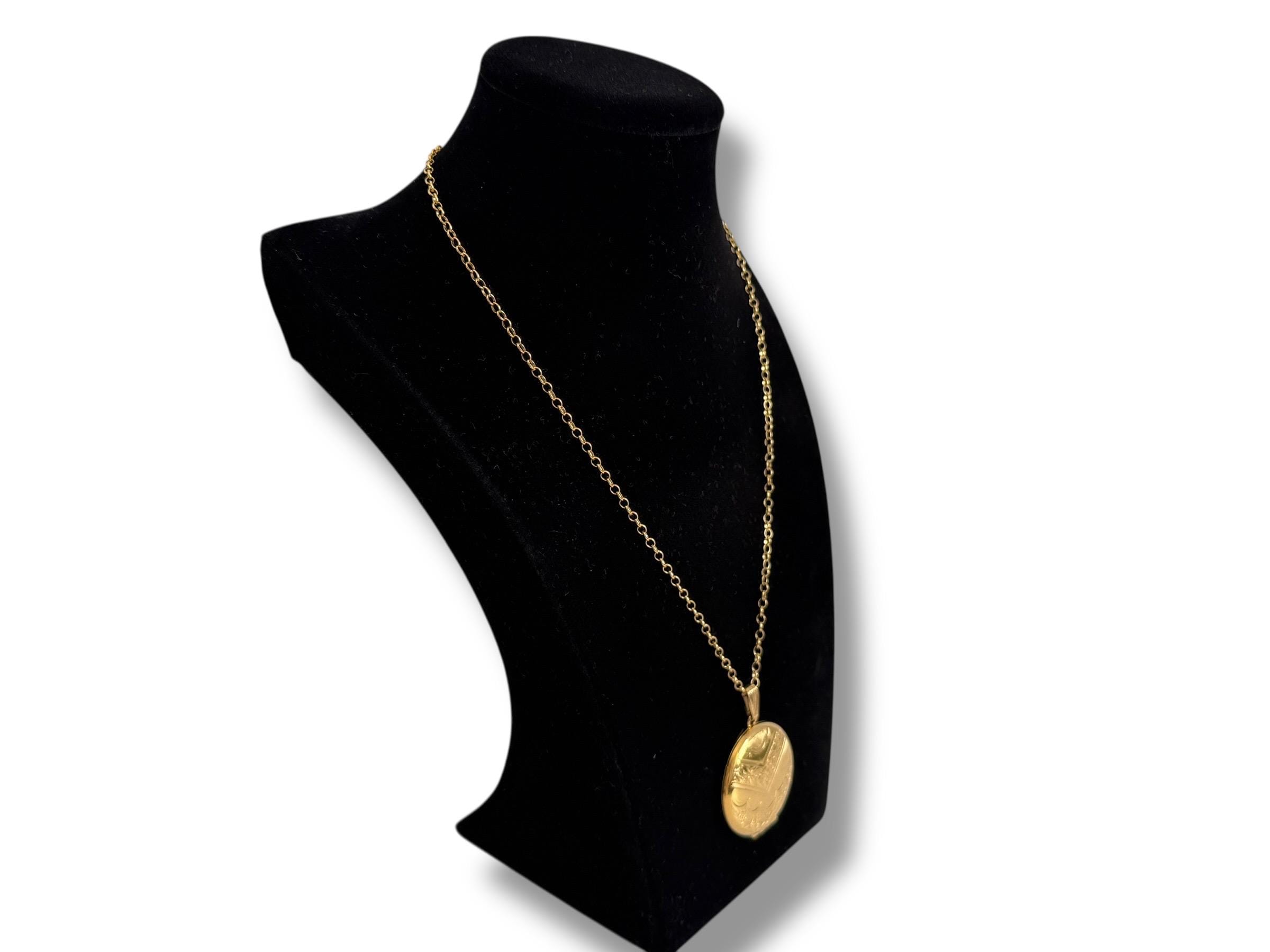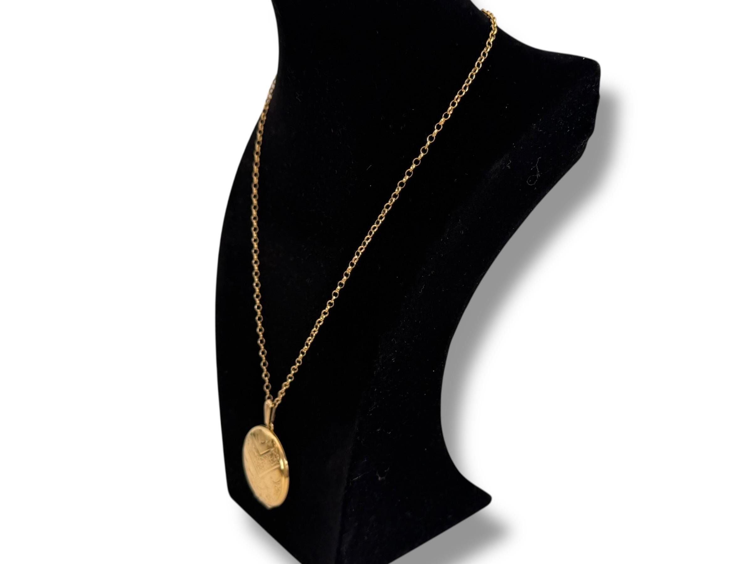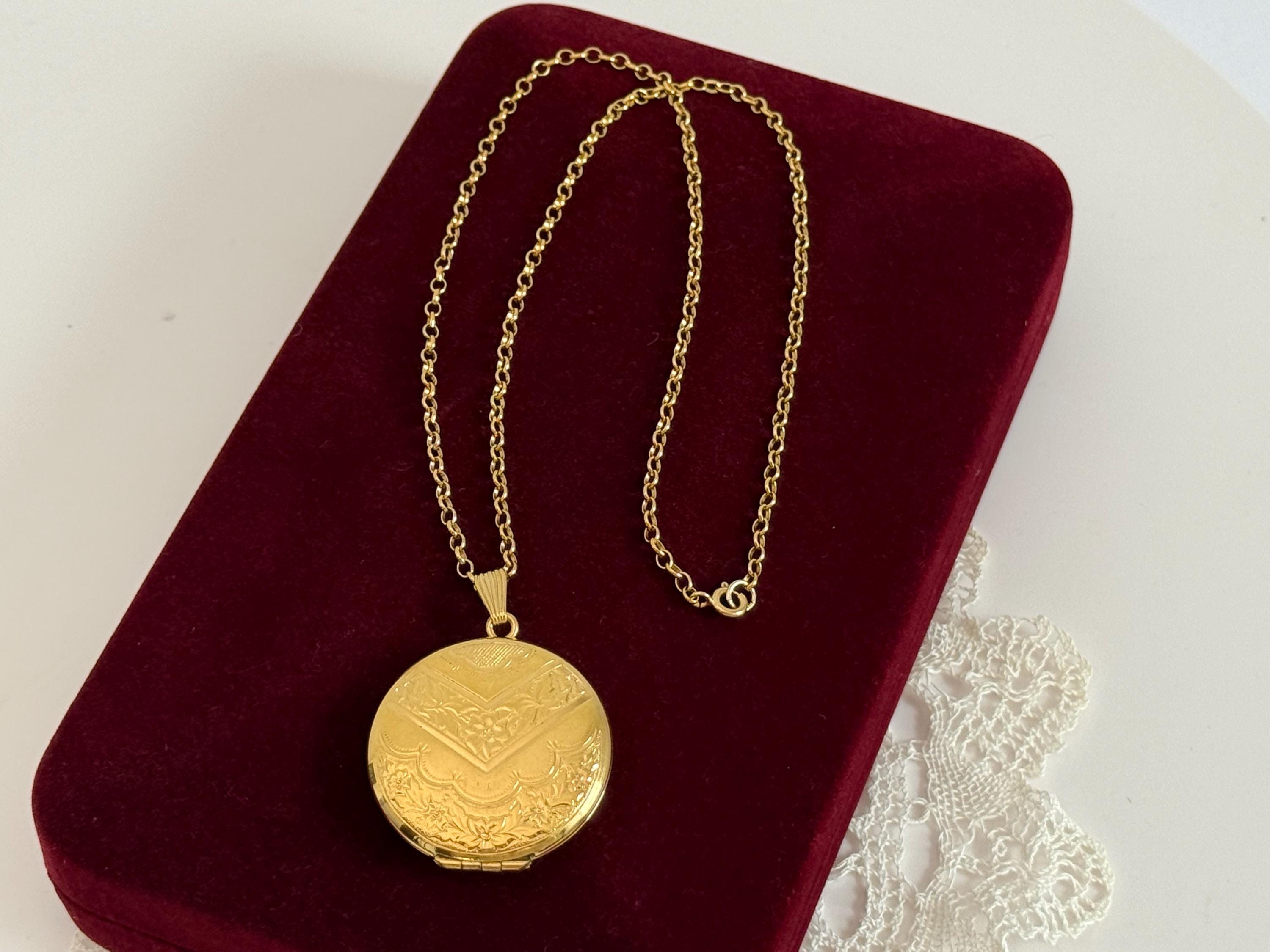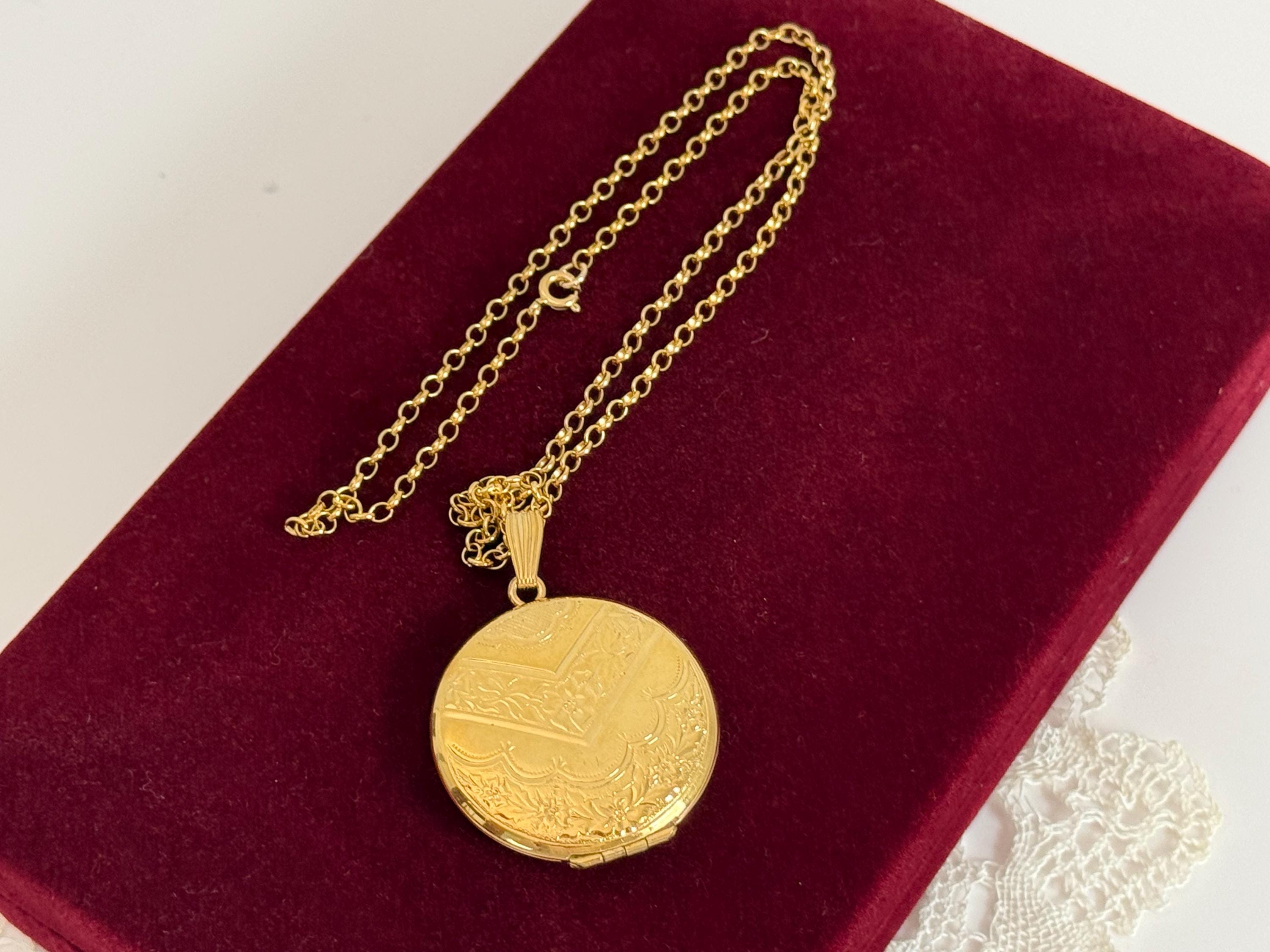 The locket has been attached to a new chain. The 14K gold filled 18” long chain has a spring ring clasp that opens and closes securely. The locket can be purchased with or without the chain.