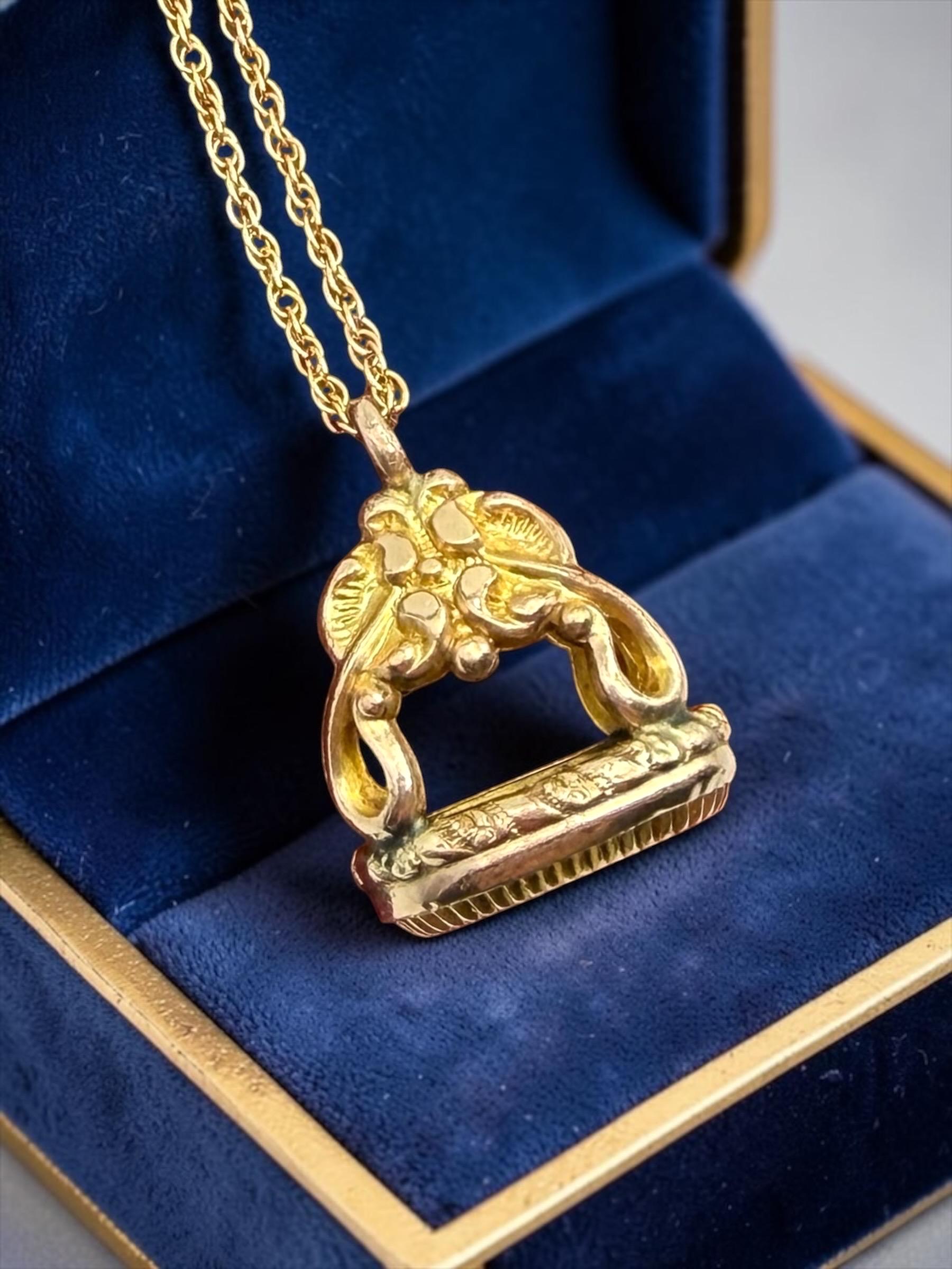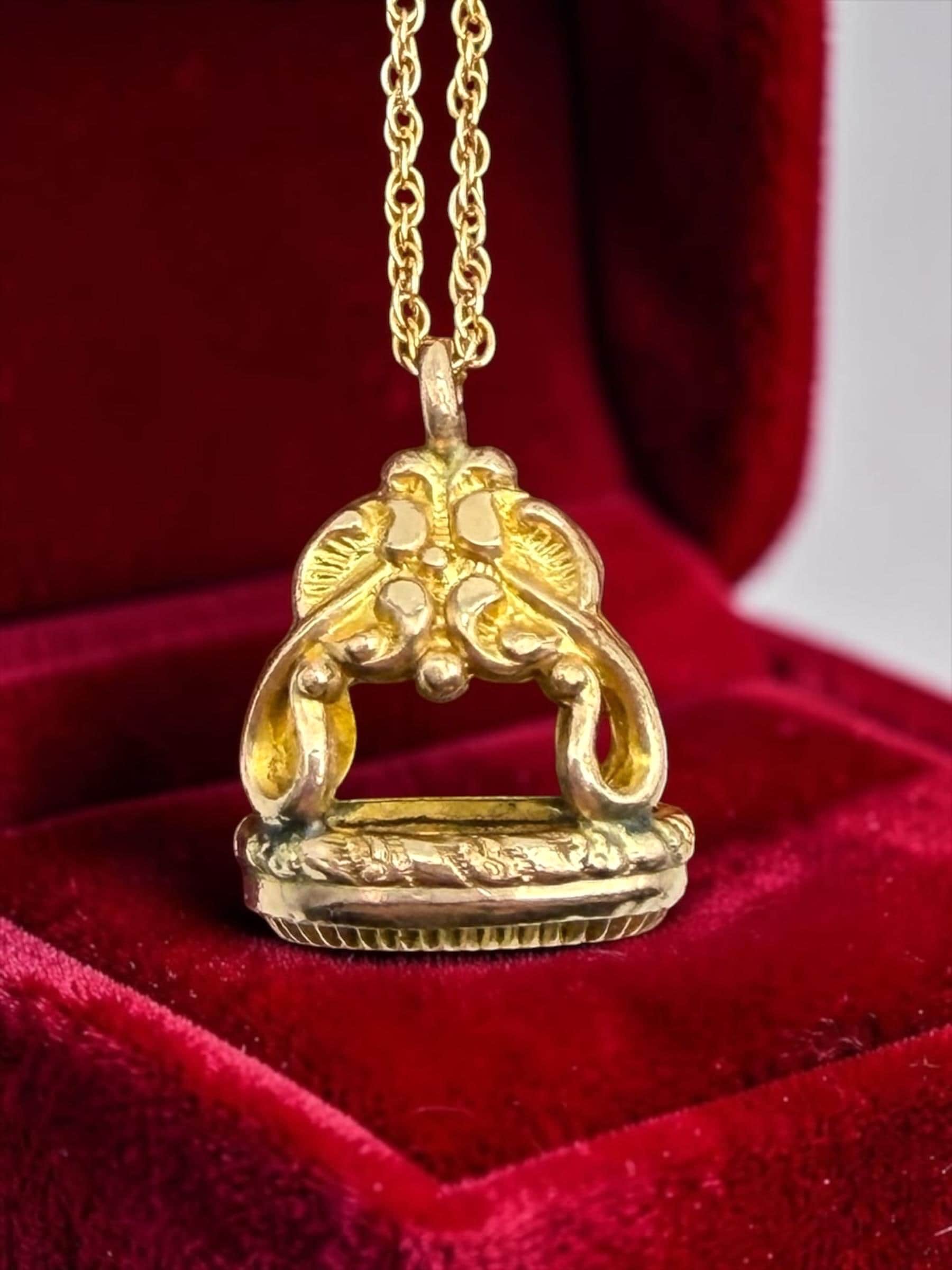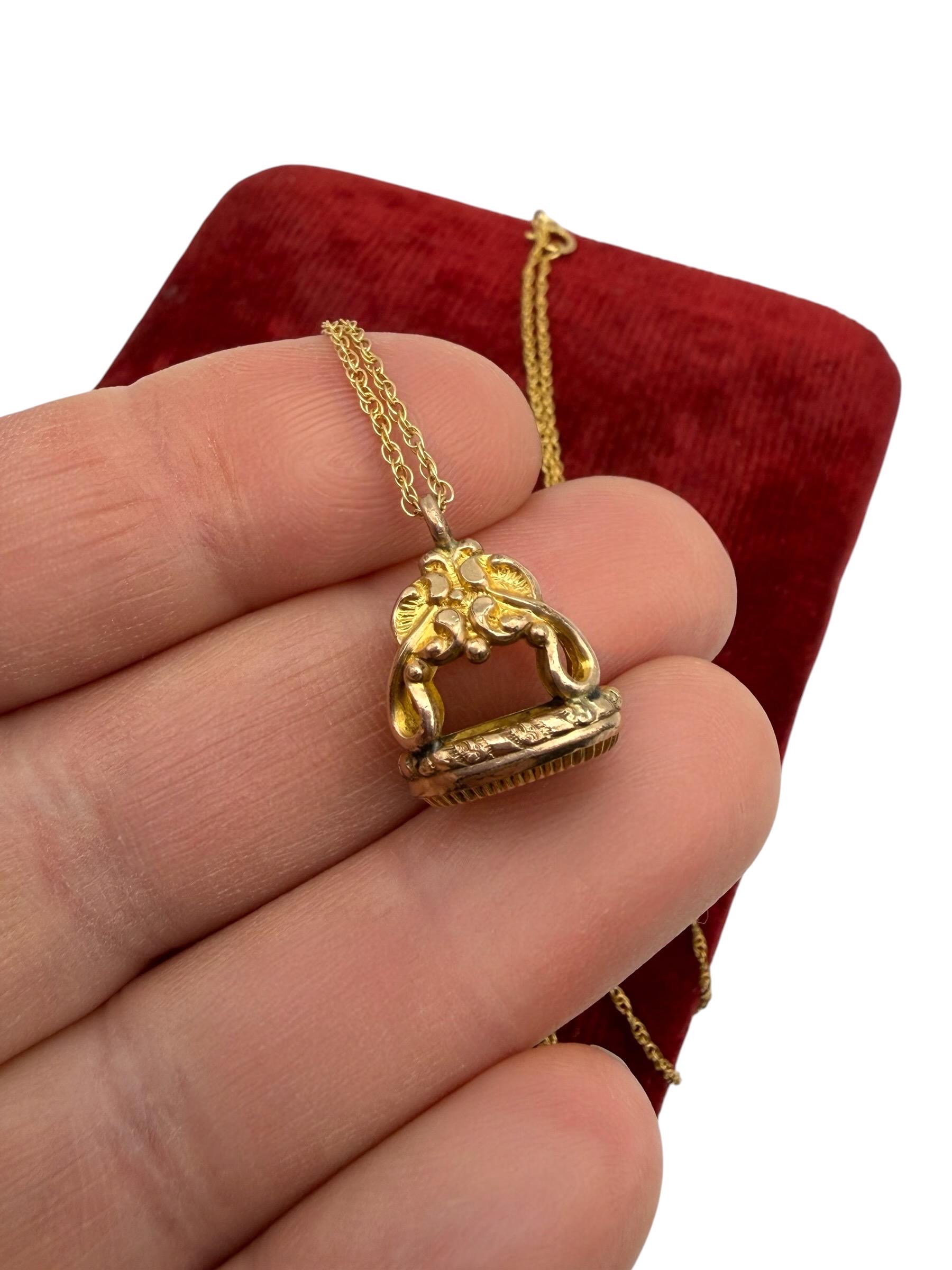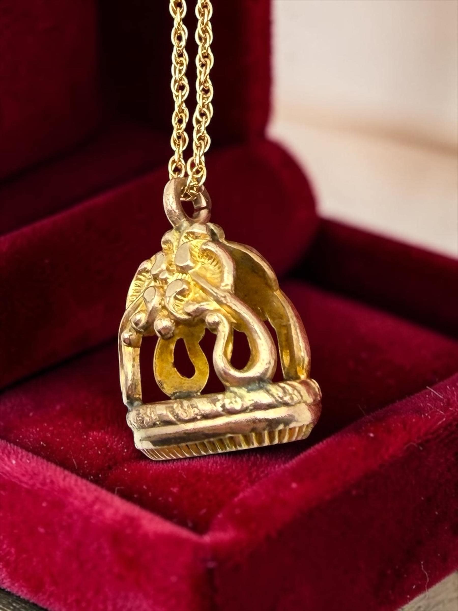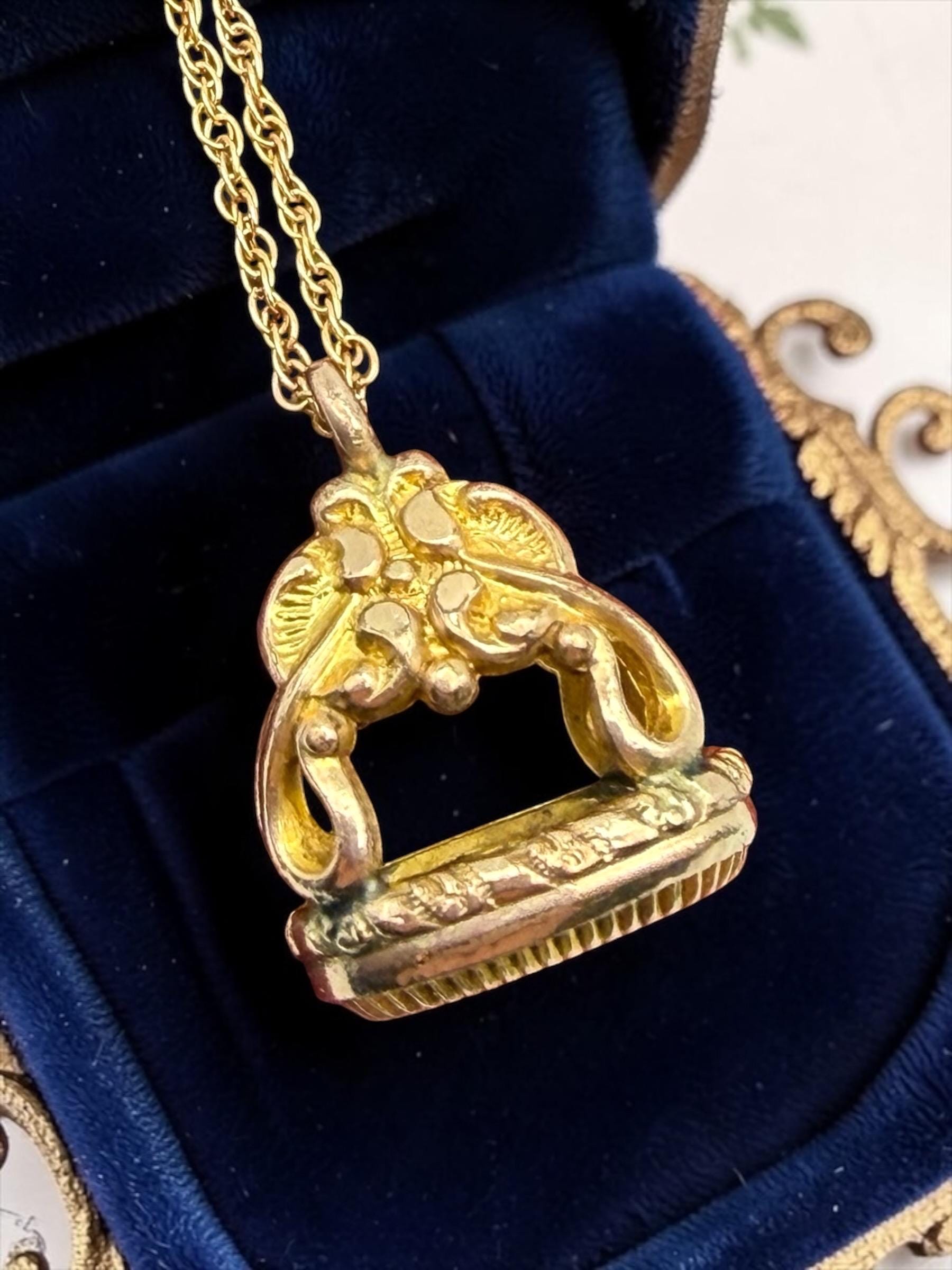 This is an antique watch (circa late 1800s/very early 1900s) fob that can be worn on a pocket watch chain or attached to a necklace chain and worn as a pendant. We have attached it to a new 14K gold filled rope chain that is 18'' in length.