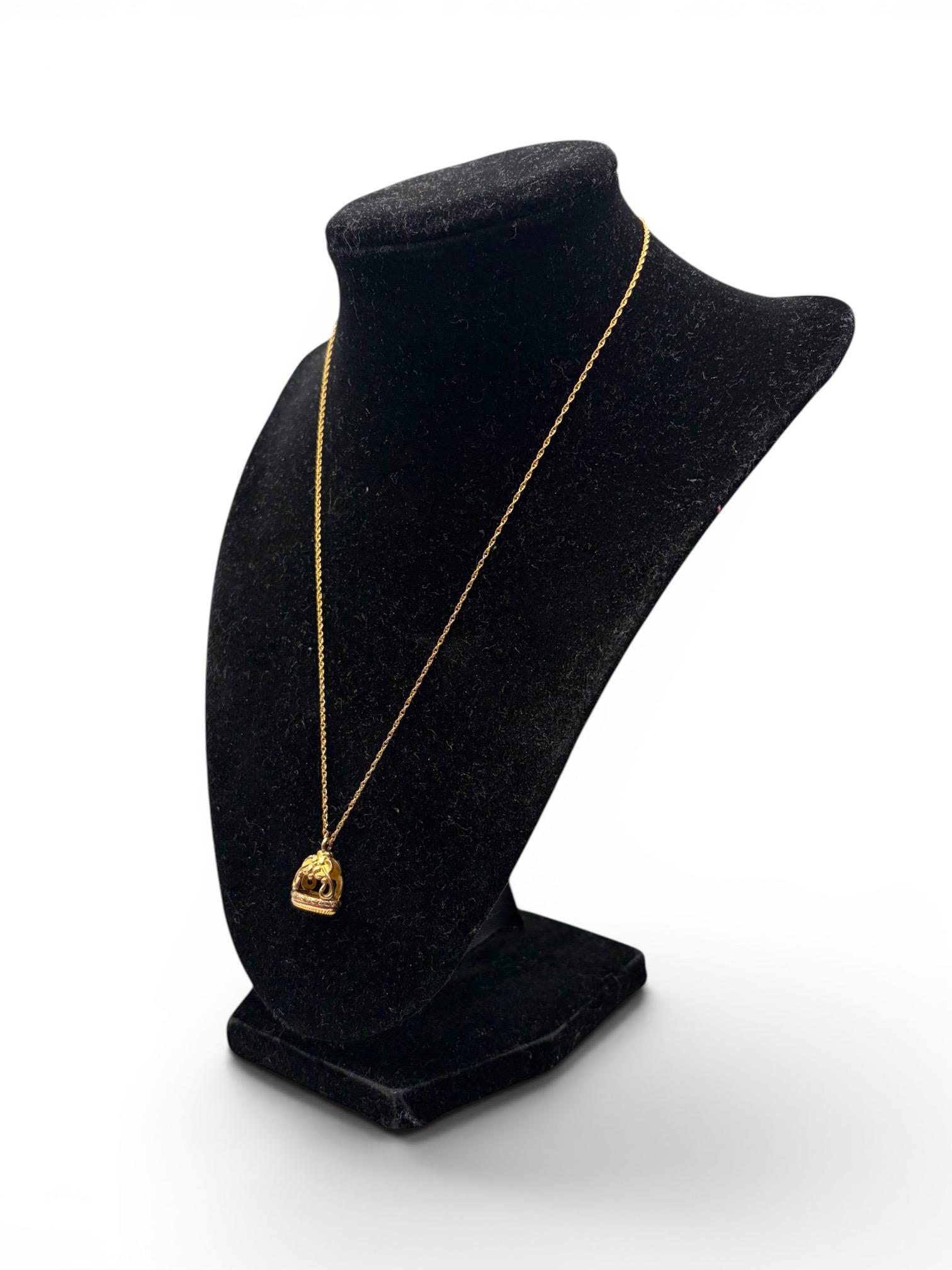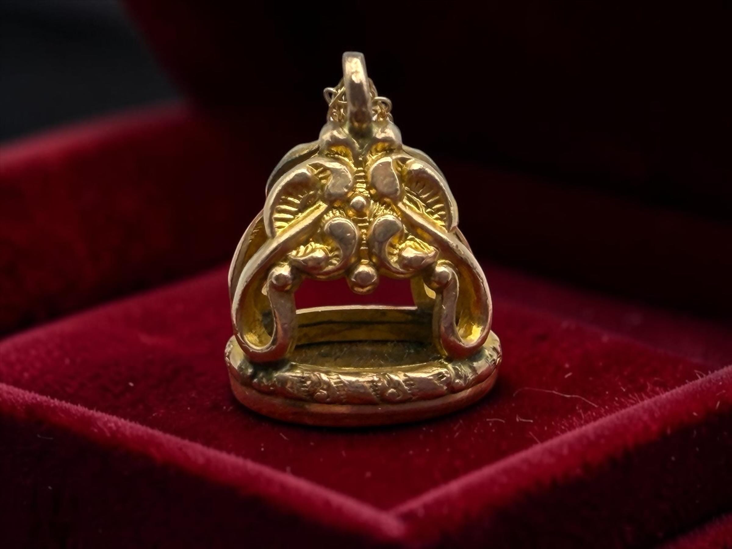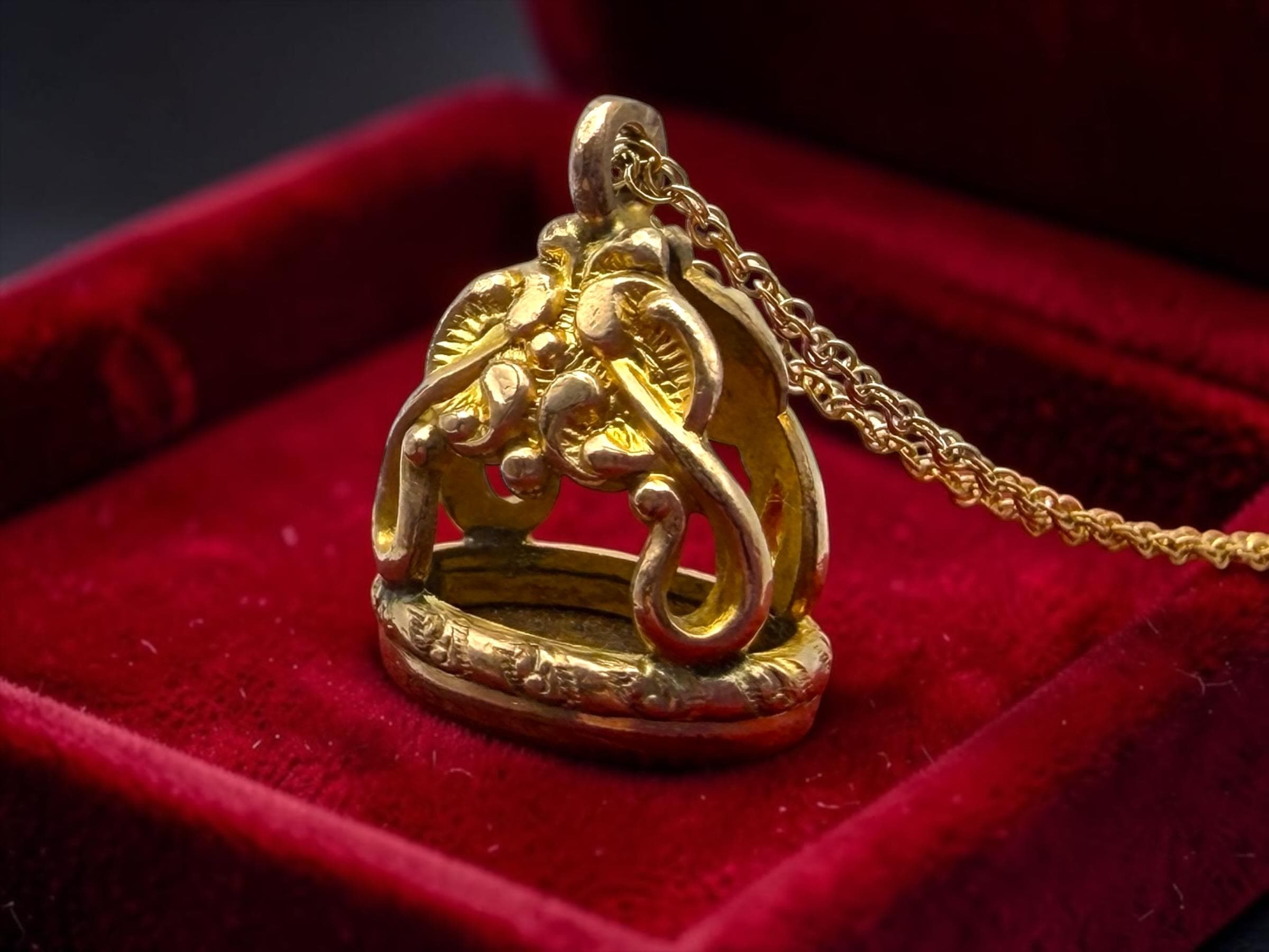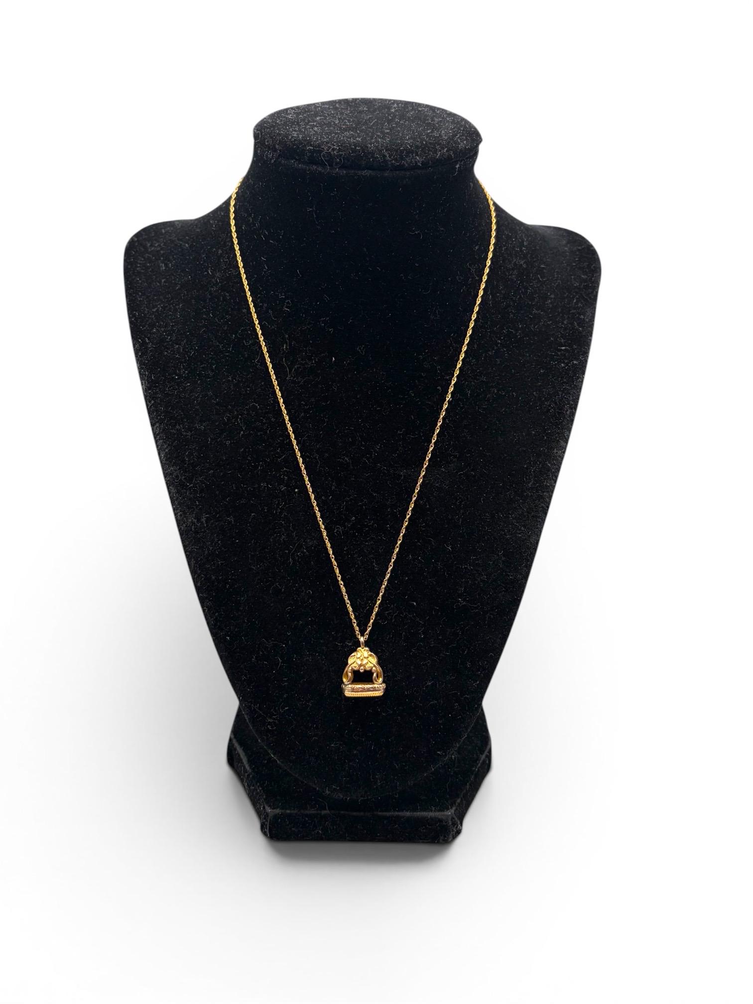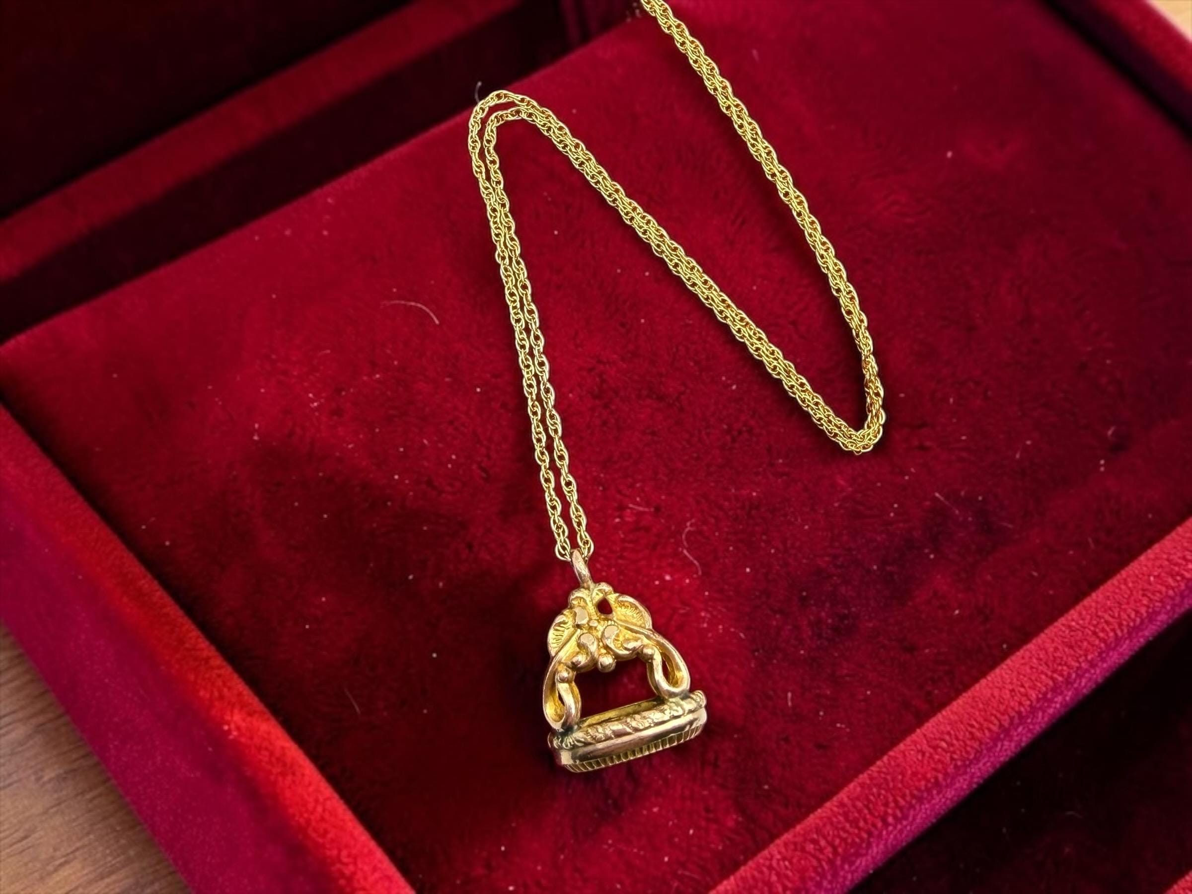 This is an antique watch (circa late 1800s/very early 1900s) fob that can be worn on a pocket watch chain or attached to a necklace chain and worn as a pendant. We have attached it to a new 14K gold filled rope chain that is 18'' in length.