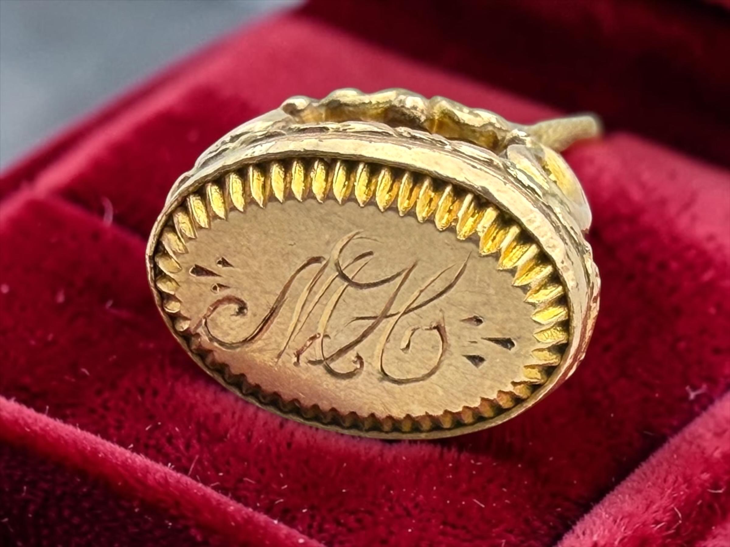 Unique antique gold filled or gold plated fob. Ornate swirling designs, shiny gold and beautiful. The bottom has the cursive monogram letters "MH".