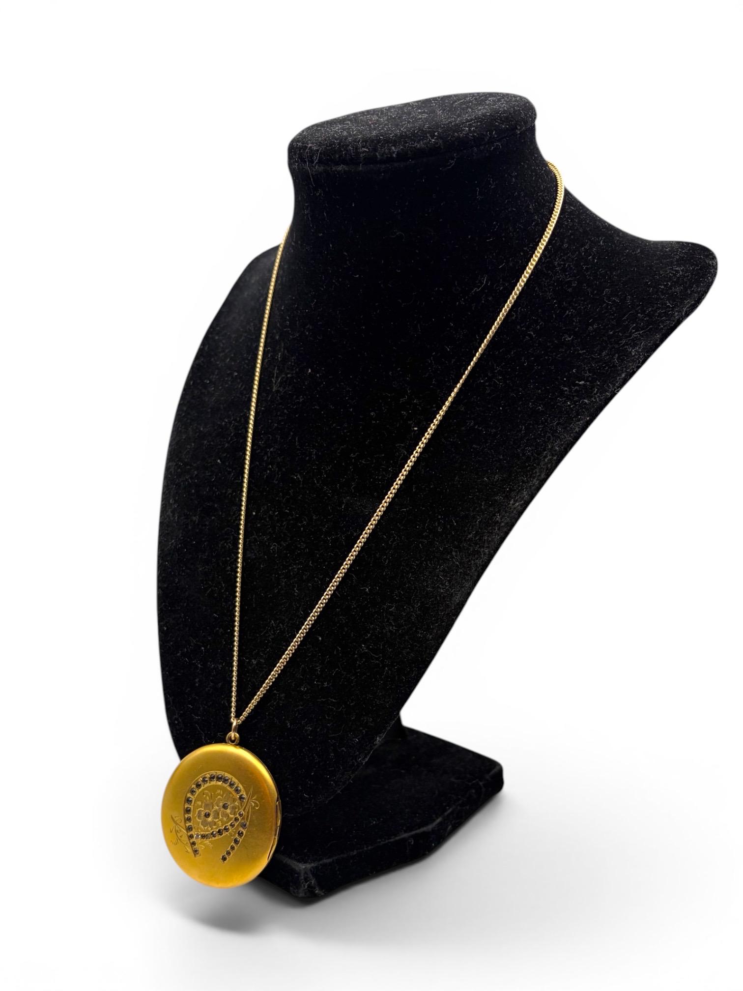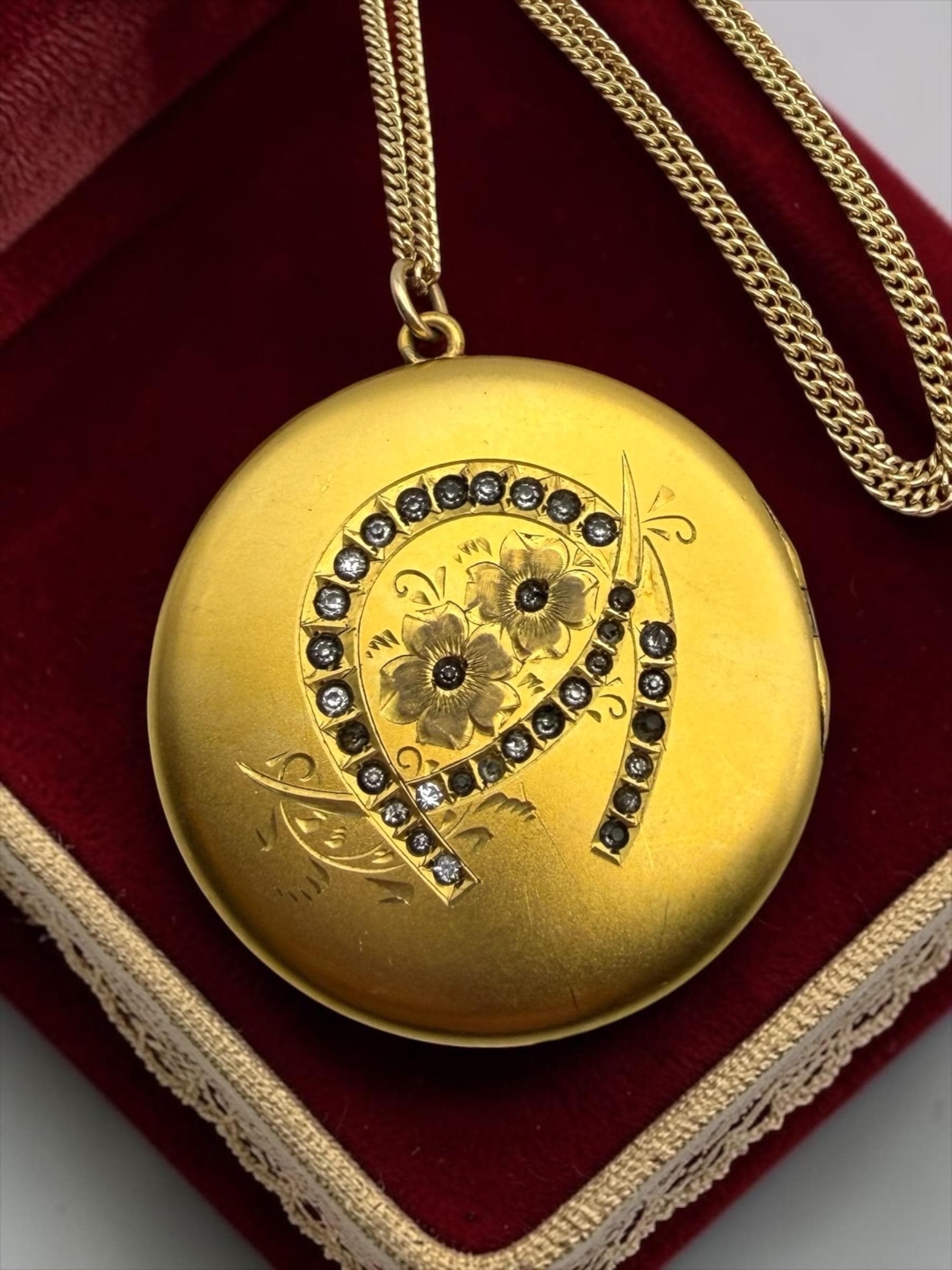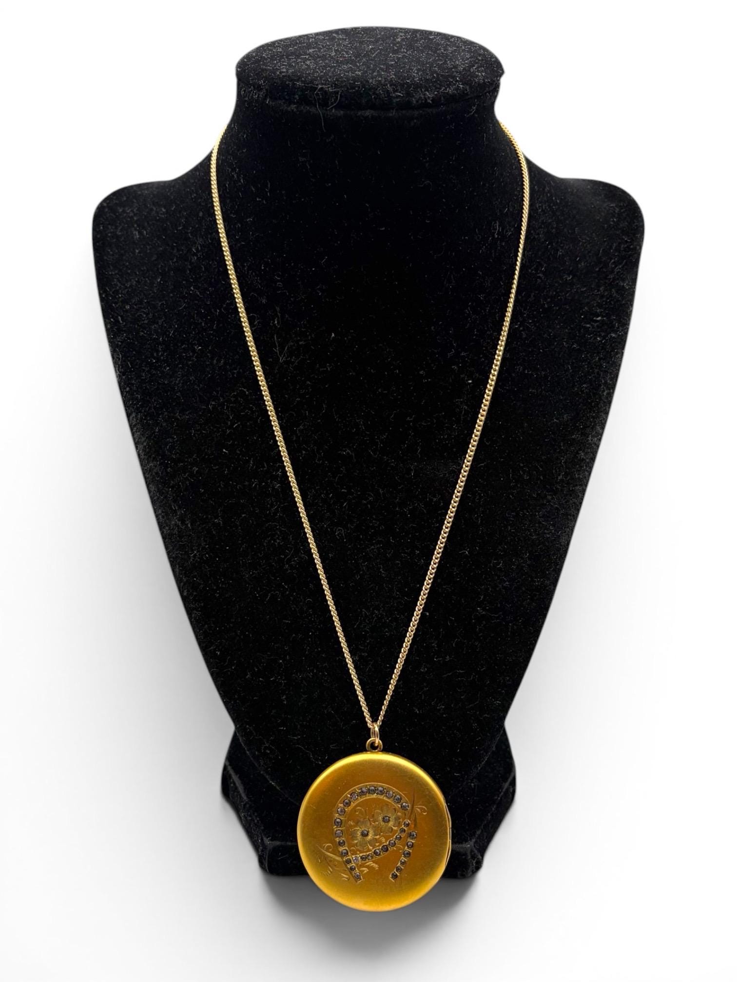 Antique HA & Co Gold Filled Locket Necklace: Horseshoe, Etched Flowers, Rhinestones