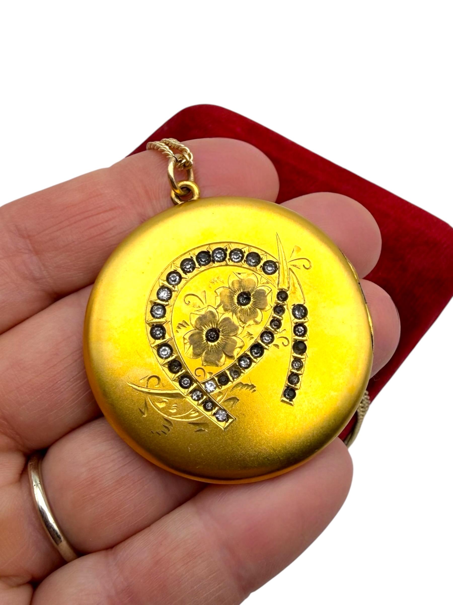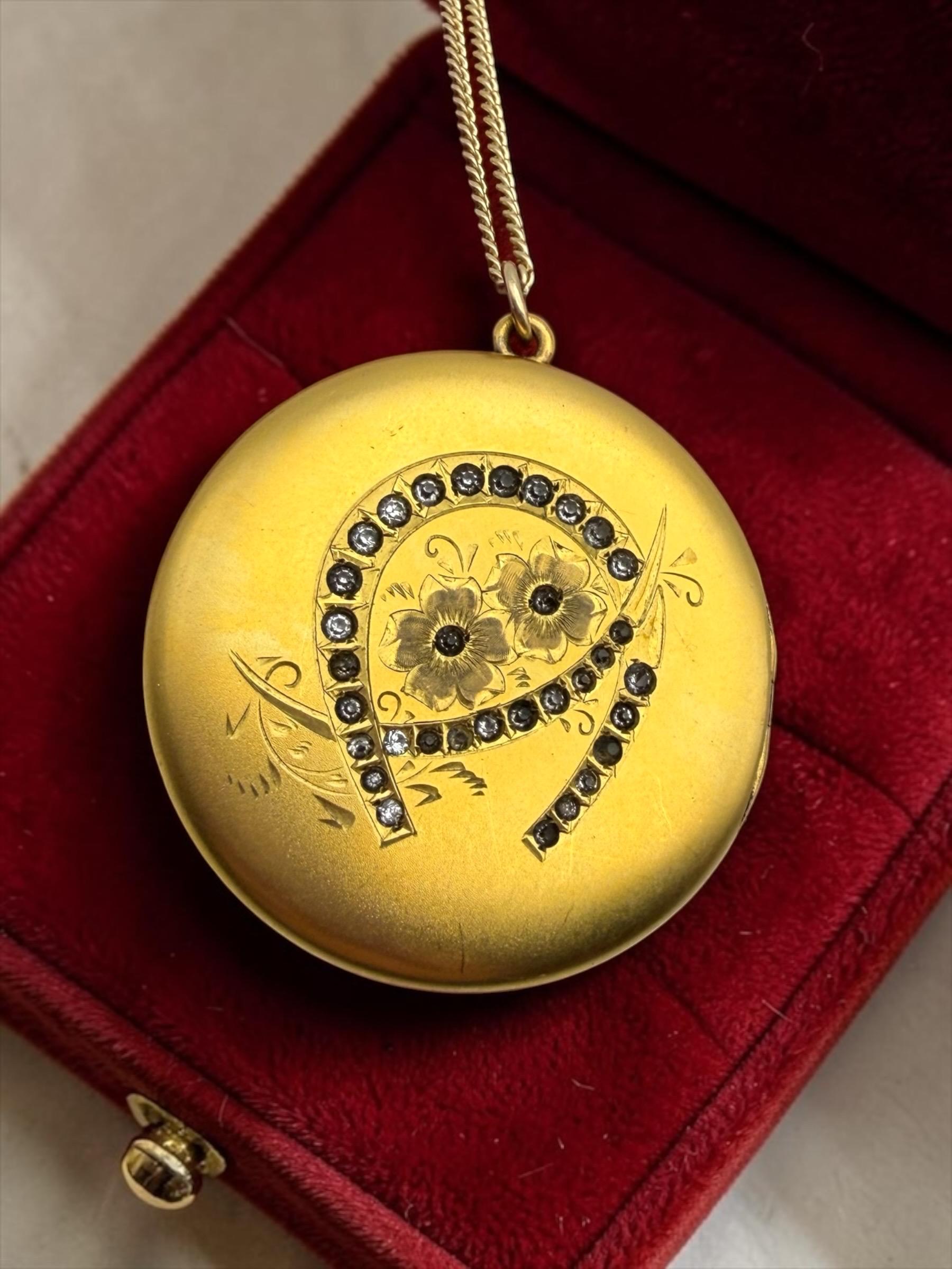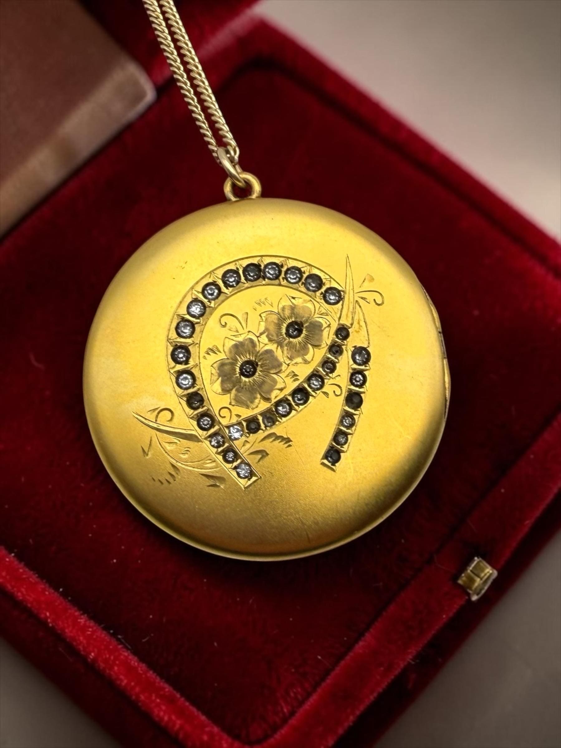 Gorgeous, round antique and VERY LARGE! gold filled photo locket made circa the very early 1900s. The front of this Art Nouveau era locket features an etched flower and horseshoe design with clear paste or glass stones set in the leaves of the clover and an etched stem.